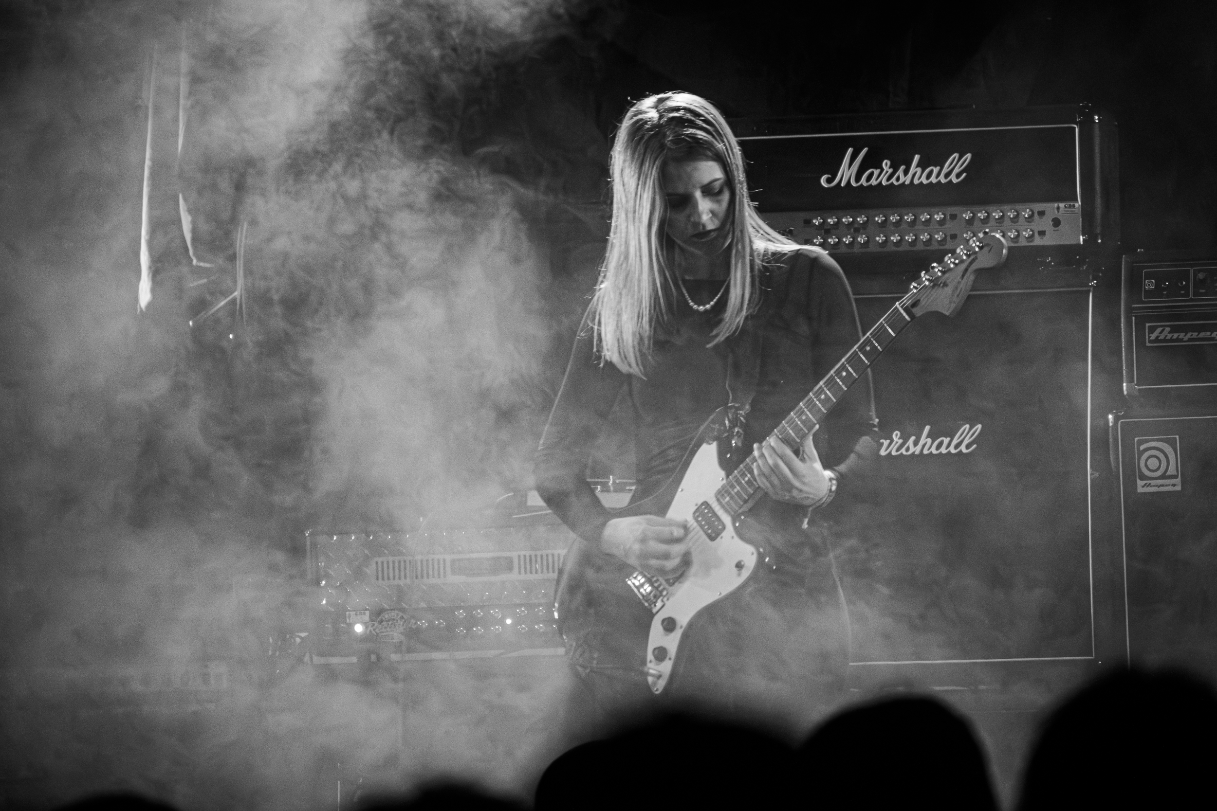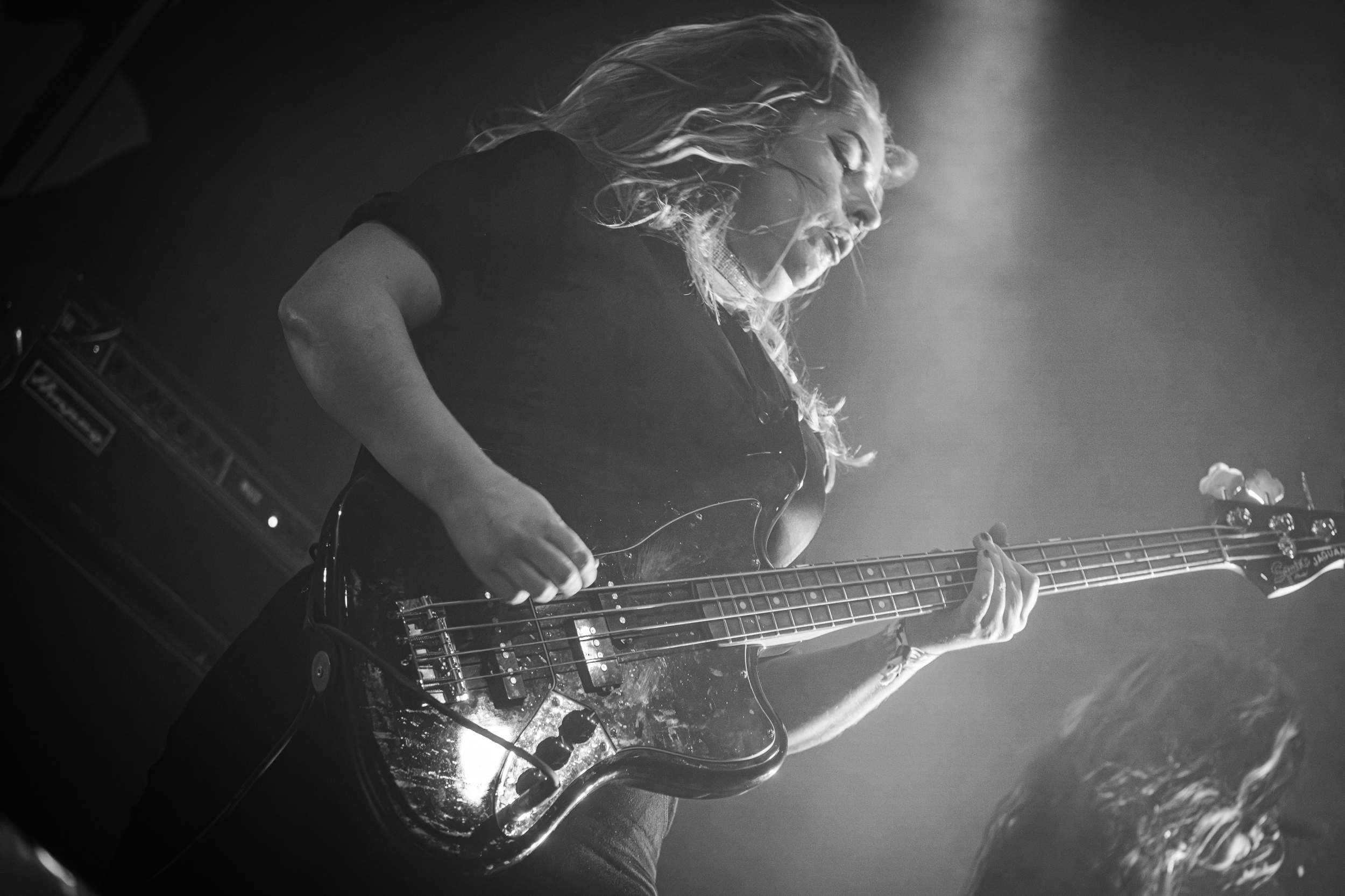 De retour dans la salle John Dee, l’heure est à la découverte du black metal aux atmosphères progressives et métaphysiques tel que le produit Orm ; un moment de répit plus que bienvenu après les chevauchées épiques de Keep of Kalessin. Une musique aussi intellectuelle et contemplative — la durée de nombreux morceaux dépassant vingt minutes — ne se prête a priori pas aux conventions d’une prestation en live ; le quatuor danois ne fait toutefois que peu de cas de ces considérations. La vie est trop courte pour se priver de jouer un morceau tel que le magnifique Fra dyden au motif que lui serait « trop long » ! De toute manière, qu’il s’agisse de ce morceau ou d’autres plus « stage-friendly » tel Ancient Echoes, le groupe sait y faire pour capter l’attention du public qui s’en retrouve ainsi happé dans une prestation prenante de bout en bout. Cette réussite, Orm la doit à son écriture riche en nuances et subtilités multiples et au rythme soutenu ponctué de « pauses » acoustico-atmosphériques, mais avant tout à la façon qu’ont ses membres de rendre hommage aux thématiques et expériences profondes et personnelles dont ils tirent leur inspiration. Le public de John Dee se retrouve ainsi face à quatre musiciens qui, au vu des expressions habitées qu’ils affichent, apparaissent comme possédés par ces sources d’inspiration auxquelles ils montrent une dévotion de tout leur cœur et de toute leur âme. Impossible, dès lors, de détourner son regard d’eux, ni son attention d’une prestation qui n’en devient que plus intense et captivante. Pour cela, je salue Orm bien bas ! [Ségolène]