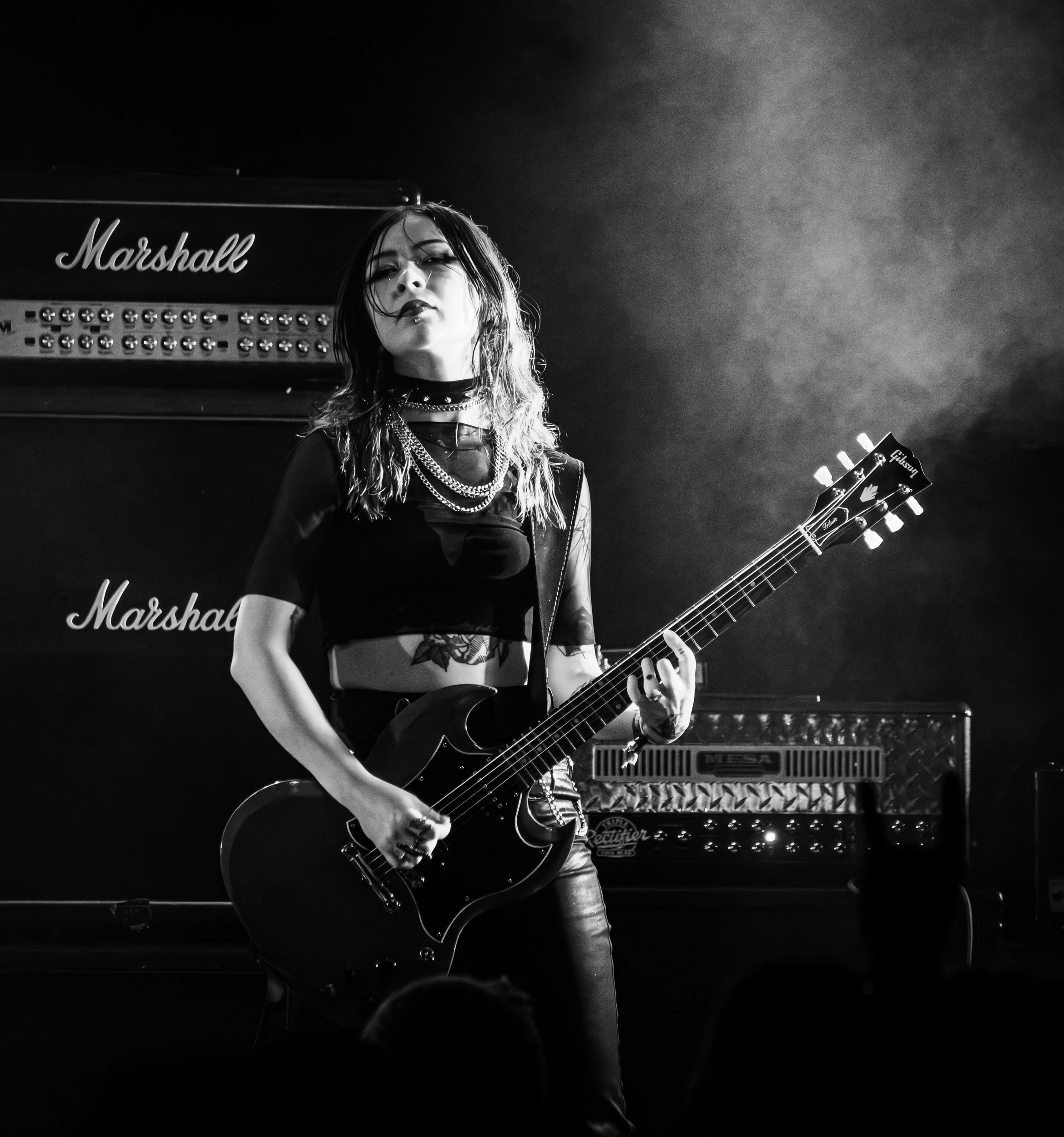 Second groupe entièrement féminin mis à l’honneur après Konvent, Crypta vient servir une dose de death/thrash metal old-school au public rassemblé devant John Dee ; un public qui, de tout évidence, l’attendait avec impatience, si j’en crois les cris de quelques personnes précédant de peu l’arrivée des quatre Brésiliennes sur scène ! Des cris que viennent bientôt supplanter les féroces vociférations de Fernanda Lira sur fond de The Other Side of Anger, issu du second album Shades of Sorrow, sorti en août 2023. En pleine tournée pour sa promotion, les quatre jeunes femmes sont motivées à bloc et le démontrent à grand renfort de headbang synchronisé au rythme des extraits de cet opus et de levés de poings en l’air en symbiose avec un public qui, pour sa part, exprime son ravissement face à cette leçon de metal extrême administrée par celles qui ont su s’imposer comme nouvelle valeur sûre du genre en à peine cinq ans de carrière. Le temps de set alloué à Crypta est court, mais largement suffisant à l’ex-frontwoman de Nervosa et ses consœurs pour livrer à l’Inferno une démonstration de la force de leur union en tant que musiciennes issues de milieux différents — du death/thrash pour les fondatrices Fernanda Lira et Luana Dametto au folk pour la guitariste Tainá Bergamaschi — et faire tomber les spectateurs masculins comme féminins sous leur charme vénéneux. Je reconnais pour ma part avoir un petit faible pour l’autre guitariste Jéssica di Falchi, benjamine du groupe par l’âge et par l’arrivée, au jeu et à la fougue très heavy metal « maidenesque »… ceci malgré un léger souci de son sur son instrument, heureusement vite résolu. [Ségolène]
