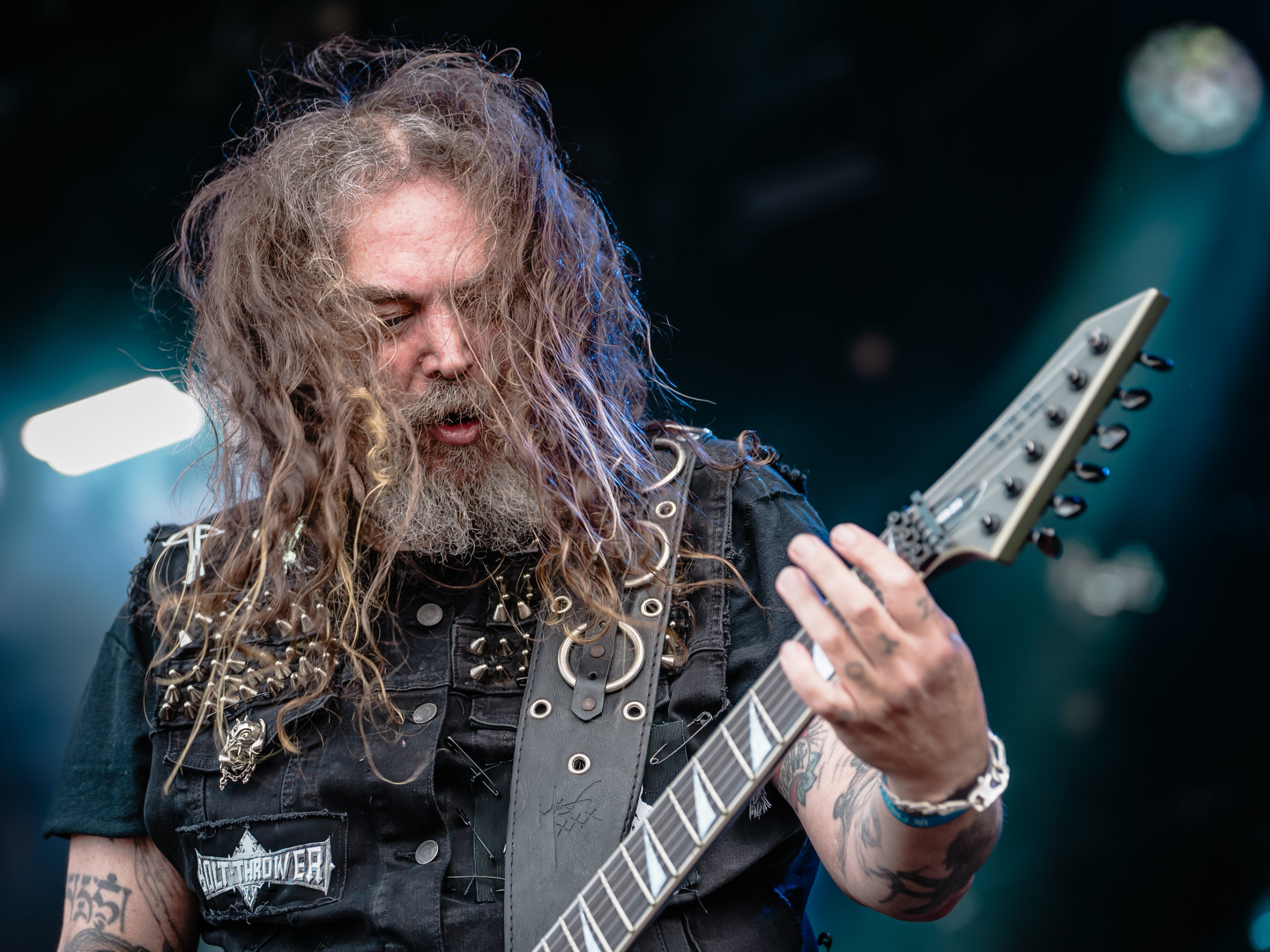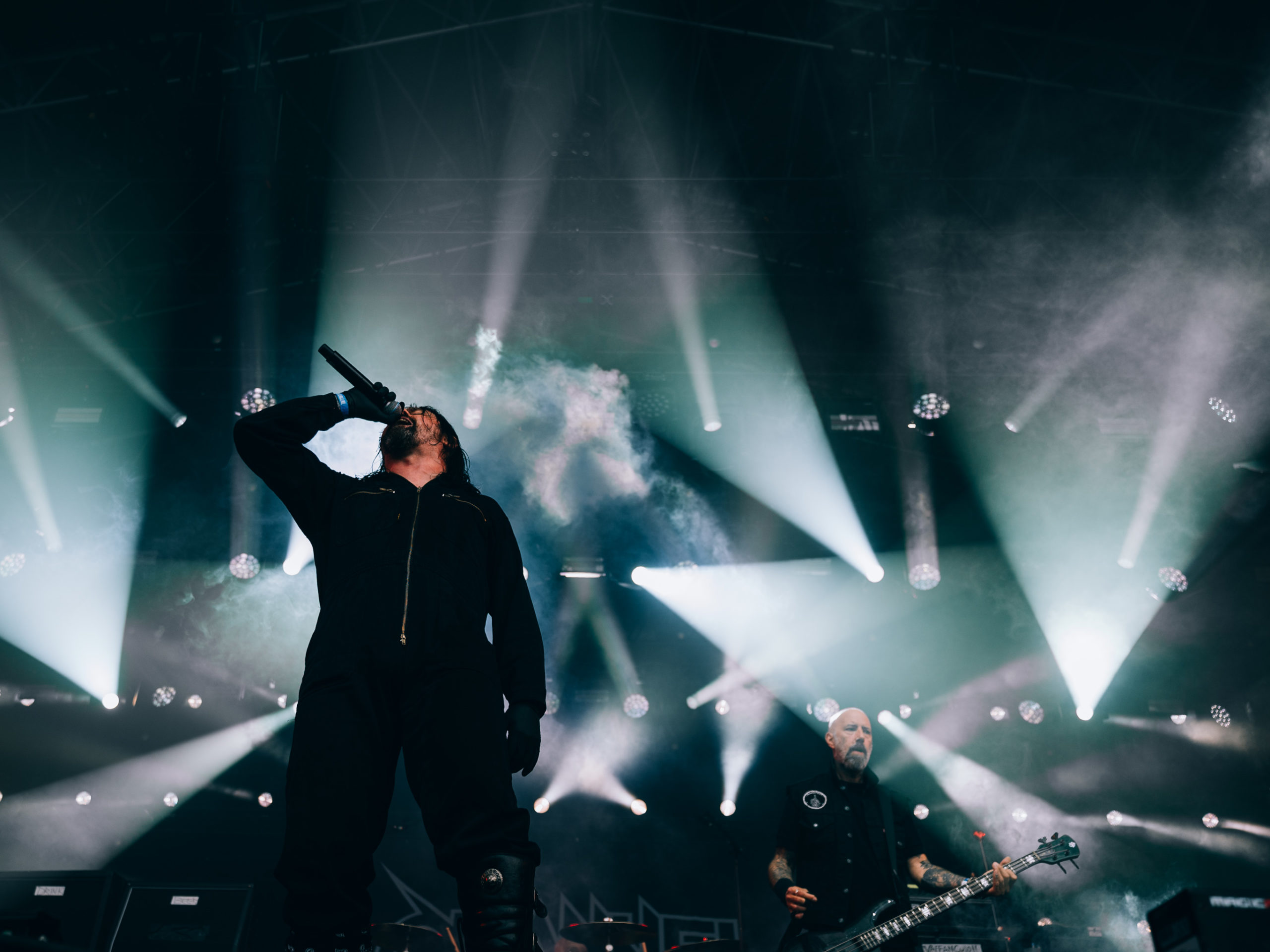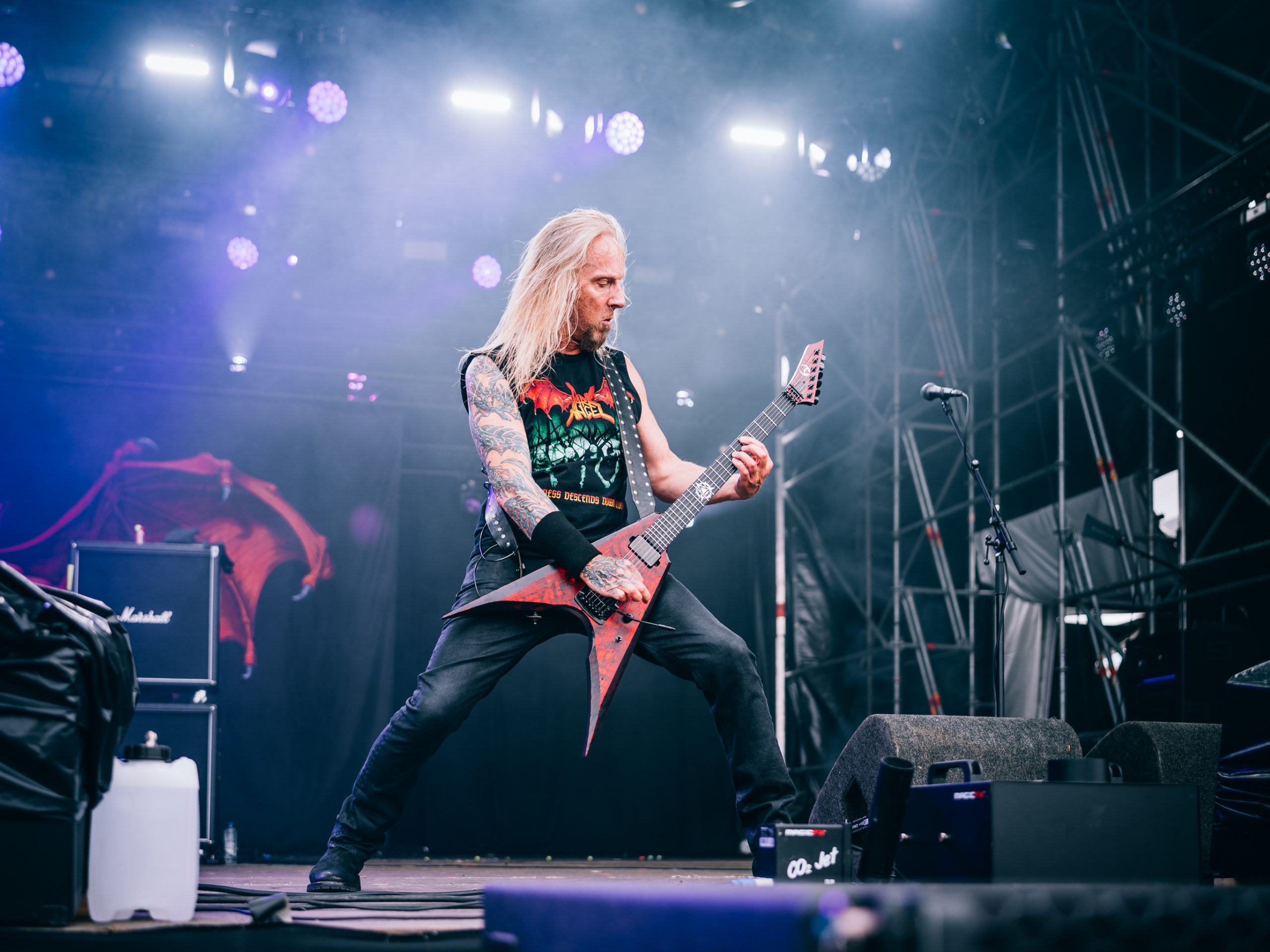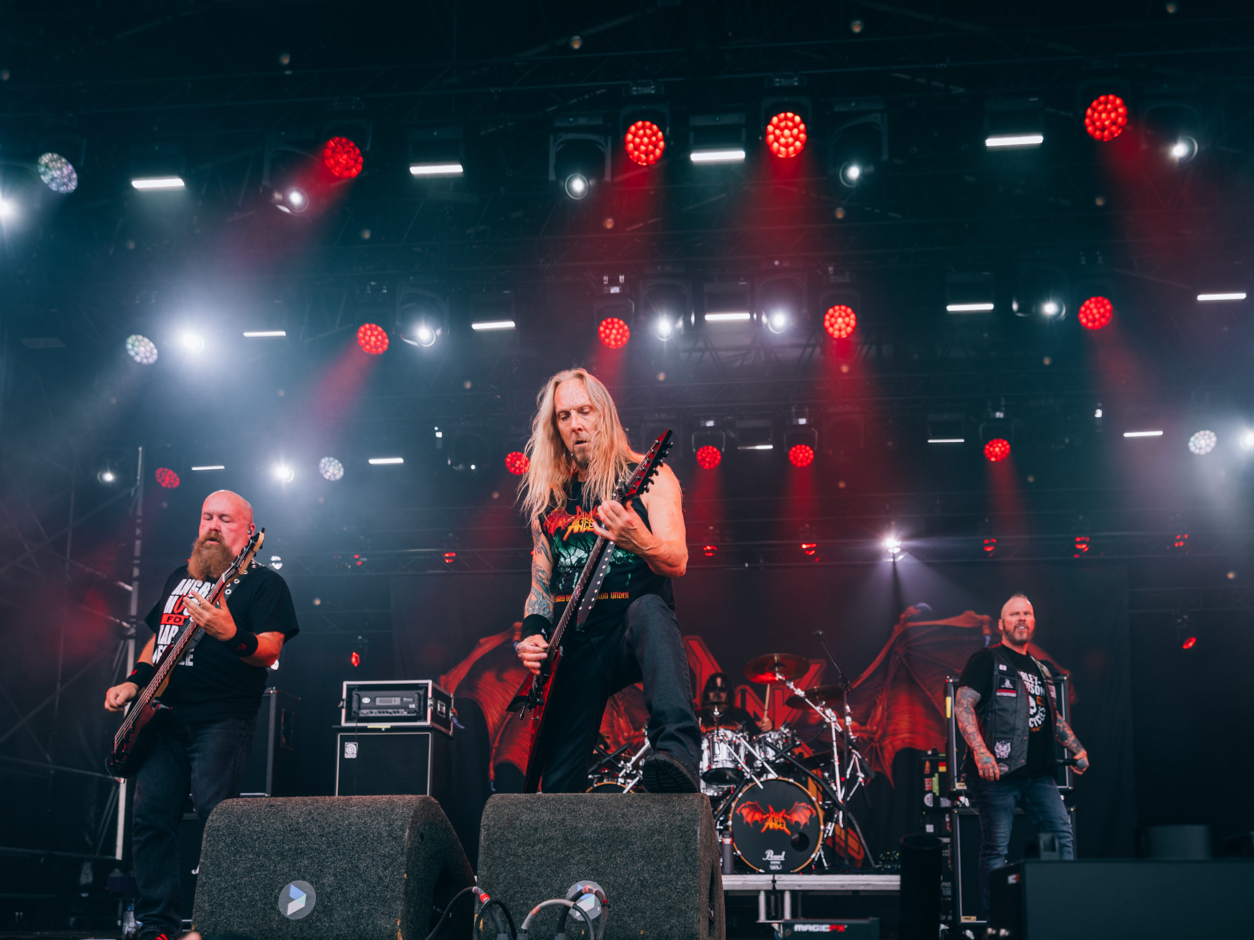 C’est à présent au tour de Dark Angel de venir en découdre. Dave Hoglan (batterie), que l’on considère souvent comme le taulier, arrive le premier sur scène, histoire de saluer rapidement le public avant de rejoindre ses fûts. Time Does Not Heal, plage titulaire de l’album sorti en 91 — et, accessoirement, dernier en date —, déboule, technique à souhait. Nous découvrons la guitariste Laura Christine, qui a rejoint les rangs du combo en 2023, suite au décès de Jim Durkin survenu cette même année. Elle semble très à l’aise et s’affirme par un headbanging souvent vigoureux, occupant l’espace comme si elle avait toujours été là, sans pour autant prendre toute la place. Assurément une recrue de choix. Les quatre albums publiés par les Californiens, We Have Arrived, le culte Darkness Descends, Leave Scars et le précédemment cité Time Does Not Heal, se verront représentés, et le récent single Extinction Level Event, sorti le 11 avril dernier et dernier titre écrit par Jim Durkin, sera joué en milieu de set. Le pit, déclenché juste avant sur No One Answers, s’élargit, et l’ambiance demeurera chaude jusqu’à la dernière note du concert, par ailleurs très bon.