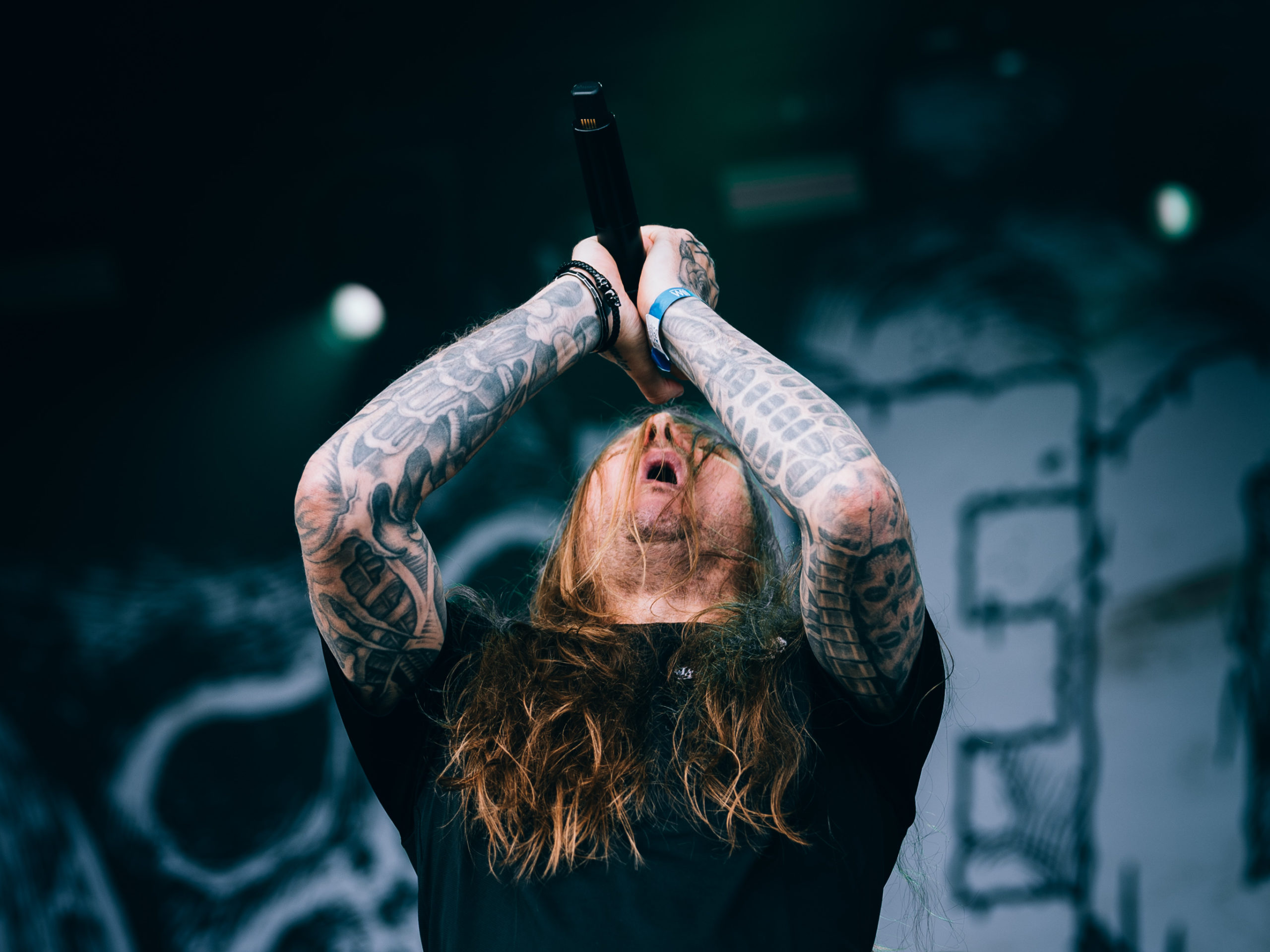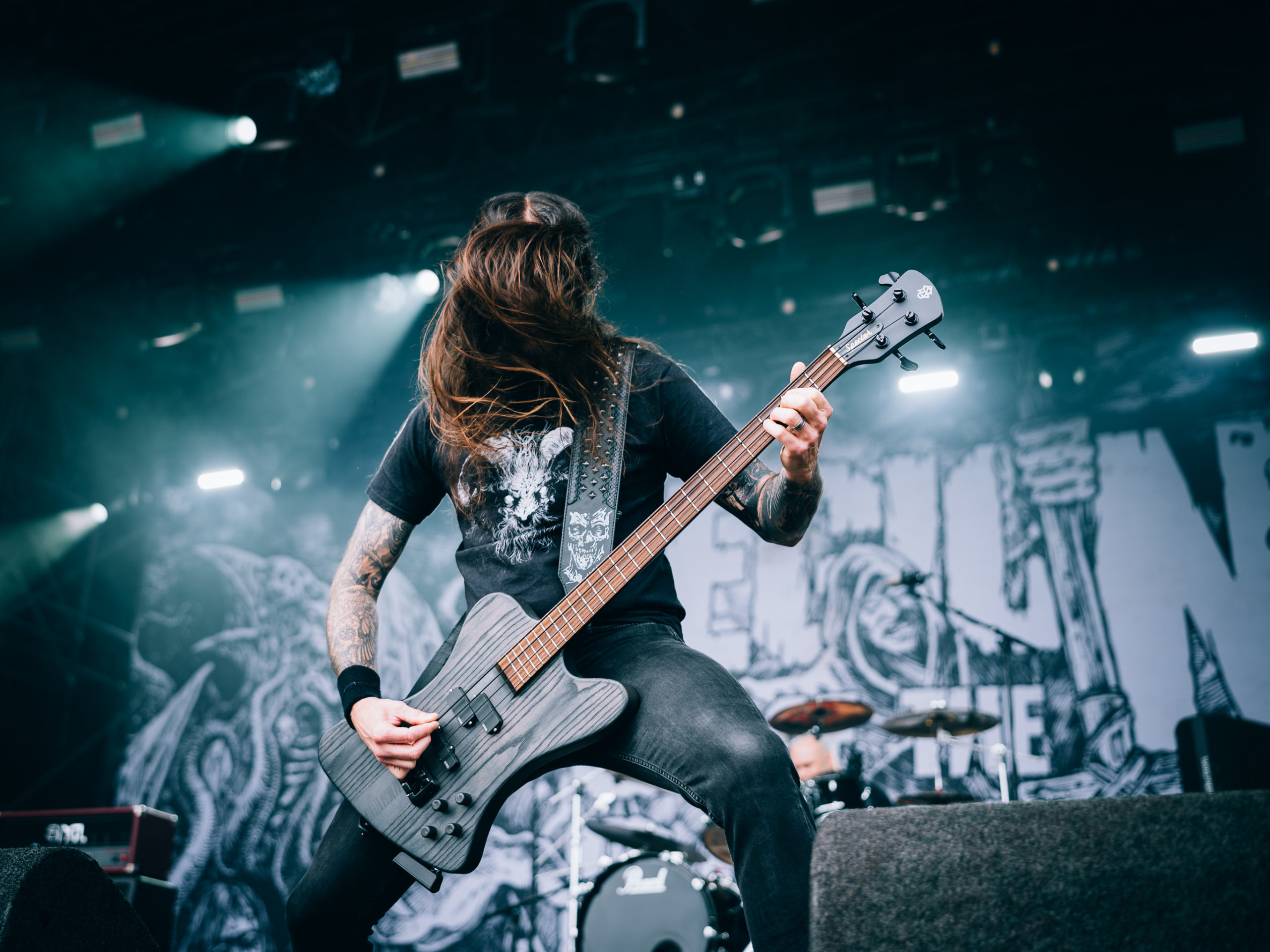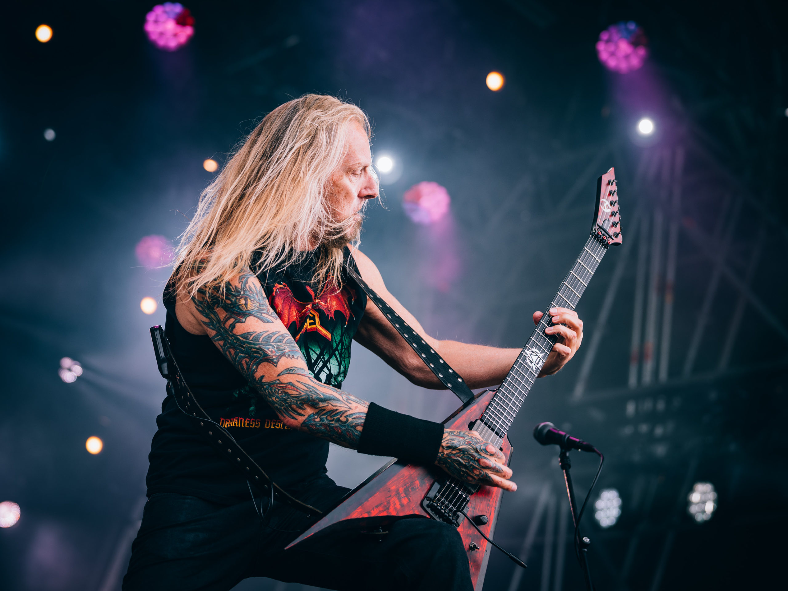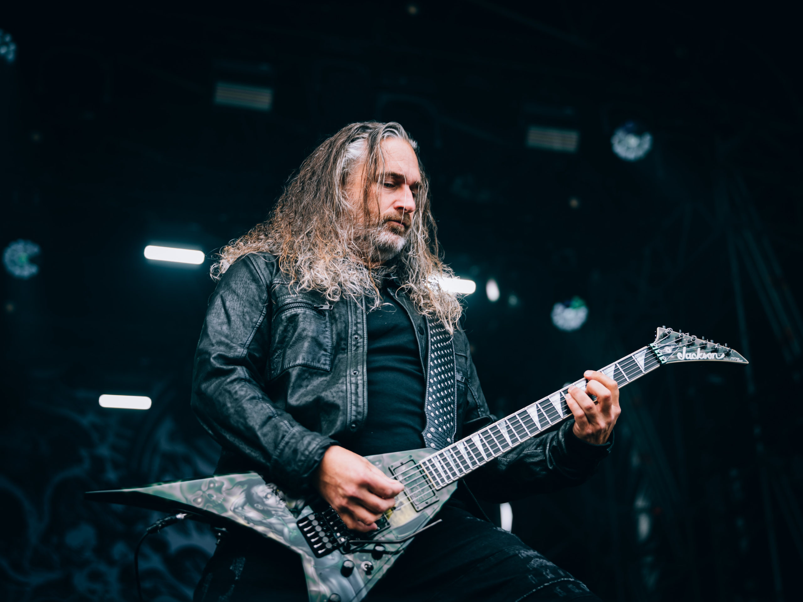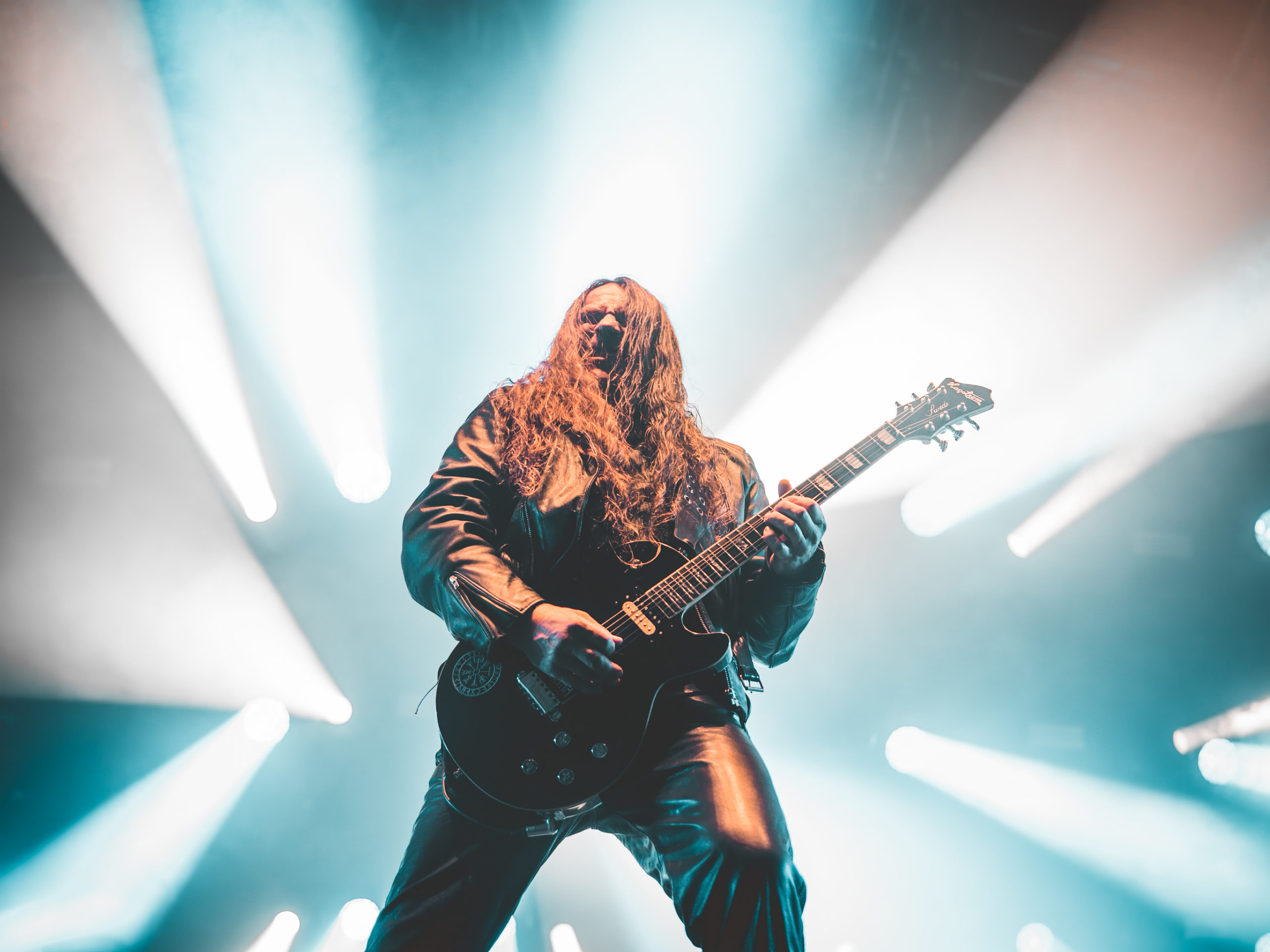 C’est à présent au tour de Dark Angel de venir en découdre. Dave Hoglan (batterie), que l’on considère souvent comme le taulier, arrive le premier sur scène, histoire de saluer rapidement le public avant de rejoindre ses fûts. Time Does Not Heal, plage titulaire de l’album sorti en 91 — et, accessoirement, dernier en date —, déboule, technique à souhait. Nous découvrons la guitariste Laura Christine, qui a rejoint les rangs du combo en 2023, suite au décès de Jim Durkin survenu cette même année. Elle semble très à l’aise et s’affirme par un headbanging souvent vigoureux, occupant l’espace comme si elle avait toujours été là, sans pour autant prendre toute la place. Assurément une recrue de choix. Les quatre albums publiés par les Californiens, We Have Arrived, le culte Darkness Descends, Leave Scars et le précédemment cité Time Does Not Heal, se verront représentés, et le récent single Extinction Level Event, sorti le 11 avril dernier et dernier titre écrit par Jim Durkin, sera joué en milieu de set. Le pit, déclenché juste avant sur No One Answers, s’élargit, et l’ambiance demeurera chaude jusqu’à la dernière note du concert, par ailleurs très bon.