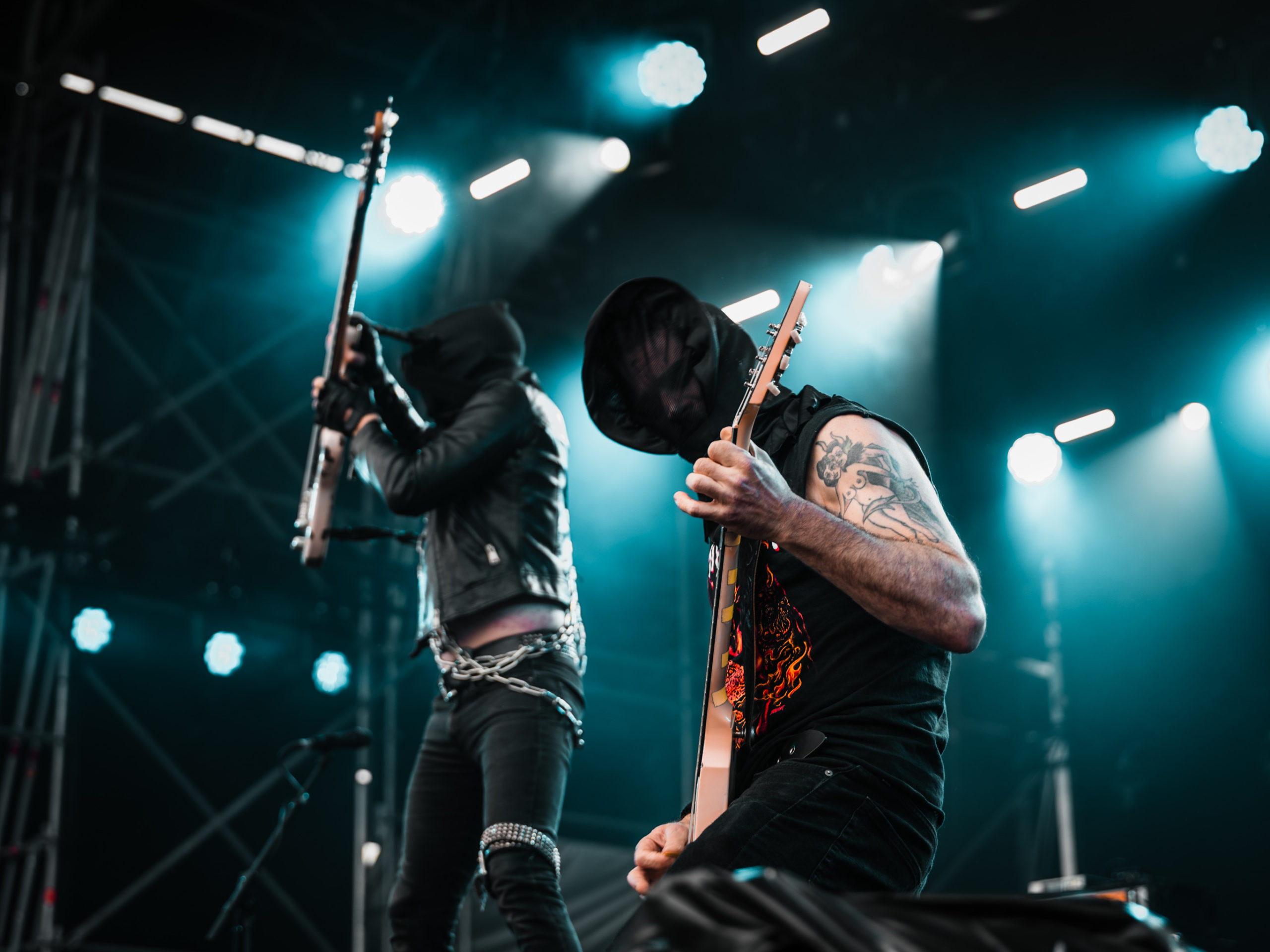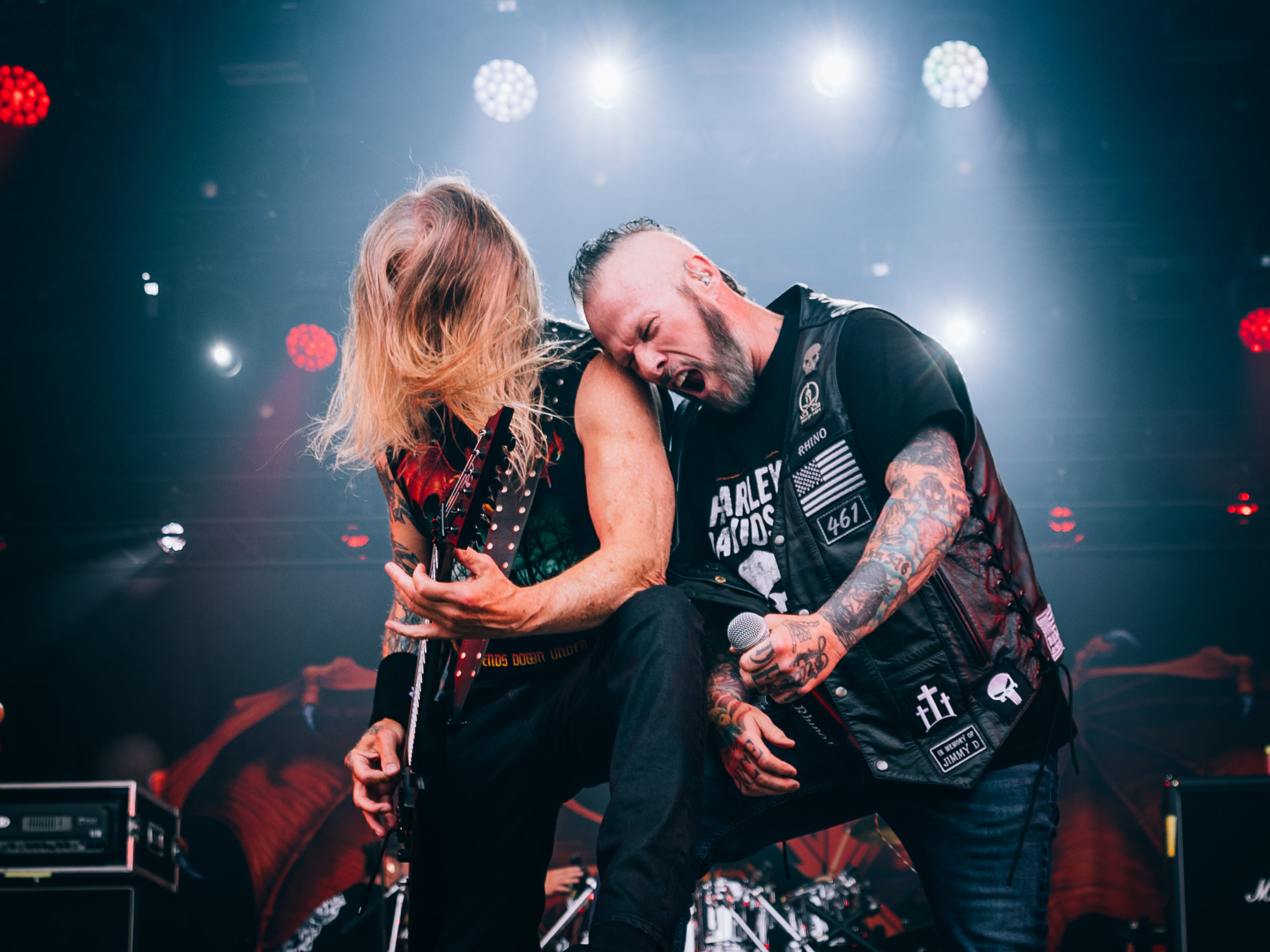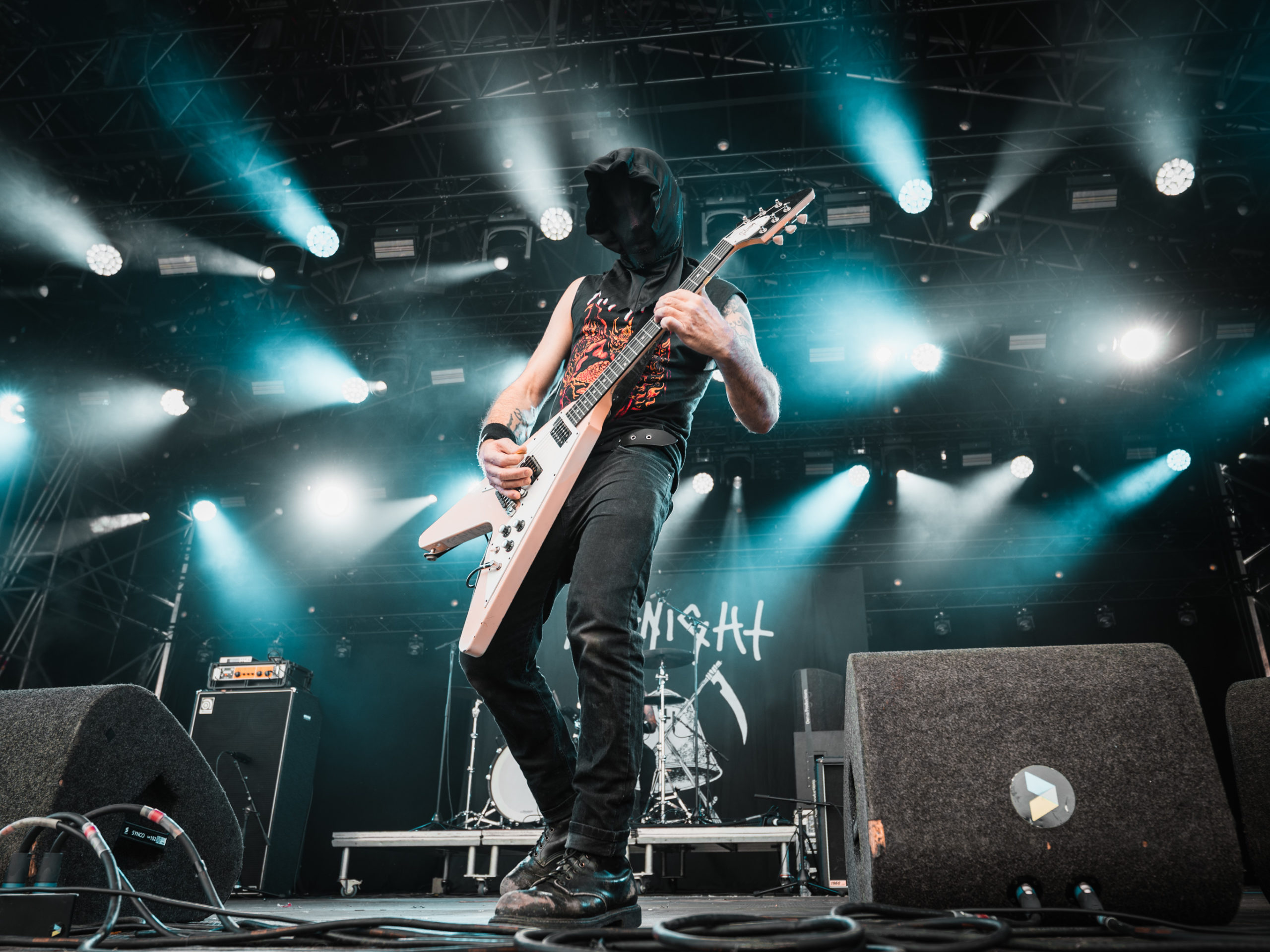 Quand vient le tour de Midnight de faire parler la poudre, le retard sur l’horaire s’est déjà réduit à quinze minutes. Les gaillards ont-ils pris sur eux pour s’installer plus vite que prévu, ou considèrent-ils que les soudchecks, c’est pour les mauviettes ? Toujours est-il que leur set ne souffre en rien de cette supposée précipitation et que leur black’n’roll/speed metal — sans fioritures, il est vrai — passe sans aucun mal, alors que le temps semble défiler à toute vitesse à l’écoute de cette musique aussi basique que jouissive. Encagoulés et toutes cartouchières dehors, Athenar (basse/chant) et Sorg of Satan (guitare) échangent régulièrement leurs positions sur scène pour se retrouver chacun son tour du côté droit ou gauche, afin, sans doute, que chaque spectateur, où qu’il se trouve, puisse apercevoir de plus près son héros. N’est-ce pas très chou ?