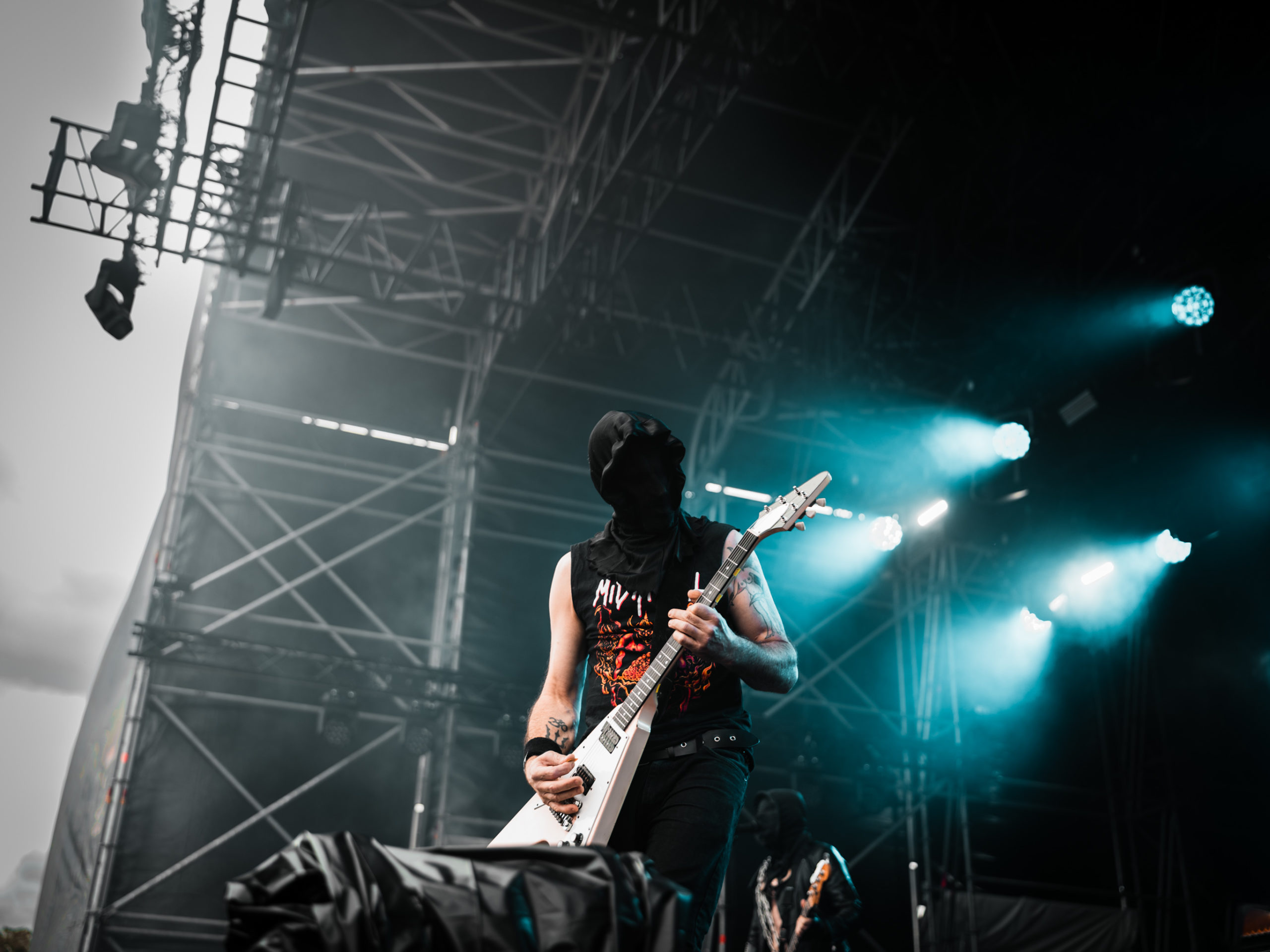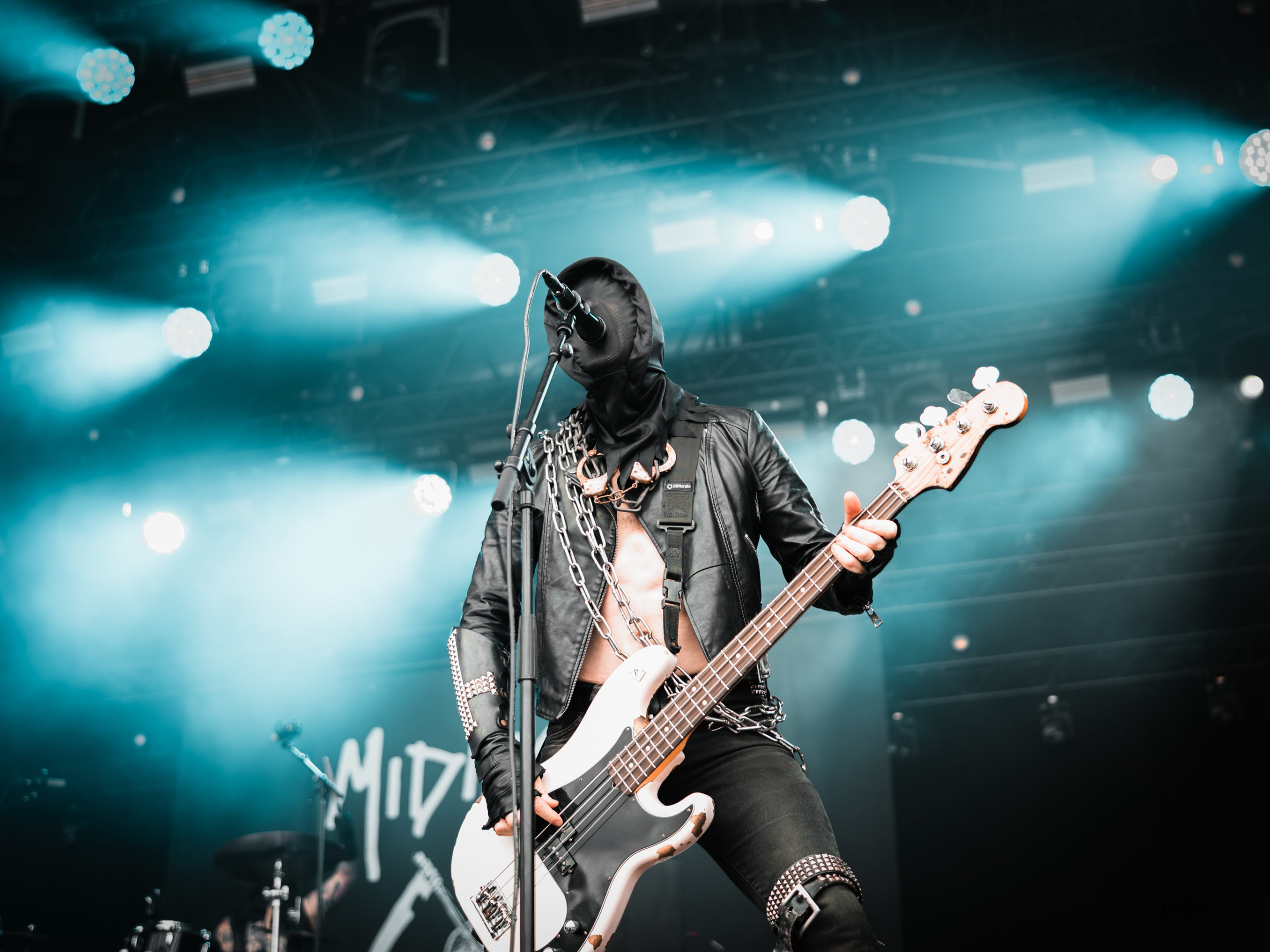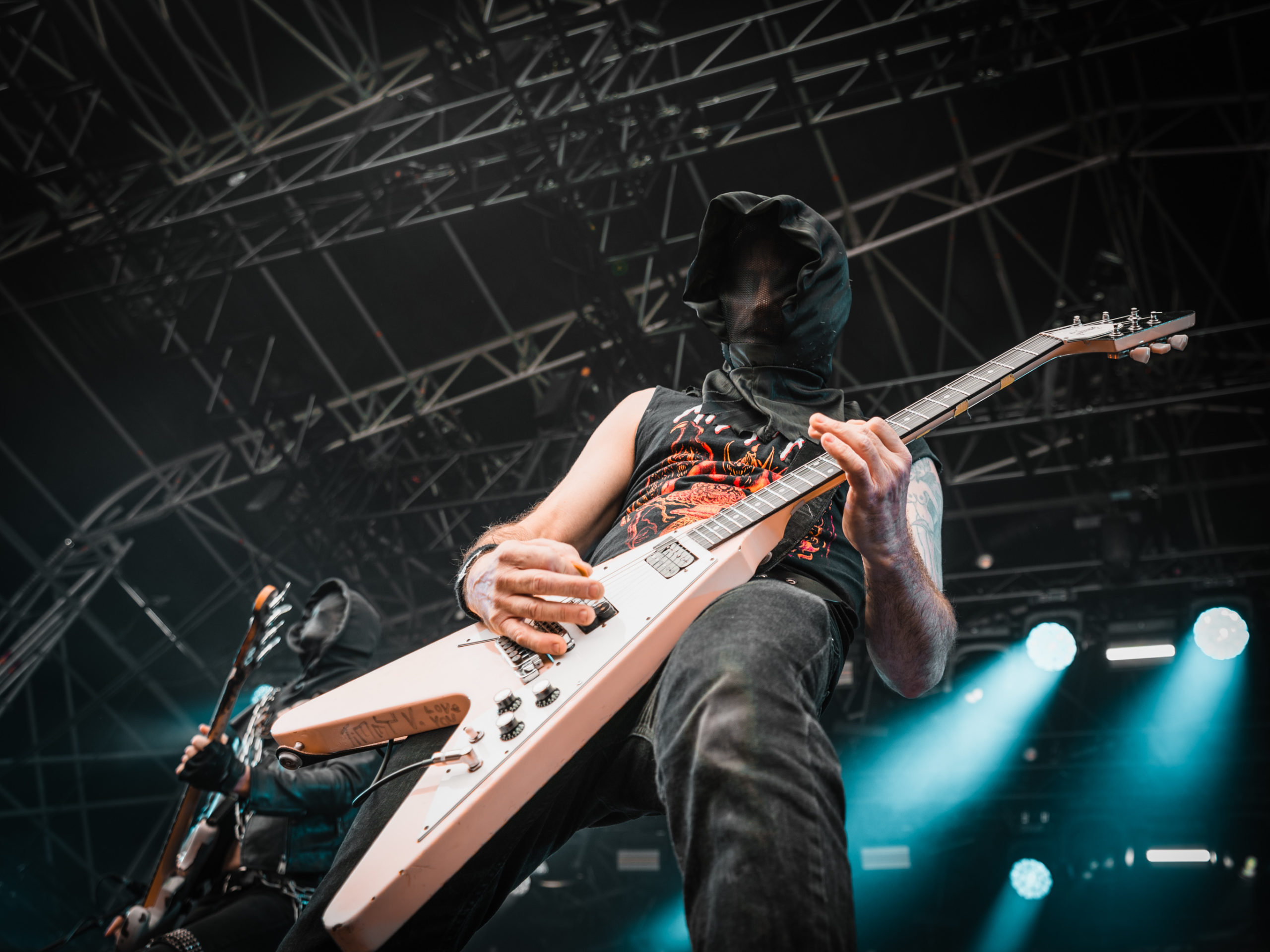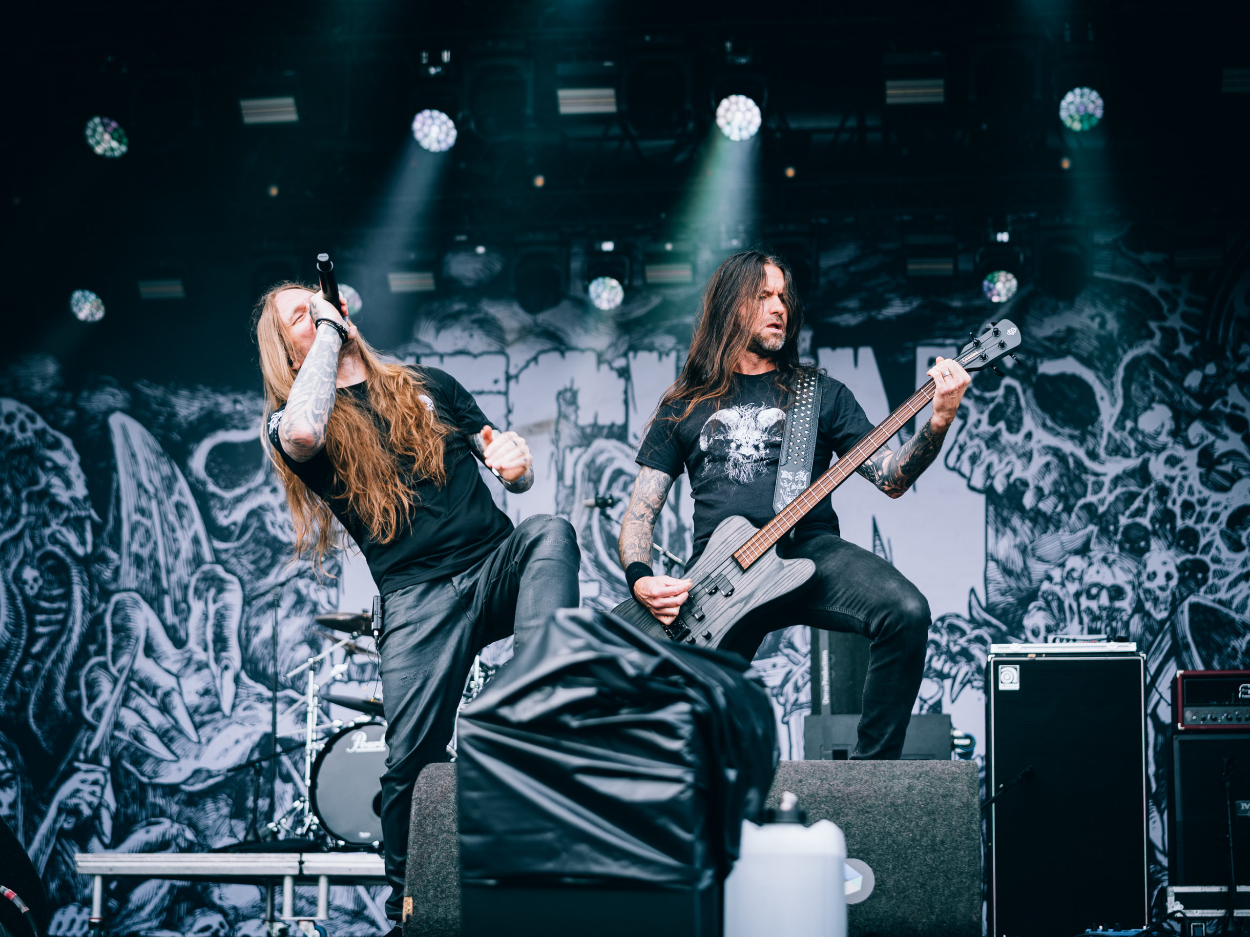 Quand vient le tour de Midnight de faire parler la poudre, le retard sur l’horaire s’est déjà réduit à quinze minutes. Les gaillards ont-ils pris sur eux pour s’installer plus vite que prévu, ou considèrent-ils que les soudchecks, c’est pour les mauviettes ? Toujours est-il que leur set ne souffre en rien de cette supposée précipitation et que leur black’n’roll/speed metal — sans fioritures, il est vrai — passe sans aucun mal, alors que le temps semble défiler à toute vitesse à l’écoute de cette musique aussi basique que jouissive. Encagoulés et toutes cartouchières dehors, Athenar (basse/chant) et Sorg of Satan (guitare) échangent régulièrement leurs positions sur scène pour se retrouver chacun son tour du côté droit ou gauche, afin, sans doute, que chaque spectateur, où qu’il se trouve, puisse apercevoir de plus près son héros. N’est-ce pas très chou ?
