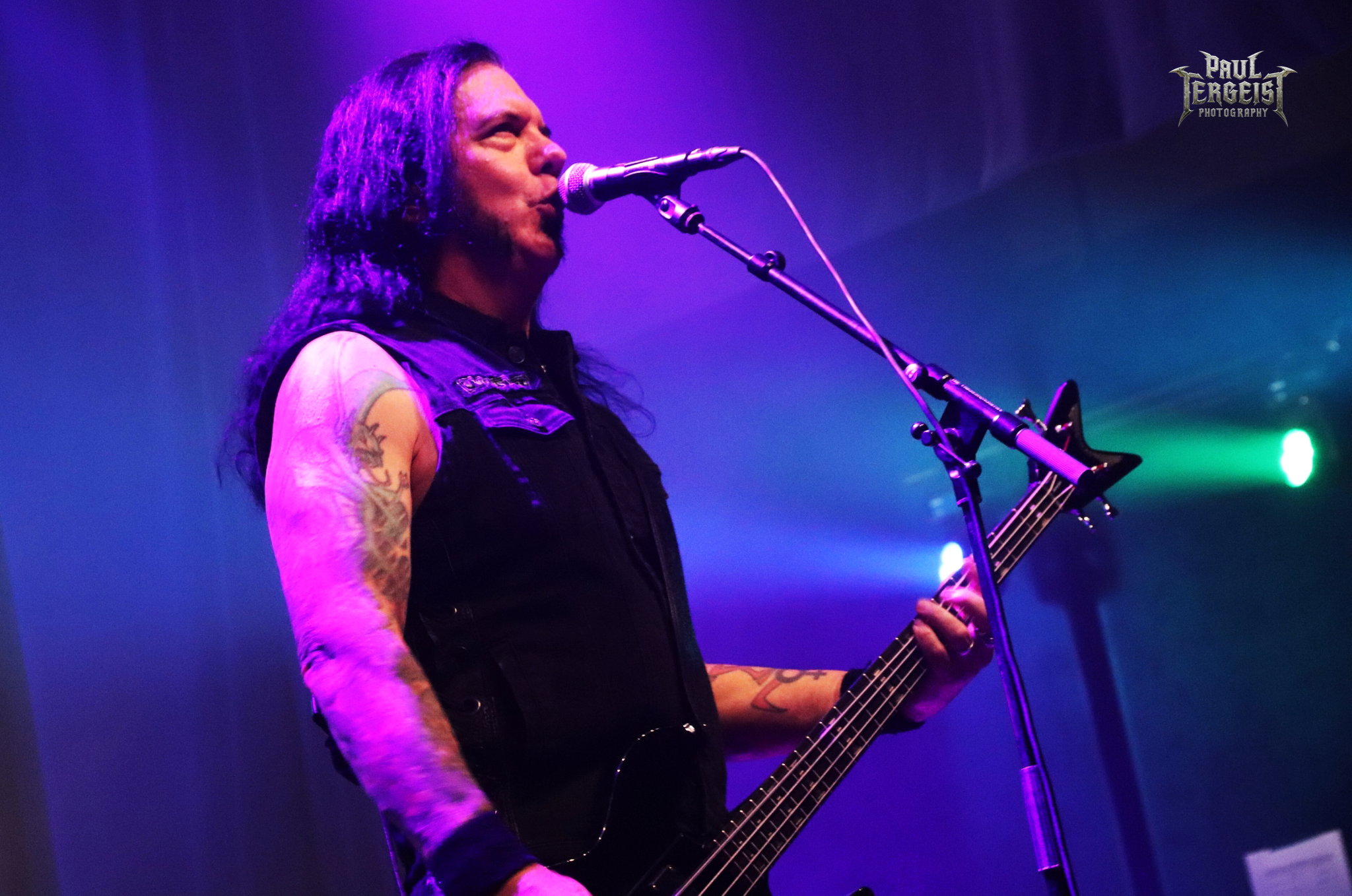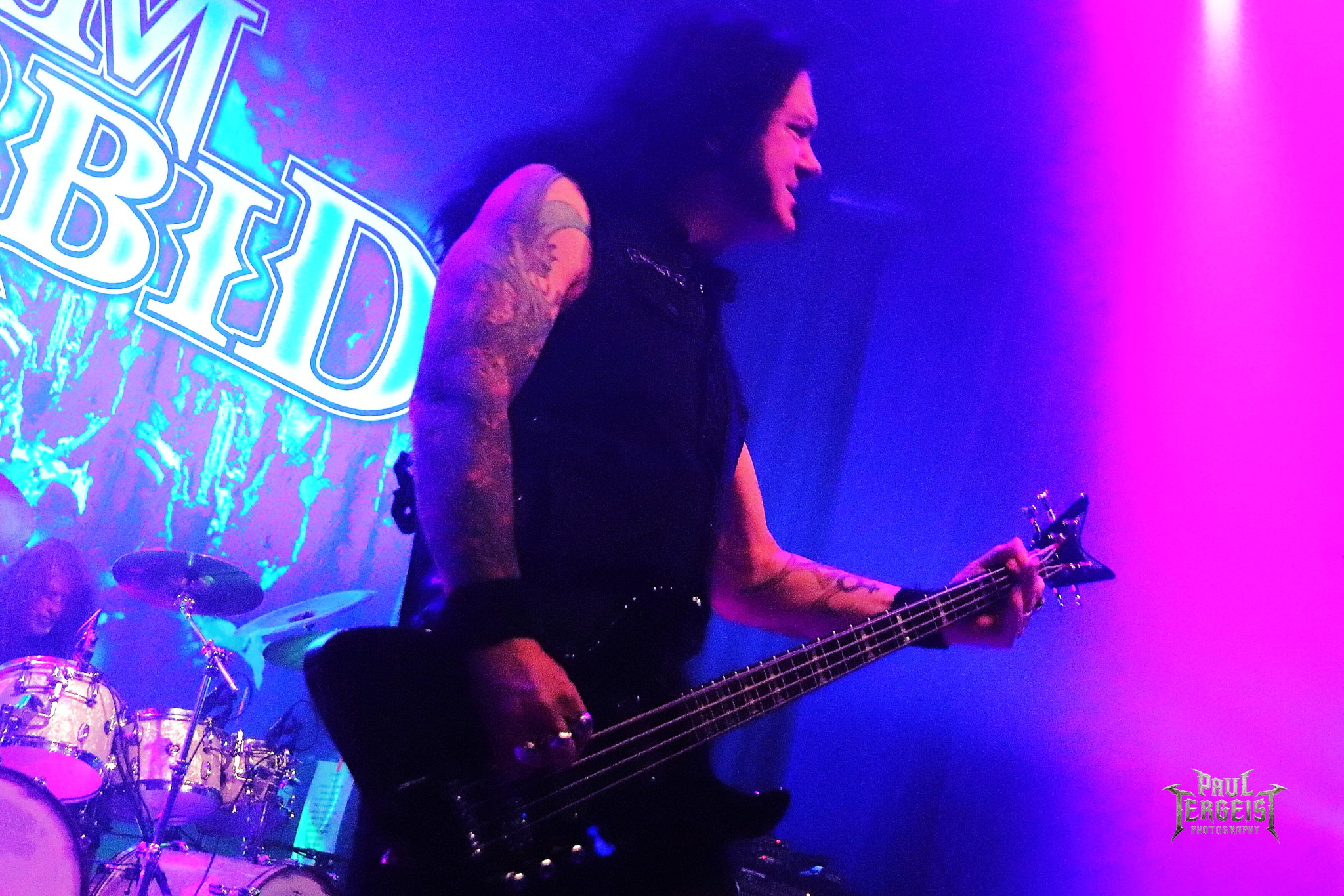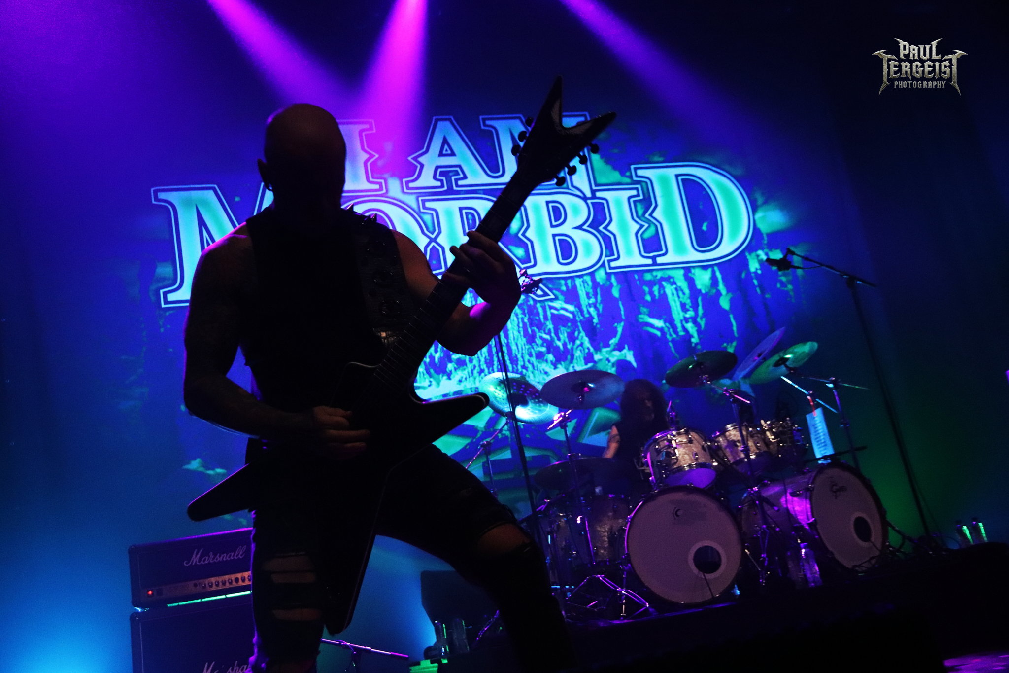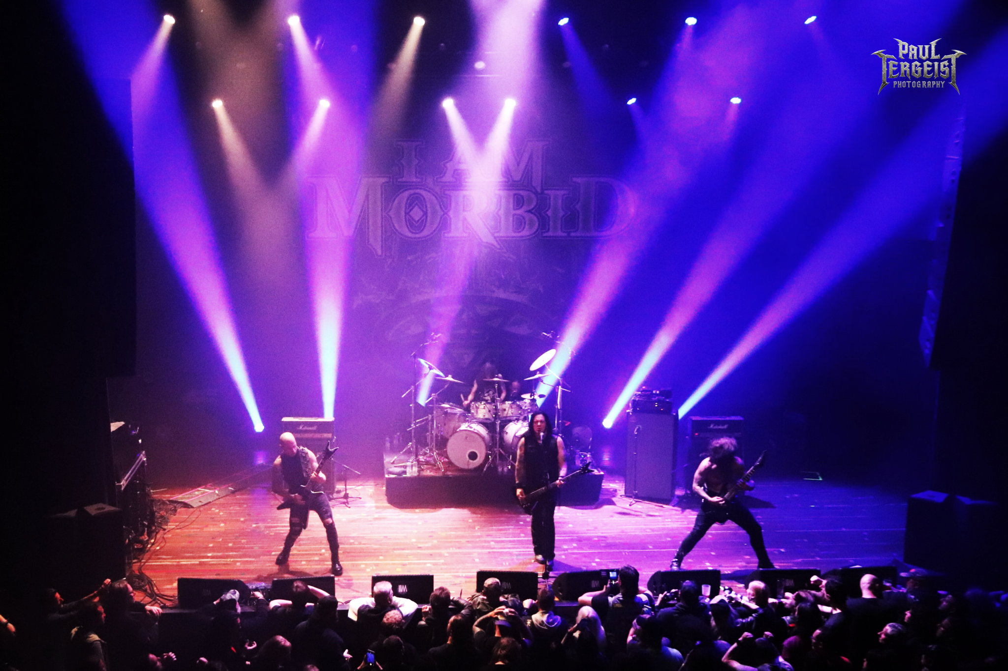 Cela étant, nous sommes surtout là pour I Am Morbid, drivé par David Vincent (ex-Morbid Angel), qui déclare donc, par le biais du patronyme donné à son groupe, qu’il est Morbid Angel. Dans les faits et au jour d’aujourd’hui, il n’a pas entièrement tort. La tournée actuelle d’I Am Morbid vise à célébrer les trente ans de l’album Domination de Morbid Angel. David avait la possibilité d’interpréter l’album dans son intégralité et d’offrir un petit best of de Morbid Angel en prime, ou de l’interpréter en bonne partie et de servir un gros best of par-dessus. C’est cette seconde option qui a été retenue, ce qui, finalement, n’est pas plus mal. Les extraits de Domination s’enchaînent d’abord sans temps morts : Dominate, Where the Slime Lives, Eyes to See, Ears to Hear, avant lequel David nous fait un petit speech en rapport avec la thématique abordée par ce titre, à savoir l’importance de penser par soi-même en fonction de ce que nous observons grâce à nos sens, puis digresse vers les dangers de l’IA et les diktats de l’industrie musicale et de la société visant à nous imposer nos goûts musicaux, pour conclure en déclarant que nous, les metalleux, sommes des « vrais » qui n’écoutons que nos préférences profondes et faisons vivre les œuvres des musiciens à travers le temps, les rendant éternelles. En résumé, un discours classique, à la fois juste et très cliché. Côté best of, citons, dans le désordre et de façon non exhaustive, Immortal Rites, Chapel of Ghouls, Blessed Are the Sick ou encore Rapture. Ainsi, vous l’aurez compris, hormis un léger accent mis sur Domination, nous avons eu droit à un bon concert de Morbid Angel, alors que les détenteurs légaux du patronyme errent quelque part dans les limbes depuis un bon bout de temps.