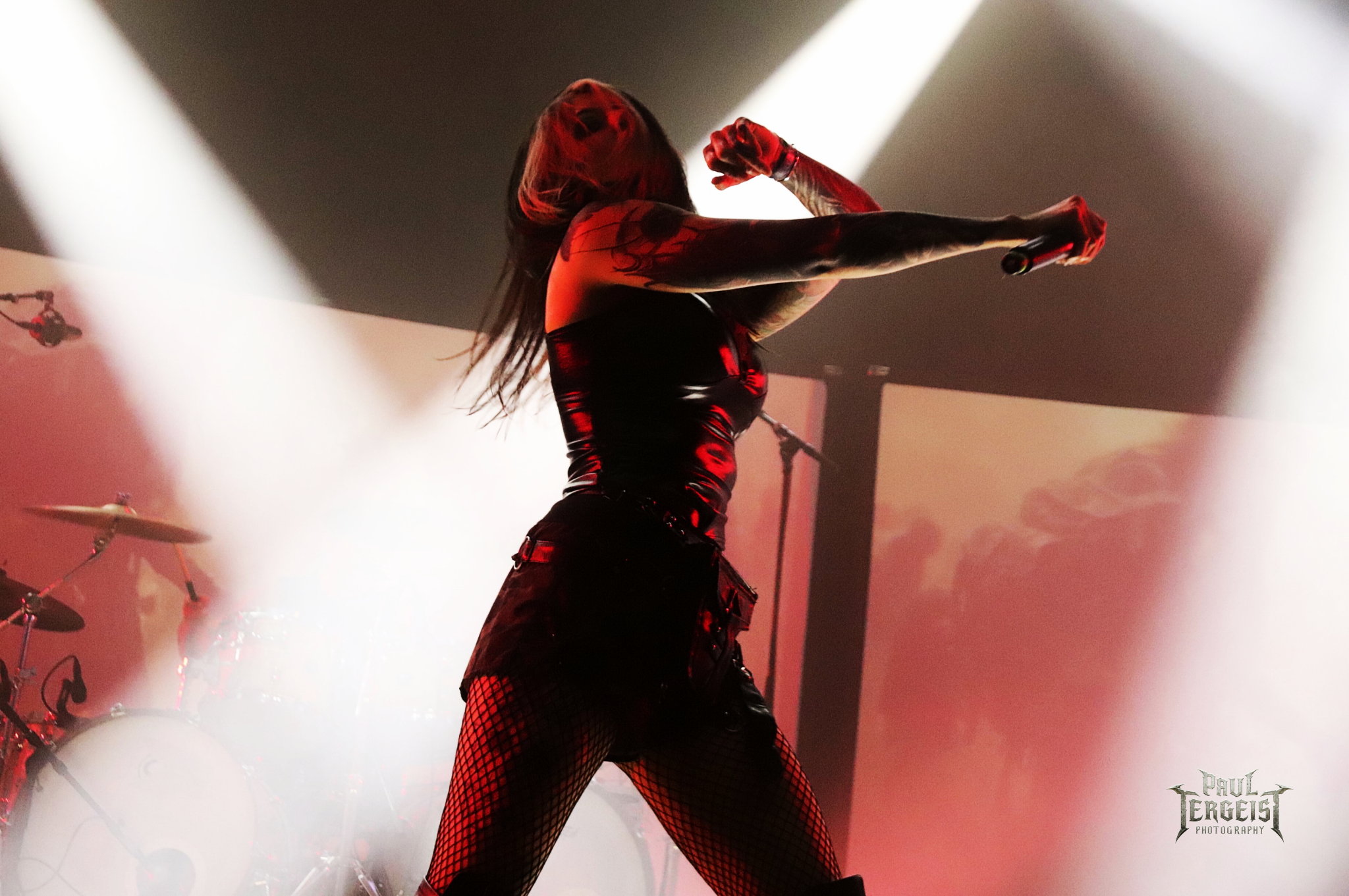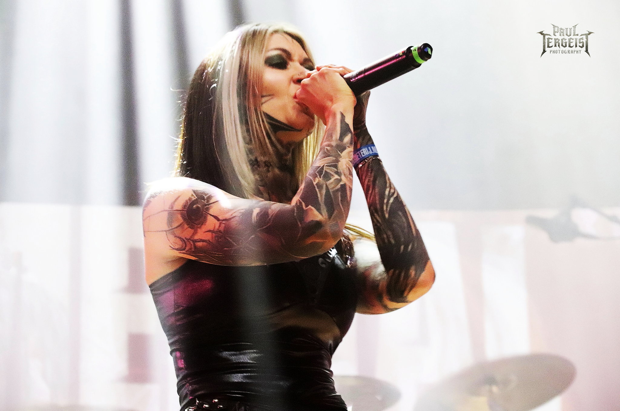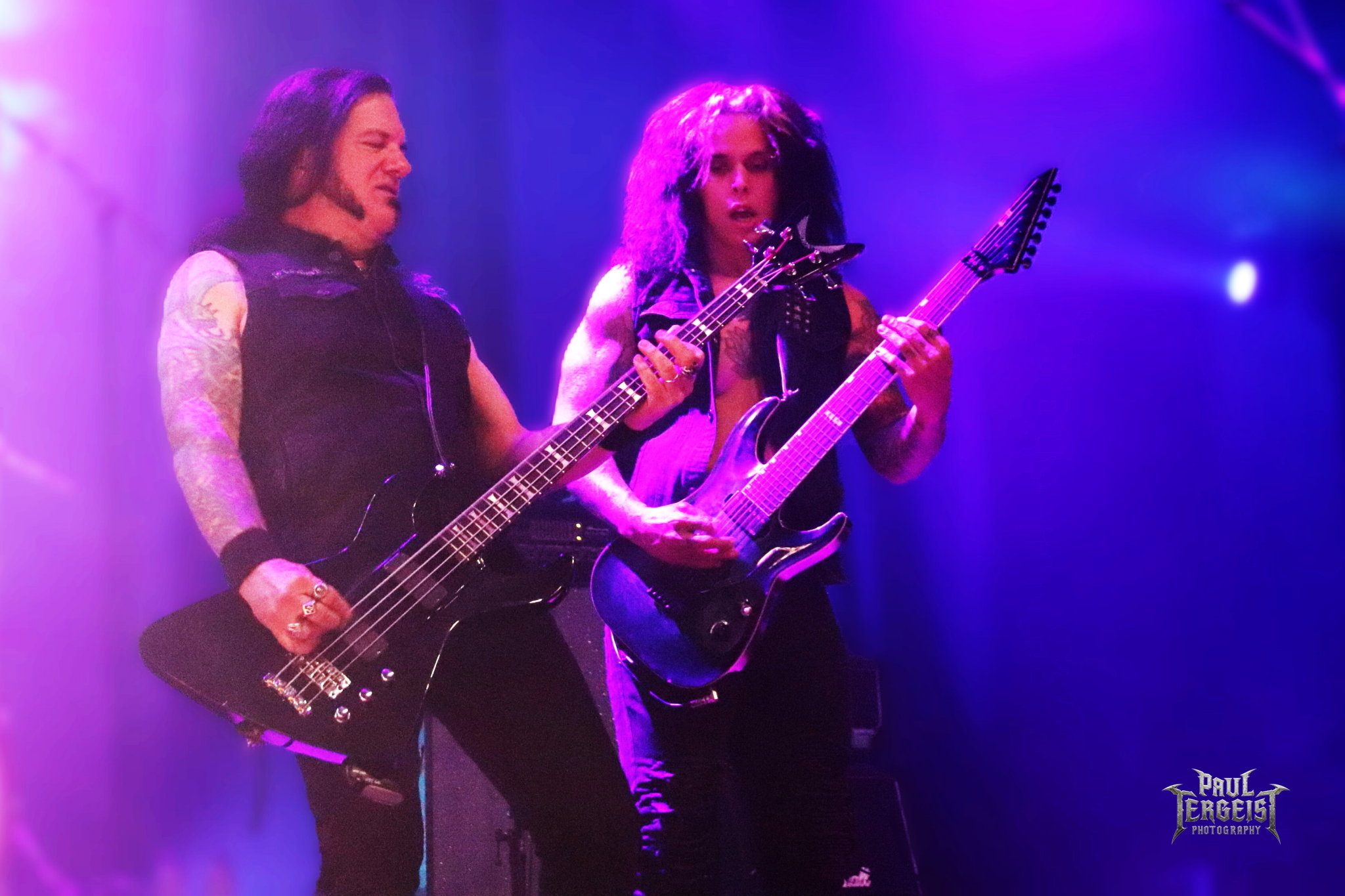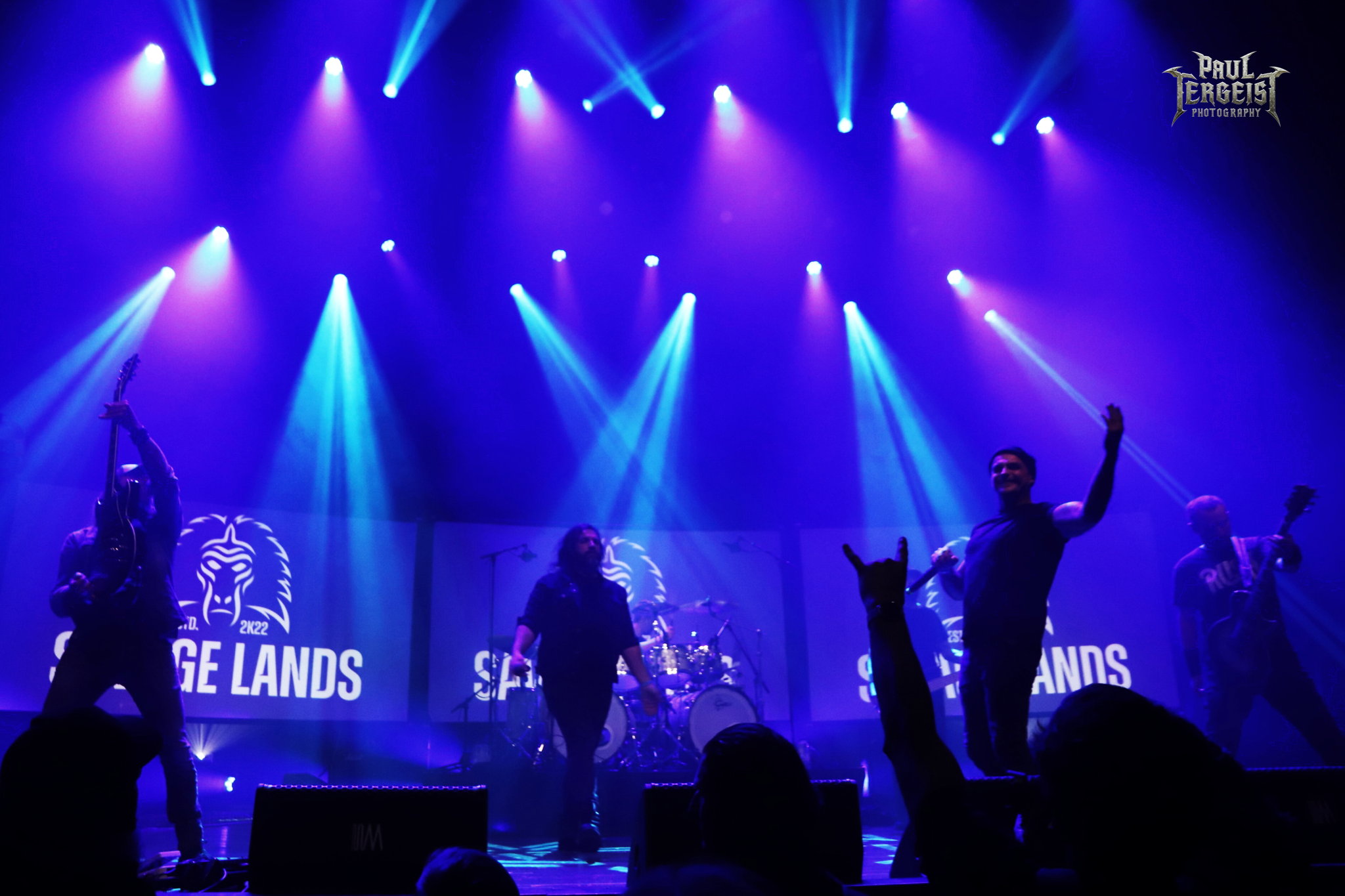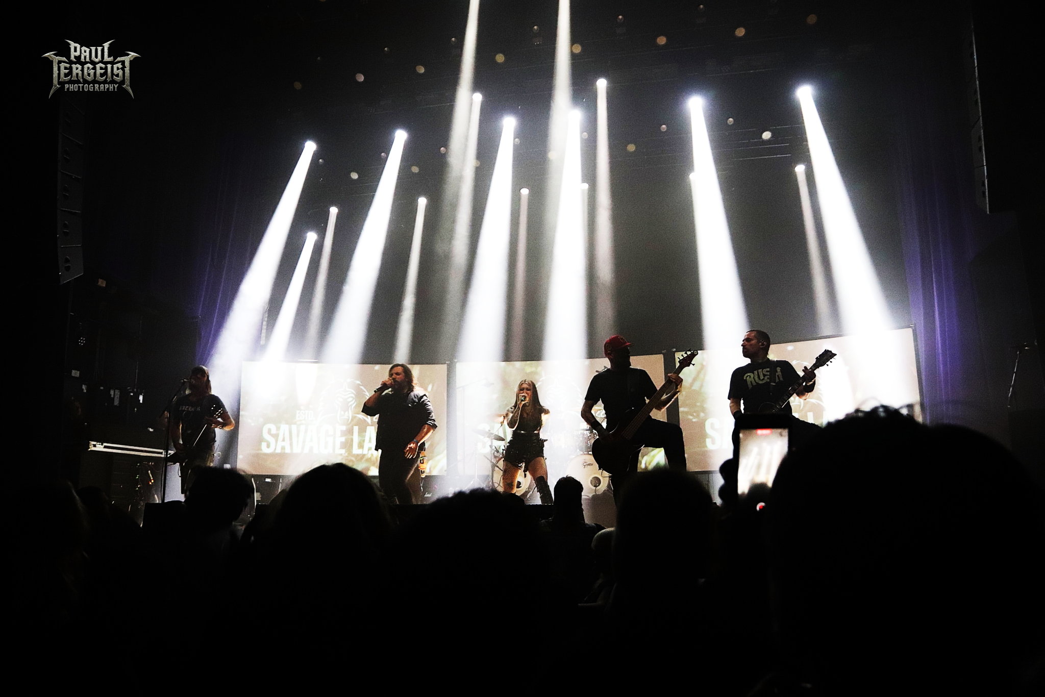 Premier groupe de cette fin de soirée en indoor, Savage Lands, le combo à vocation écologique formé par Dirk Verbeuren (batterie, Megadeth) et qui vient de sortir son premier album, Army of the Trees. Dirk ne jouera pas en live, sans doute occupé par l’enregistrement du nouveau Megadeth, c’est donc un line up partiellement identifié qui nous fera l’honneur de sa présence ce soir. On citera seulement, sans trop risquer de se tromper, le vocaliste titulaire Poun (Black Bomb A), dont le chant clair fait songer à Mike Patton (Faith No More) et dont la voix hurlée complète l’offre pour fournir une variété de sons bienvenue. Une reprise sympa du Whole Lotta Rosie d’AC/DC et plusieurs apparitions de Chloé Trujillo (née Barthélémy à Paris en 1972 et épouse de Robert Trujillo), chanteuse aux multiples facettes — ici tantôt lyrique, tantôt growleuse — et au jeu de scène sensuel en diable, nous font passer un bon moment.