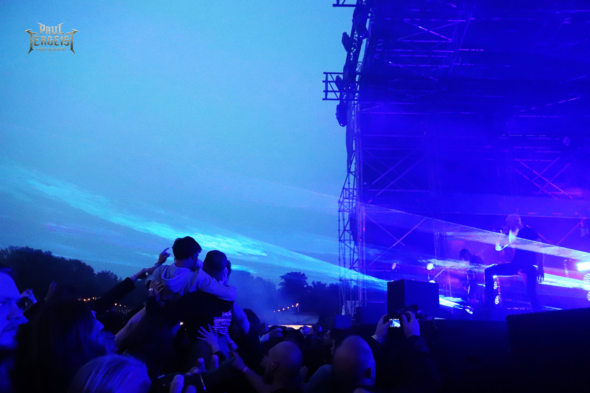 Meshuggah bénéficie d’un succès mérité mais quelque peu étonnant, son math metal ne pouvant pas franchement être qualifié de facile d’accès. Riffs mécaniques, saccadés, contretemps, solos dissonants ou non, le tout sur de grosses rythmiques ; telle pourrait être la définition de la surpuissance musicale, qui plaît aux fans de metal qui cogne dur, et qui pourrait en partie expliquer l’engouement pour Meshuggah. Les jeux de lasers renforcent l’immersion dans un monde mécanique et hostile ; en outre, les zicos sont statiques, ce qui, paradoxalement, participe à un jeu de scène qui renforce l’aspect monolithique d’un tout. Choix difficile pour une tête d’affiche, mais pari gagné, car Meshuggah a réussi à fédérer et à conclure en beauté ce premier South of Heaven Open Air. Enfin, presque, puisque nous nous rendons à présent au Muziekgieterij, la salle toute proche qui accueille les concerts en after, et notamment celui d’I Am Morbid.