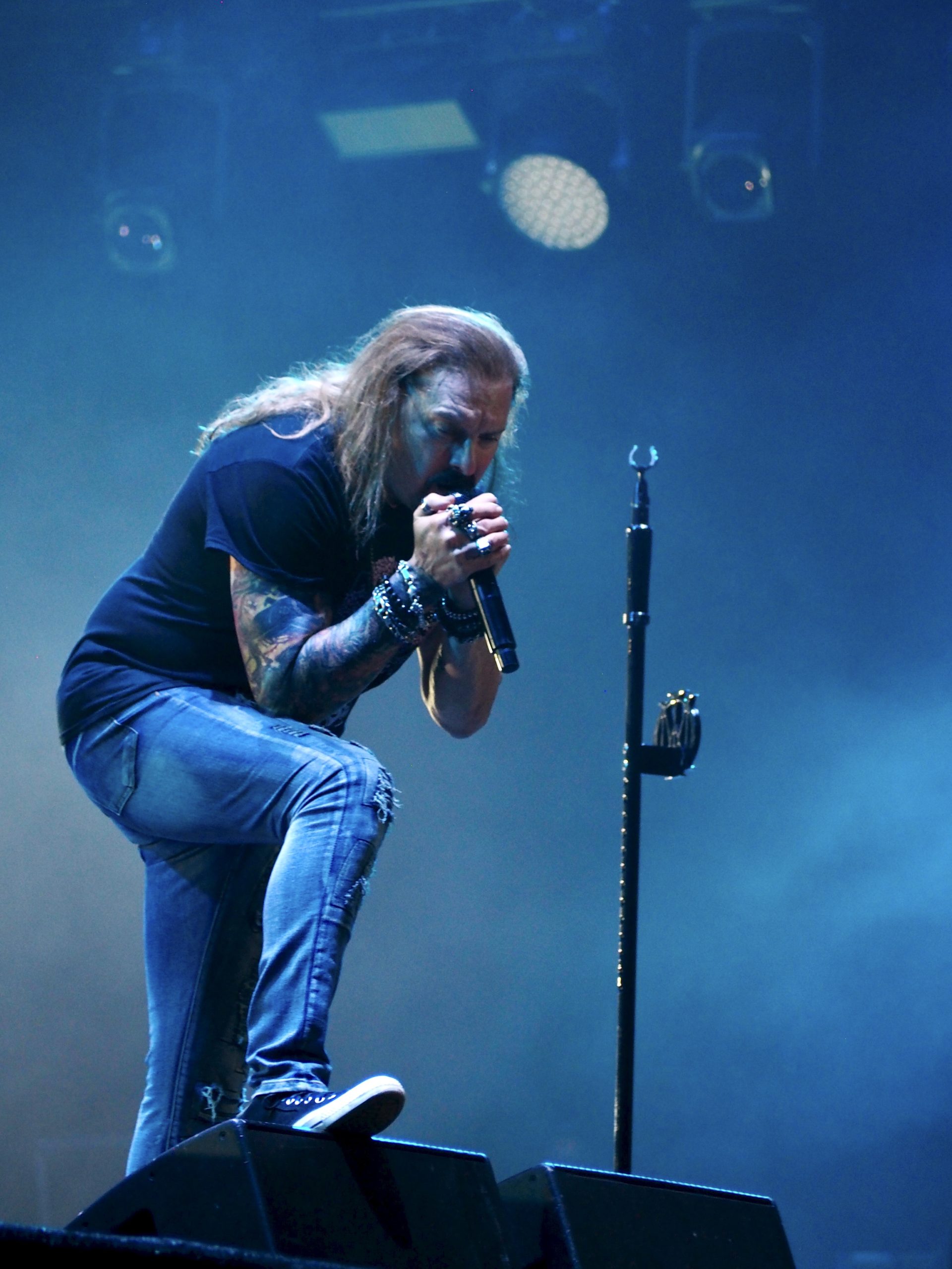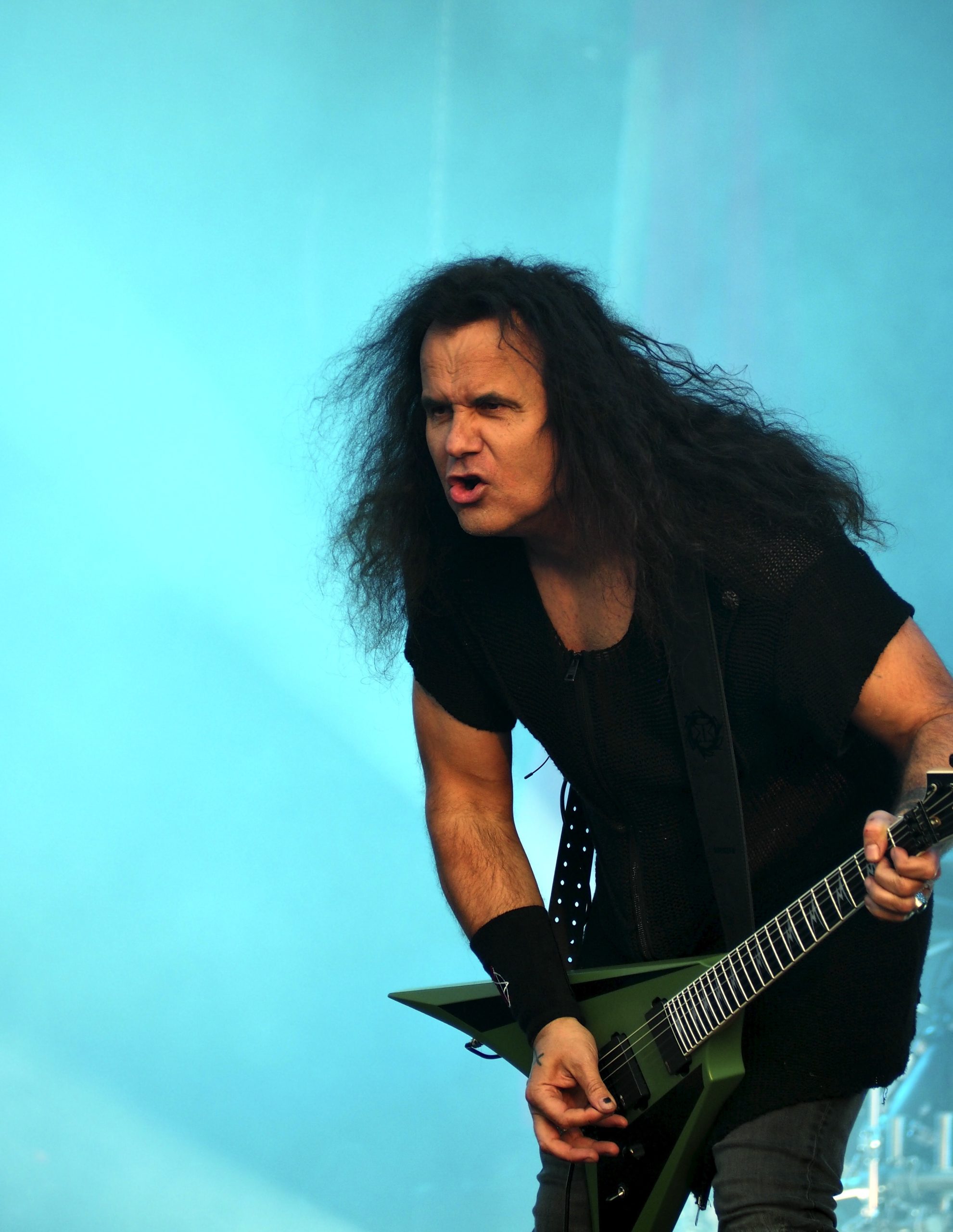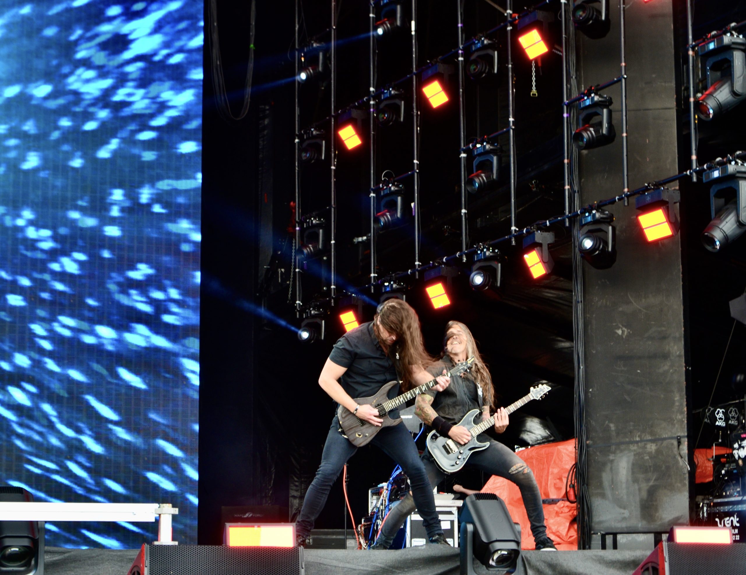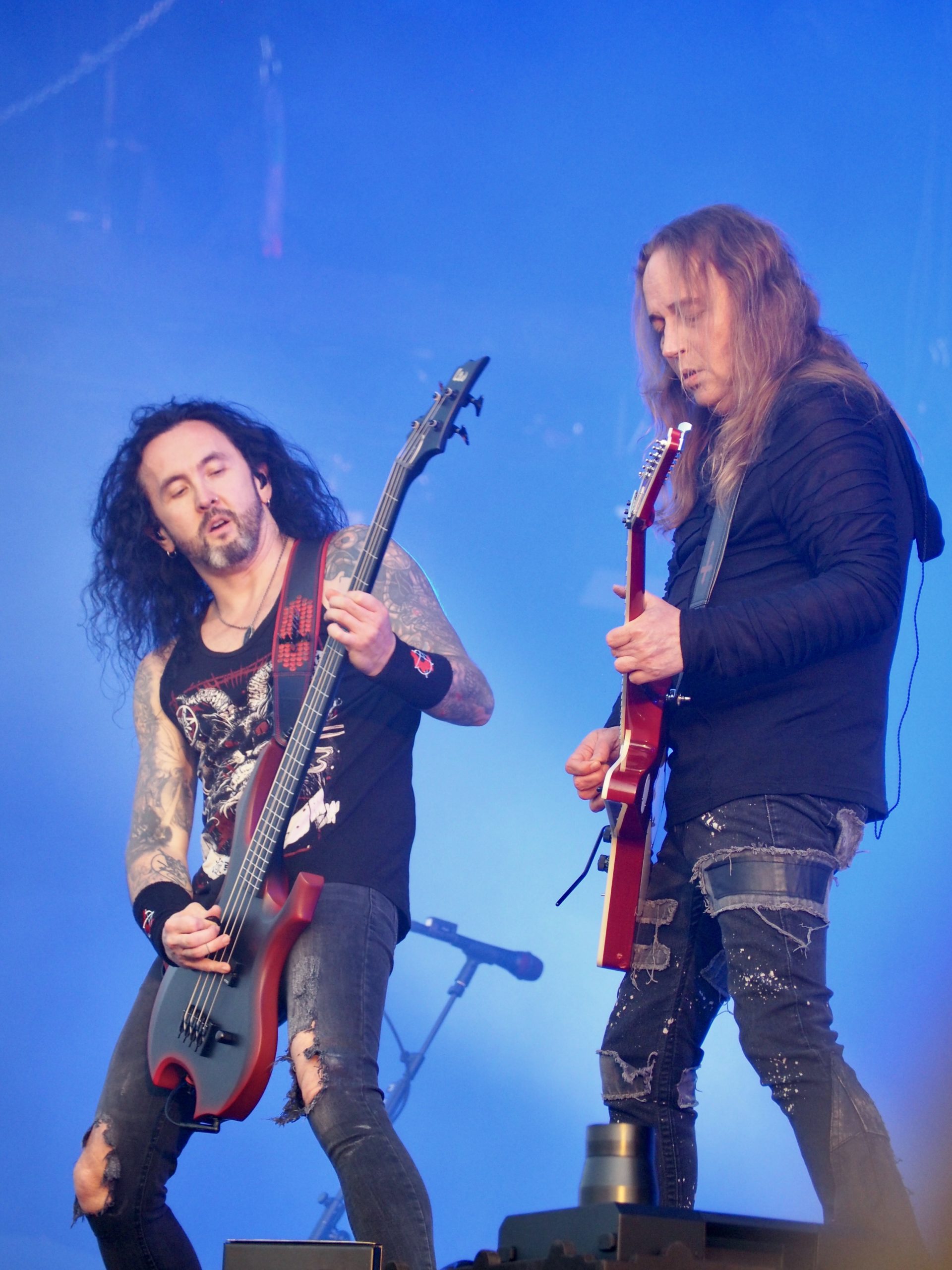 Le point d’orgue visuel survient sur Mars Mantra, lorsque deux silhouettes masquées aux traits de Violent Mind viennent enflammer deux mannequins grandeur nature à l’avant-scène, créant une vision d’apocalypse renforcée par les lumières rouges sang du lightshow. C’est infernal, grandiloquent, spectaculaire — en deux mots, du Kreator pur jus. Peu habitué à la réaction trop polie du public suédois, Mille Pettrozza demande à tout le monde de faire du crowd surfing, ce qui déclenche une vague de folie chez les fans qui, enfin, se lâchent, mais aussi et surtout la panique dans le service de sécurité de bord de scène, peu habitué à cette vague de corps qui lui arrive sur la tête… Le crowd surfing ou même avoir son enfant sur les épaules est rapidement tué dans l’œuf ici. Ceux qui se risquent à cette pratique se voient raccompagnés fermement à la sortie du pit, sans exception. Même le chanteur de Dark Tranquillity n’échappe pas à la règle : malgré sa notoriété, il ne bénéficie d’aucun traitement de faveur et se fait vertement éconduire, tout sourire, sous mes yeux amusés. Seul bémol de ce show pourtant redoutablement efficace : les caissons pyrotechniques installés à l’avant de la scène. Pour ceux – comme moi – qui se trouvent au tout premier rang, ils créent une barrière visuelle qui entrave la vue. Je ne vois donc bien souvent que la moitié supérieure des musiciens, notamment Mille Petrozza, qui reste d’ailleurs assez statique au centre de la scène. Rien de rédhibitoire, bien sûr, la prestation des Teutons restant solide comme un char Panzer ; ceci dit, ce détail gâche tout de même un peu le plaisir quand on vient aussi pour voir autant que pour entendre — et qu’on a des photos à prendre.