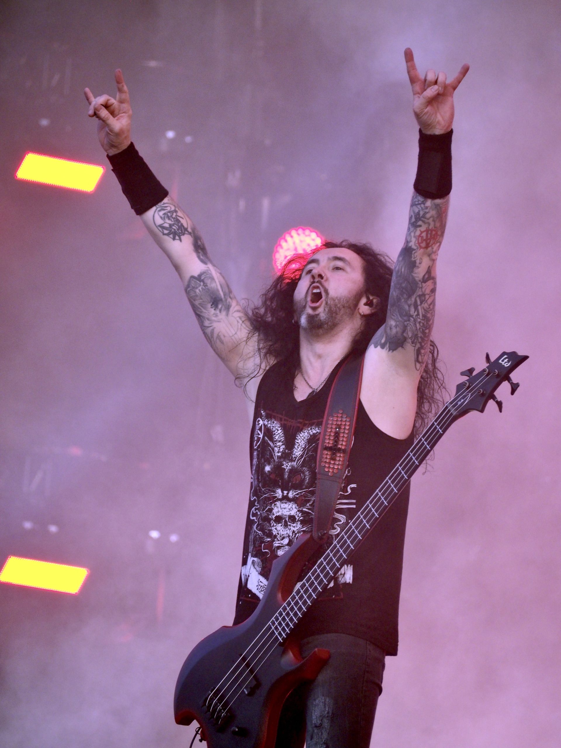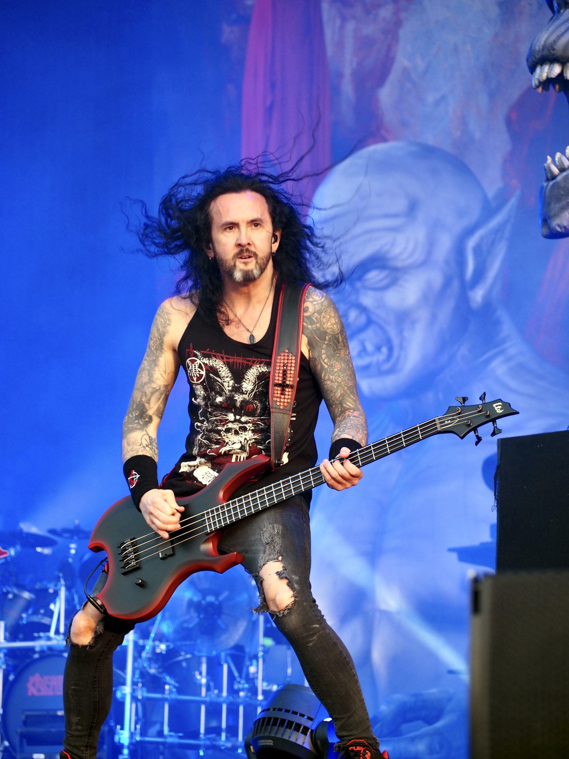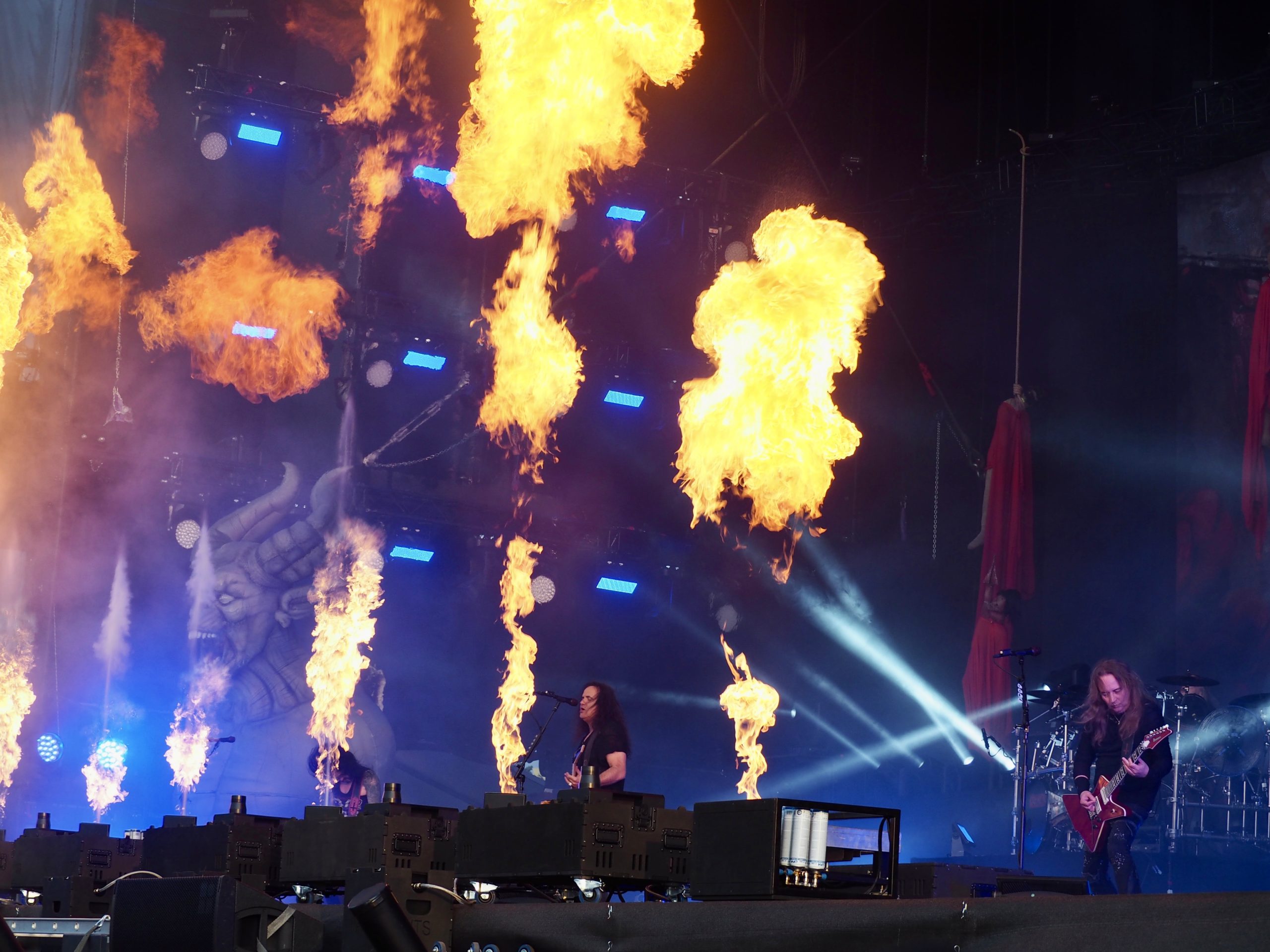 Autre scène, autre ambiance : avec Kreator (DE), pas question de plaisanter. D’entrée de jeu, les Allemands mettent les points sur les i dans une débauche de flammes, de confettis, de décibels, et de symboles infernaux. La scène se présent comme un véritable tableau de chaos : figurines géantes de démons cornus, squelettes pendus, et bien sûr, Violent Mind, la mascotte du groupe, trônant fièrement au milieu de ce théâtre de l’horreur. Pas de place pour les temps morts dans ce show furieux. Mille Petrozza et ses acolytes assènent leur thrash metal avec une précision chirurgicale et une intensité implacable. La setlist couvre toute leur discographie : du tout premier album Endless Pain, avec un Flag of Hate toujours aussi fédérateur, au plus récent Enemy of God, dont le titre éponyme déclenche une véritable tempête dans le public, sans oublier les indispensables Coma of Souls ou Pleasure to Kill, moments de furie pure repris en chœur par les fans.