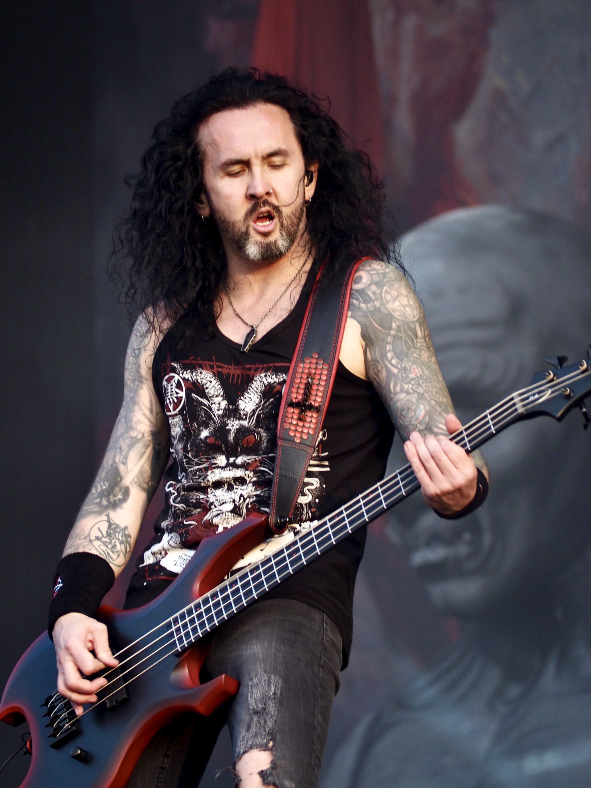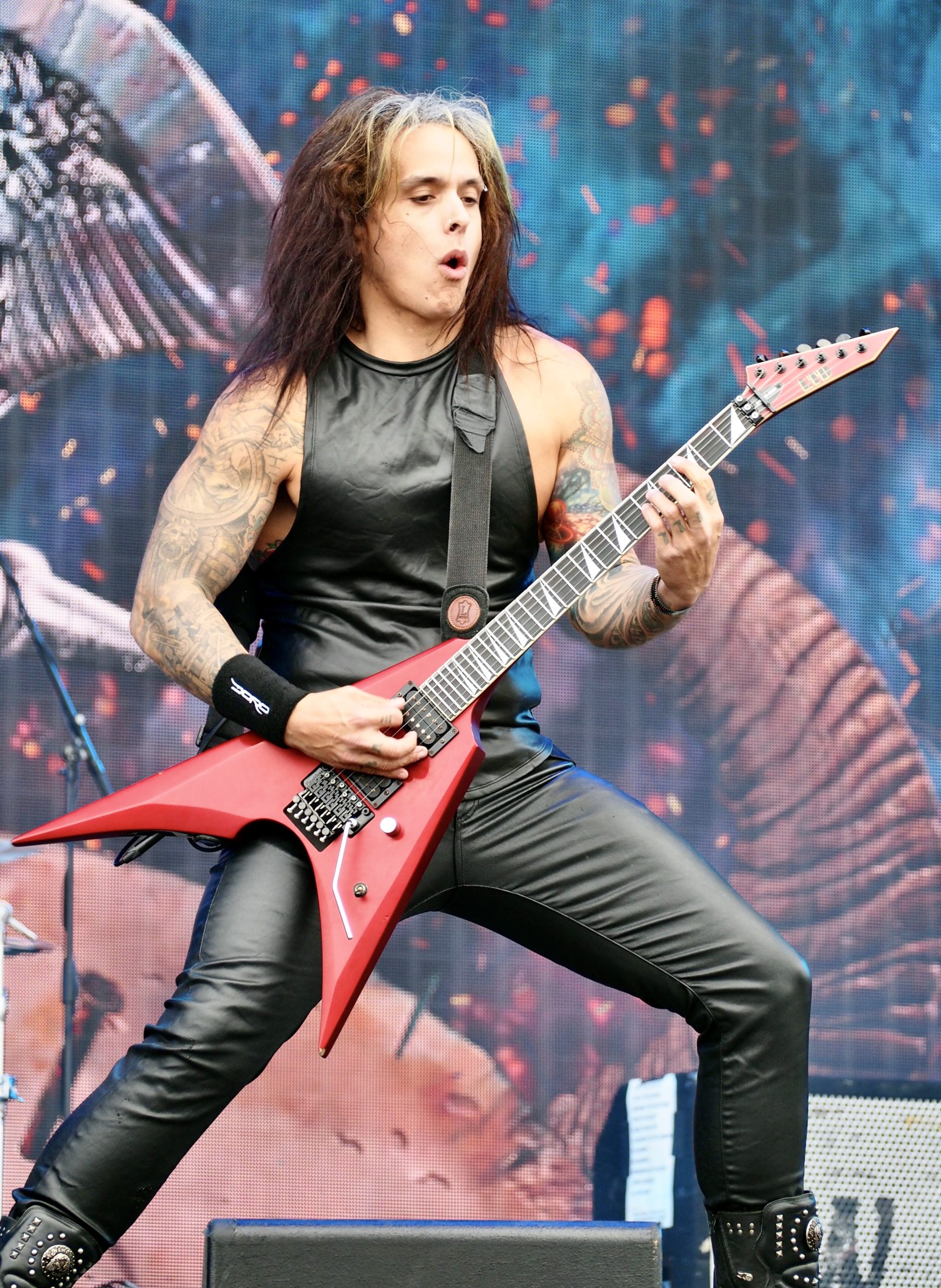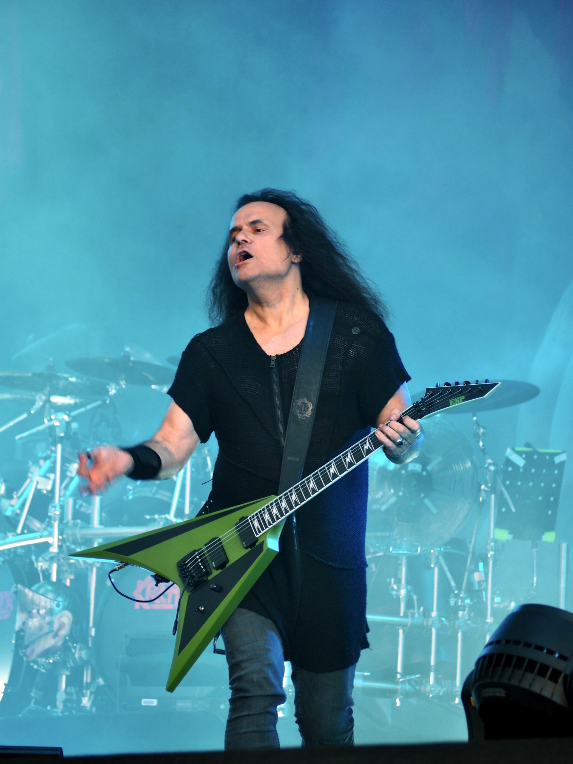 Autre scène, autre ambiance : avec Kreator (DE), pas question de plaisanter. D’entrée de jeu, les Allemands mettent les points sur les i dans une débauche de flammes, de confettis, de décibels, et de symboles infernaux. La scène se présent comme un véritable tableau de chaos : figurines géantes de démons cornus, squelettes pendus, et bien sûr, Violent Mind, la mascotte du groupe, trônant fièrement au milieu de ce théâtre de l’horreur. Pas de place pour les temps morts dans ce show furieux. Mille Petrozza et ses acolytes assènent leur thrash metal avec une précision chirurgicale et une intensité implacable. La setlist couvre toute leur discographie : du tout premier album Endless Pain, avec un Flag of Hate toujours aussi fédérateur, au plus récent Enemy of God, dont le titre éponyme déclenche une véritable tempête dans le public, sans oublier les indispensables Coma of Souls ou Pleasure to Kill, moments de furie pure repris en chœur par les fans.