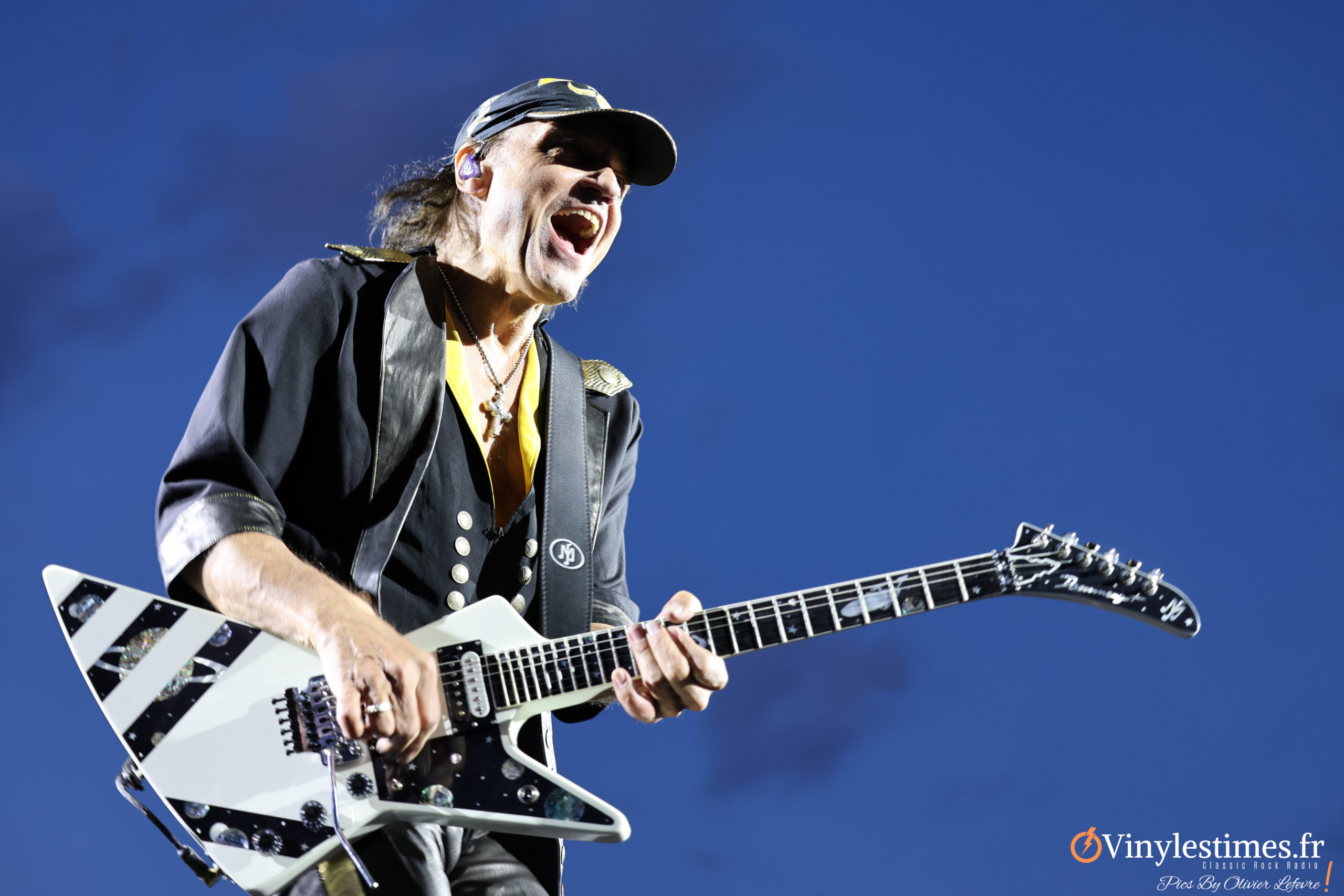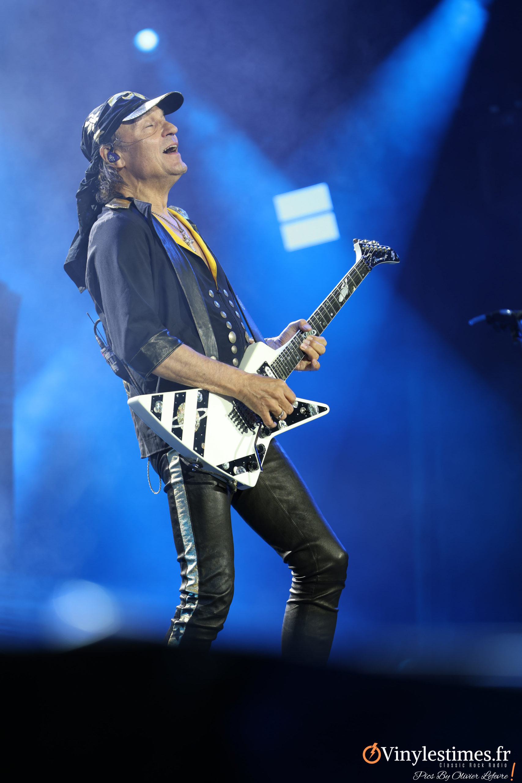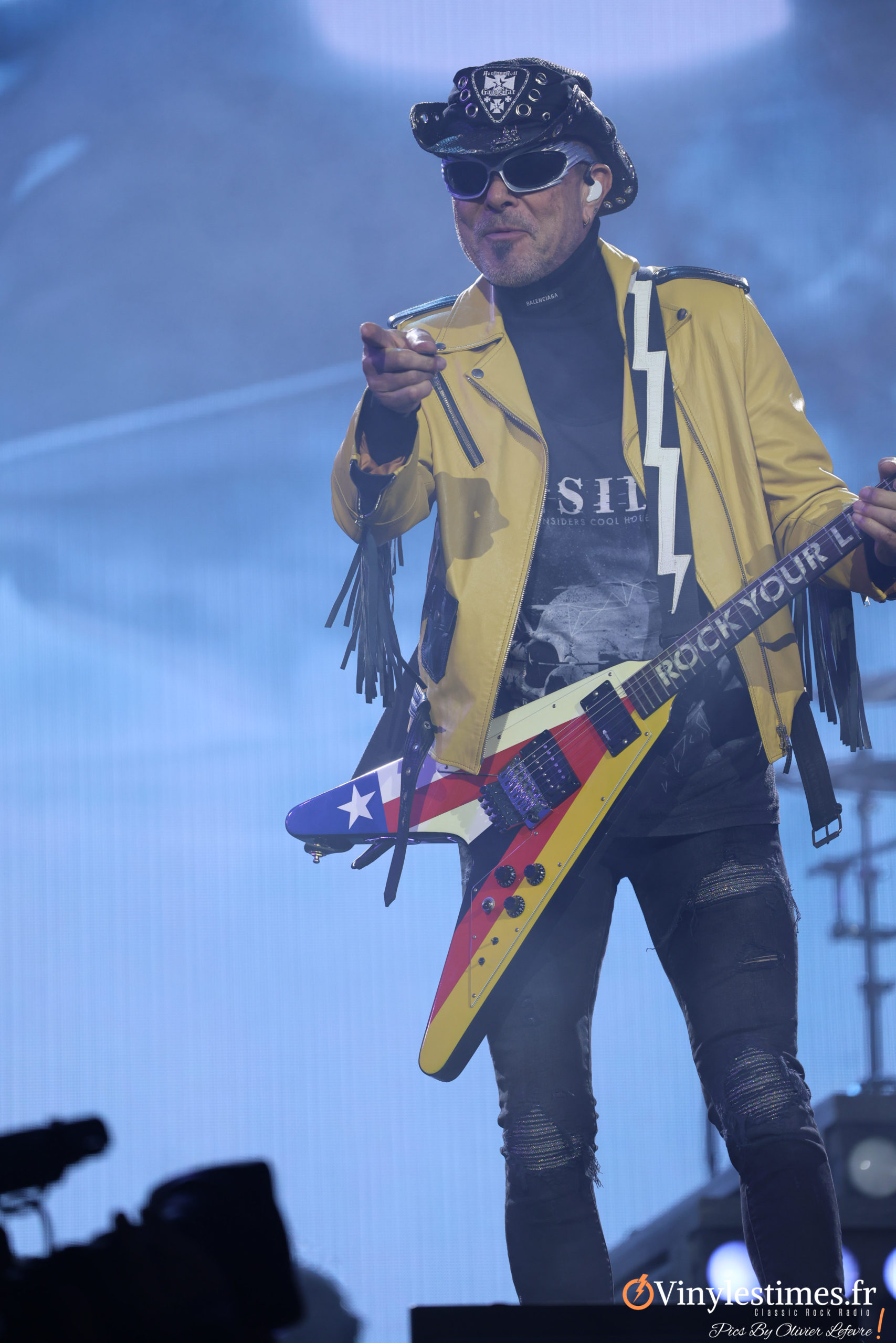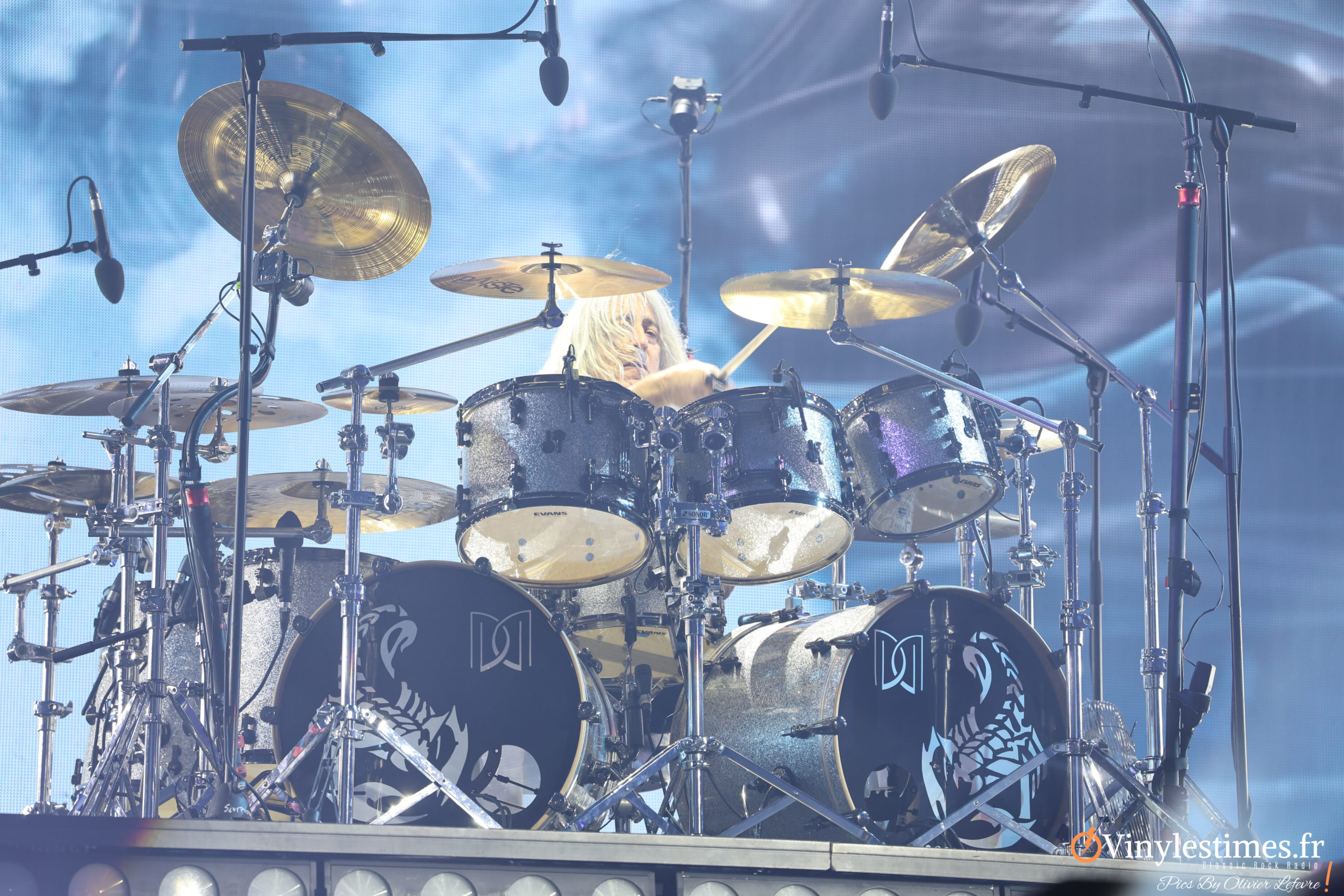 Dernière étape de cette journée : Scorpions (DE), que l’on ne présente plus. Le groupe, qui célèbre cette année ses soixante ans de carrière, entre en scène sous les vivats d’un public conquis d’avance et ouvre le bal avec un puissant Coming Home. Beaucoup des morceaux joués ce soir sont tirés de Love at First Sting, dont le groupe et ses fans ont fêté les quarante ans il y a peu : Bad Boys Running Wild, Big City Nights, ou encore l’inévitable Rock You Like a Hurricane font vibrer la foule. La setlist pioche aussi dans les autres grands classiques de leur discographie des Allemands : Blackout, Make It Real, Send Me an Angel, Top of The Bill ou le plus récent Gas in the Tank. Le show est d’une précision redoutable : tout est calé au millimètre, du lightshow spectaculaire aux vidéos d’archives projetées en fond de scène, qui apportent une touche bienvenue de nostalgie. On sent un groupe de vétérans qui connaît parfaitement son métier et maîtrise chaque aspect de sa prestation. Mais — car il y a un mais — si Rudolf Schenker et Matthias Jabs affichent toujours une forme éclatante et une vraie présence scénique, les marques du temps se font clairement sentir du côté de Klaus Meine. Sa voix, désormais mécanique, semble parfois déconnectée de l’émotion qu’elle veut transmettre, et sa gestuelle figée trahit une certaine raideur. Le charisme est intact, l’émotion reste palpable, mais l’énergie n’est plus tout à fait au rendez-vous… sauf du côté du plus jeune Mikkey Dee, qui insuffle une puissance phénoménale aux morceaux. L’ancien batteur de Motörhead apporte une force de frappe et un dynamisme qui rehaussent clairement l’ensemble, injectant un peu de sang neuf dans cette machine bien huilée. Entre le plaisir de réentendre ces classiques intemporels et une infinie tristesse face à l’évidence que le temps passe, pour mes héros comme pour moi, le show de Scorpions me laisse, comme à beaucoup d’autres avec qui j’ai échangé après le concert, un goût amer. Un mélange de nostalgie pour un temps définitivement révolu, de respect pour une carrière exceptionnellement riche, et de mélancolie. Un concert en forme d’adieu qui ne dit pas son nom.