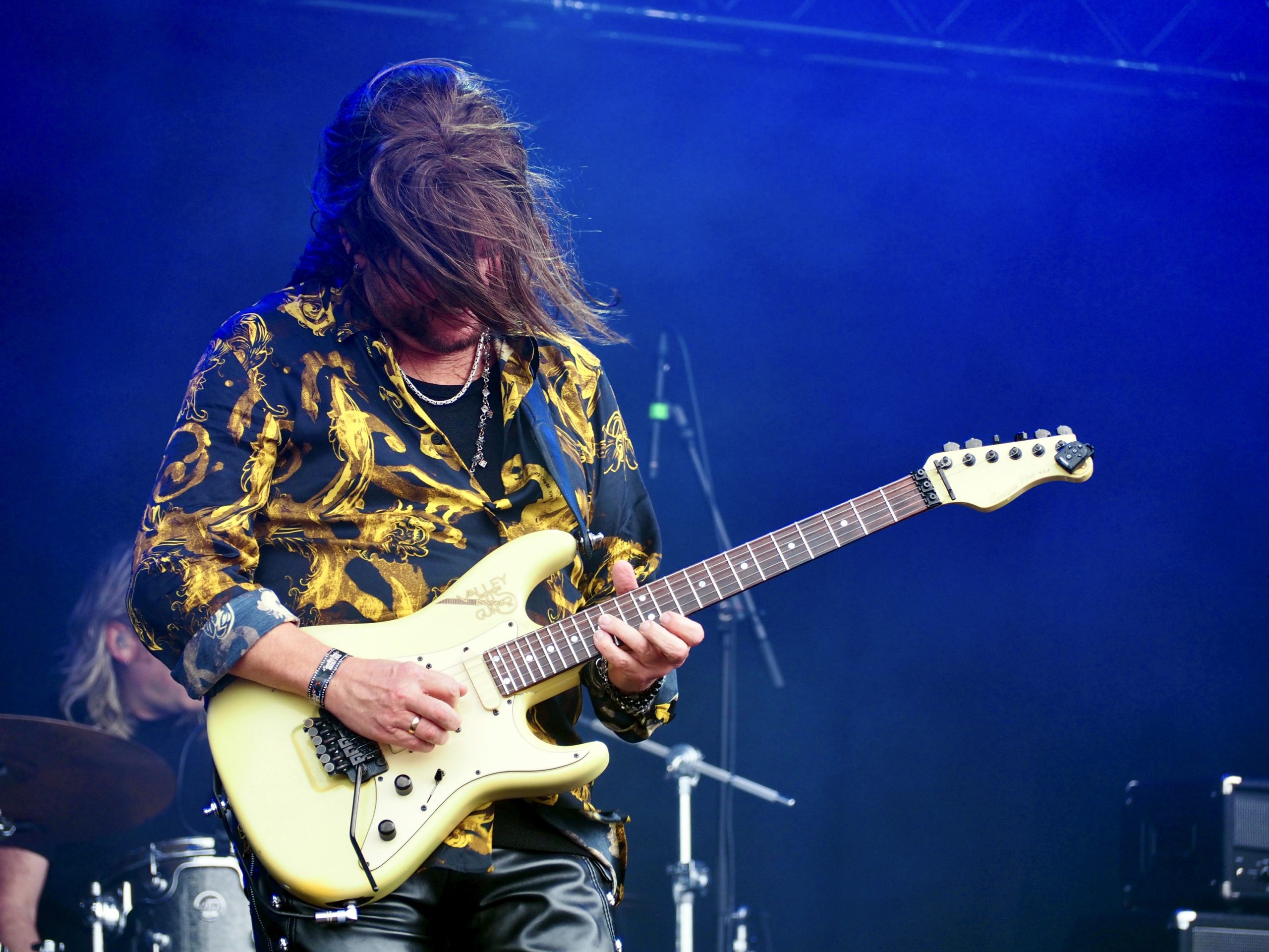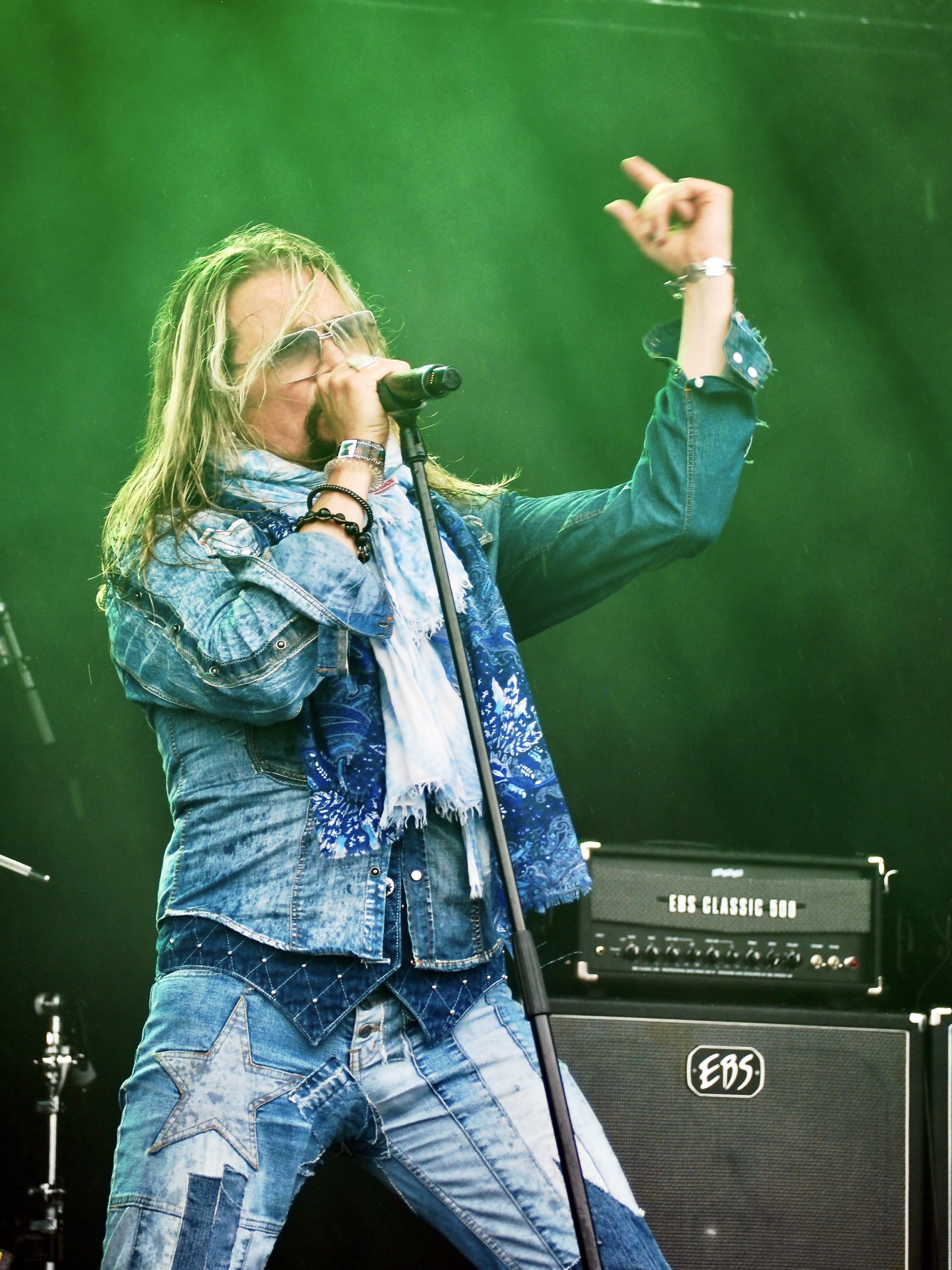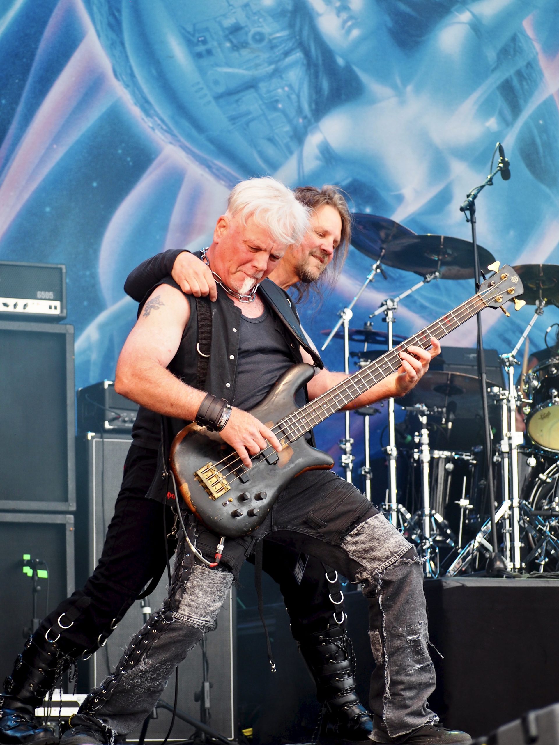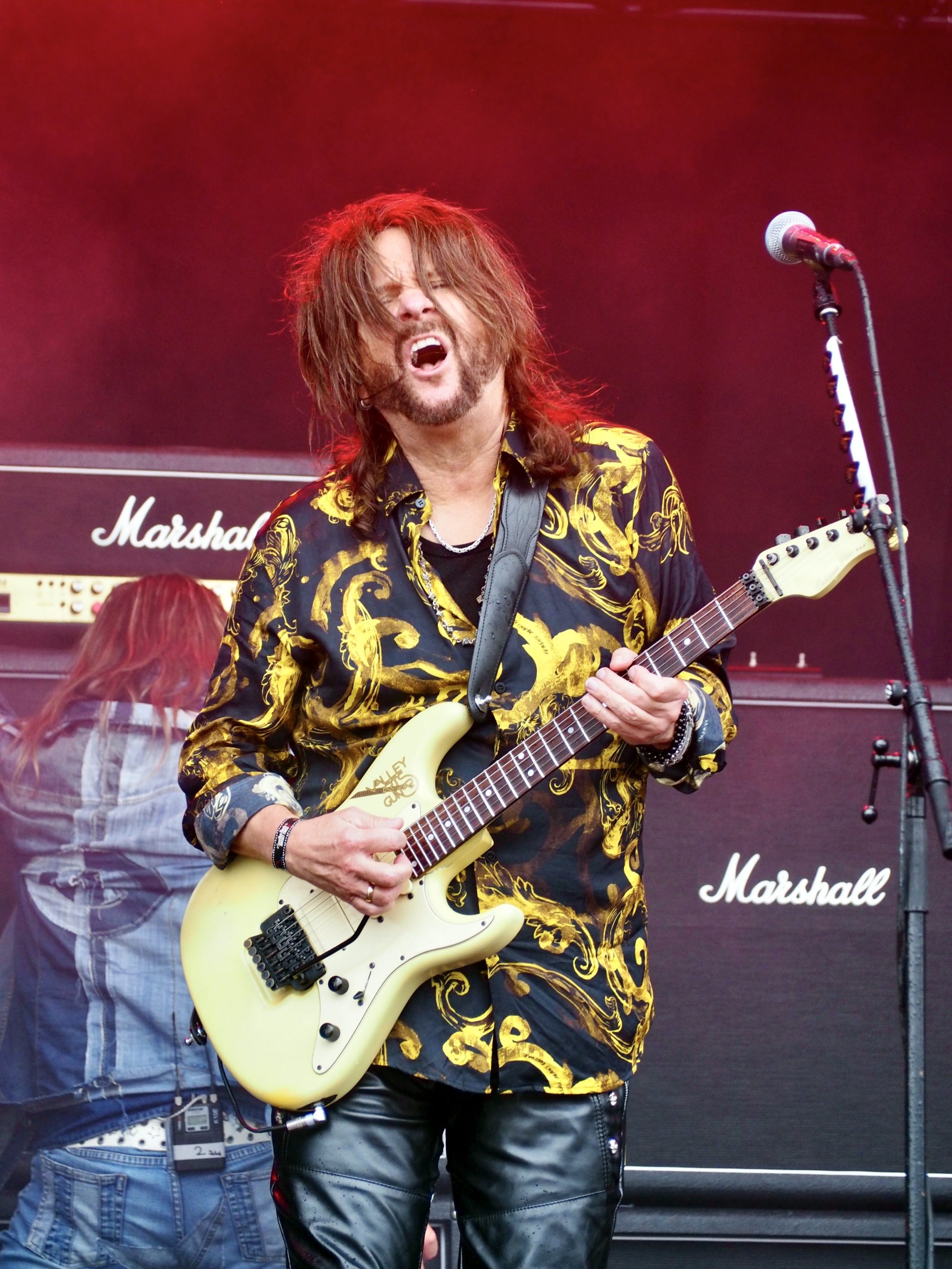 C’est sous une pluie battante que Kee Marcello (SE), ex-guitariste d’Europe, monte sur scène pour un set entièrement dédié à la période 1988-1992 du groupe, celle des albums Out of This World et Prisoners in Paradise. Malgré les éléments déchaînés, les musiciens restent imperturbables et enchaînent les titres devant un public réceptif, même si les morceaux joués ne comptent pas parmi les plus populaires de la discographie d’Europe. Jakob Samuel, ex-chanteur de The Poodles, assure le rôle de frontman avec enthousiasme, sans toutefois parvenir à faire oublier la prestance iconique de Joey Tempest. Kee Marcello, plus effacé, reste cantonné au côté droit de la scène, laissant volontiers la lumière à son chanteur, tout en livrant un jeu de guitare solide et précis. Mais alors que retentissent les premières mesures de Girl From Lebanon, une coupure de courant due à la pluie vient interrompre le concert pendant une bonne dizaine de minutes. Les musiciens, contraints de reprendre le morceau depuis le début une fois le problème réglé, peinent à retrouver l’élan du début. La suite du set voit le groupe interpréter des morceaux plus marquants, comme Just the Beginning, chanté par Michele Luppi depuis ses claviers pendant que Jakob quitte brièvement la scène. Kee profite ensuite de son moment de gloire avec un solo flamboyant, incluant une interprétation musclée de Flight of the Bumblebee. Jakob revient pour Seventh Sign, avant que le groupe ne conclue avec les deux incontournables de l’époque : Prisoners in Paradise et Superstitious. Un show écourté, en demi-teinte : professionnel et bien exécuté, mais un peu trop sage, manquant d’énergie et de morceaux réellement percutants pour totalement emporter mon adhésion.
