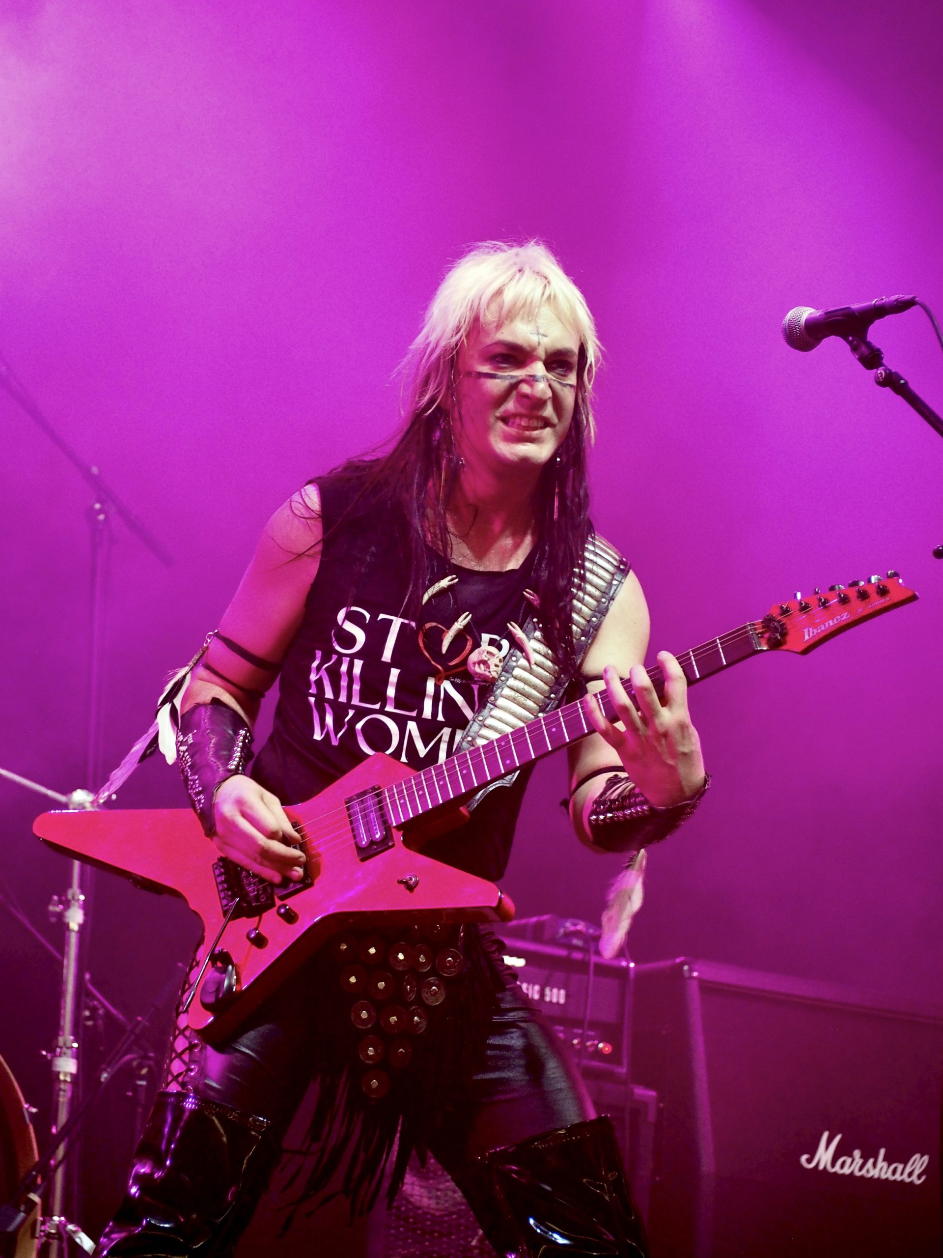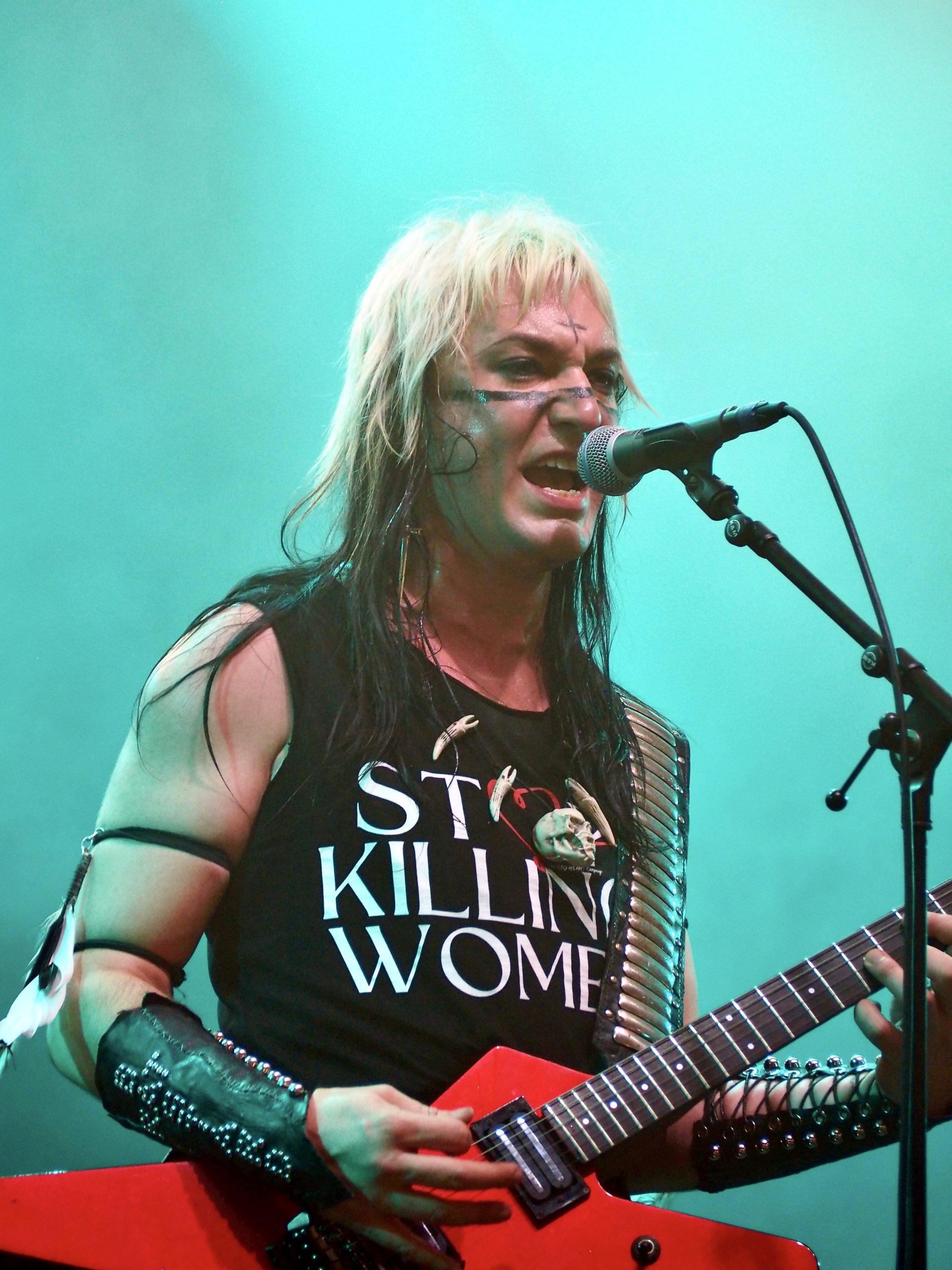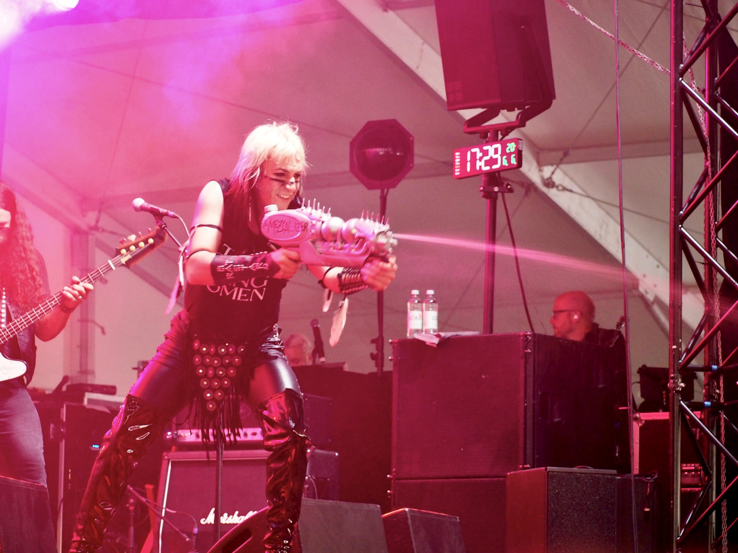 C’est à Sabïre (CA) qu’échoit la lourde tâche de succéder à Crimson Glory. Le groupe m’étant totalement inconnu et ma curiosité piquée, j’ai mené quelques recherches en ligne avant de me décider. Intrigué par l’univers singulier de son chanteur, guitariste et unique compositeur, Scarlett Monastyrski, je choisis d’assister à ce concert, donné sous chapiteau sur la Pistonhead Stage. Si Scarlett revendique haut et fort pratiquer de l’acid metal, la musique de Sabïre s’apparente plutôt à un heavy metal rugueux et vintage, fortement influencé par W.A.S.P., influence que le frontman assume pleinement, jusqu’à reprendre Blind in Texas en fin de set. On retrouve d’ailleurs chez lui bien des gimmicks chers à Blackie Lawless tels l’accoutrement en cuir, la coupe de cheveux, les postures outrancières, le trait de maquillage noir qui lui barre le visage… même sa voix évoque étrangement celle du leader de W.A.S.P. Le chanteur ne se prive pas d’insulter le public à répétition – « get lost », « fuck your mothers », « go fuck yourself » – avec une jubilation quasi théâtrale et un sourire en coin. Loin de s’en offusquer, les spectateurs entrent de bonne grâce dans son jeu. Musicalement, Sabïre tient la route. Le groupe joue avec solidité, délivrant un son volontairement sale, rêche, brut de décoffrage, à l’image des débuts du heavy metal. Ici, pas de fioritures ni de quête de perfection : ce qui compte, c’est l’attitude, l’authenticité, l’énergie. De ce côté-là, Sabïre remplit largement le contrat. Cela étant, au-delà de la posture, Scarlett Monastyrski a aussi composé de véritables hymnes : Ice Cold Lust, Call Me Bastard, Rip Rip Kill… des morceaux accrocheurs et aux refrains fédérateurs, taillés pour le live. Lors de Slave to the Whip, le frontman dégaine son gimmick favori : le mezcal-izer, un énorme pistolet à eau rempli de mezcal (une eau-de-vie à base d’agave), avec lequel il arrose joyeusement les spectateurs — qui ne se font pas prier pour ouvrir grand la bouche à l’idée d’un shot gratuit. Les Canadiens offrent un show sans concession, bruyant, irrévérencieux et furieusement divertissant. Une sorte de saut dans le temps, à l’époque où le heavy metal effrayait les ligues de vertu du PMRC et trônait en haut des charts. Au final, un concert jouissif, pour un groupe à suivre de près.