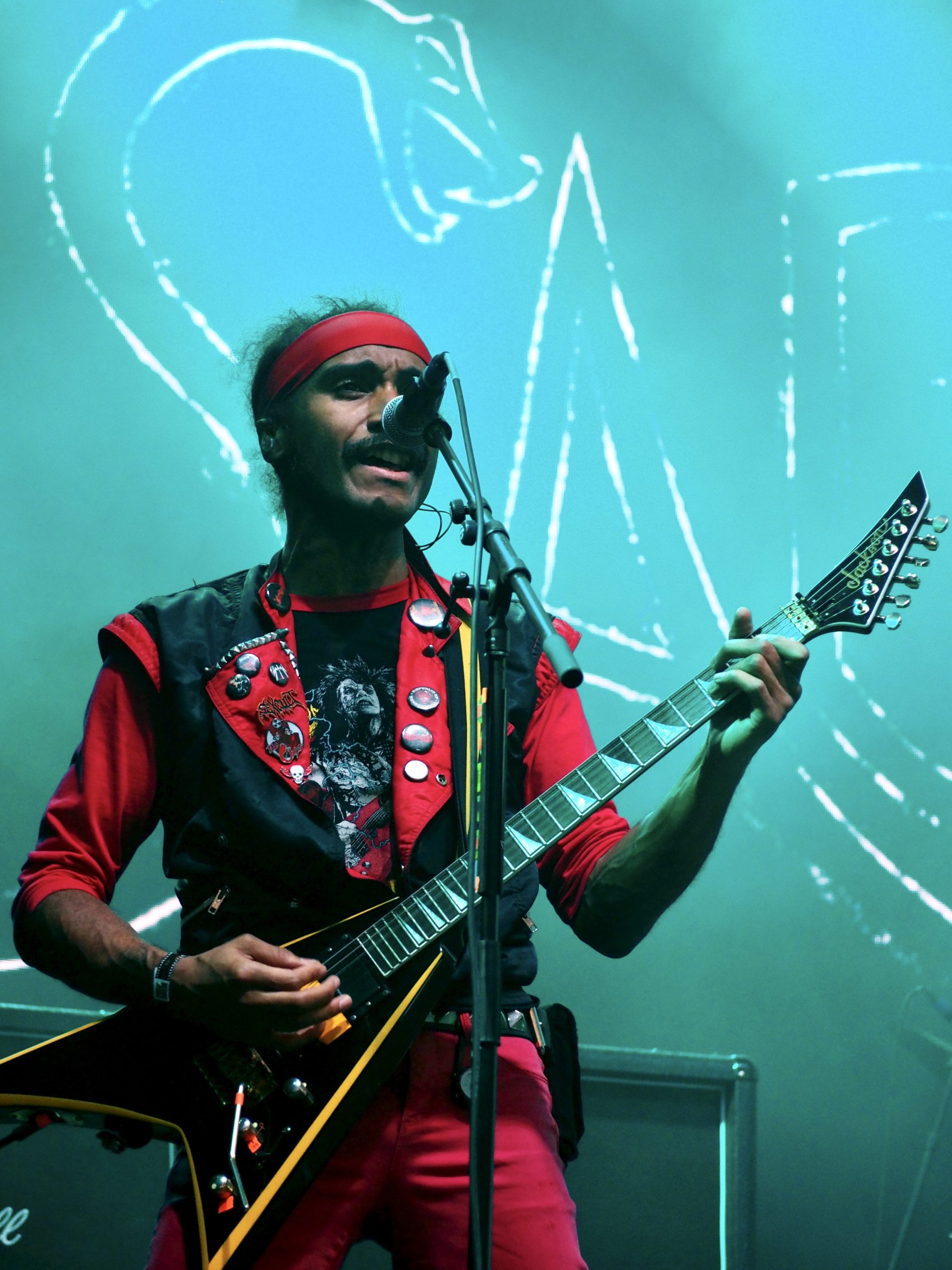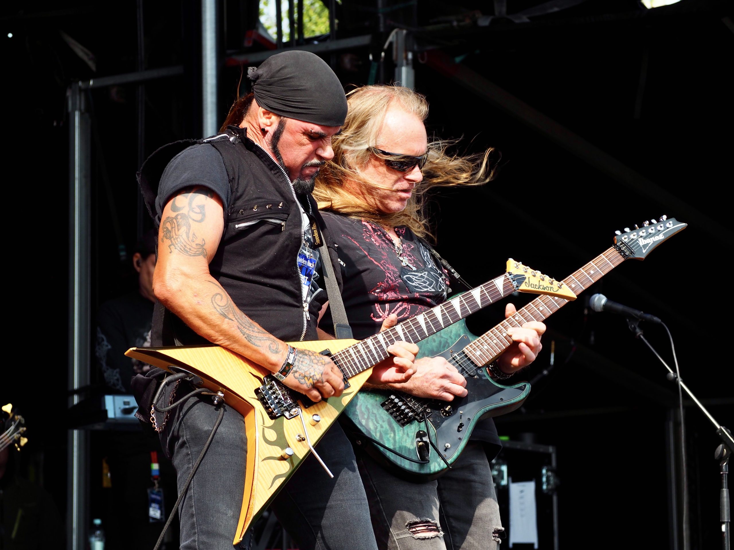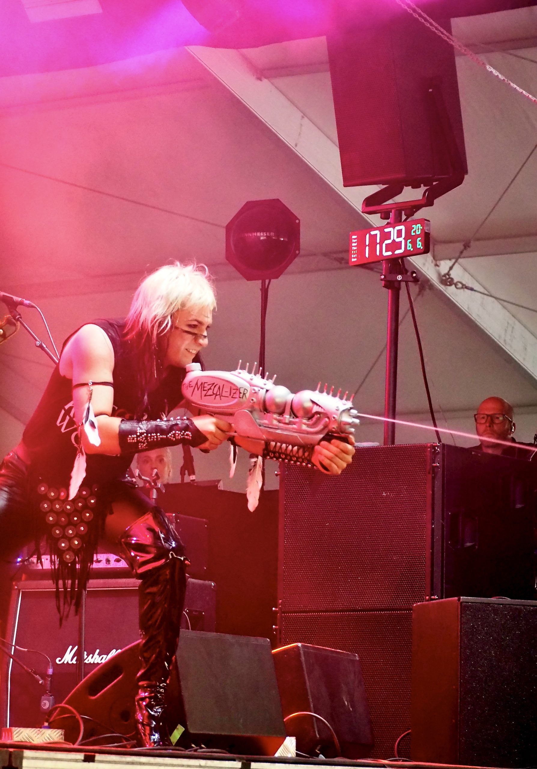 C’est à Sabïre (CA) qu’échoit la lourde tâche de succéder à Crimson Glory. Le groupe m’étant totalement inconnu et ma curiosité piquée, j’ai mené quelques recherches en ligne avant de me décider. Intrigué par l’univers singulier de son chanteur, guitariste et unique compositeur, Scarlett Monastyrski, je choisis d’assister à ce concert, donné sous chapiteau sur la Pistonhead Stage. Si Scarlett revendique haut et fort pratiquer de l’acid metal, la musique de Sabïre s’apparente plutôt à un heavy metal rugueux et vintage, fortement influencé par W.A.S.P., influence que le frontman assume pleinement, jusqu’à reprendre Blind in Texas en fin de set. On retrouve d’ailleurs chez lui bien des gimmicks chers à Blackie Lawless tels l’accoutrement en cuir, la coupe de cheveux, les postures outrancières, le trait de maquillage noir qui lui barre le visage… même sa voix évoque étrangement celle du leader de W.A.S.P. Le chanteur ne se prive pas d’insulter le public à répétition – « get lost », « fuck your mothers », « go fuck yourself » – avec une jubilation quasi théâtrale et un sourire en coin. Loin de s’en offusquer, les spectateurs entrent de bonne grâce dans son jeu. Musicalement, Sabïre tient la route. Le groupe joue avec solidité, délivrant un son volontairement sale, rêche, brut de décoffrage, à l’image des débuts du heavy metal. Ici, pas de fioritures ni de quête de perfection : ce qui compte, c’est l’attitude, l’authenticité, l’énergie. De ce côté-là, Sabïre remplit largement le contrat. Cela étant, au-delà de la posture, Scarlett Monastyrski a aussi composé de véritables hymnes : Ice Cold Lust, Call Me Bastard, Rip Rip Kill… des morceaux accrocheurs et aux refrains fédérateurs, taillés pour le live. Lors de Slave to the Whip, le frontman dégaine son gimmick favori : le mezcal-izer, un énorme pistolet à eau rempli de mezcal (une eau-de-vie à base d’agave), avec lequel il arrose joyeusement les spectateurs — qui ne se font pas prier pour ouvrir grand la bouche à l’idée d’un shot gratuit. Les Canadiens offrent un show sans concession, bruyant, irrévérencieux et furieusement divertissant. Une sorte de saut dans le temps, à l’époque où le heavy metal effrayait les ligues de vertu du PMRC et trônait en haut des charts. Au final, un concert jouissif, pour un groupe à suivre de près.