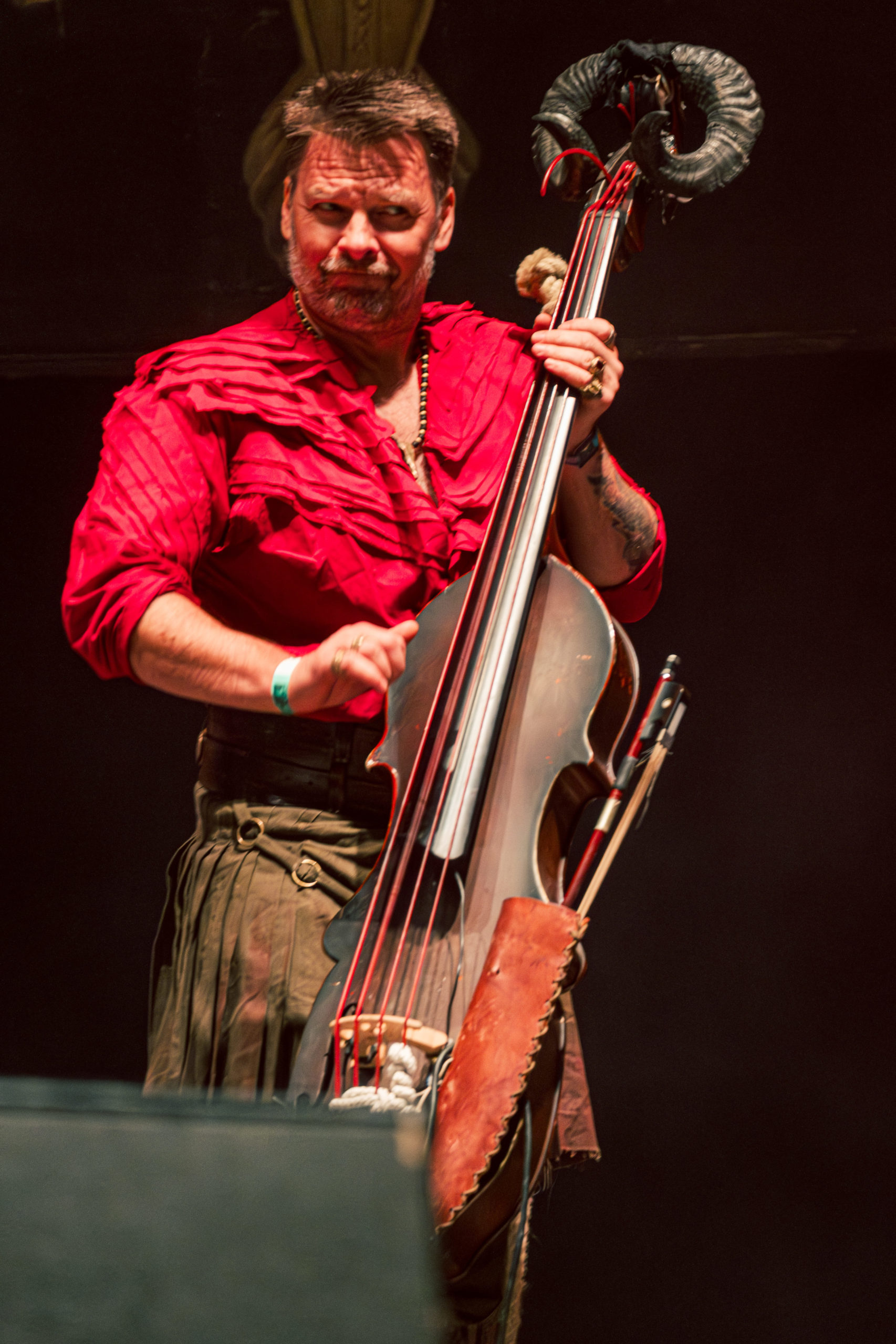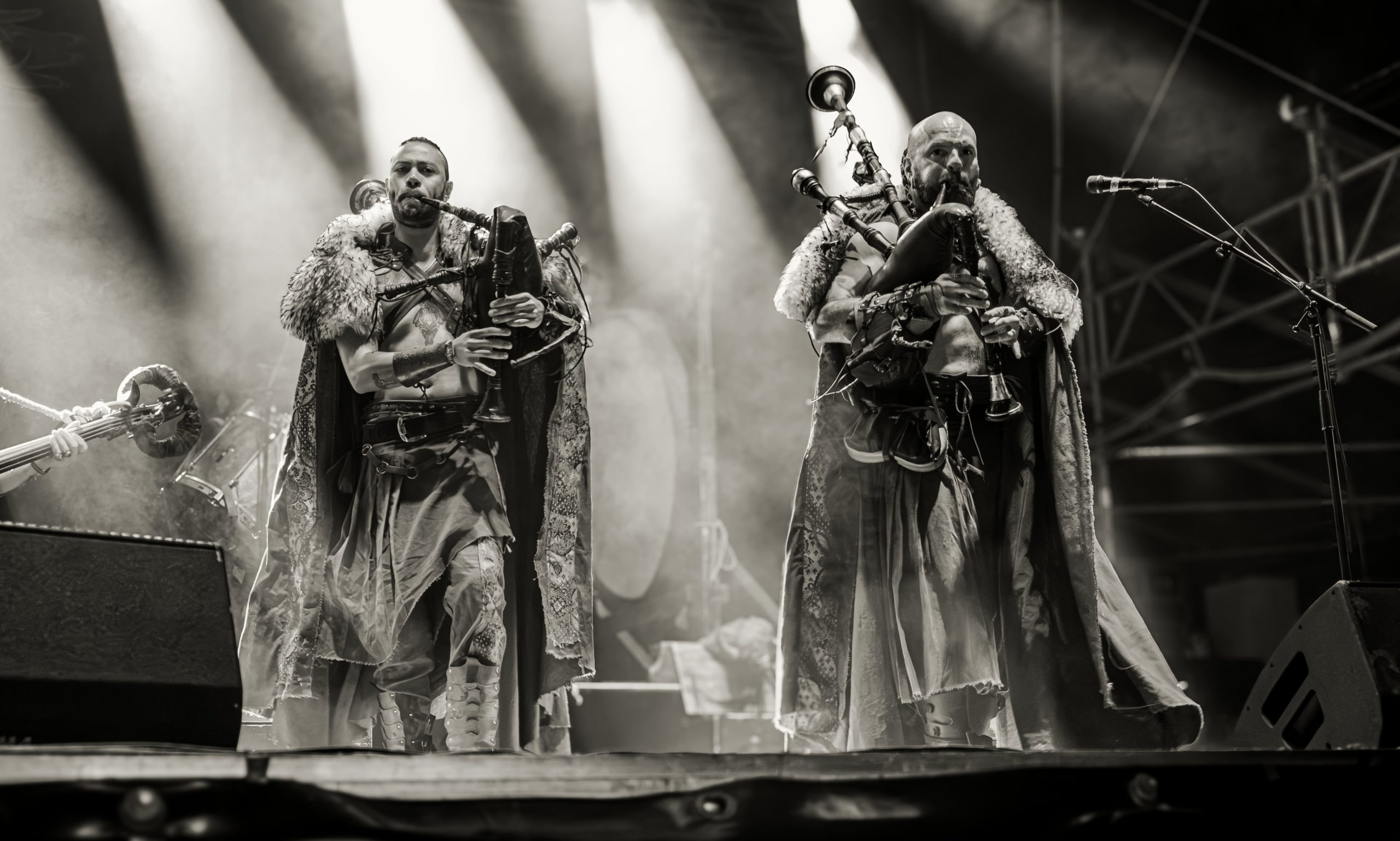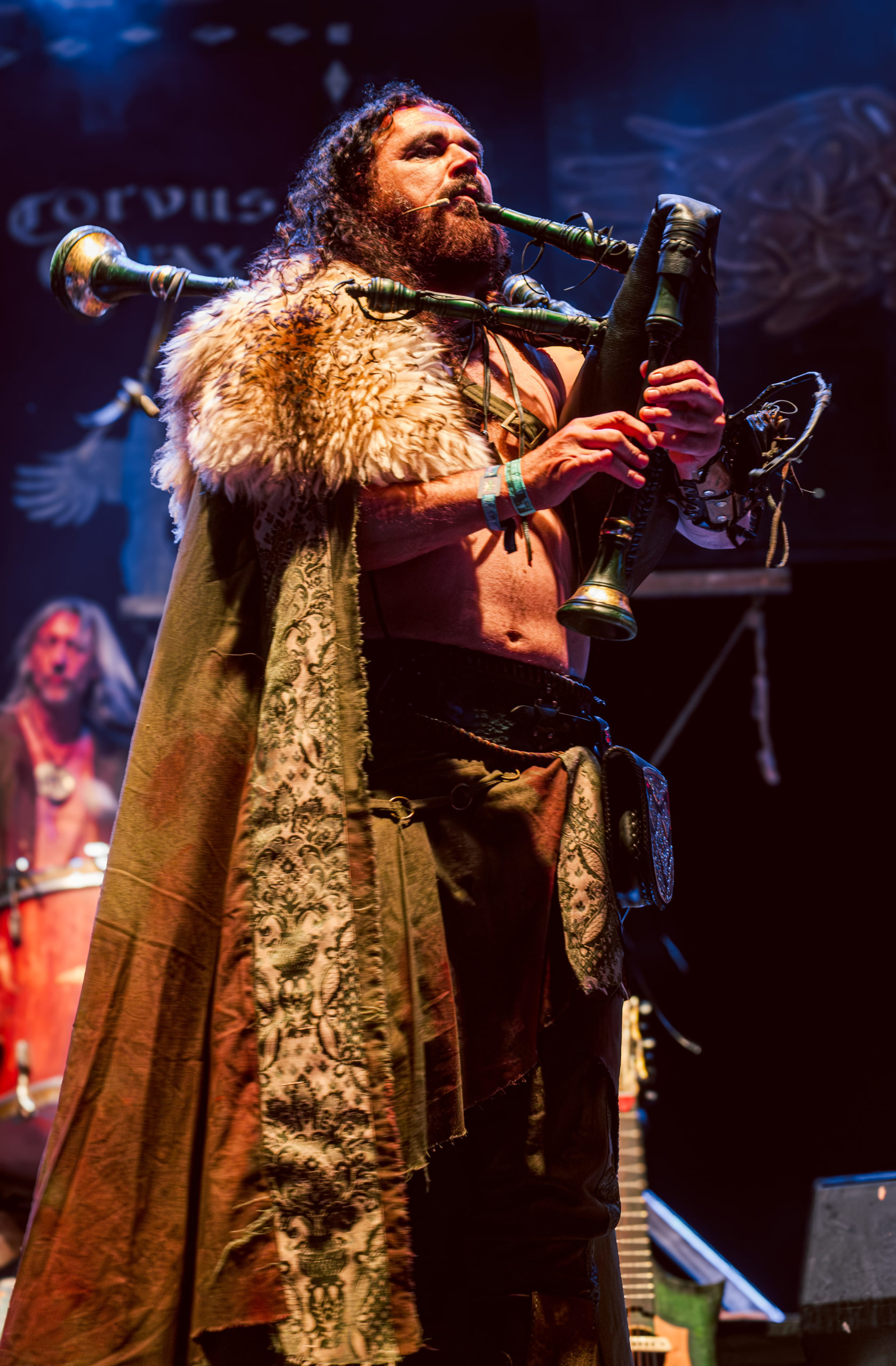 Corvus Corax compte parmi les groupes régulièrement présents à l’affiche du Wacken et, à ce titre, des incontournables ; assister au show du groupe s’imposait alors. Au niveau du créneau horaire, se retrouver programmé en même temps que le mythique Scorpions ne joue pas en la faveur de la formation berlinoise ; par chance pour elle, le public du festival est assez disparate pour comporter bien assez de fans de folk qui répondent présents pour un petit moment de Tanzmuzik. Pour cela, le groupe dégaine un attirail de taille : des cornemuses en nombre aux percussions traditionnelles, en passant par tout un tas d’autres, à vent ou à cordes, dont le nom échappe aux non-initiés : bombarde et cistre entre autres, jusqu’à un immense organistrum… autant dire que l’espace scénique paraît bien étroit pour tout ce beau monde ! Beau monde auquel viennent se joindre des figurants déguisés, les uns en chevaliers, un autre en créature cornue, ceci à un moment où les musiciens revêtent des perruques poudrées, pour une raison que je ne parviens pas à saisir… Heureusement, les membres de Corvus Corax et leurs compagnons de scène ont le sens du partage, sur scène comme au-delà : il n’y a qu’à voir les joueurs de cornemuse à deux devant un même micro ou certains spectateurs ramer ou reprendre les refrains les plus entêtants en chœur avec le groupe pour s’en rendre compte ! Tout le monde profite du moment, ce qui fait plaisir à voir ; bien que, pour ma part, j’ai bien du mal à accrocher complètement. La faute, de mon point de vue, à quelques éléments hors sujet, telles les perruques poudrées ou la présence d’une chanteuse lyrique sur un titre, dont la voix semble trop noble et élégante par rapport à un folk plus simple et populaire. Il n’empêche que Corvus Corax marque par son esprit bon enfant ; de quoi se redonner un petit coup de boost avant de foncer retrouver Scorpions pour les derniers morceaux et finir la soirée. [Ségolène]