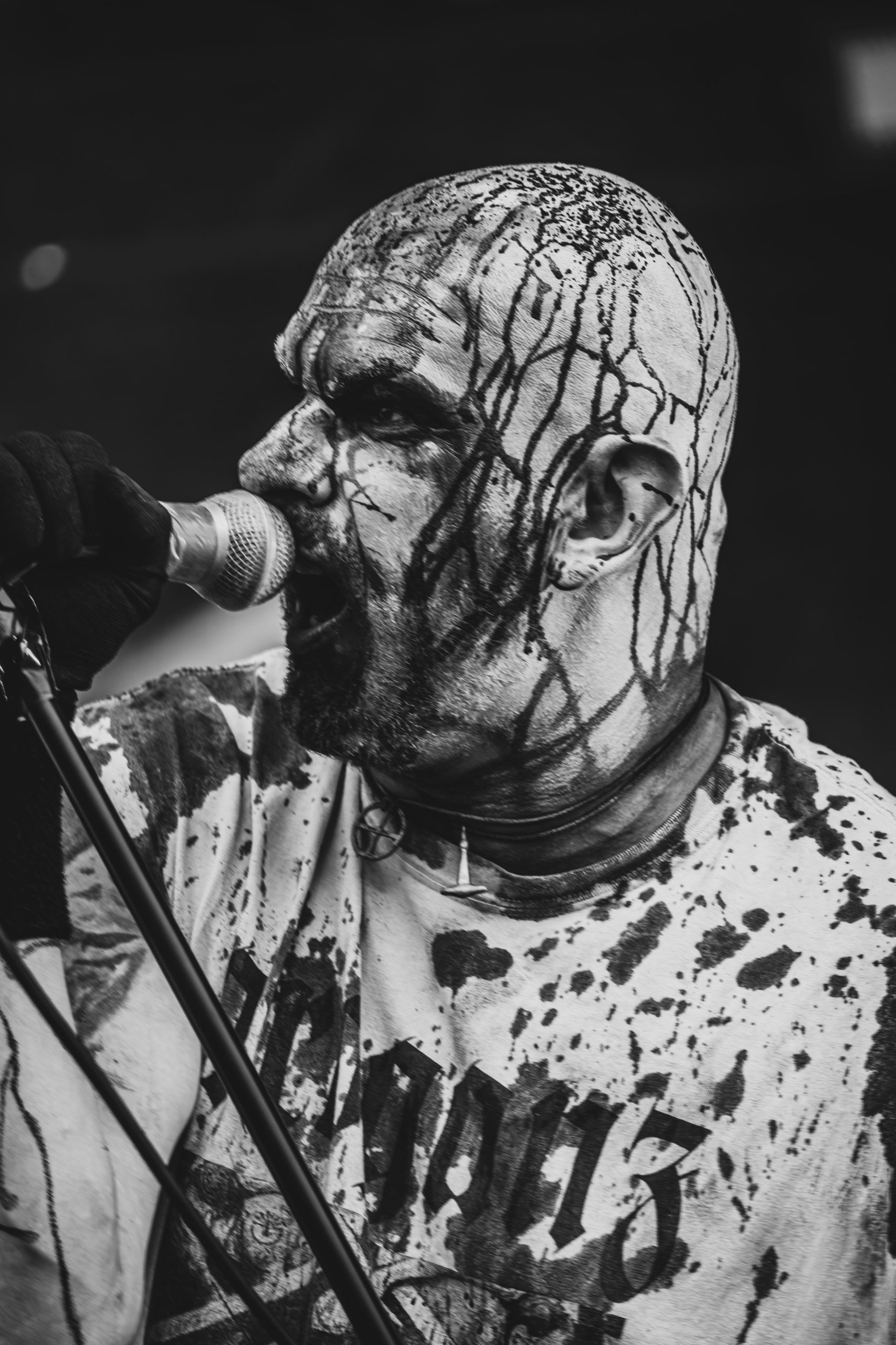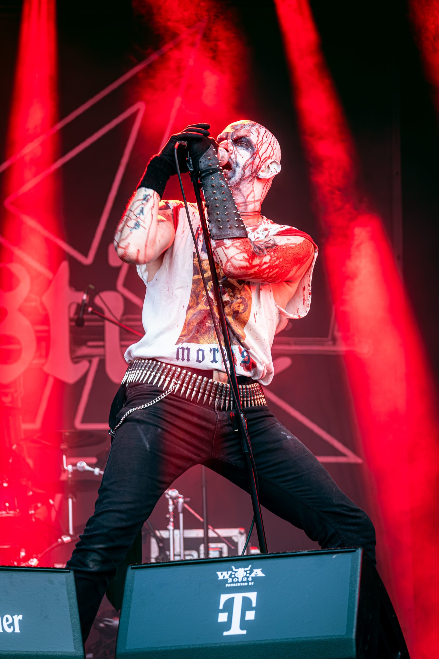 Après le death metal, vient le temps de laisser place au black avec Endstille. Bien qu’originaire de Kiel et d’Aix-la-Chapelle en Allemagne, tout ou presque chez le quatuor évoque la seconde vague du black metal norvégien des années 90, qu’il s’agisse des morceaux à l’écriture dépouillée façon punk, aux riffs incisifs et au rythme rapide, le son loin d’être policé allant avec et, bien sûr, le corpse paint et les éclaboussures de sang qu’arborent respectivement le bassiste Cruor sur le visage et le frontman Zingultus sur le crâne et le T-shirt. J’accorde d’ailleurs un excellent point à la voix de ce dernier, bien éraillée et black à souhait et éructant des textes dont je devine bien l’égale noirceur, ainsi qu’à son jeu de scène très investi. Tout ceci réuni me donne l’impression, une heure durant, d’être de retour au Forest Fest — à l’affiche duquel j’espère du coup bien voir Endstille un jour. Ceci dit, si les morceaux sont très efficaces, d’un point de vue visuel, je ne peux pas en dire autant des lumières bleues omniprésentes sur certains d’entre eux, qui sont loin d’être du plus bel effet. Ça, ainsi que la déroutante disparité dans les looks de scène des quatre hommes, crée une drôle d’impression d’inconsistance dans les aspects visuels du groupe. Cela étant, et fort heureusement pour lui, il n’y a bien que les photographes tels que moi-même pour accorder de l’importance à un tel détail ; en ce qui concerne le public dans son ensemble, celui-ci fait que plus que bon accueil à Endstille et à son black old-school aux ambiances morbides. Tout cela ressort particulièrement bien sur le dernier morceau, dont l’introduction consiste en un vieil enregistrement annonçant la mort du Führer, de même que sur l’outro du set, qui prend la forme d’une chanson allemande rétro. Un peu de noirceur dans un monde coloré ne fait pas de mal, ce qu’Endstille apporte en ce début de soirée. [Ségolène]