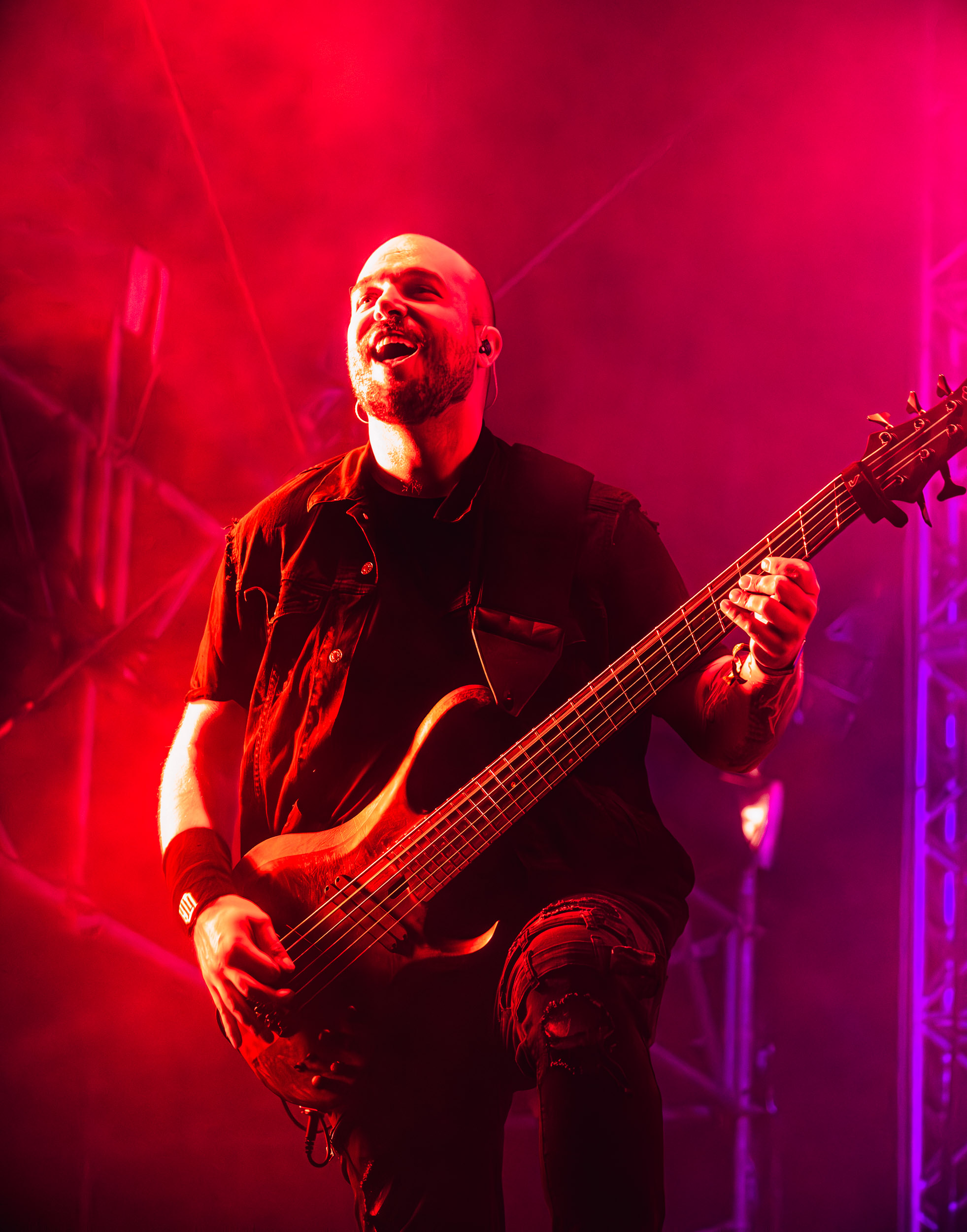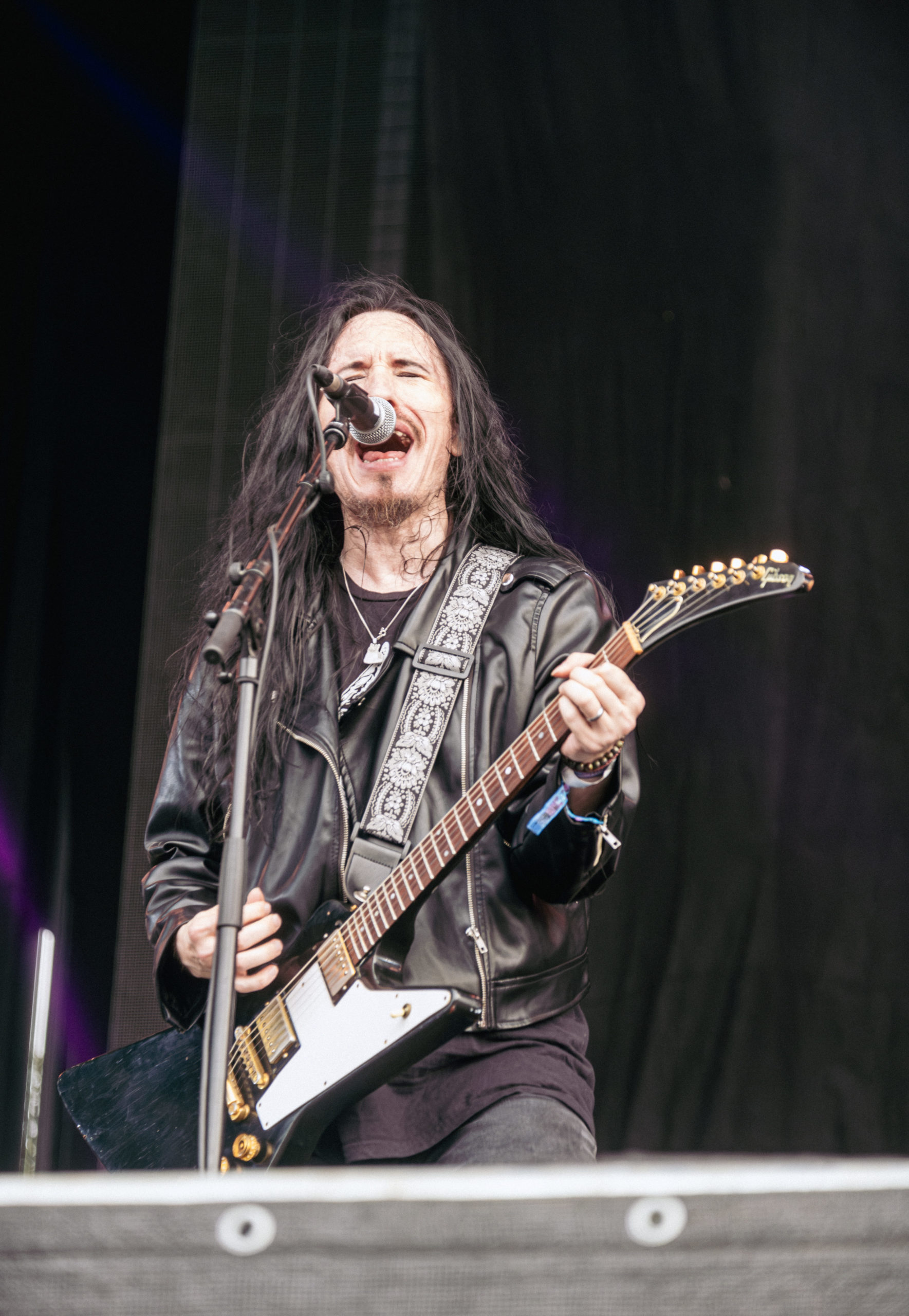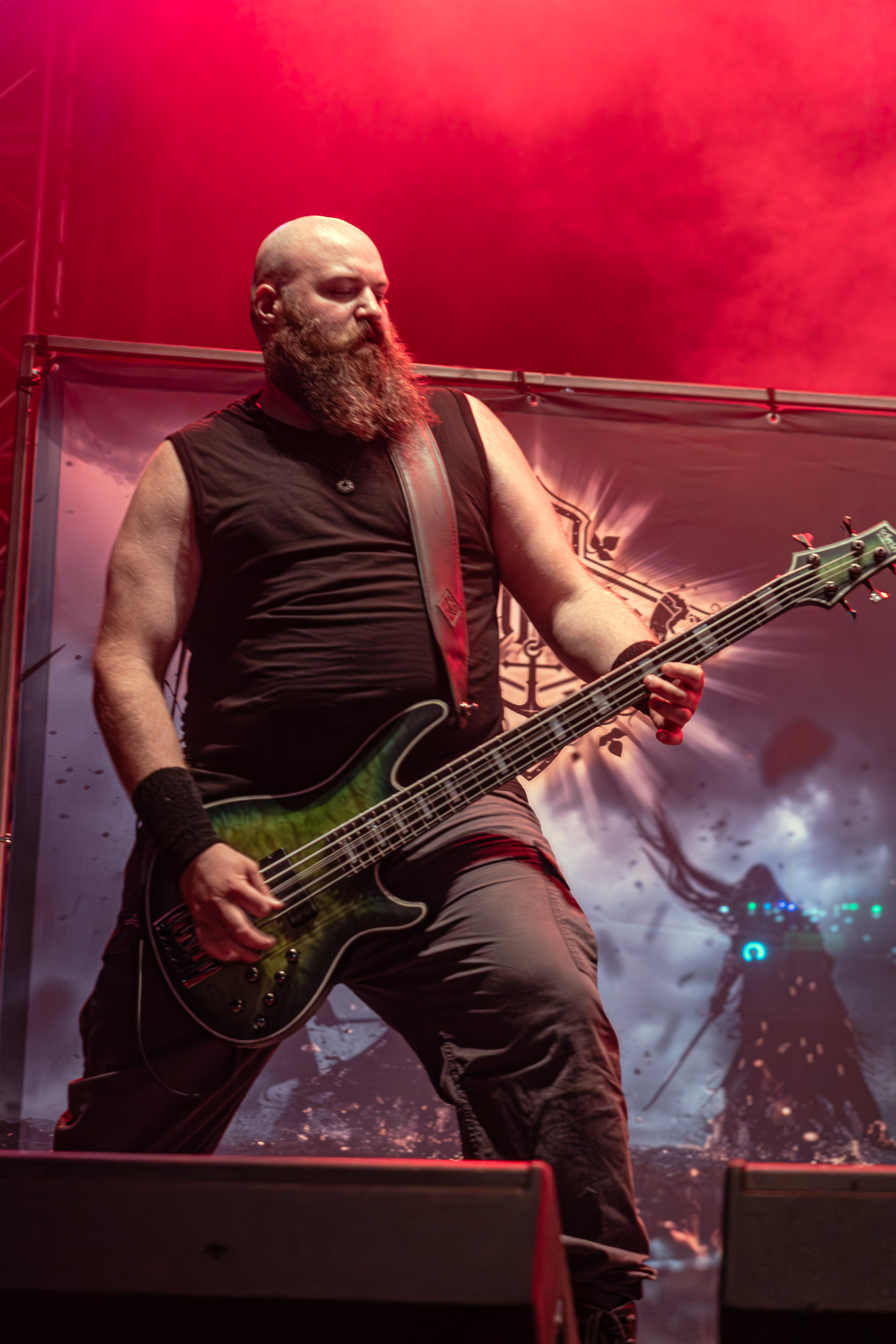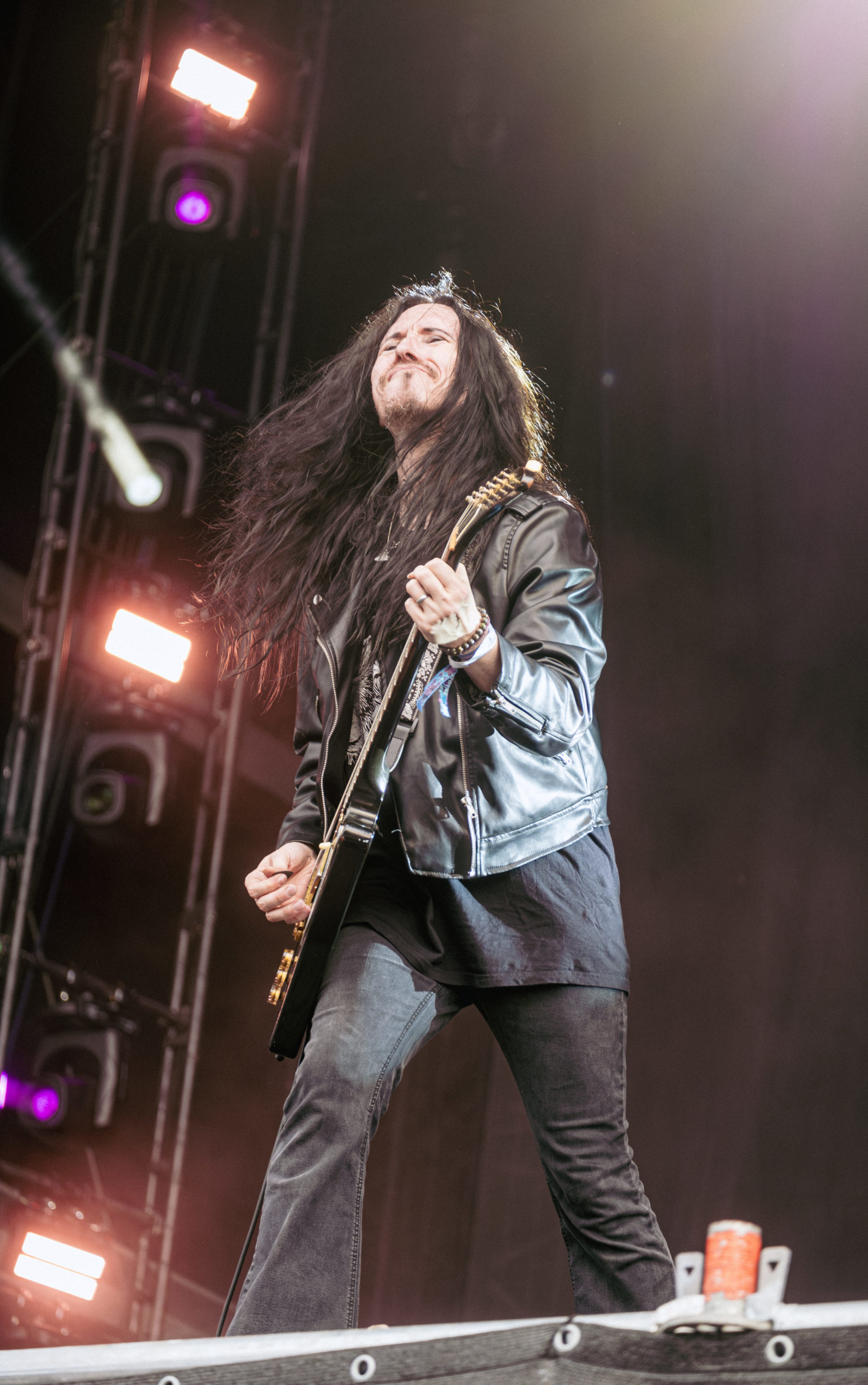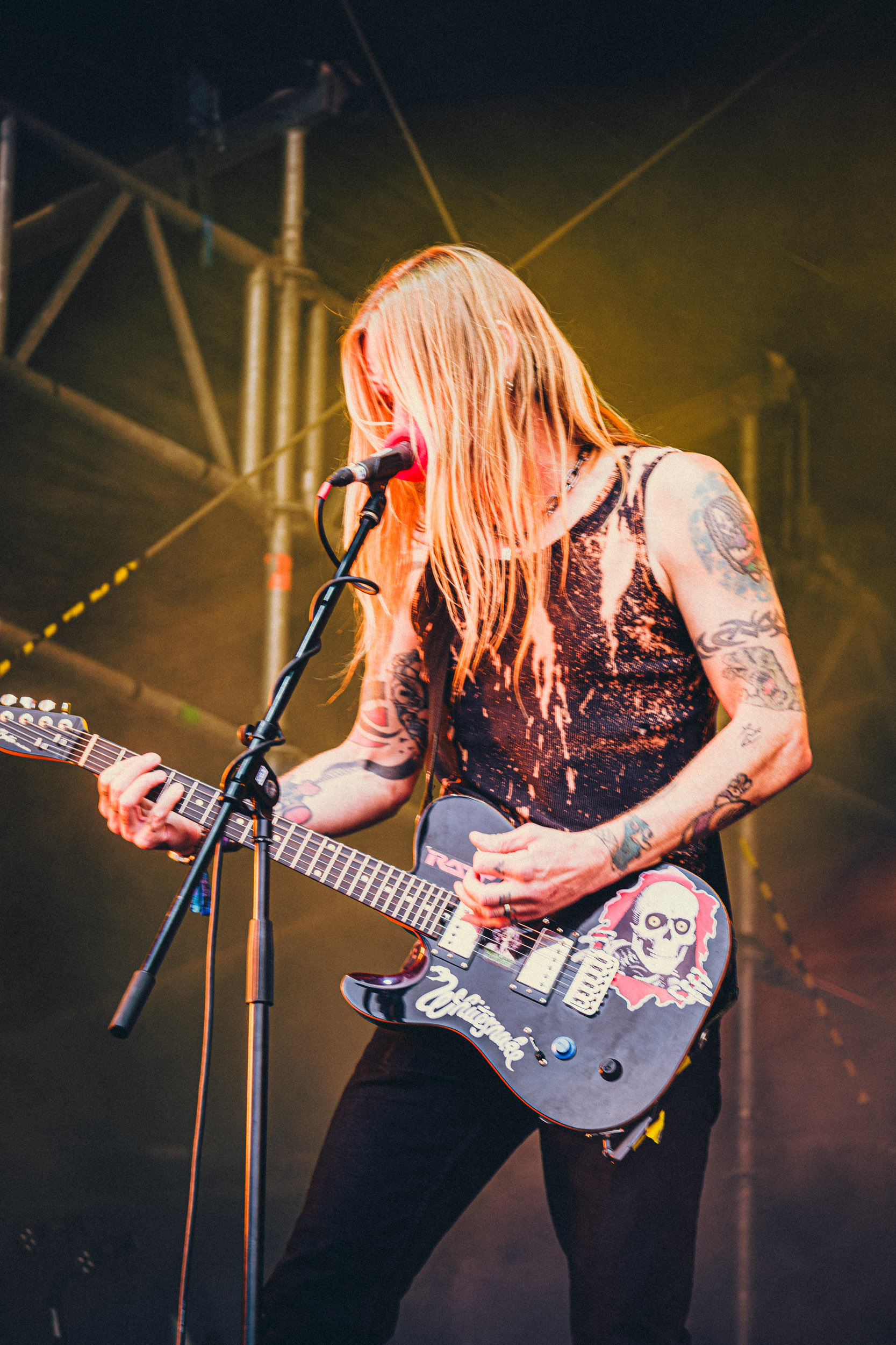 Après avoir assisté à la fin du show de Blind Guardian — qui me donne le plaisir d’entendre en live Sacred Worlds, un de mes morceaux préférés —, et alors que l’arrivée de Korn sur la Harder Stage rassemble une foule monstrueuse sur l’Infield, je retourne vers la Headbangers Stage pour Unleash the Archers — encore du power metal, et encore un groupe à chant féminin ! Il se distingue toutefois de ceux qui l’ont précédé, ceci sur pas mal de points. À commencer par son approche rétro-futuriste d’inspiration disco/funk des 80’s, particulièrement bien mis en avant sur son dernier album en date Phantoma. La chanteuse Brittney Slayes porte son incarnation de l’héroïne de l’opus jusqu’à la scène, arborant un costume de robot humanoïde. Sa voix chaleureuse de contralto contribue aussi en bonne partie à l’identité du groupe, à contre-courant des chants lyriques ou blues auxquels le genre est habitué, et ayant quelque chose d’apaisant. La grande brune se montre également très sympathique vis-à-vis du public, qu’elle remercie très aimablement et avec le sourire. Ses comparses guitaristes se montrent quant à eux très virtuoses, tandis que le bassiste Nick Miller vit clairement sa meilleure vie. Unleash the Archers apparaît ainsi comme un groupe sachant mêler influences old-school et modernes, autant musicalement que dans son état d’esprit, et qui mérite largement son succès. Seul petit bémol pour moi : le scream du guitariste Grant Tuesdell est samplé, ce qui retire un peu à la prestation. [Ségolène]