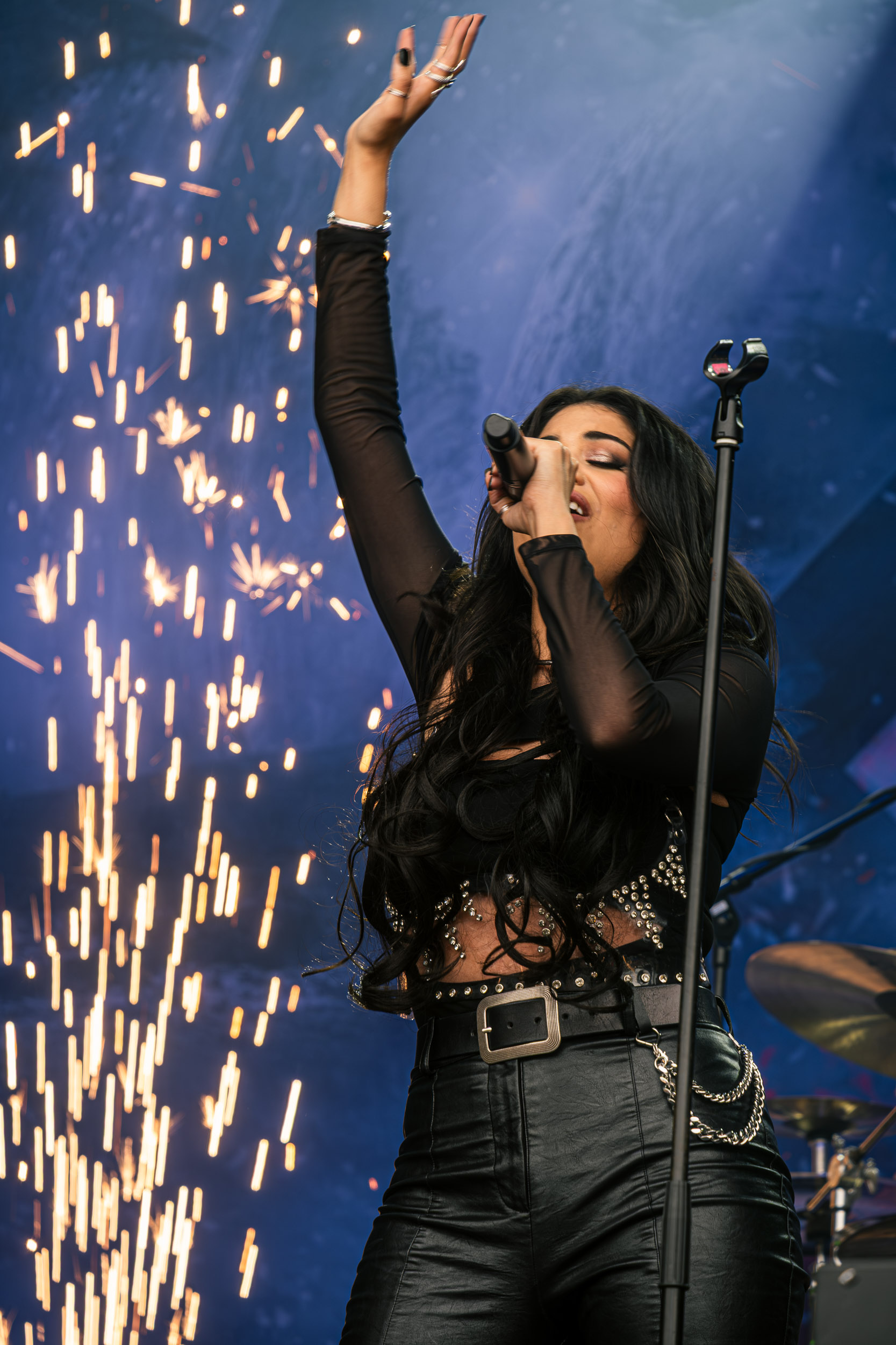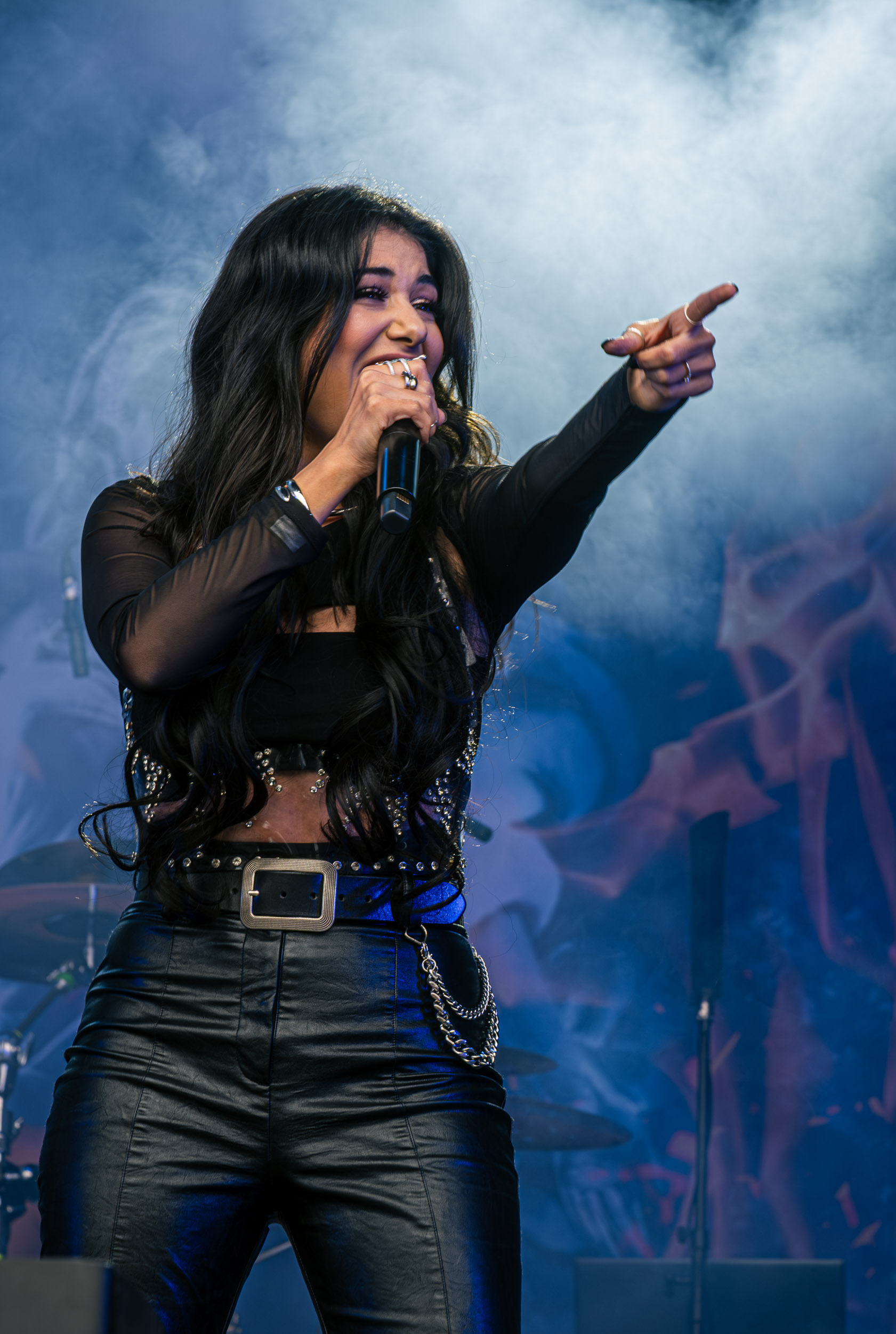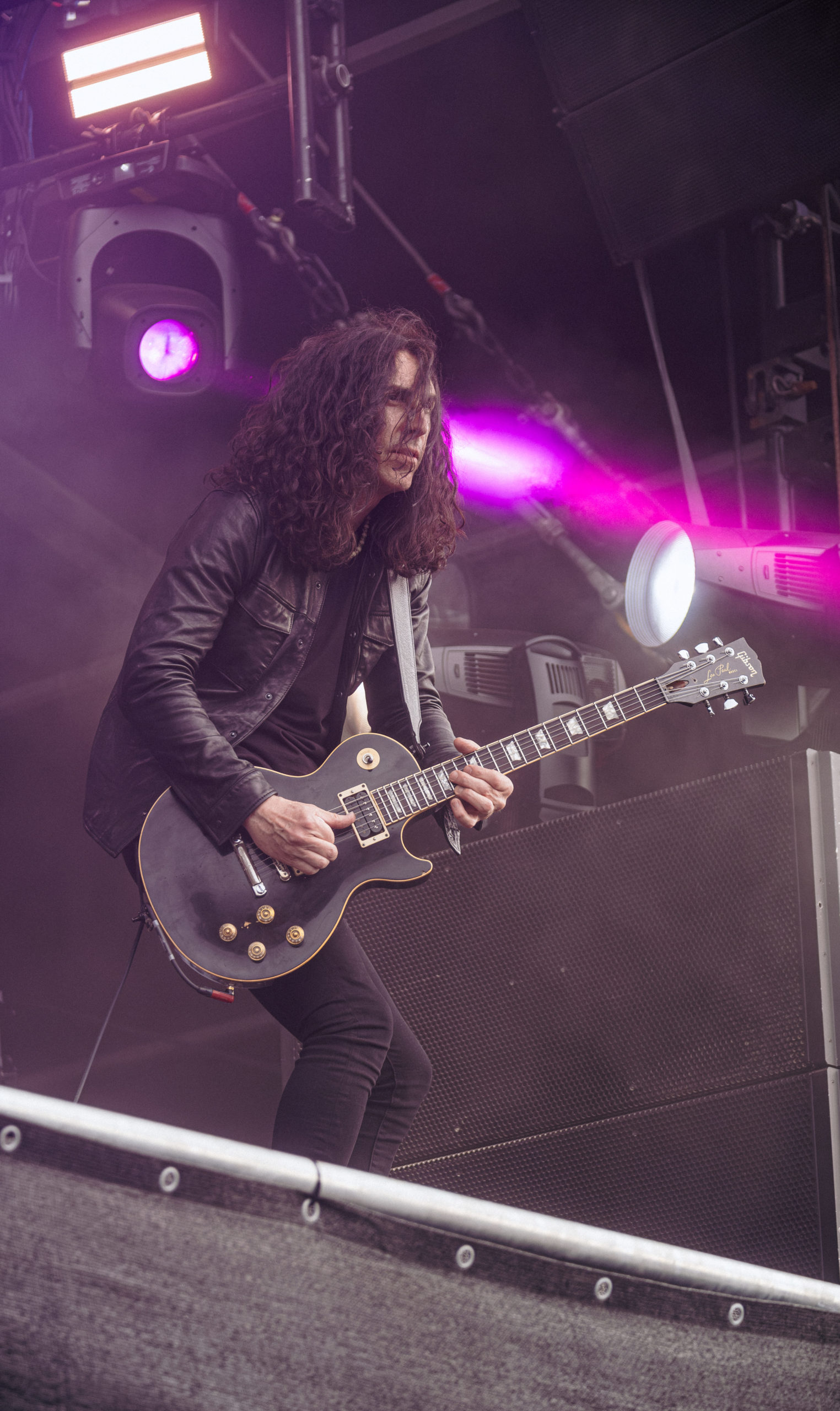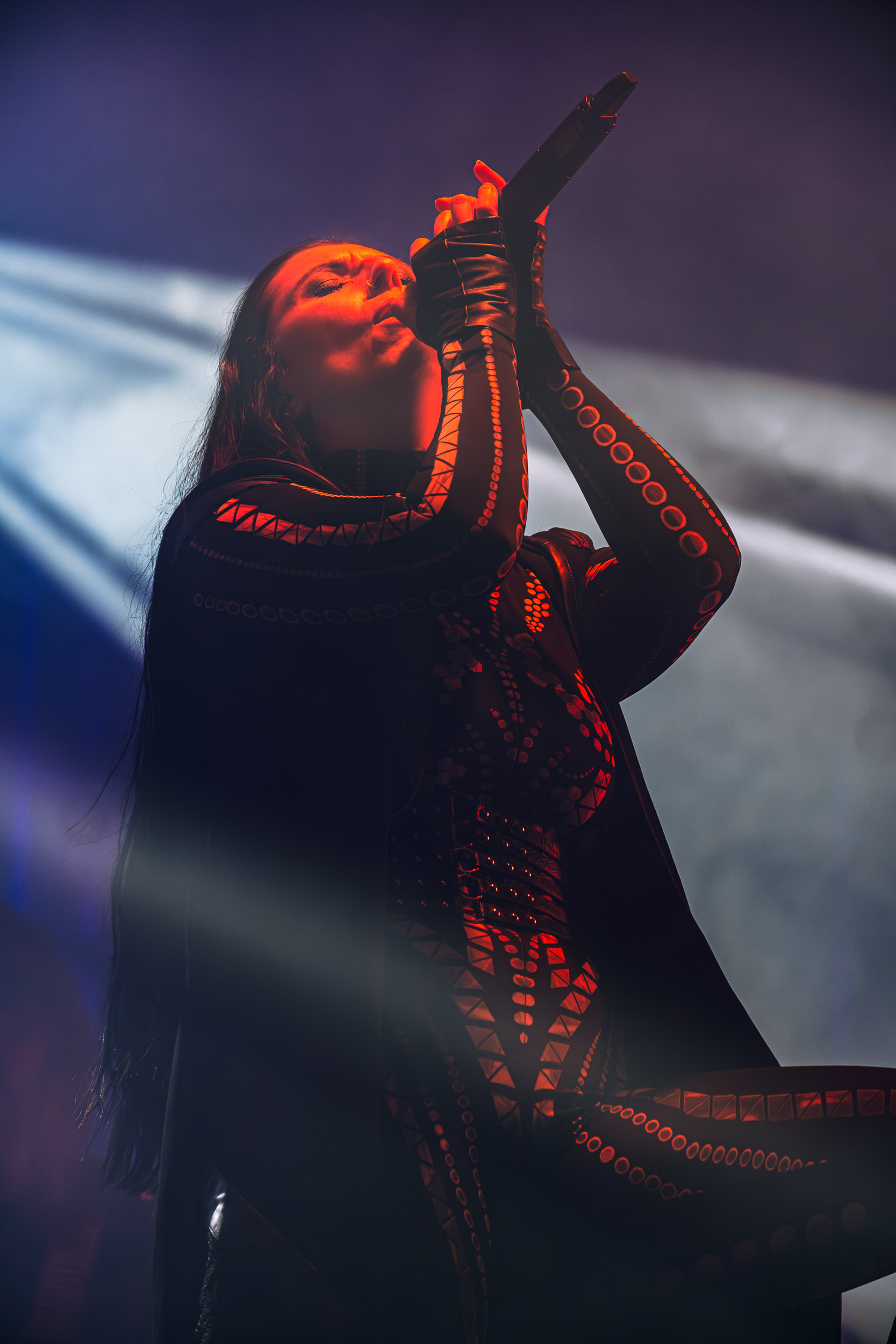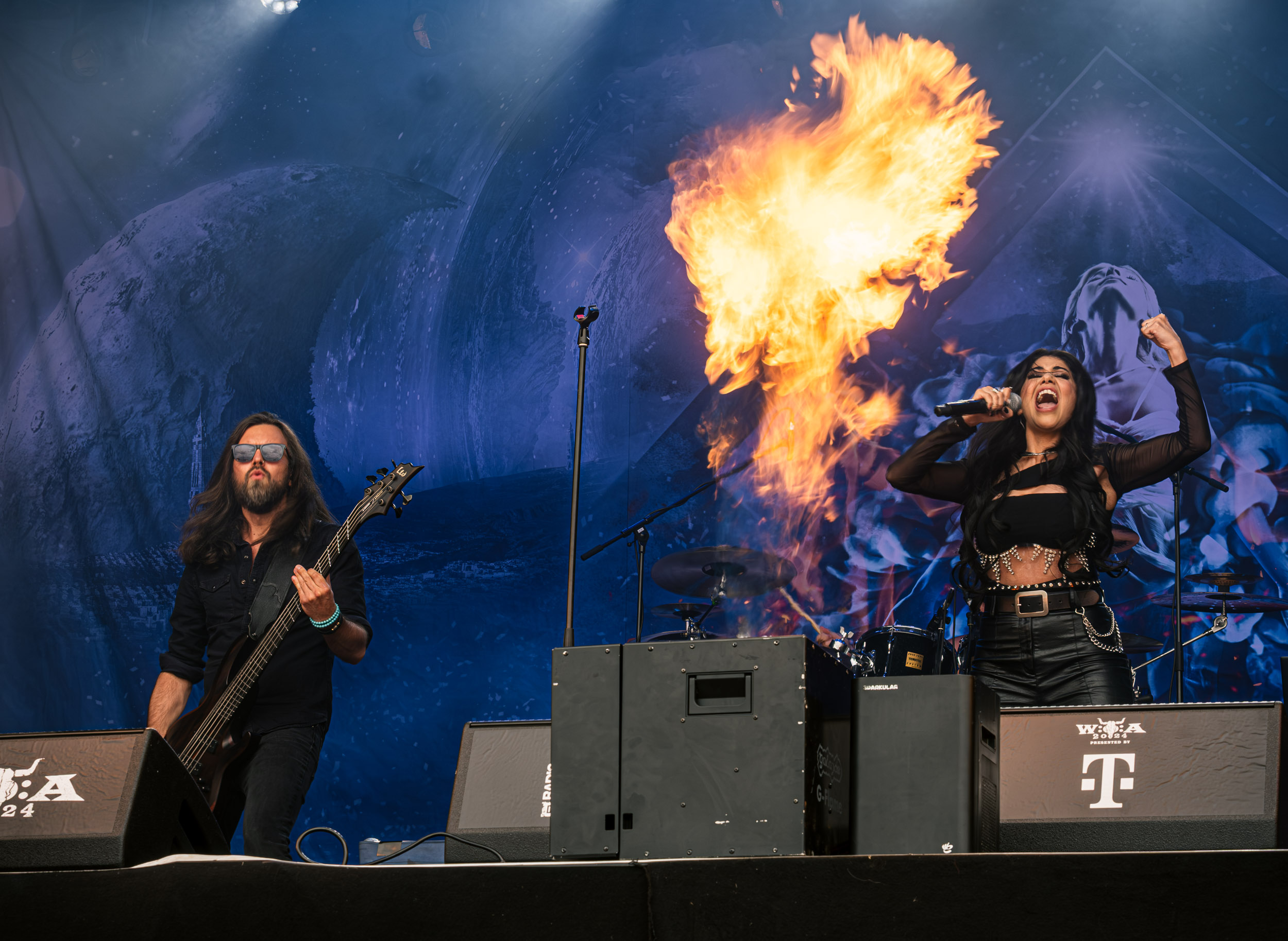 Après avoir assisté à la fin du show de Blind Guardian — qui me donne le plaisir d’entendre en live Sacred Worlds, un de mes morceaux préférés —, et alors que l’arrivée de Korn sur la Harder Stage rassemble une foule monstrueuse sur l’Infield, je retourne vers la Headbangers Stage pour Unleash the Archers — encore du power metal, et encore un groupe à chant féminin ! Il se distingue toutefois de ceux qui l’ont précédé, ceci sur pas mal de points. À commencer par son approche rétro-futuriste d’inspiration disco/funk des 80’s, particulièrement bien mis en avant sur son dernier album en date Phantoma. La chanteuse Brittney Slayes porte son incarnation de l’héroïne de l’opus jusqu’à la scène, arborant un costume de robot humanoïde. Sa voix chaleureuse de contralto contribue aussi en bonne partie à l’identité du groupe, à contre-courant des chants lyriques ou blues auxquels le genre est habitué, et ayant quelque chose d’apaisant. La grande brune se montre également très sympathique vis-à-vis du public, qu’elle remercie très aimablement et avec le sourire. Ses comparses guitaristes se montrent quant à eux très virtuoses, tandis que le bassiste Nick Miller vit clairement sa meilleure vie. Unleash the Archers apparaît ainsi comme un groupe sachant mêler influences old-school et modernes, autant musicalement que dans son état d’esprit, et qui mérite largement son succès. Seul petit bémol pour moi : le scream du guitariste Grant Tuesdell est samplé, ce qui retire un peu à la prestation. [Ségolène]