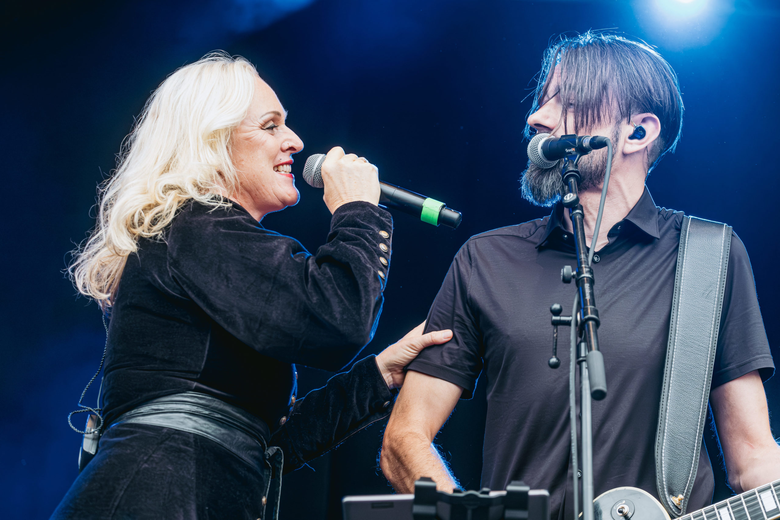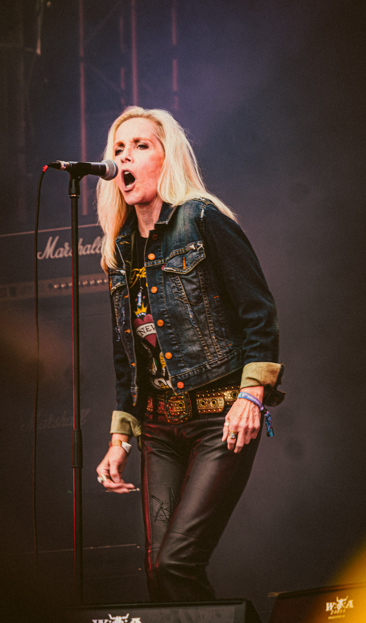 En ce début de journée, le parterre devant la W:E:T Stage est encore bien dégarni pour assister au concert de Cherie Currie, ex-chanteuse de The Runaways, qui s’est entourée de jeunes zicos au look street-glam qui correspond très bien au style hard rock/glam et à l’insolence punk véhiculés par The Runaways. Les titres les plus emblématiques du groupe serviront évidemment de base à la set list, qui comprend néanmoins deux compositions de Cherie en solo, You Wreck Me an Rock’n’Roll Rosie, qui passent le cap du live sans problème. Alors que le parterre s’est peuplé petit à petit, il est déjà presque temps pour Cherie et consorts de partir, non sans nous balancer un petit Cherry Bomb, l’un des plus gros tube de The Runaways, simple et accrocheur à souhait. Un chouette concert qui finit sur une étrange impression, Cherie et ses boys quittant la scène presque sur la pointe des pieds, en disant à peine au revoir au public. [Oli]