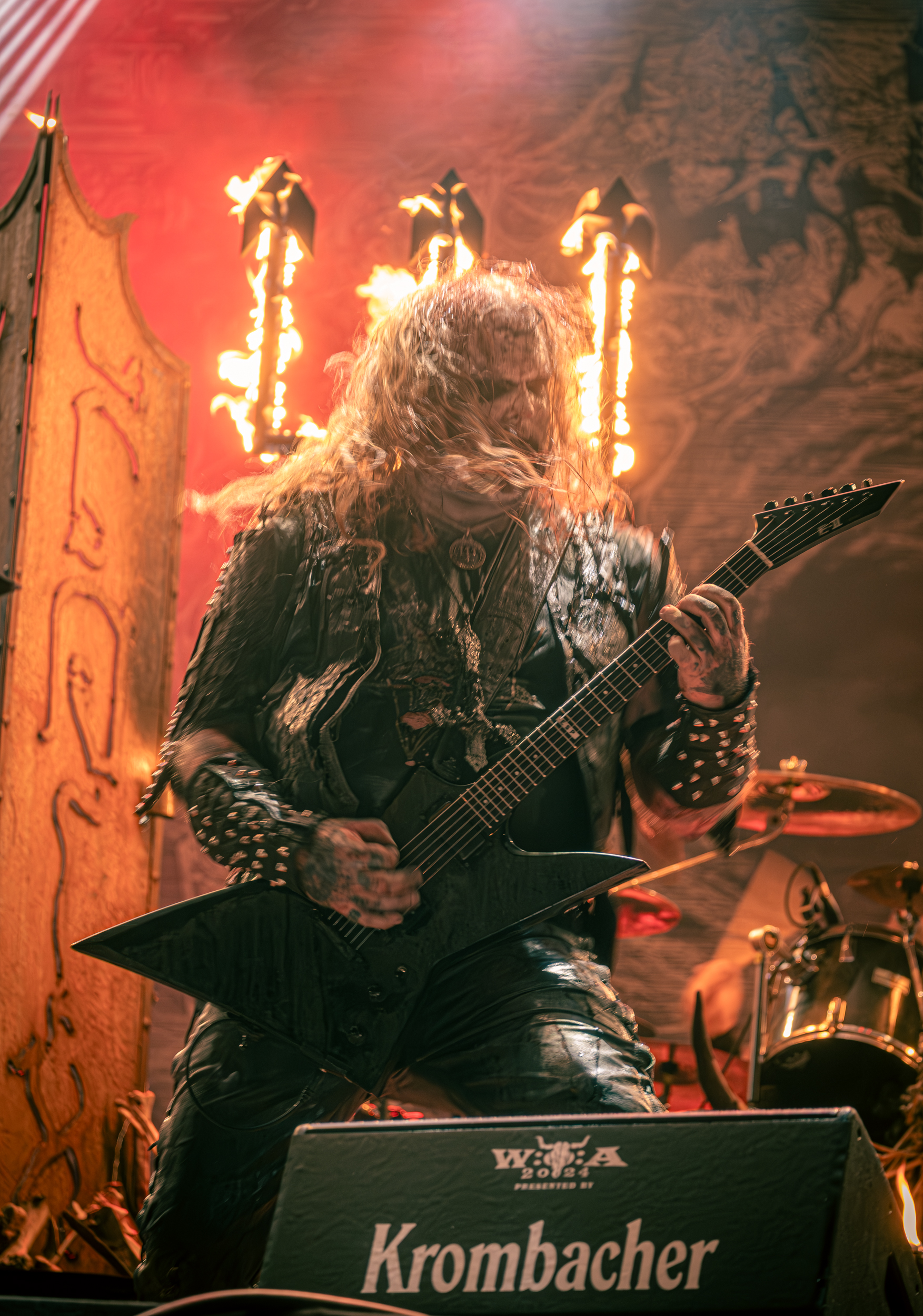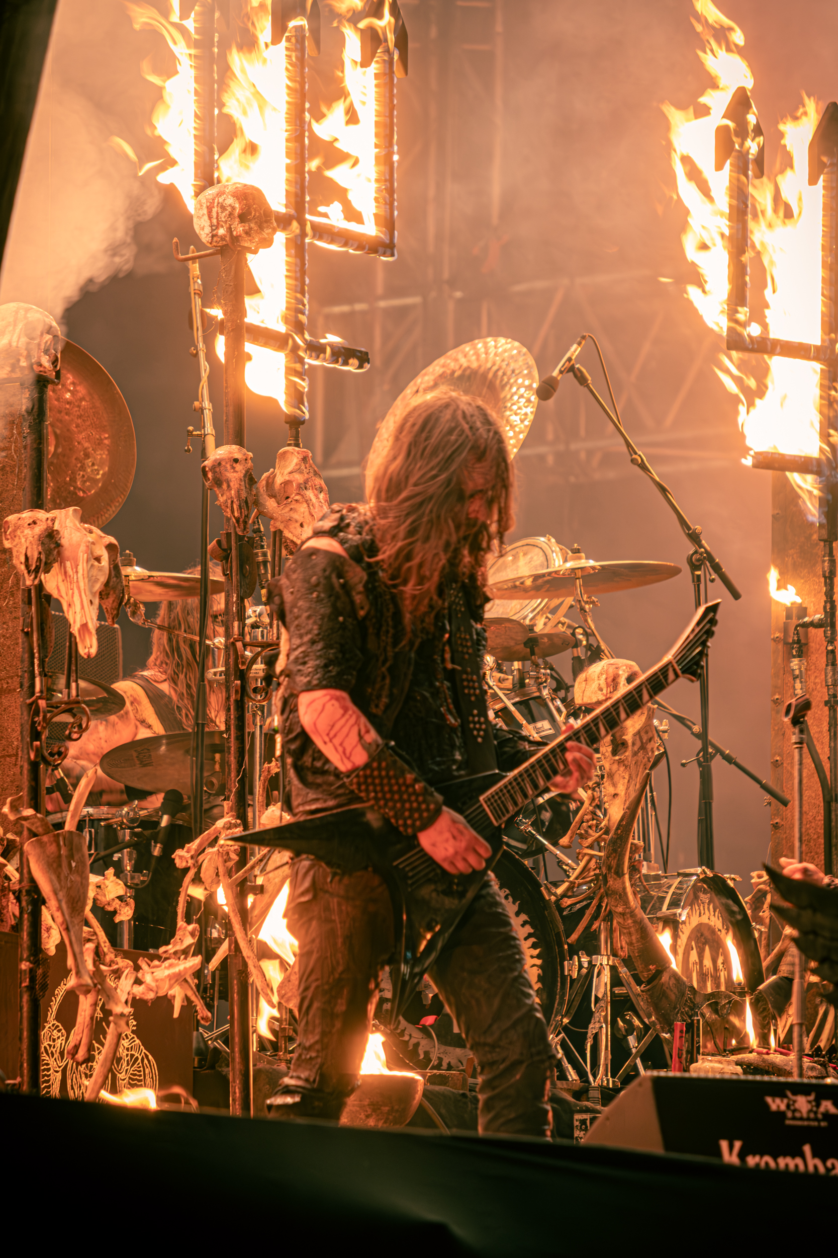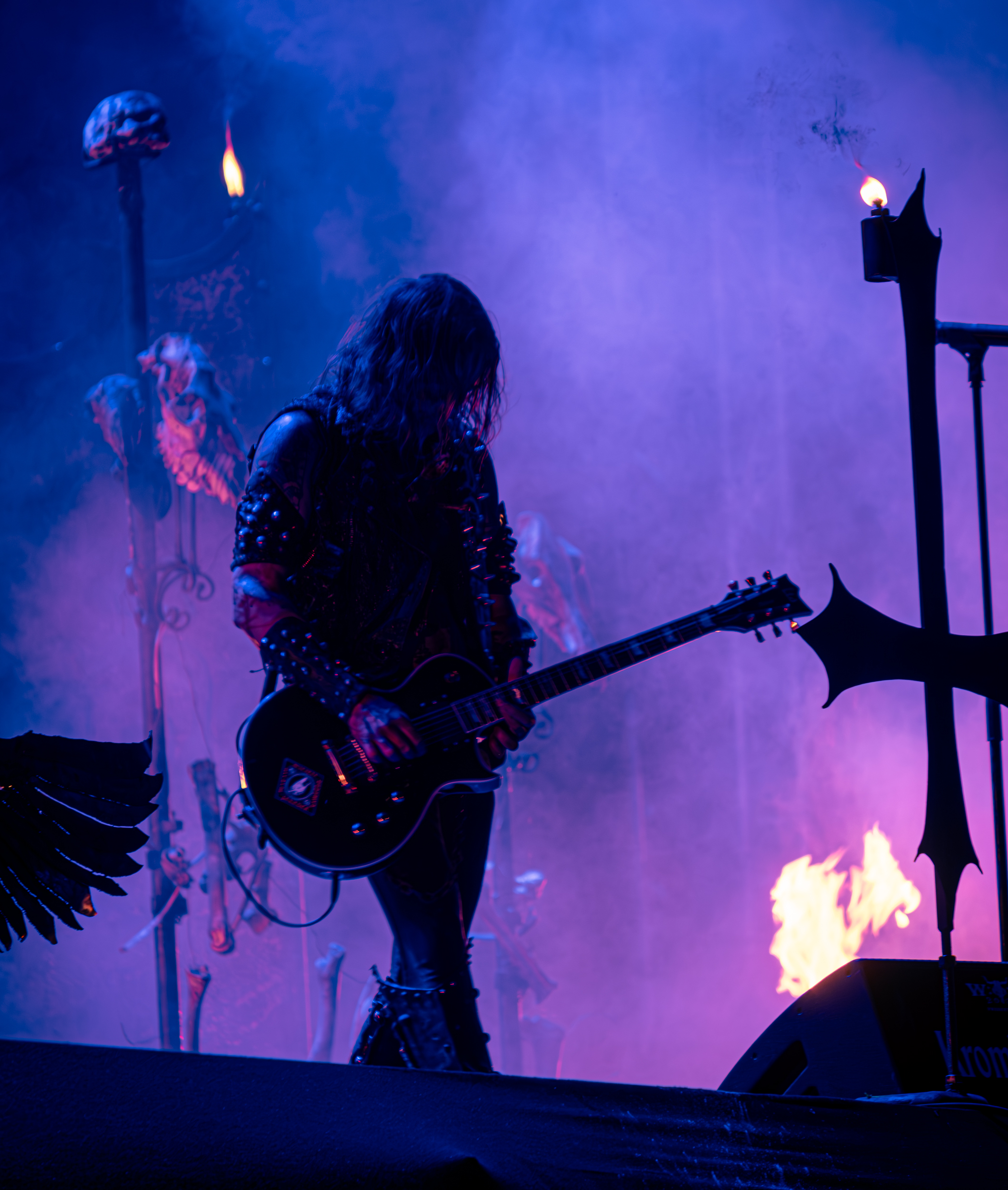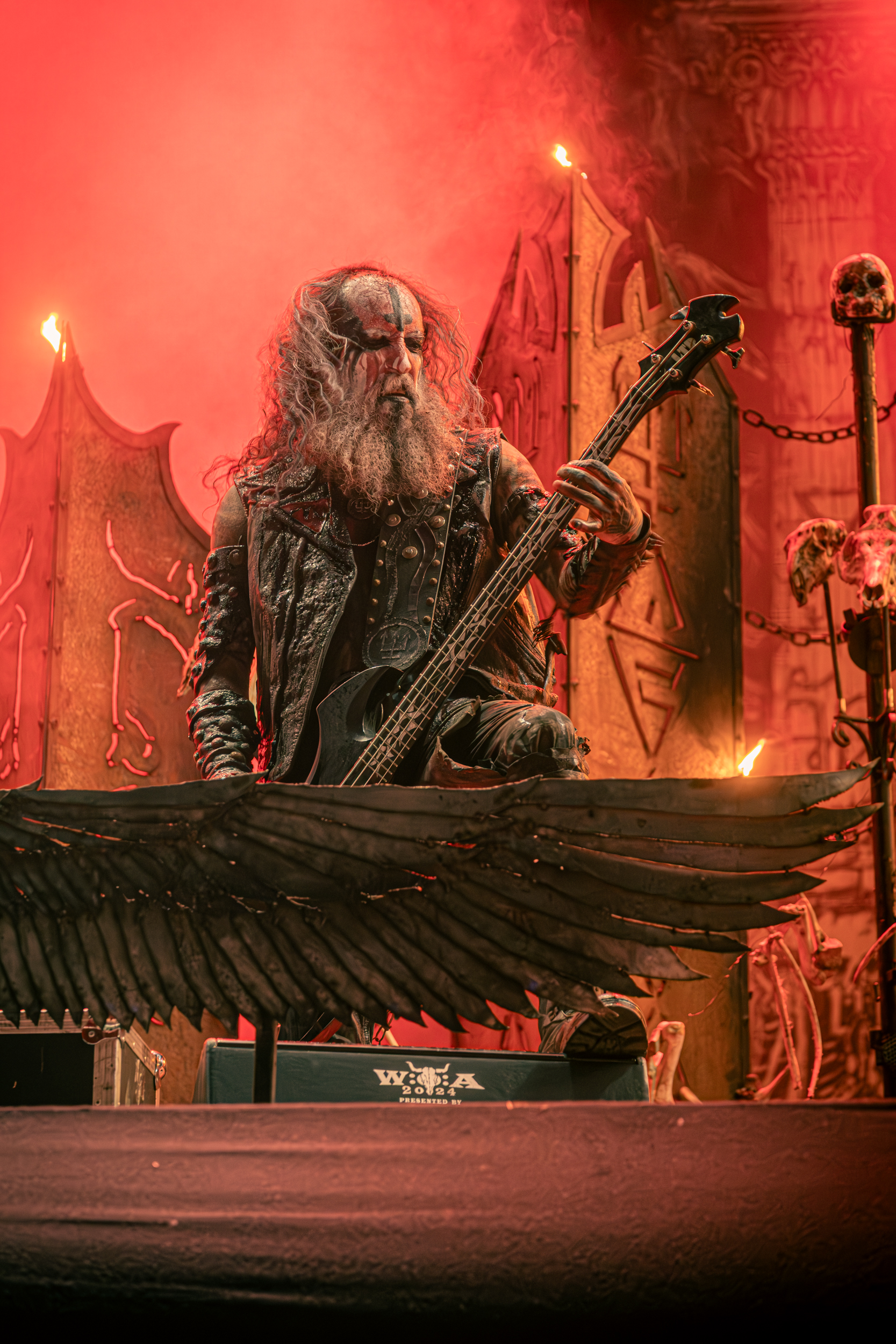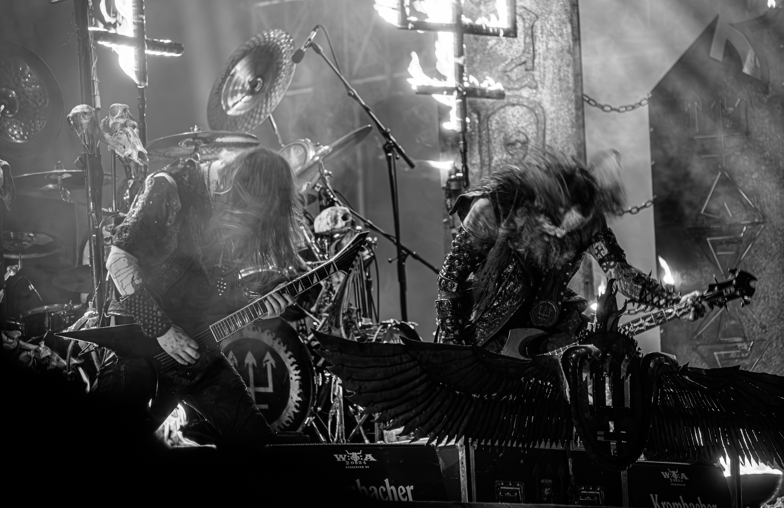 Sur la Louder Stage, la soirée s’achève avec Watain et son show entièrement dédié à l’album Lawless Darkness sorti en 2010, exclusif au Wacken 2024. Pour l’occasion, le géant suédois du black metal apporte un soin particulier à sa scénographie, mettant le feu à la scène au sens propre. De même, les musiciens soignent leur exécution, millimétrée, carrée et irréprochable, et injectent leur énergie infernale à des morceaux qui, pour certains, n’ont plus été intégrés à une setlist depuis longtemps. Erik Danielsson et consorts jouent le jeu à fond et cherchent très clairement à faire plaisir aux spectateurs ; néanmoins, hormis quelques-uns chez qui j’observe des réactions aussi théâtrales que le jeu de scène du groupe, ces derniers ne semblent pas se montrer plus réceptifs que ça… la faute à la fatigue ou à un spectacle un peu trop calculé ? S’agit-il plutôt d’une manifestation de l’attitude stoïque qu’il est souvent de coutume d’adopter durant les concerts de black metal occultiste ? Toujours en est-il que Watain ne manque pas de mérite dans son idée de remettre un « vieil » album au goût du jour tout comme dans son sens du spectacle et livre une performance impressionnante, notamment au niveau des effets pyrotechniques et de la maestria d’Erik Danielsson dans le maniement de torches. Le frontman prend la troisième guitare sur l’instrumental de milieu de set, qui donne son titre à l’album et au show, complément pas désagréable à ses comparses guitaristes qui de leur côté savent se mettre en avant. Suivent les quatre derniers titres, dont Hymn to Qayin, traditionnelle ouverture des concerts du groupe. Après quoi, le concert prend fin sur une dernière scène spectaculaire prenant la forme d’un rituel au cours duquel Erik Danielsson se pointe une lame sur la tête avant de faire la révérence. Preuve, s’il en est, que Watain met l’aspect spectaculaire au cœur de ses concerts et qu’il vaut le coup de voir le groupe pour cela. [Ségolène]