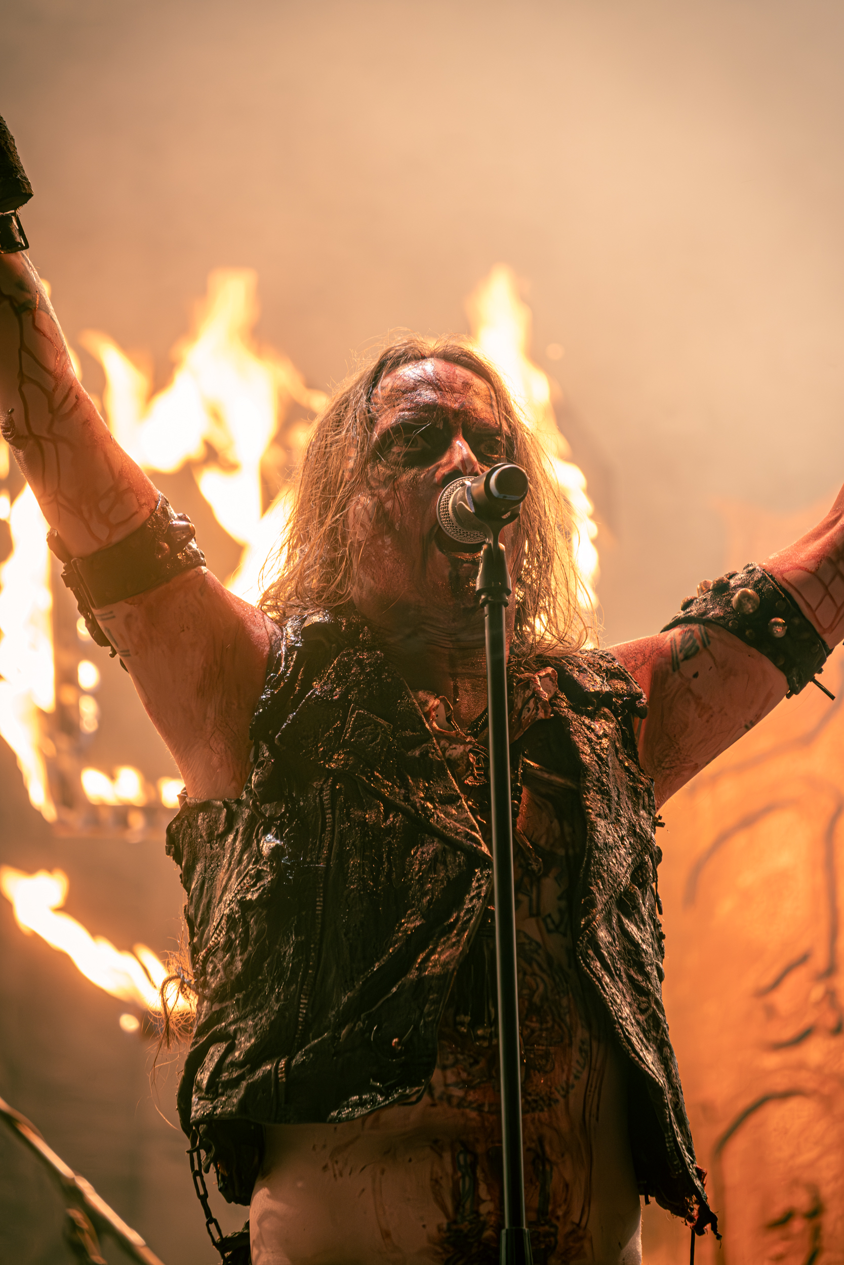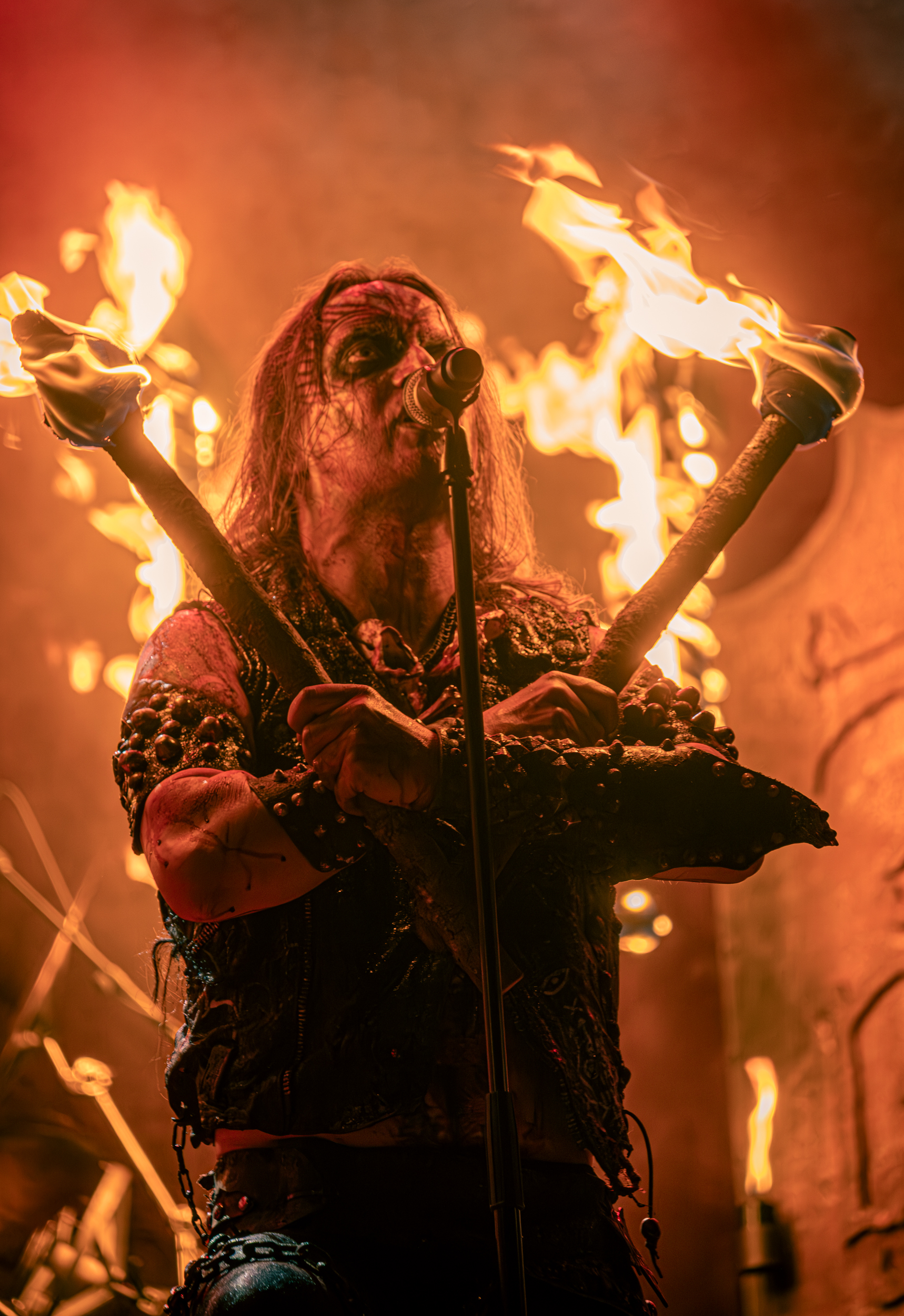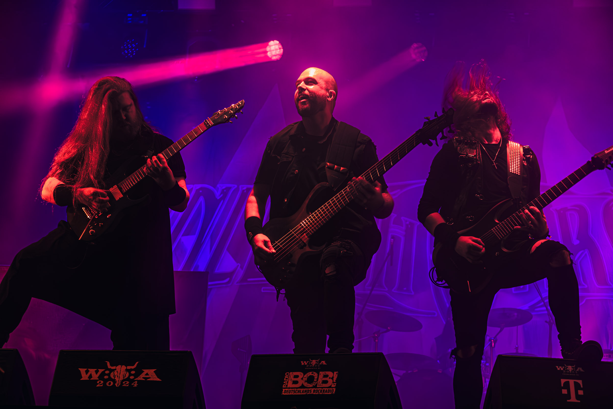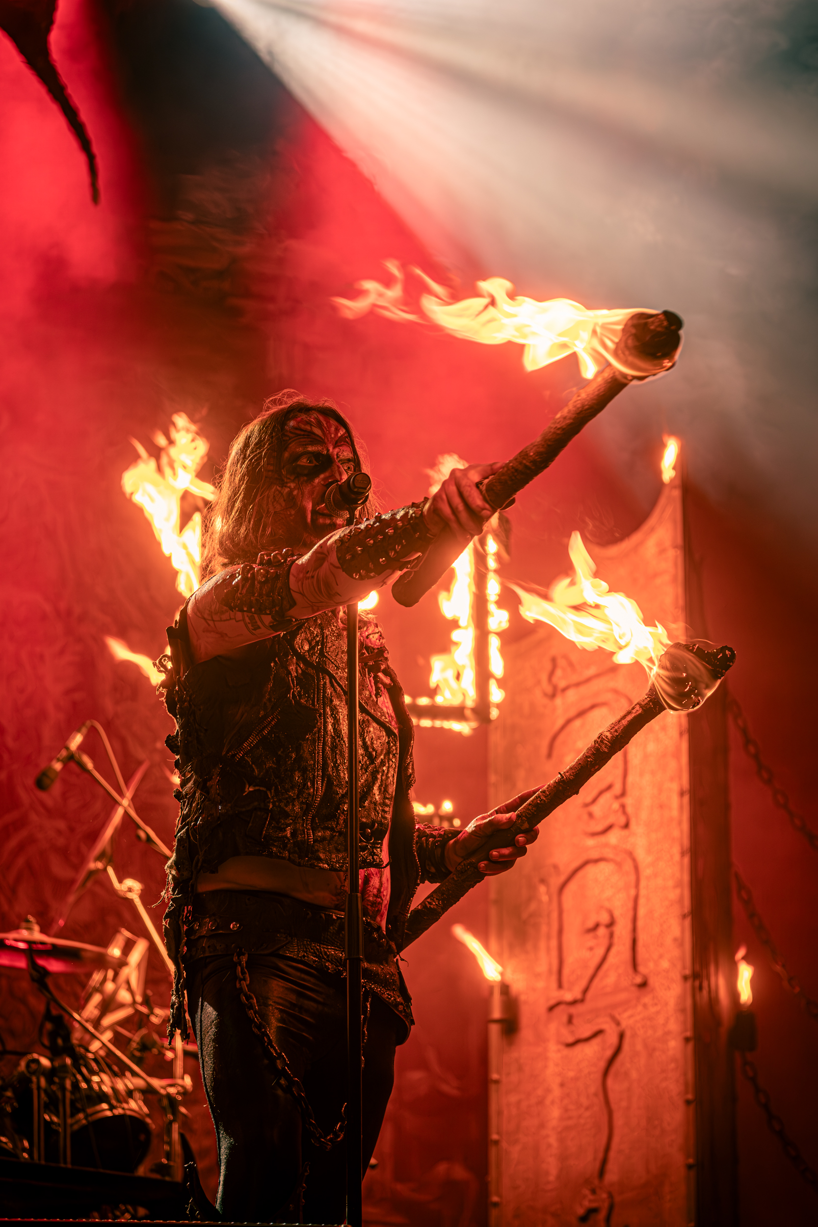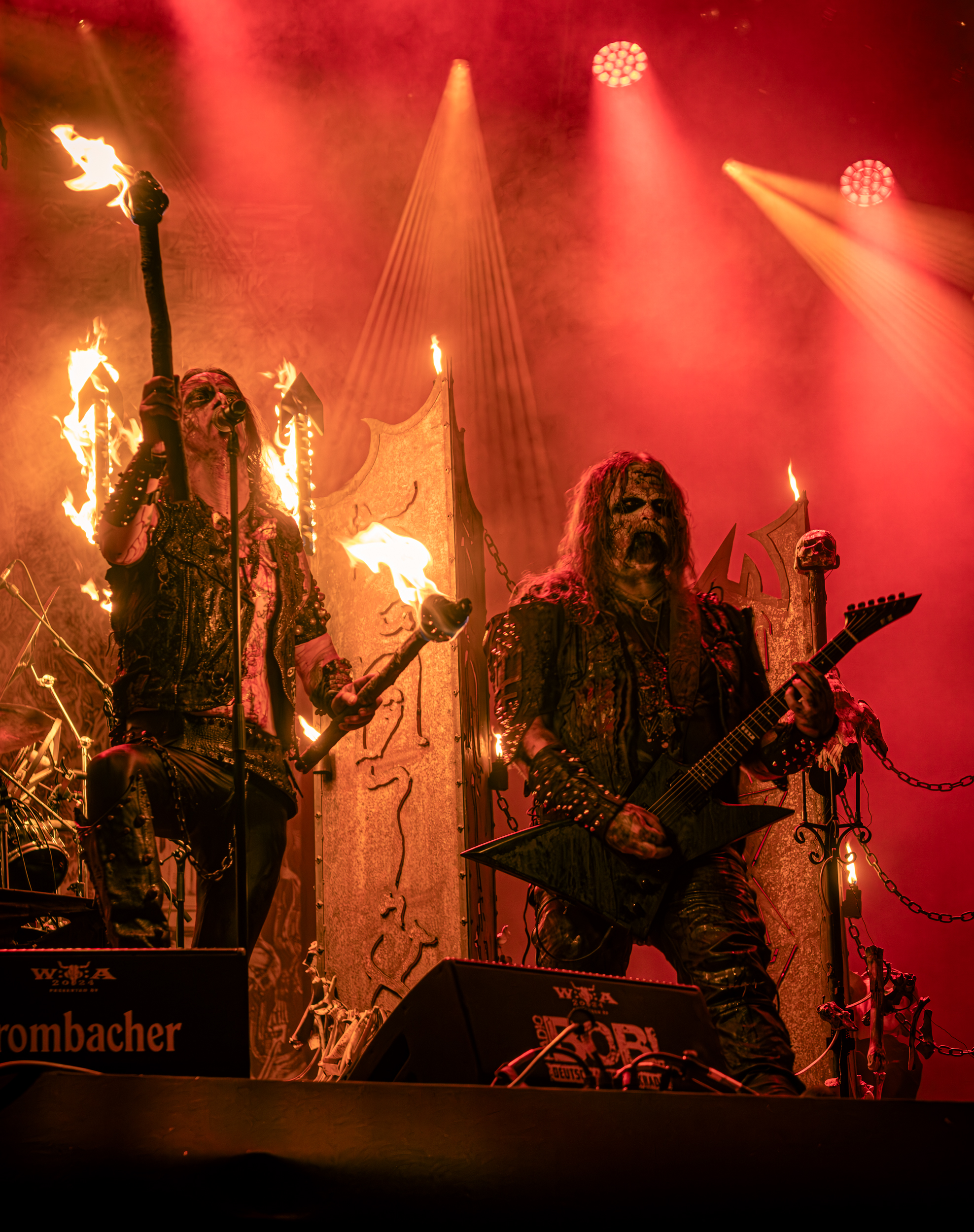 Sur la Louder Stage, la soirée s’achève avec Watain et son show entièrement dédié à l’album Lawless Darkness sorti en 2010, exclusif au Wacken 2024. Pour l’occasion, le géant suédois du black metal apporte un soin particulier à sa scénographie, mettant le feu à la scène au sens propre. De même, les musiciens soignent leur exécution, millimétrée, carrée et irréprochable, et injectent leur énergie infernale à des morceaux qui, pour certains, n’ont plus été intégrés à une setlist depuis longtemps. Erik Danielsson et consorts jouent le jeu à fond et cherchent très clairement à faire plaisir aux spectateurs ; néanmoins, hormis quelques-uns chez qui j’observe des réactions aussi théâtrales que le jeu de scène du groupe, ces derniers ne semblent pas se montrer plus réceptifs que ça… la faute à la fatigue ou à un spectacle un peu trop calculé ? S’agit-il plutôt d’une manifestation de l’attitude stoïque qu’il est souvent de coutume d’adopter durant les concerts de black metal occultiste ? Toujours en est-il que Watain ne manque pas de mérite dans son idée de remettre un « vieil » album au goût du jour tout comme dans son sens du spectacle et livre une performance impressionnante, notamment au niveau des effets pyrotechniques et de la maestria d’Erik Danielsson dans le maniement de torches. Le frontman prend la troisième guitare sur l’instrumental de milieu de set, qui donne son titre à l’album et au show, complément pas désagréable à ses comparses guitaristes qui de leur côté savent se mettre en avant. Suivent les quatre derniers titres, dont Hymn to Qayin, traditionnelle ouverture des concerts du groupe. Après quoi, le concert prend fin sur une dernière scène spectaculaire prenant la forme d’un rituel au cours duquel Erik Danielsson se pointe une lame sur la tête avant de faire la révérence. Preuve, s’il en est, que Watain met l’aspect spectaculaire au cœur de ses concerts et qu’il vaut le coup de voir le groupe pour cela. [Ségolène]