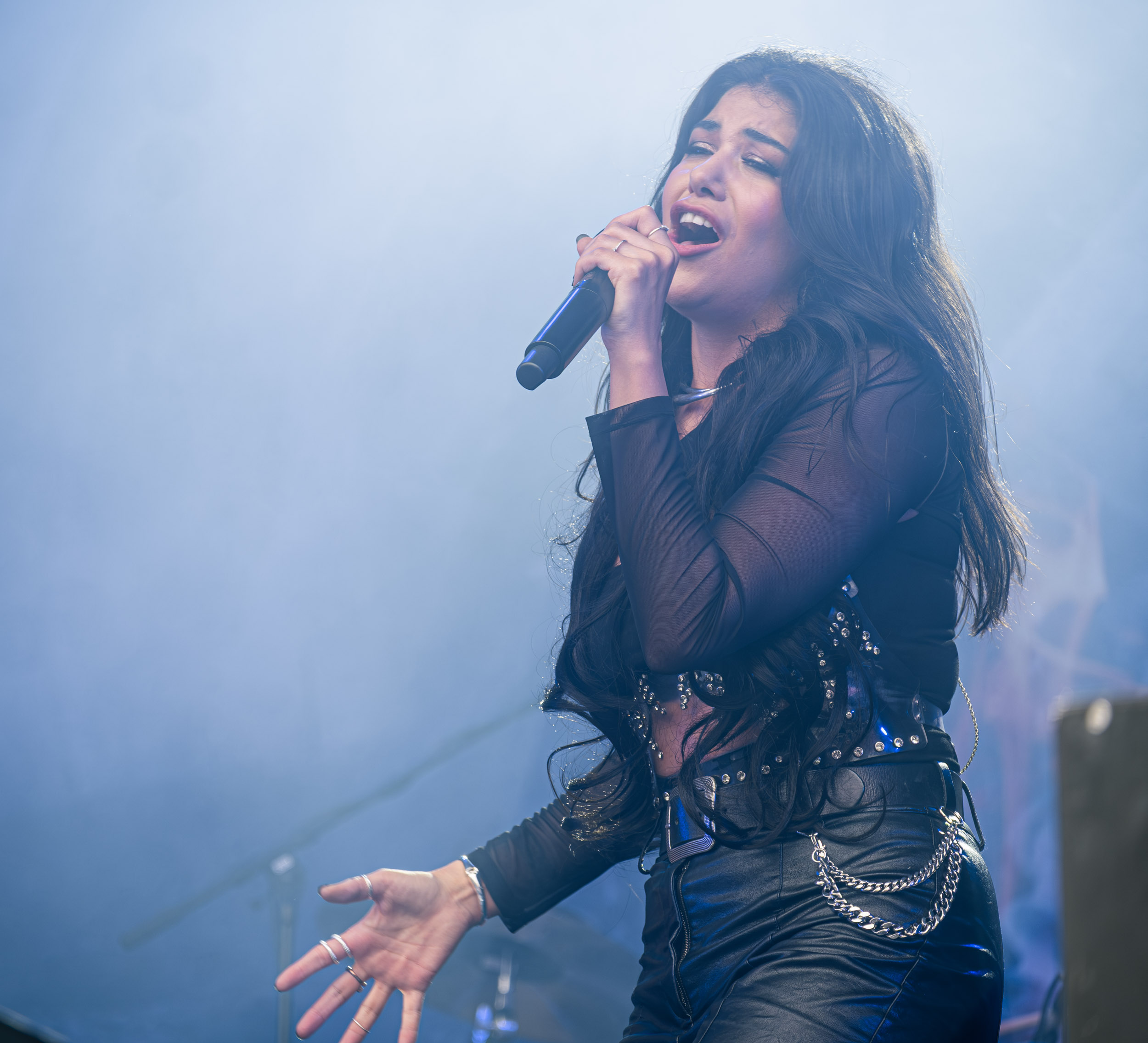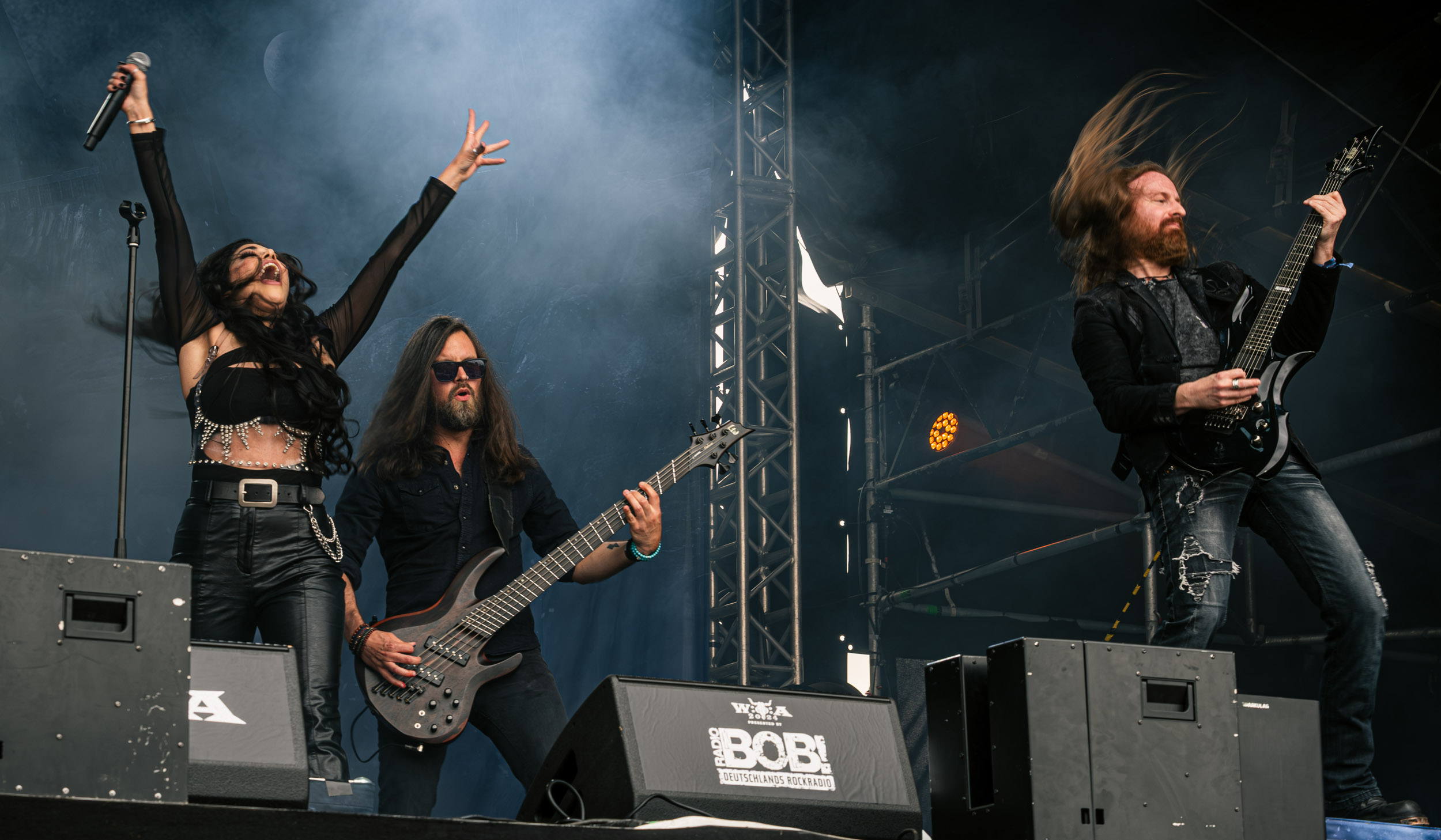 Mon retour à mes premières amours métalliques me mène du côté du metal symphonique à voix féminine avec le passage de Xandria sur la Headbangers Stage. M’étant à titre personnel désintéressée du groupe suite aux multiples départs et remplacements de ses chanteuses ayant chacun fait couler leur dose d’encre, je reste toutefois curieuse de voir ce que vaut l’actuelle frontwoman Ambre Vourvahis. Rien que le premier morceau, You Will Never Be our God, lui permet de dévoiler tout l’éventail de ses capacités vocales, du chant mélodieux à certains passages en chant extrême, en passant par quelques envolées lyriques… autant dire qu’elle impressionne ! Le dernier opus en date du groupe, The Wonders Still Awaiting, étant sorti l’année dernière, il va de soi que la setlist est centrée sur ce dernier ; cependant, entre deux extraits ainsi que le récent single Universal, quelques morceaux emblématiques du passé viennent se faire une place, auxquels Ambre Vourvahis apporte sa touche de personnalité et que sont Nightfall — un « favori des fans » selon la chanteuse — et Valentine. La chanteuse en profite également pour annoncer, non sans un petit accent révélateur de ses origines franco-grecques, qu’un nouvel album est en préparation. De quoi susciter la curiosité et l’impatience des fans, qui se sont rassemblés en nombre devant la scène ! En tout cas, de ce qu’il ressort de cette prestation de Xandria, le nouveau line-up semble en harmonie et les effets pyrotechniques et les étincelles ajoutent à l’énergie qui s’en dégagent. Plutôt un bon présage pour la suite ? L’avenir nous le dira. [Ségolène]