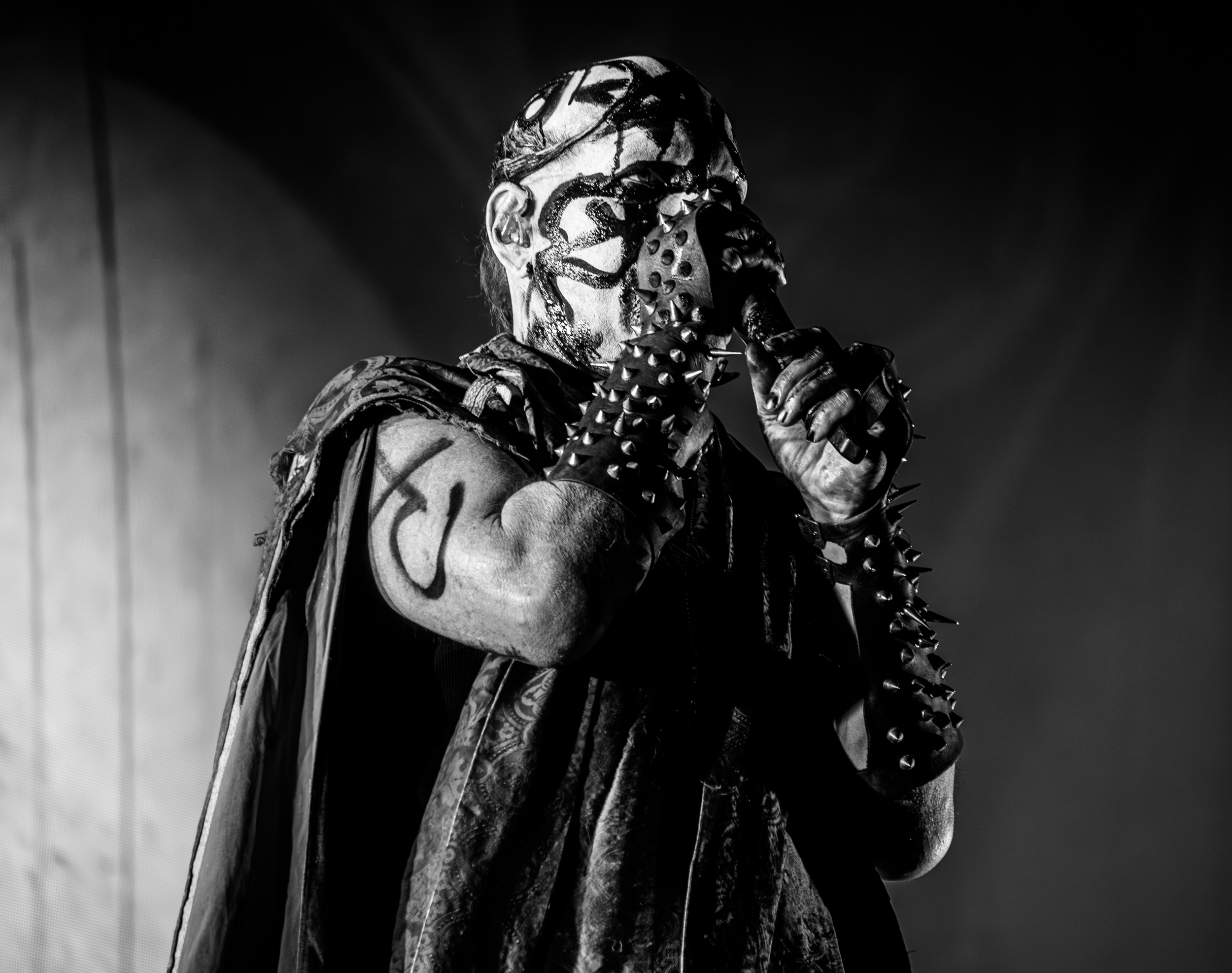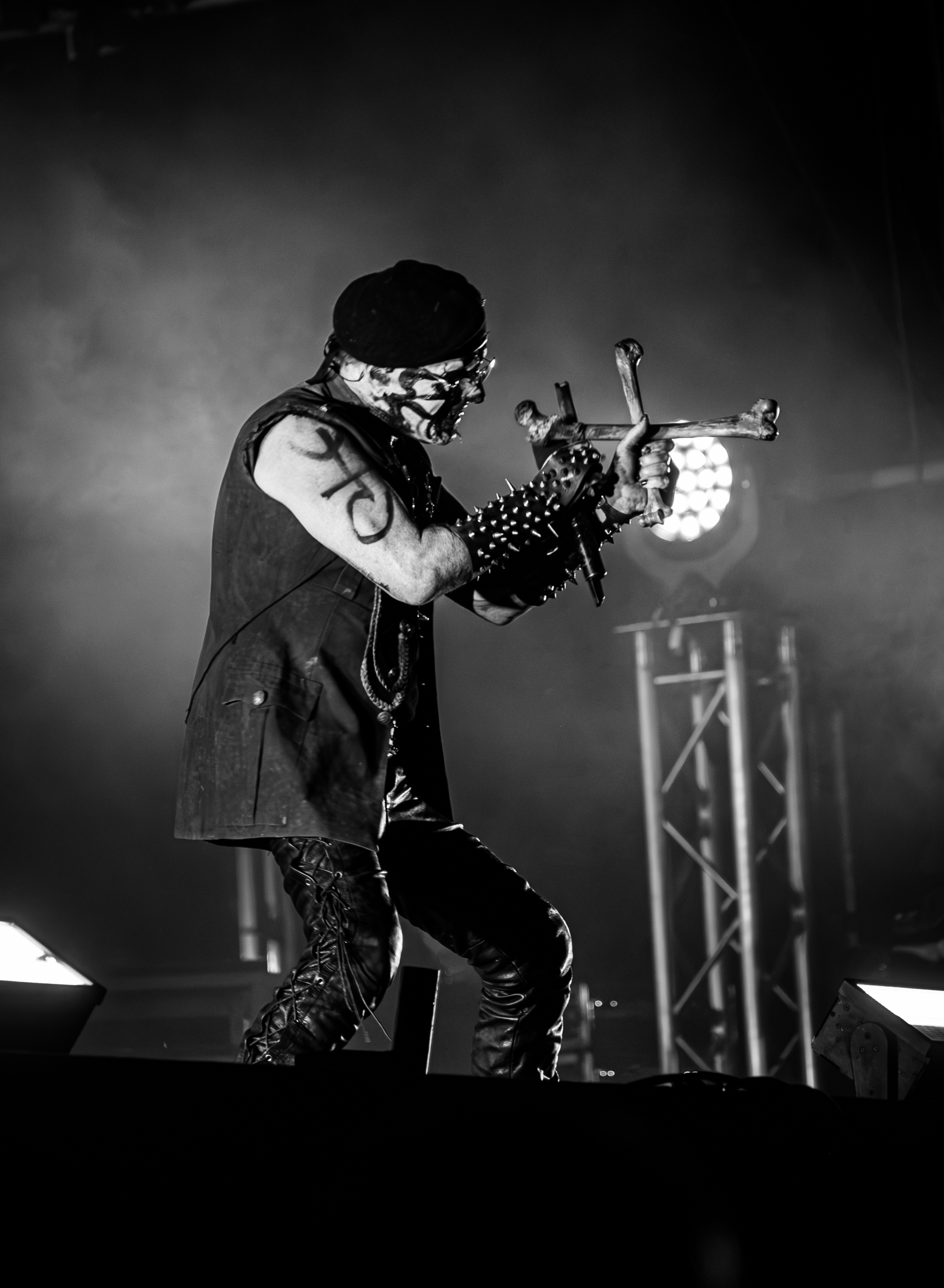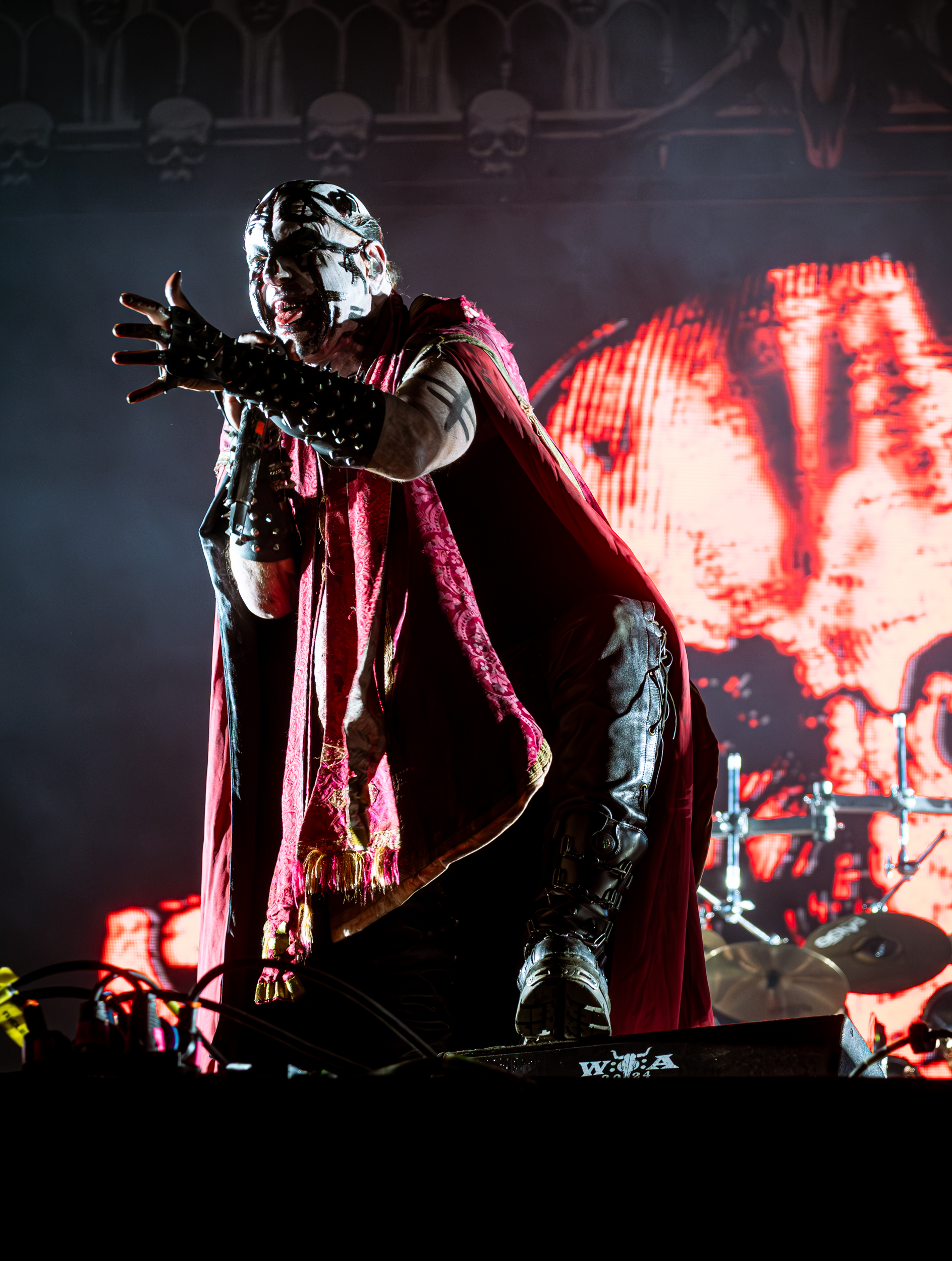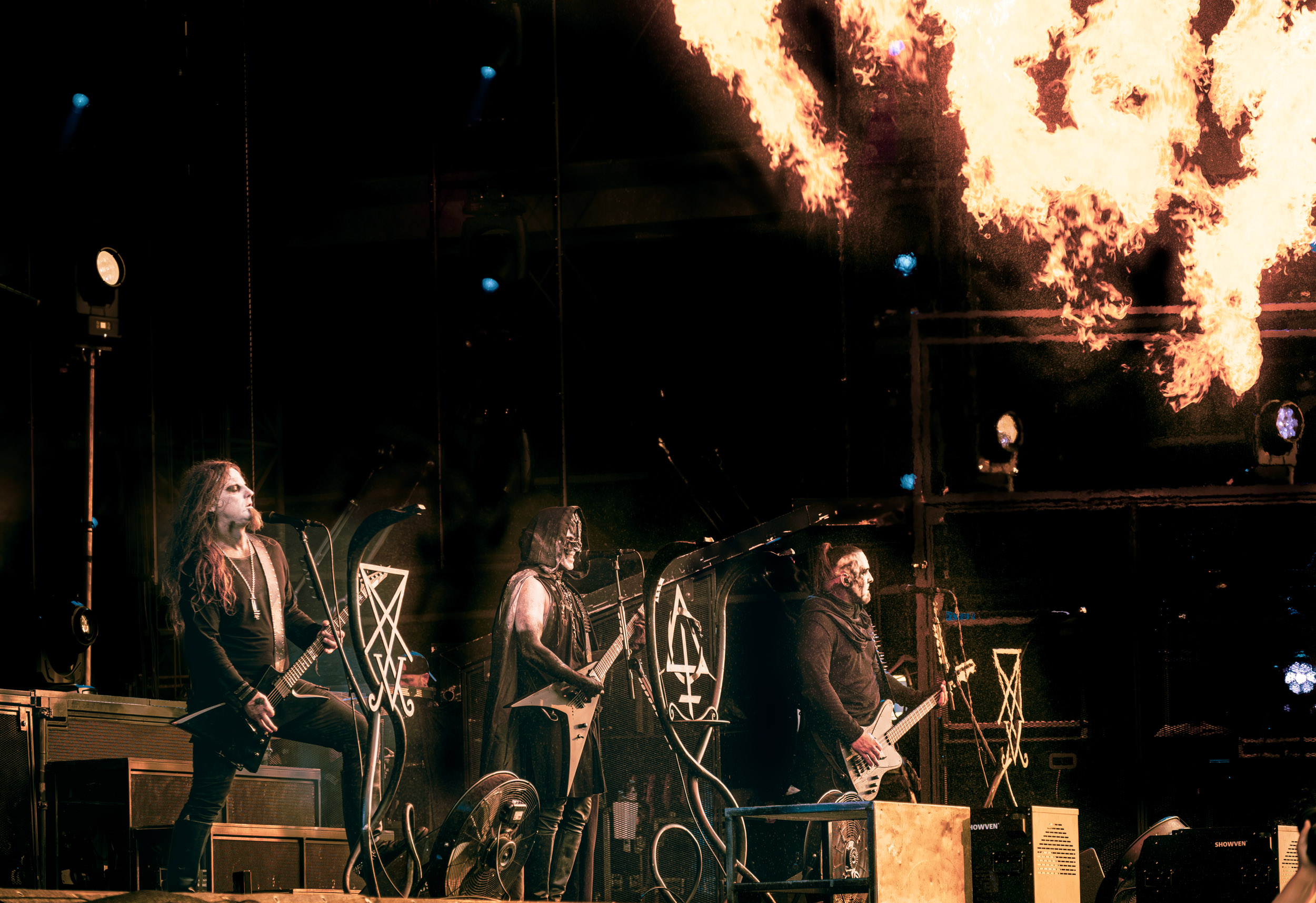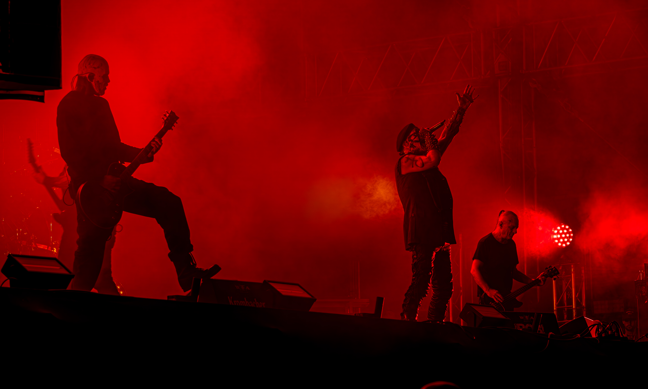 Peu importe la météo menaçante ou la relative faiblesse de mon état de santé du jour, manquer le concert anniversaire de Behemoth était pour moi impossible à envisager. Après tout, ce n’est pas tous les jours que l’on célèbre ses 33 ans et d’avoir officiellement dépassé le Christ ! Pour fêter cet anniversaire dignement, le groupe polonais a concocté une setlist aux petits oignons, constituée de ses plus grands classiques, en y incluant pour l’occasion un morceau datant de ses débuts en 1991, Cursed Angel of Doom. Ce petit retour dans le passé offre l’occasion aux plus jeunes de le découvrir, aux fans de plus longue date de l’apprécier d’une nouvelle manière ; dans tous les cas, un petit coup de jeune à ce morceau old-school et une preuve du soin du détail qu’apporte Behemoth à ses prestations. Entre les multiples hommages au passé plus ou moins lointain, deux extraits d’Opvs Contra Natvram, le dernier album sorti en 2022, The Deathless Sun et Once Upon a Pale Horse, se font une petite place dans la setlist, encore trop jeunes pour ne pas rester dans l’ombre des autres. En tout cas, mon amour de longue date pour le groupe ne me fait pas défaut, mu par l’excellence des musiciens et leur sens du spectacle, et qui m’invite à relativiser mon regret de ne pas avoir pu obtenir l’accès au pit photo. C’est donc depuis le relatif confort du premier rang que j’assiste aux grands moments du set, tels Seth et Orion prenant littéralement le public de haut depuis les plateformes, les musiciens crachant du (faux) sang et bien sûr les multiples changements de costume de Nergal — celui qu’il porte sur Bartzabel remportant ma préférence —, le tout mis en lumière par un soleil déclinant du plus bel effet. Point noir cependant que la fumée qui envahit régulièrement la scène ; à ce niveau, j’exprime toute ma compassion à mes confrères et consœurs photographes l’ayant subie dans le pit ! Comme à chaque concert de Behemoth depuis 2014 et la sortie de The Satanist, le spectacle atteint son paroxysme avec le finale O Father O Satan O Sun, des costumes et masques à la séquence narrative de fin, qui donne à ce show anniversaire une conclusion digne de ce nom. [Ségolène]