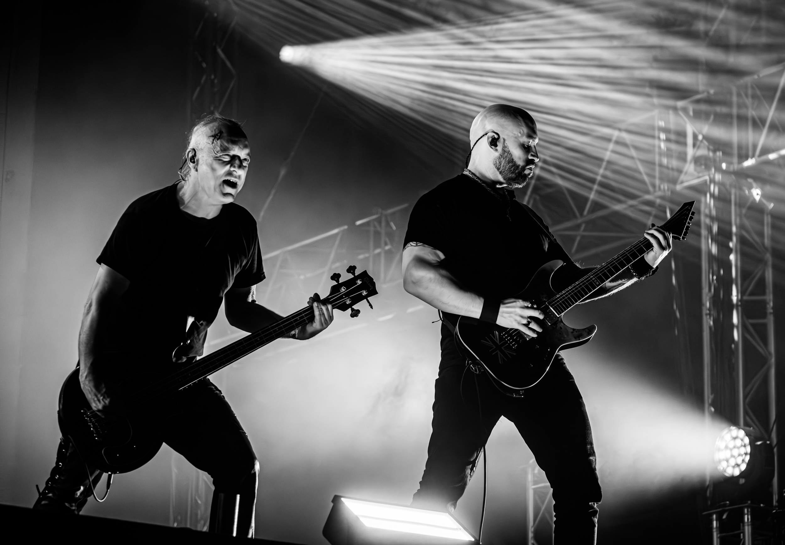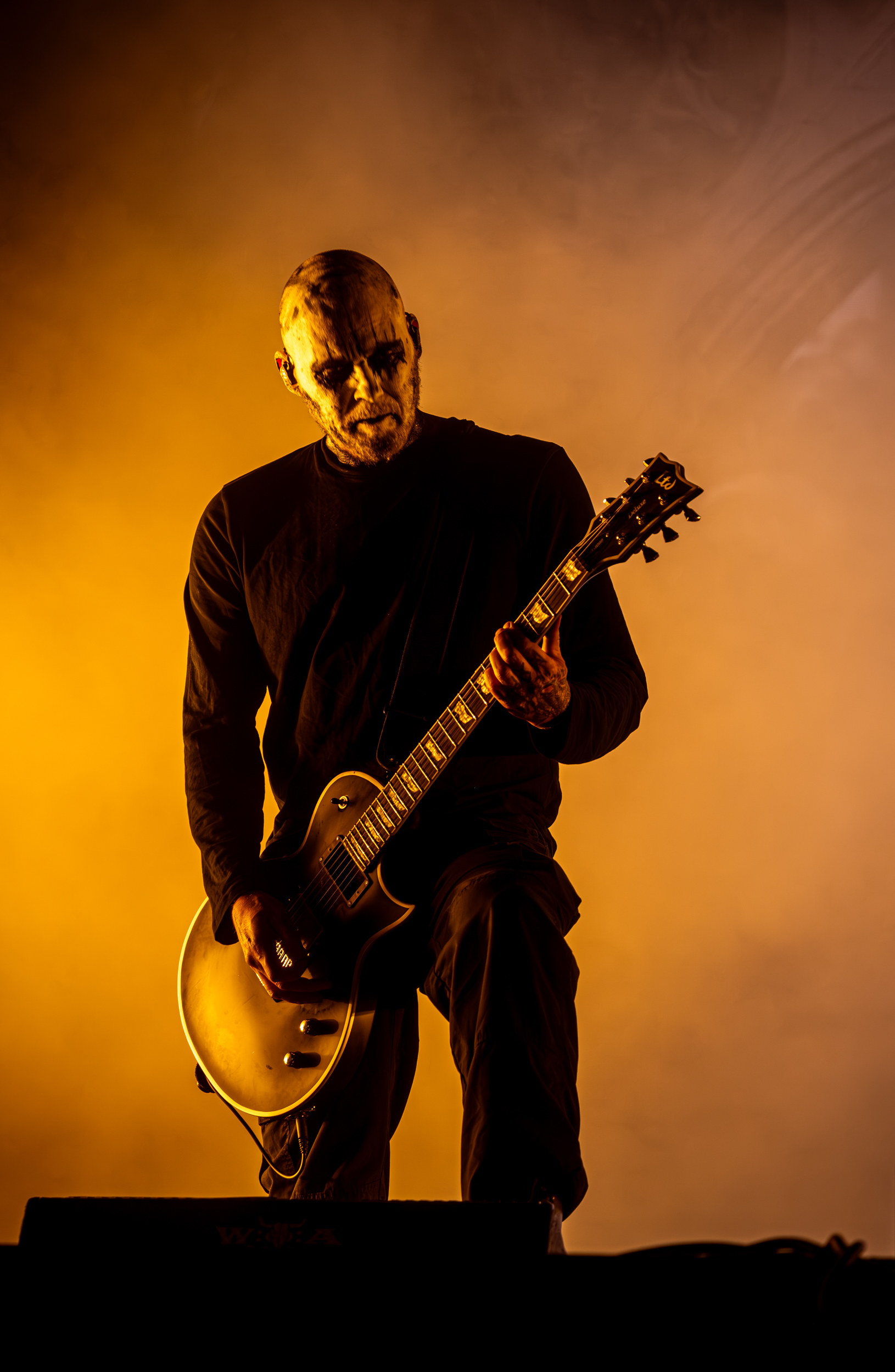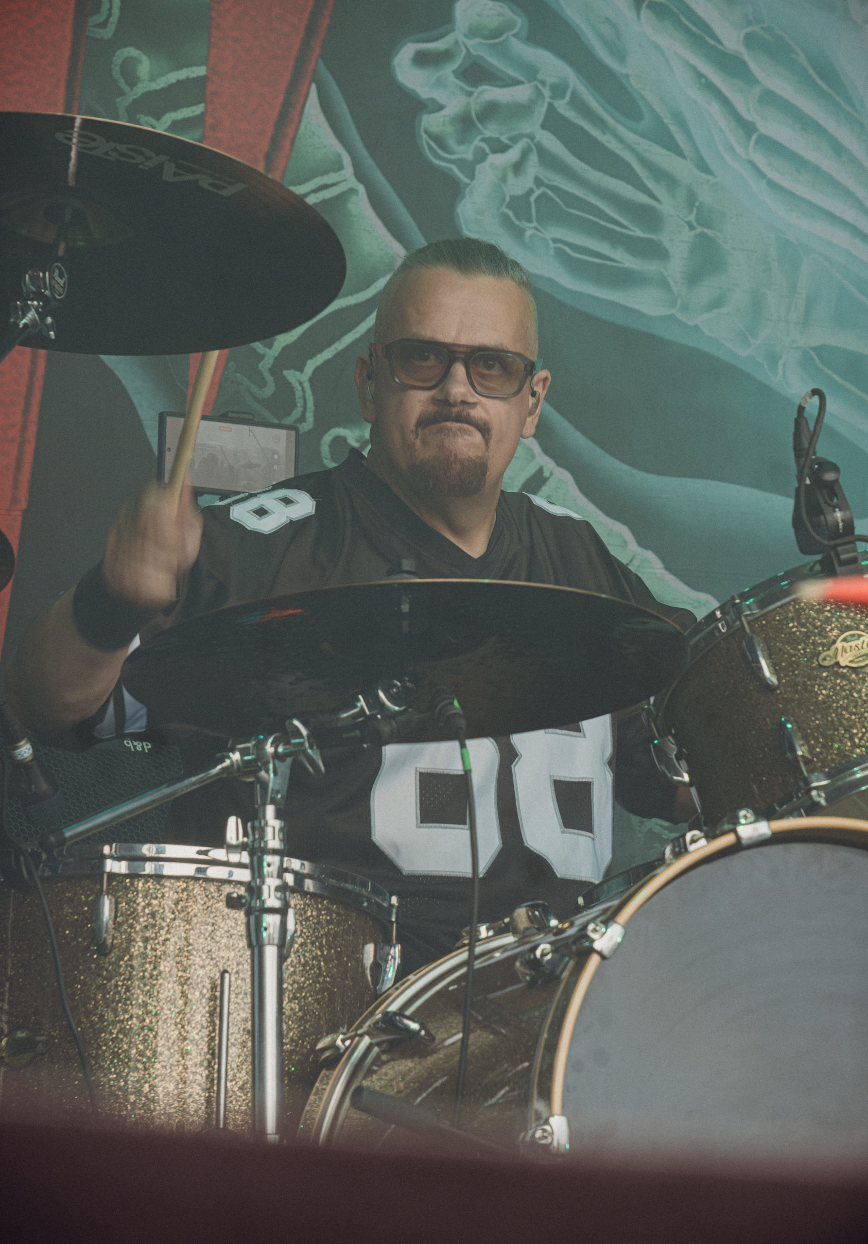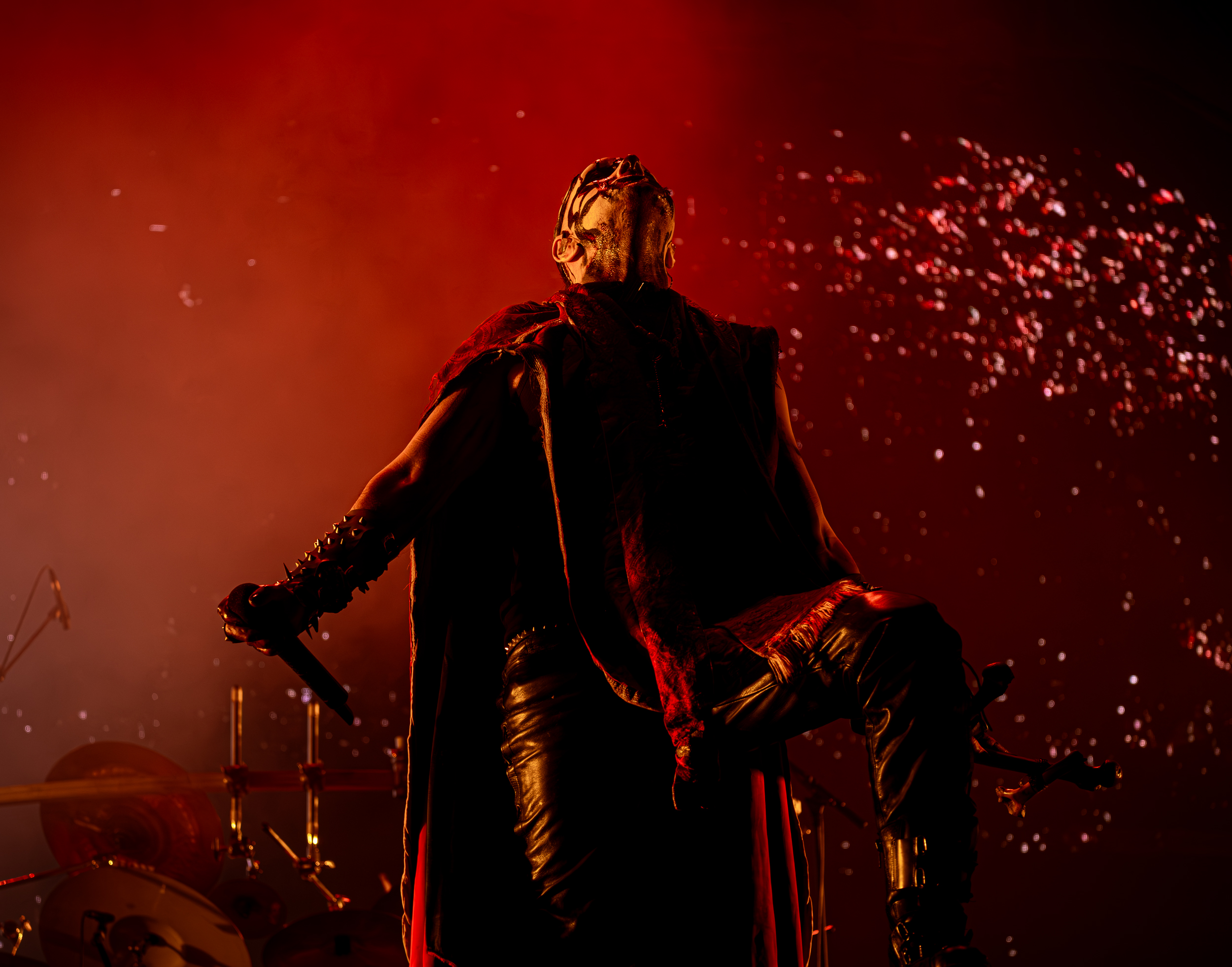 Peu importe la météo menaçante ou la relative faiblesse de mon état de santé du jour, manquer le concert anniversaire de Behemoth était pour moi impossible à envisager. Après tout, ce n’est pas tous les jours que l’on célèbre ses 33 ans et d’avoir officiellement dépassé le Christ ! Pour fêter cet anniversaire dignement, le groupe polonais a concocté une setlist aux petits oignons, constituée de ses plus grands classiques, en y incluant pour l’occasion un morceau datant de ses débuts en 1991, Cursed Angel of Doom. Ce petit retour dans le passé offre l’occasion aux plus jeunes de le découvrir, aux fans de plus longue date de l’apprécier d’une nouvelle manière ; dans tous les cas, un petit coup de jeune à ce morceau old-school et une preuve du soin du détail qu’apporte Behemoth à ses prestations. Entre les multiples hommages au passé plus ou moins lointain, deux extraits d’Opvs Contra Natvram, le dernier album sorti en 2022, The Deathless Sun et Once Upon a Pale Horse, se font une petite place dans la setlist, encore trop jeunes pour ne pas rester dans l’ombre des autres. En tout cas, mon amour de longue date pour le groupe ne me fait pas défaut, mu par l’excellence des musiciens et leur sens du spectacle, et qui m’invite à relativiser mon regret de ne pas avoir pu obtenir l’accès au pit photo. C’est donc depuis le relatif confort du premier rang que j’assiste aux grands moments du set, tels Seth et Orion prenant littéralement le public de haut depuis les plateformes, les musiciens crachant du (faux) sang et bien sûr les multiples changements de costume de Nergal — celui qu’il porte sur Bartzabel remportant ma préférence —, le tout mis en lumière par un soleil déclinant du plus bel effet. Point noir cependant que la fumée qui envahit régulièrement la scène ; à ce niveau, j’exprime toute ma compassion à mes confrères et consœurs photographes l’ayant subie dans le pit ! Comme à chaque concert de Behemoth depuis 2014 et la sortie de The Satanist, le spectacle atteint son paroxysme avec le finale O Father O Satan O Sun, des costumes et masques à la séquence narrative de fin, qui donne à ce show anniversaire une conclusion digne de ce nom. [Ségolène]