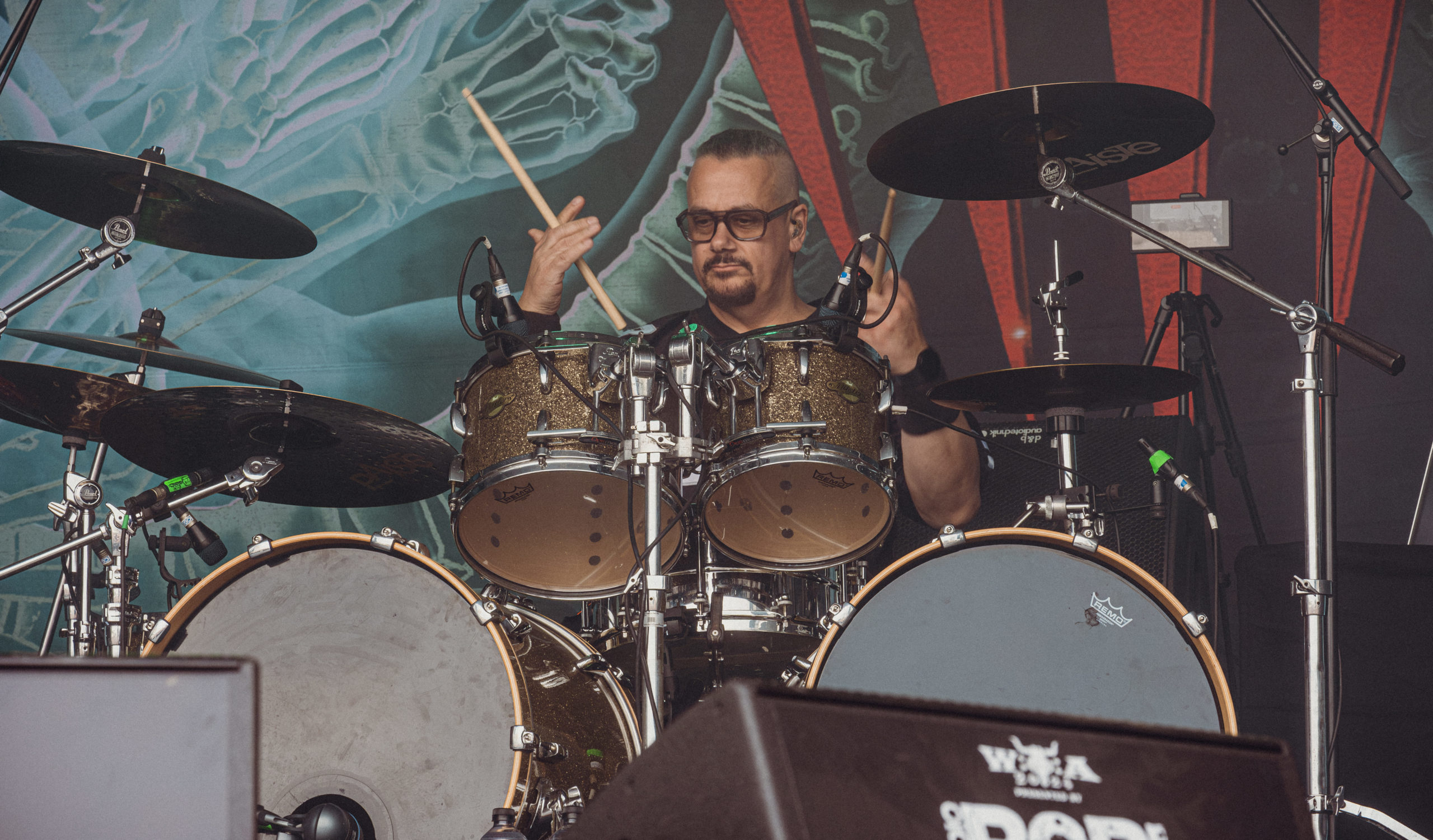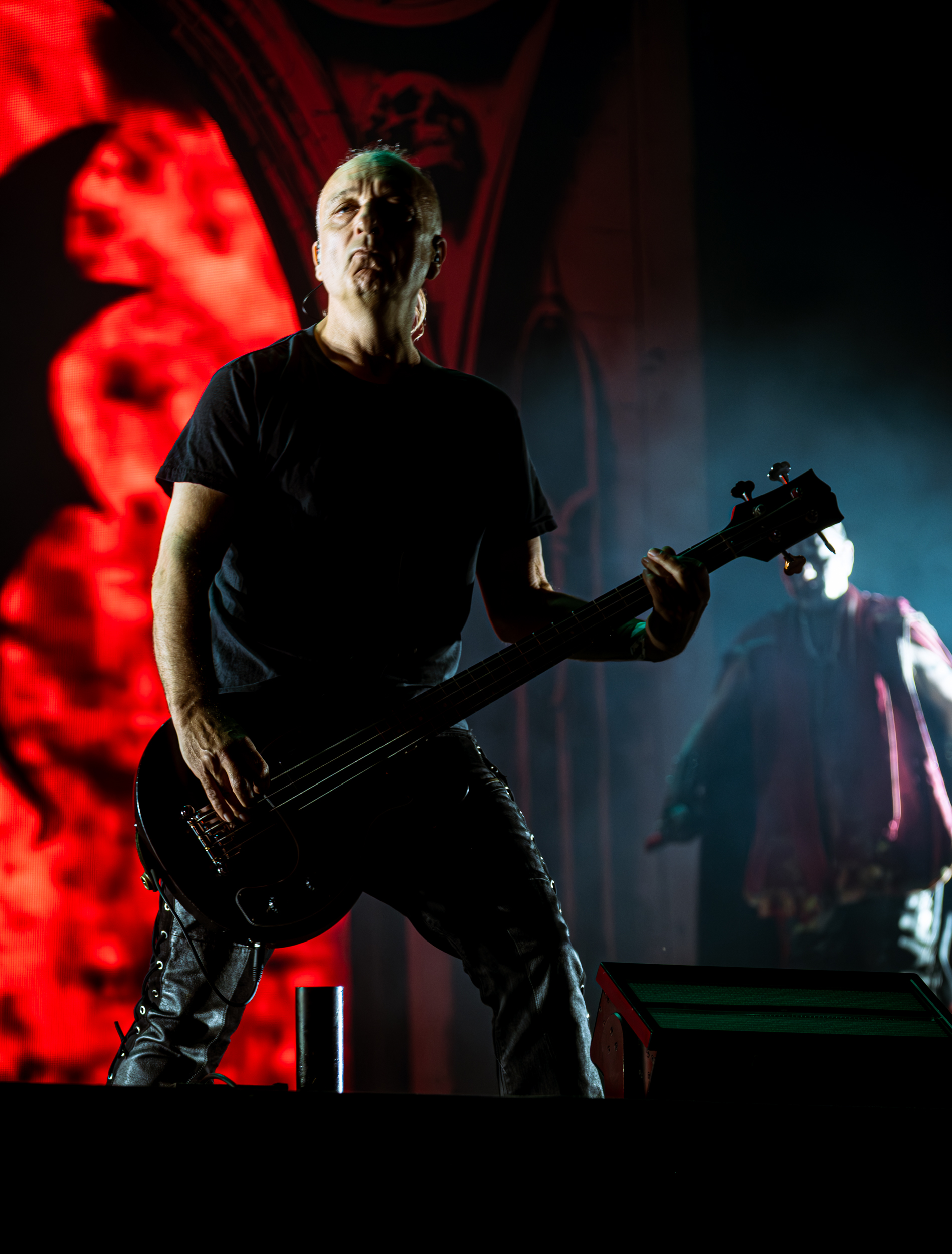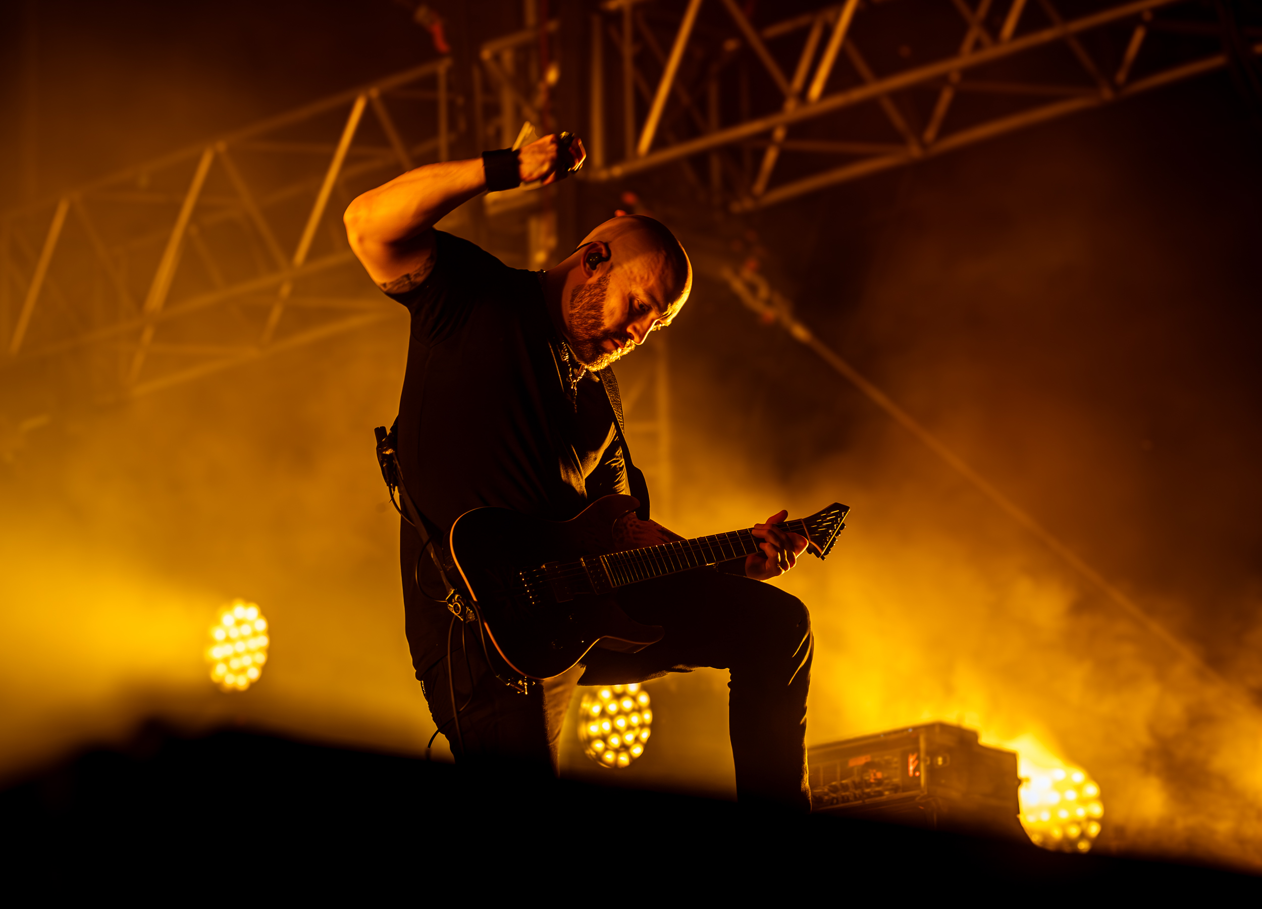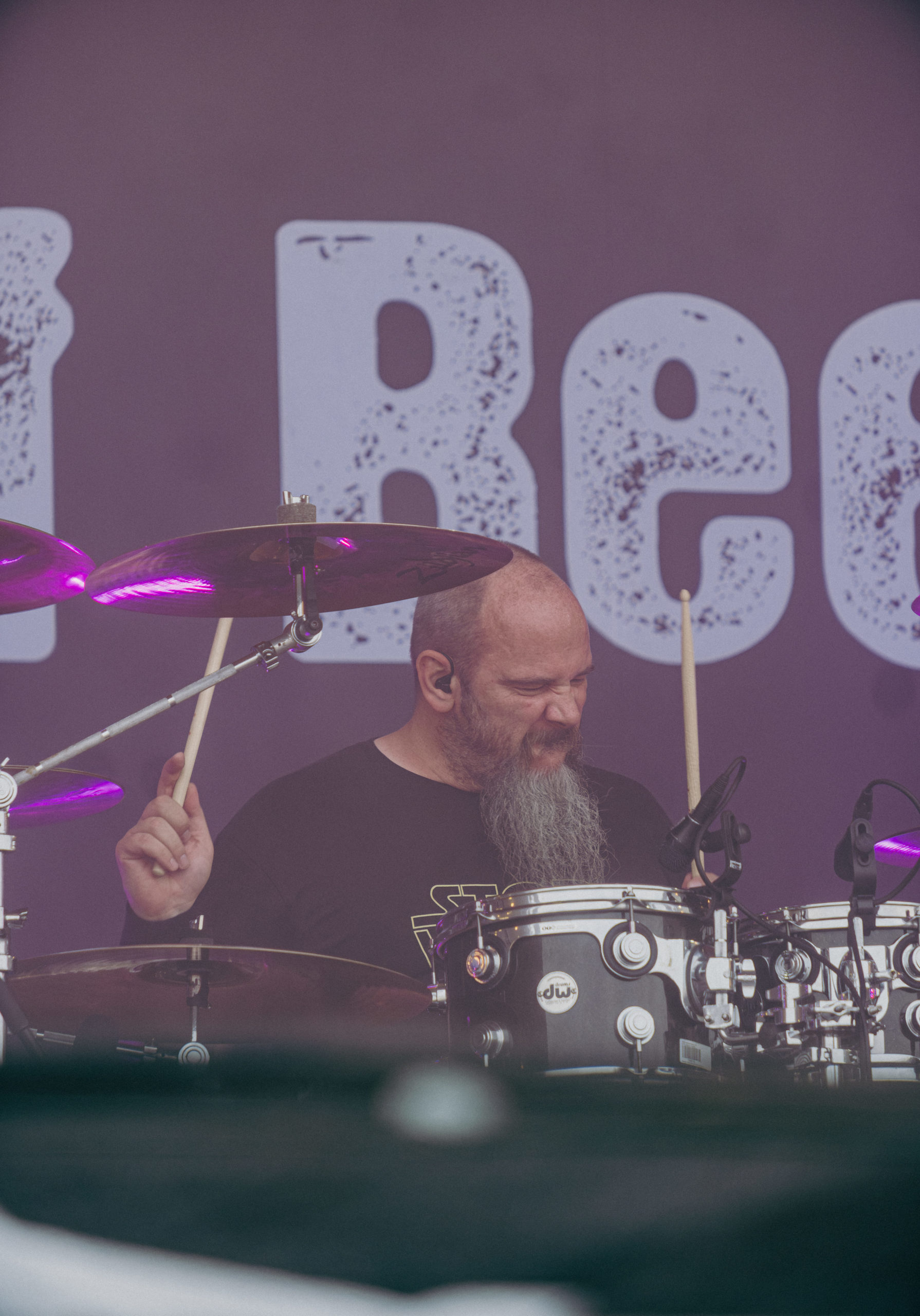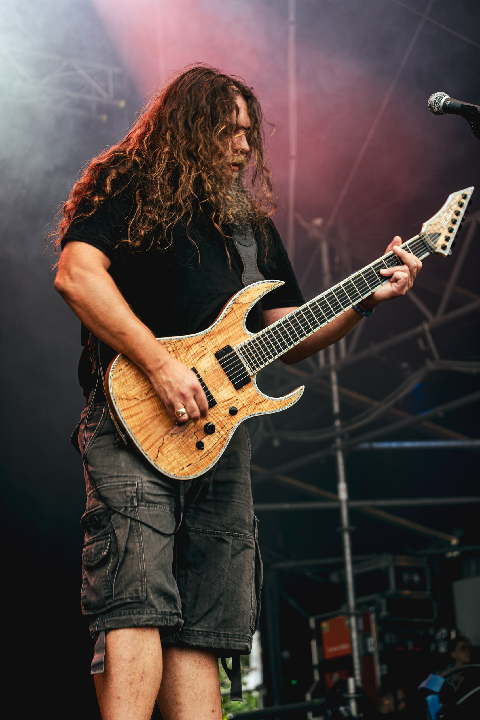 Peu importe la météo menaçante ou la relative faiblesse de mon état de santé du jour, manquer le concert anniversaire de Behemoth était pour moi impossible à envisager. Après tout, ce n’est pas tous les jours que l’on célèbre ses 33 ans et d’avoir officiellement dépassé le Christ ! Pour fêter cet anniversaire dignement, le groupe polonais a concocté une setlist aux petits oignons, constituée de ses plus grands classiques, en y incluant pour l’occasion un morceau datant de ses débuts en 1991, Cursed Angel of Doom. Ce petit retour dans le passé offre l’occasion aux plus jeunes de le découvrir, aux fans de plus longue date de l’apprécier d’une nouvelle manière ; dans tous les cas, un petit coup de jeune à ce morceau old-school et une preuve du soin du détail qu’apporte Behemoth à ses prestations. Entre les multiples hommages au passé plus ou moins lointain, deux extraits d’Opvs Contra Natvram, le dernier album sorti en 2022, The Deathless Sun et Once Upon a Pale Horse, se font une petite place dans la setlist, encore trop jeunes pour ne pas rester dans l’ombre des autres. En tout cas, mon amour de longue date pour le groupe ne me fait pas défaut, mu par l’excellence des musiciens et leur sens du spectacle, et qui m’invite à relativiser mon regret de ne pas avoir pu obtenir l’accès au pit photo. C’est donc depuis le relatif confort du premier rang que j’assiste aux grands moments du set, tels Seth et Orion prenant littéralement le public de haut depuis les plateformes, les musiciens crachant du (faux) sang et bien sûr les multiples changements de costume de Nergal — celui qu’il porte sur Bartzabel remportant ma préférence —, le tout mis en lumière par un soleil déclinant du plus bel effet. Point noir cependant que la fumée qui envahit régulièrement la scène ; à ce niveau, j’exprime toute ma compassion à mes confrères et consœurs photographes l’ayant subie dans le pit ! Comme à chaque concert de Behemoth depuis 2014 et la sortie de The Satanist, le spectacle atteint son paroxysme avec le finale O Father O Satan O Sun, des costumes et masques à la séquence narrative de fin, qui donne à ce show anniversaire une conclusion digne de ce nom. [Ségolène]