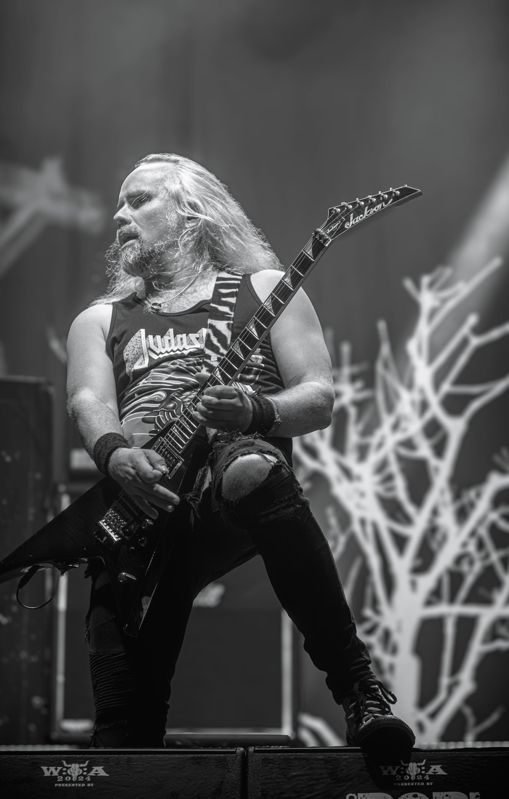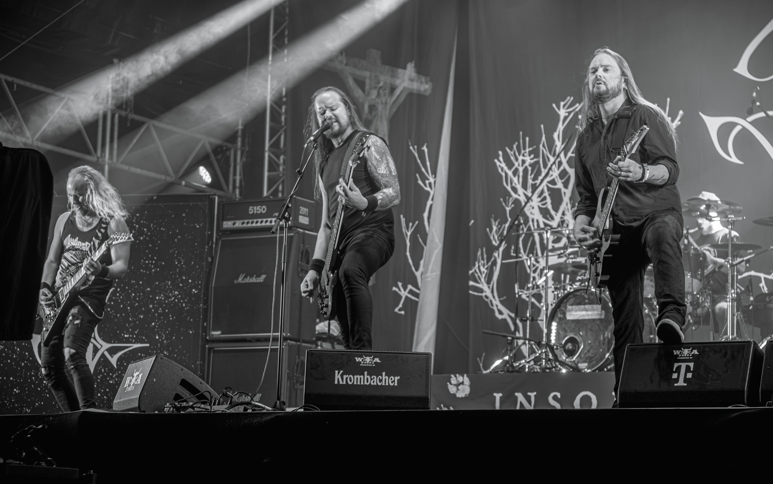 Le set de Mayhem est au moins aussi captivant à photographier qu’à suivre ; je le quitte toutefois vingt minutes avant sa fin, souhaitant clore mon expérience au Wacken 2024 sur une note plus calme avec Insomnium sur la W:E:T Stage. Quoi de tel, en effet, qu’une dose de death metal mélodique chargé en onirisme et en mélancolie comme la Finlande sait en produire, de la part de la première référence du genre en son pays, pour s’apaiser l’esprit avant le sommeil ? C’est ainsi qu’après avoir mis à profit ce qui constituera mon dernier passage dans un pit photo de cette édition, je prends place dans le public à l’écart du centre pour profiter pleinement du spectacle. Sur cette scène à l’écart des main stages et de surface bien moindre, l’atmosphère ressort d’autant plus intimiste, sentiment renforcé par la sympathie du frontman Niilo Sevänen qui s’adresse au public dans un allemand basique. Fort d’un très beau dernier album sorti début 2023, intitulé Anno 1696, Insomnium accorde à ses extraits une bonne place dans la setlist ; à commencer par le morceau éponyme qui fait office d’ouverture. Le tempo est dans son ensemble assez lent et l’accent mis sur l’ambiance avant tout ; cependant le show est bien loin de manquer de rythme et se permet même quelques passages « mosh pit » qui s’observent par moments dans la fosse. En cela, les musiciens aident bien, qui investissent les morceaux et l’émotion corps et âme. Parmi eux, Markus Vanhala, le fondateur aux cheveux d’argent, se fait remarquer le premier, expressif dans son jeu de guitare autant que dans son faciès. Cerise sur le gâteau : le chant clair de Tomy Laisto, remplaçant live de Ville Friman, est sublime, et le son calibré de la meilleure façon pour le mettre en valeur, ainsi que la guitare lead ; carton rouge toutefois pour la batterie, un peu trop puissante. Passé outre ce détail, il fait bon observer les spectateurs se laisser embarquer, fermant les yeux, s’étreignant pour certains, quitte à se laisser embarquer à son tour… Enfin, après une heure de set passée aux côtés d’Insomnium, c’est sur les classiques While We Sleep et Heart Like a Grave que s’achève mon expérience au Wacken Open Air 2024. Je rentrerai en France deux jours plus tard des souvenirs plein la tête et la carte SD, en première ligne celui d’une aventure magnifique qui a compté son lot de valeurs sûres et surtout d’excellentes découvertes. À (re)vivre tant que cela est possible…[Ségolène]