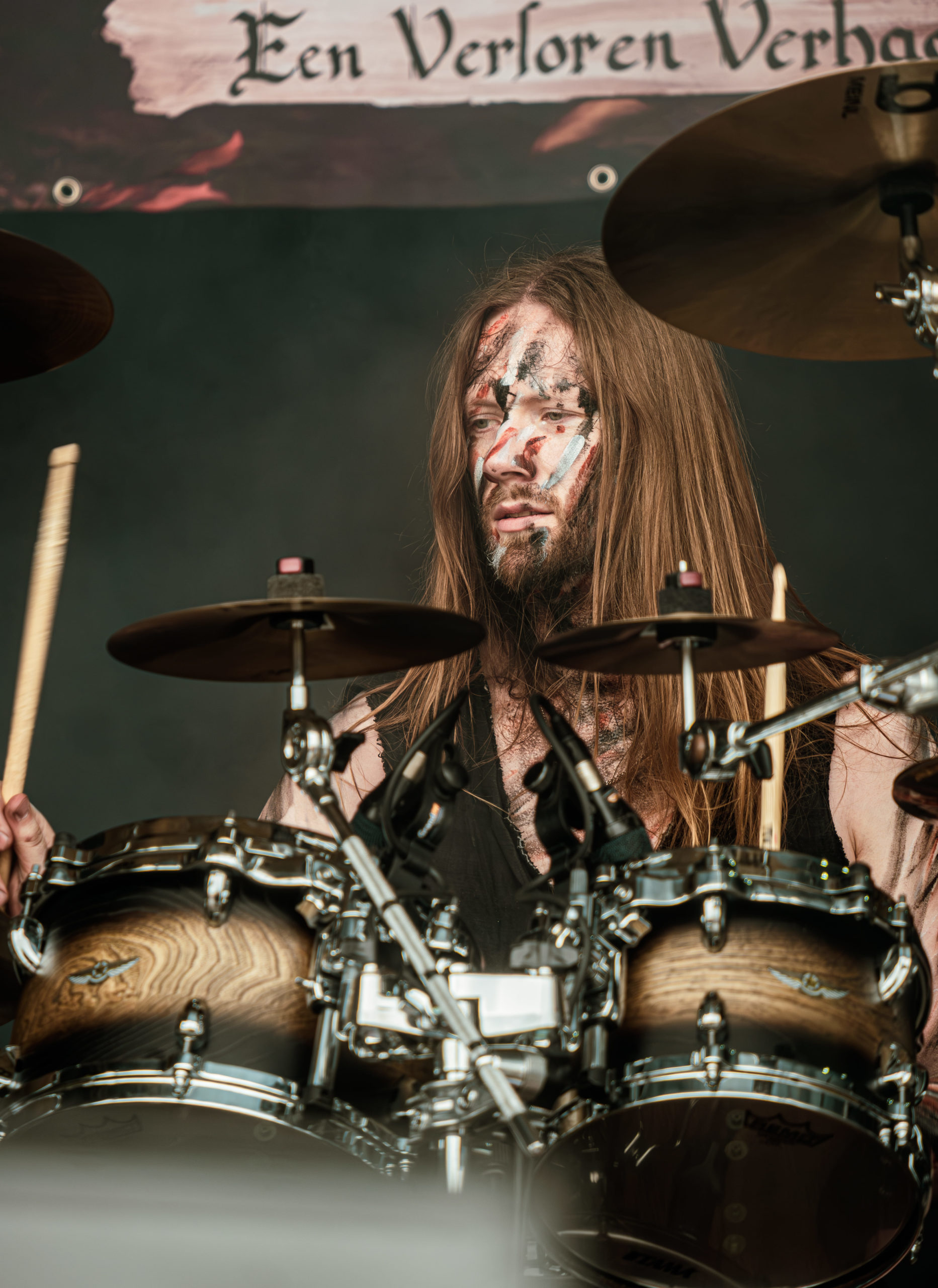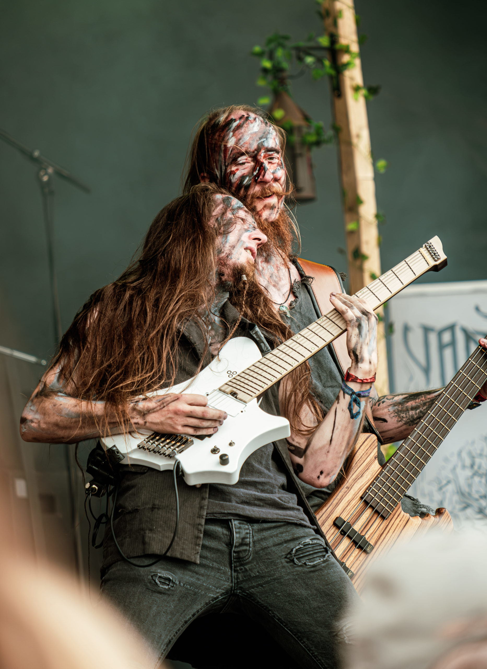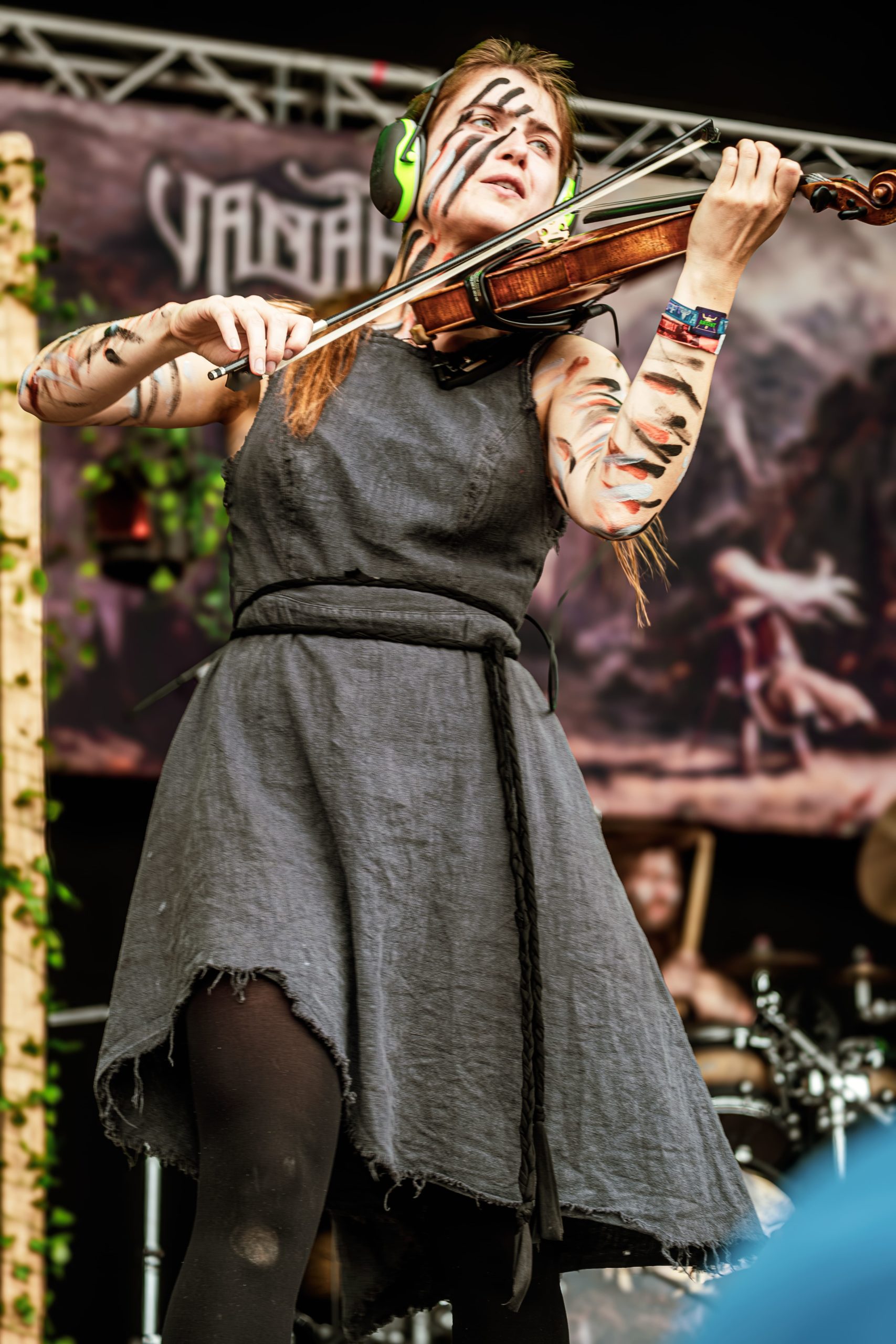 Pour qui n’a pas encore eu sa dose de folk metal épique, Vanaheim débarque sur les planches de la Wackinger Stage pour y remédier. À mon arrivée dans le pit photo, j’aperçois les musiciens effectuant leurs dernières balances sur la scène ; le genre de petite joie qui se fait rare en grand festival, moins cependant sur des scènes de gabarit moindre comme celle-ci. Petite joie devient toutefois grande au fil de ma découverte du set ! Le groupe joue des morceaux épiques au sens premier du terme, autrement dit longs et chargés en atmosphères cinématiques, mais aussi rapides et dansants, et surtout captivants. Hormis sa musique, il est un autre aspect dans lequel Vanaheim excelle, c’est sa communication avec le public : les sourires des musiciens sont contagieux et Zino van Leerdam encourage les spectateurs à taper dans les mains et sauter en rythme. Histoire de jouer jusqu’au bout son rôle de conteur, il sort un livre « rempli de mythes » selon ses dires pour nous raconter des histoires « pour dormir », d’une voix sonnant black la plupart du temps, avec quelques incursions en chant clair et même en chant de gorge — pas vraiment le genre qui aide à s’endormir ! De toute manière, il paraît inenvisageable de piquer du nez face à l’énergie qui se dégage de ce groupe au sein duquel se croisent les générations : les trois membres fondateurs Zino van Leerdam, Bram Trommelen et Mike Seidel apportent leur expérience, les deux derniers arrivés, le guitariste Michael van Eck et la violoniste Rikke Linssen, la fraîcheur de leur jeunesse, lui, souriant de toutes ses dents comme un enfant heureux, elle, pieds nus pour mieux danser et à l’adorable regard pétillant. Tout bonnement une réussite complète pour Vanaheim, qui possède tous les atouts pour cela. [Ségolène]