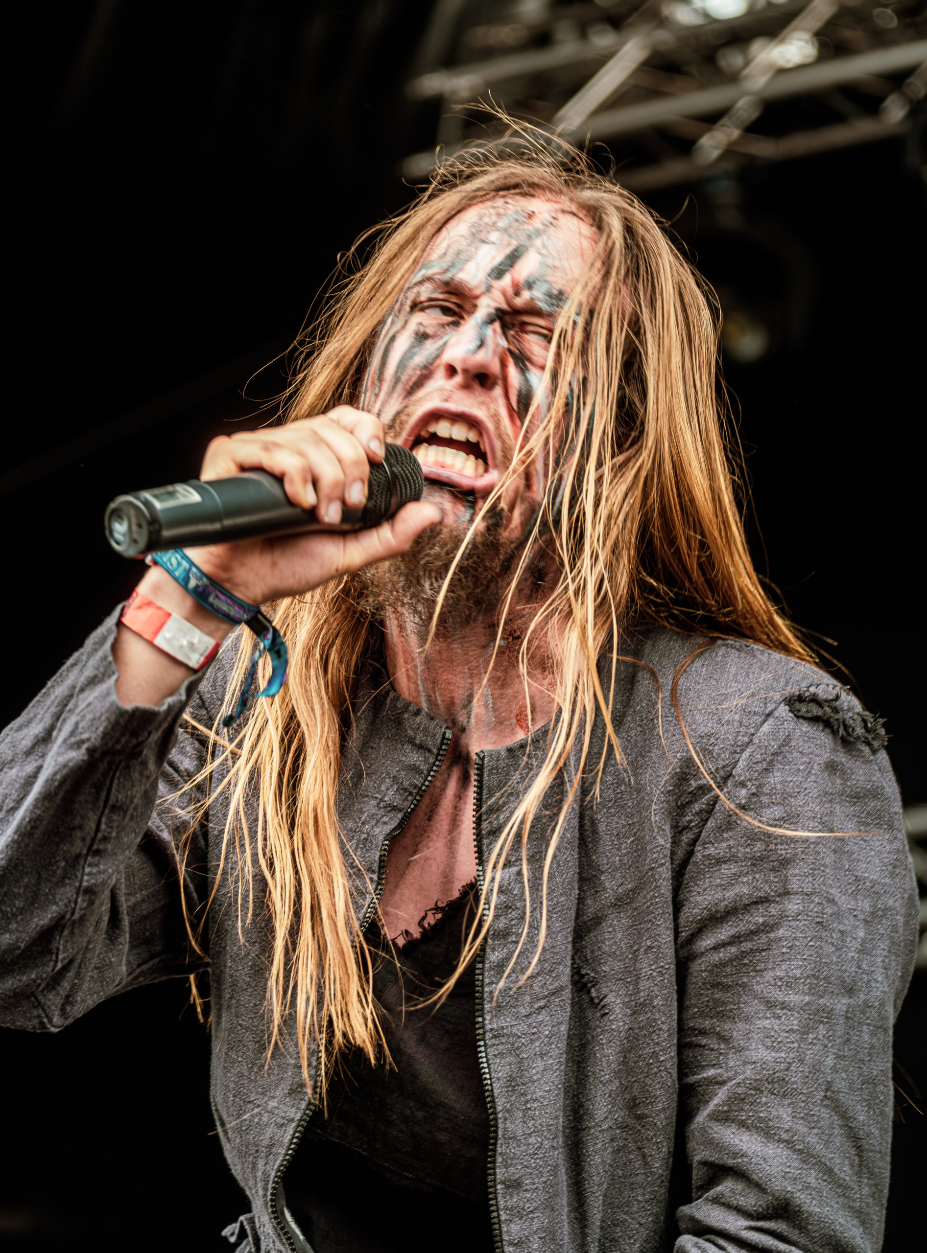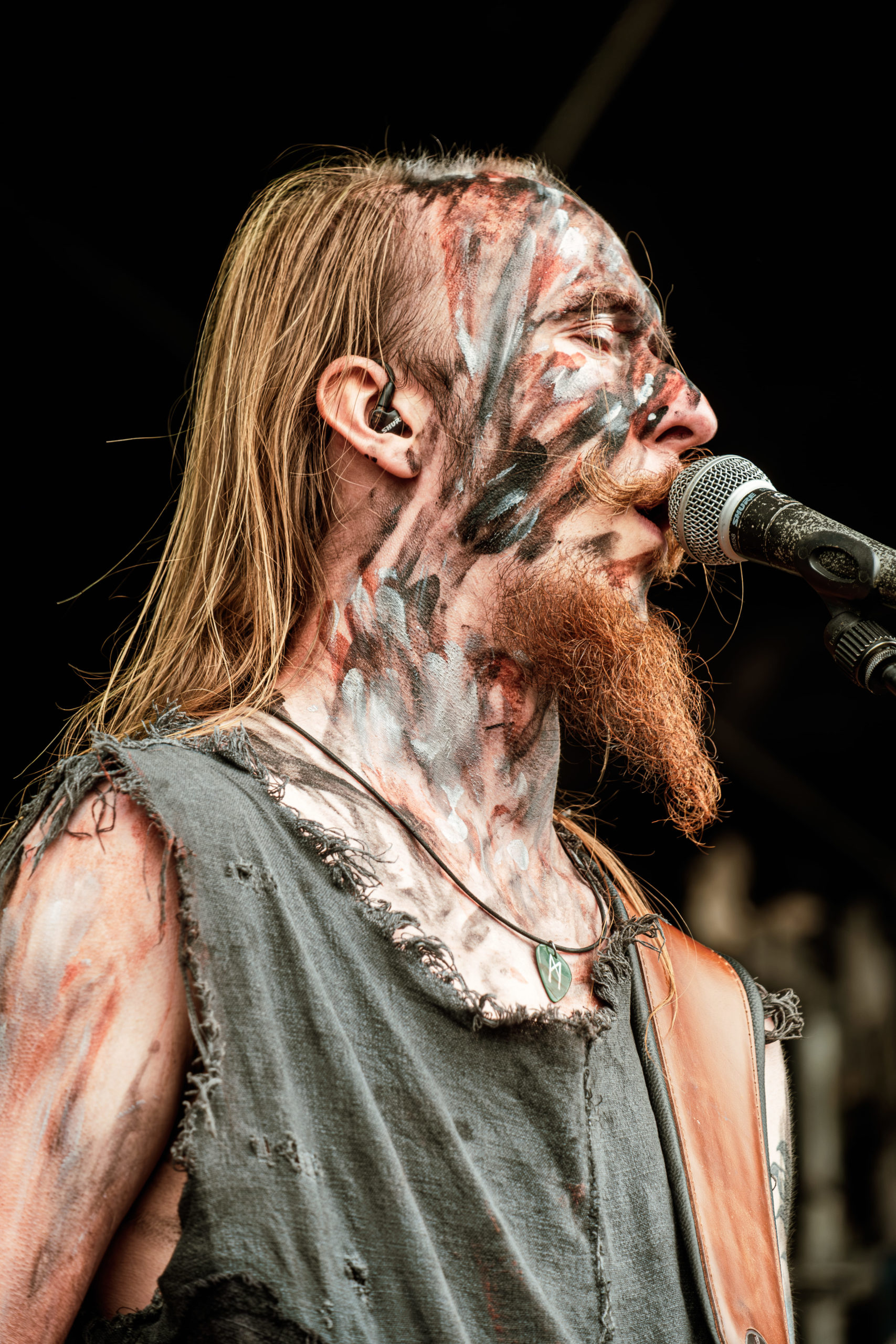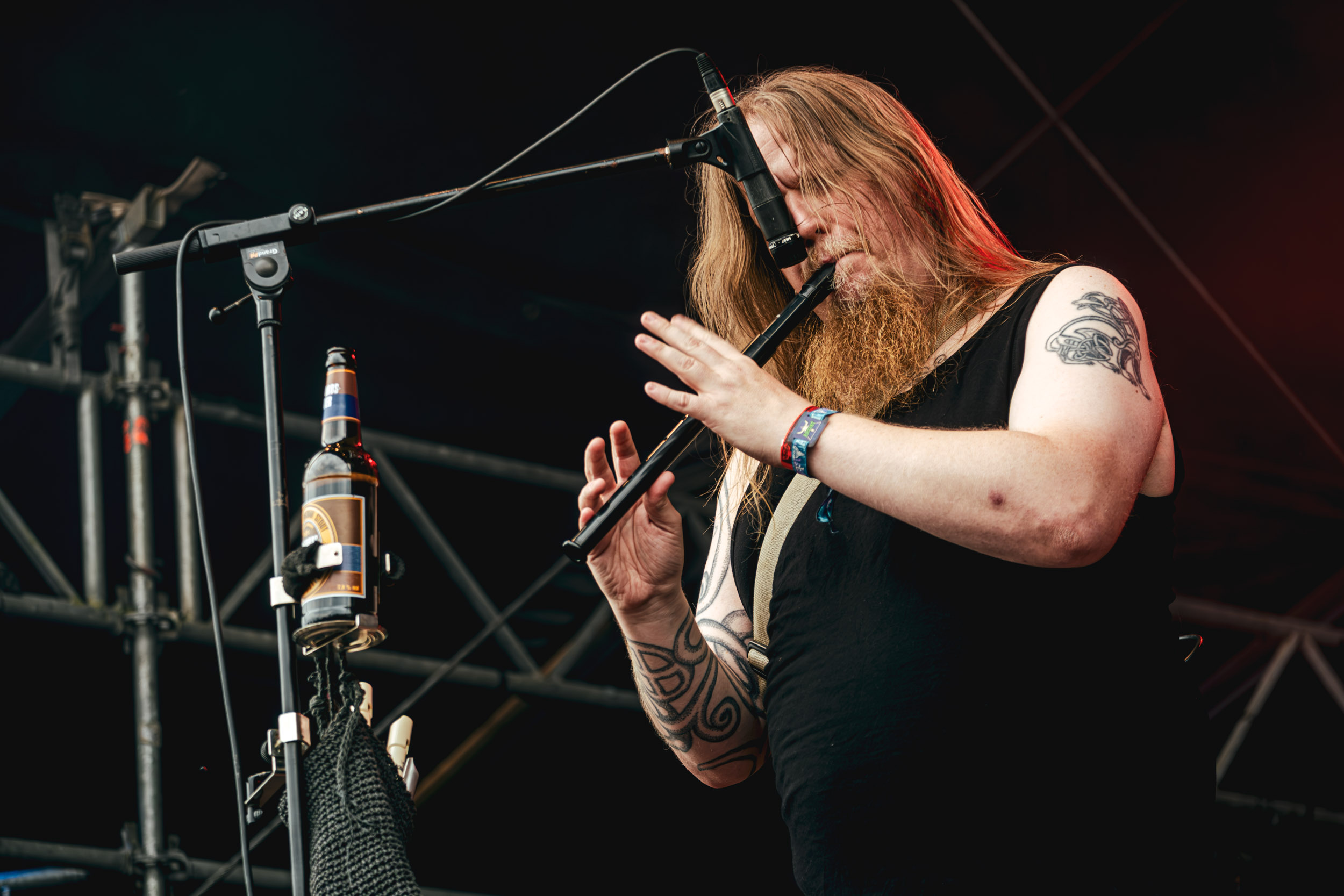 En bonne folkhead n’ayant jamais sa dose d’instruments traditionnels, c’est tout naturellement que je jette une nouvelle fois mon dévolu sur la Wackinger Stage et Svartsot. Le groupe, dont je crois deviner qu’il possède un statut culte dans son Danemark d’origine, pratique un style mêlant death metal mélodique et folk qui trouve son atout dans l’équilibre et la diversité de son rythme : les morceaux sont tantôt mid-tempo, tantôt plus rapides et dansants, sans frôler le moindre excès. Le tout revêt une apparence plus terre-à-terre et moins festive que les groupes de folk metal ayant précédé sur cette scène. La prestation trouve tout de même son grain de folie dans l’attitude du frontman Thor Bager, qui n’hésite jamais à en faire des tonnes, commençant le set en brandissant un livre sur les barrières du pit photo et adoptant des expressions loufoques. En matière de diversité, pour apporter cette touche, Svartsot peut compter sur la polyvalence et l’habileté de son instrumentiste folk Hans-Jørgen Martinus Hansen, qui passe de la flûte à la cornemuse et autres instruments ainsi qu’au micro chœur avec une facilité déconcertante en plein morceau ! Autre chose qui semble une banalité pour lui, c’est puiser au goulot d’une bouteille disposée sur le pied de micro… un peu trop souvent à ma perception, tant et si bien que je m’en retrouve mal à l’aise et que cela finit par me sortir de la prestation. Dommage, cela partait pourtant bien… [Ségolène]
