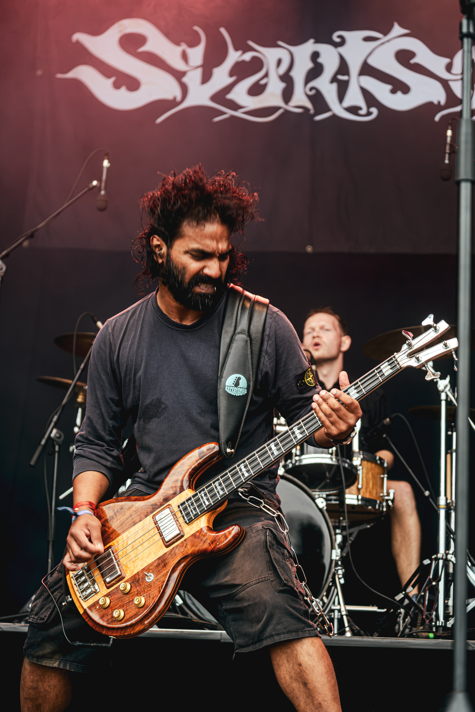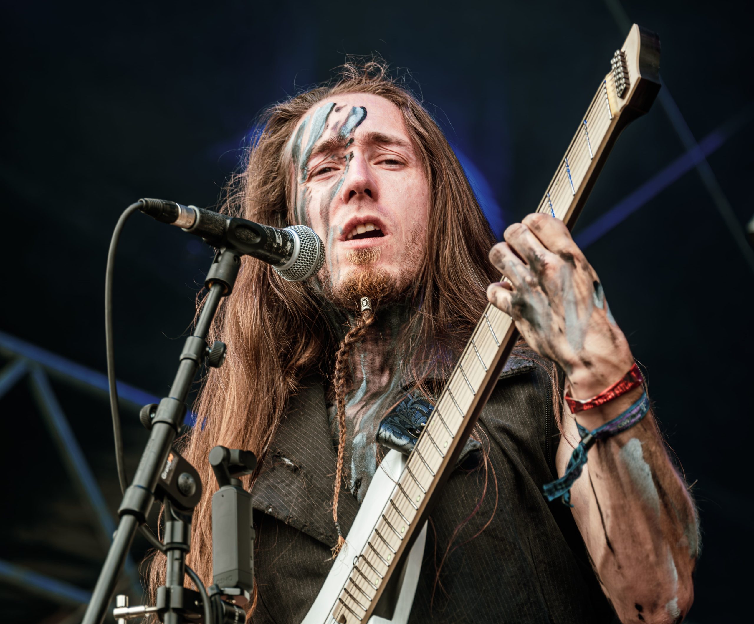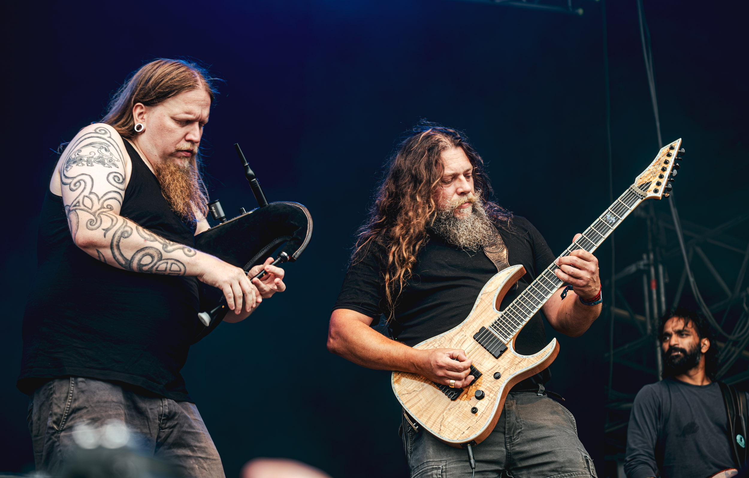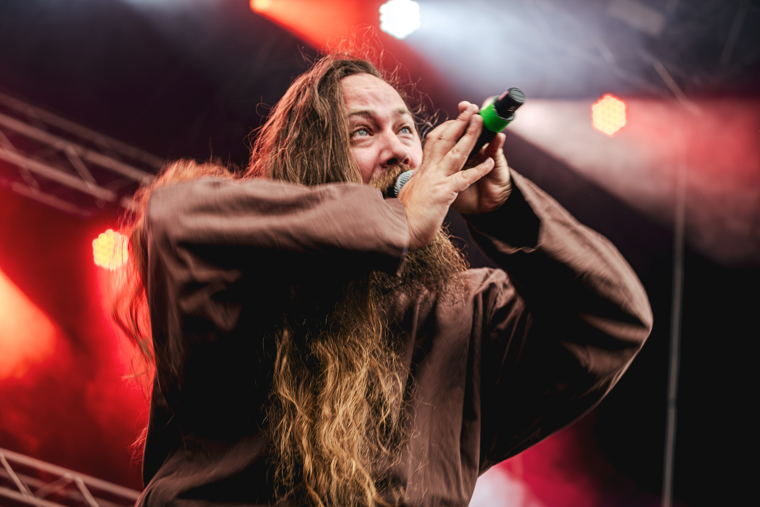 En bonne folkhead n’ayant jamais sa dose d’instruments traditionnels, c’est tout naturellement que je jette une nouvelle fois mon dévolu sur la Wackinger Stage et Svartsot. Le groupe, dont je crois deviner qu’il possède un statut culte dans son Danemark d’origine, pratique un style mêlant death metal mélodique et folk qui trouve son atout dans l’équilibre et la diversité de son rythme : les morceaux sont tantôt mid-tempo, tantôt plus rapides et dansants, sans frôler le moindre excès. Le tout revêt une apparence plus terre-à-terre et moins festive que les groupes de folk metal ayant précédé sur cette scène. La prestation trouve tout de même son grain de folie dans l’attitude du frontman Thor Bager, qui n’hésite jamais à en faire des tonnes, commençant le set en brandissant un livre sur les barrières du pit photo et adoptant des expressions loufoques. En matière de diversité, pour apporter cette touche, Svartsot peut compter sur la polyvalence et l’habileté de son instrumentiste folk Hans-Jørgen Martinus Hansen, qui passe de la flûte à la cornemuse et autres instruments ainsi qu’au micro chœur avec une facilité déconcertante en plein morceau ! Autre chose qui semble une banalité pour lui, c’est puiser au goulot d’une bouteille disposée sur le pied de micro… un peu trop souvent à ma perception, tant et si bien que je m’en retrouve mal à l’aise et que cela finit par me sortir de la prestation. Dommage, cela partait pourtant bien… [Ségolène]