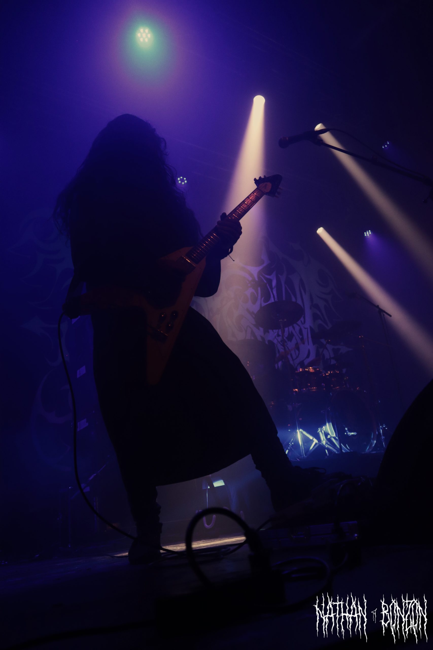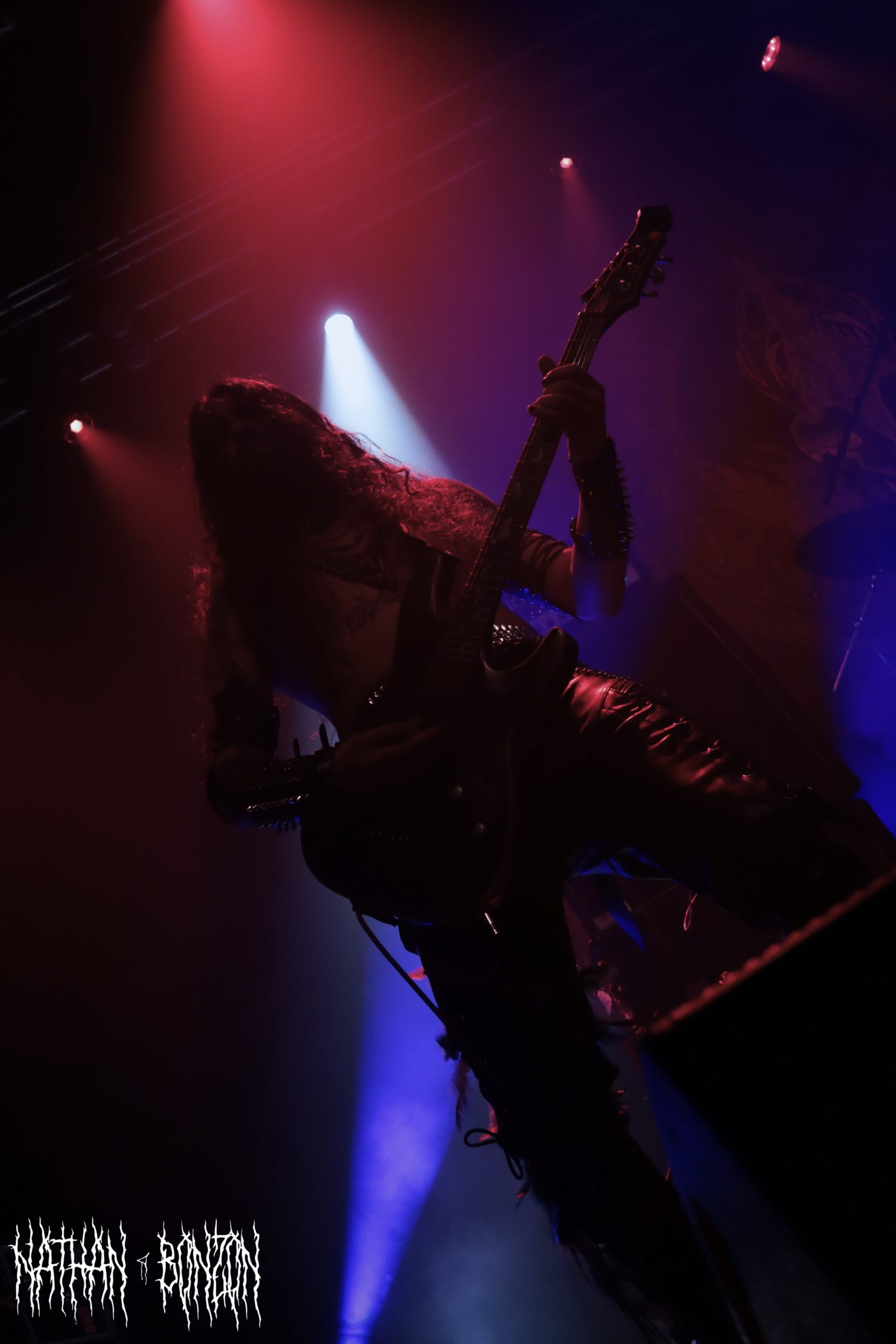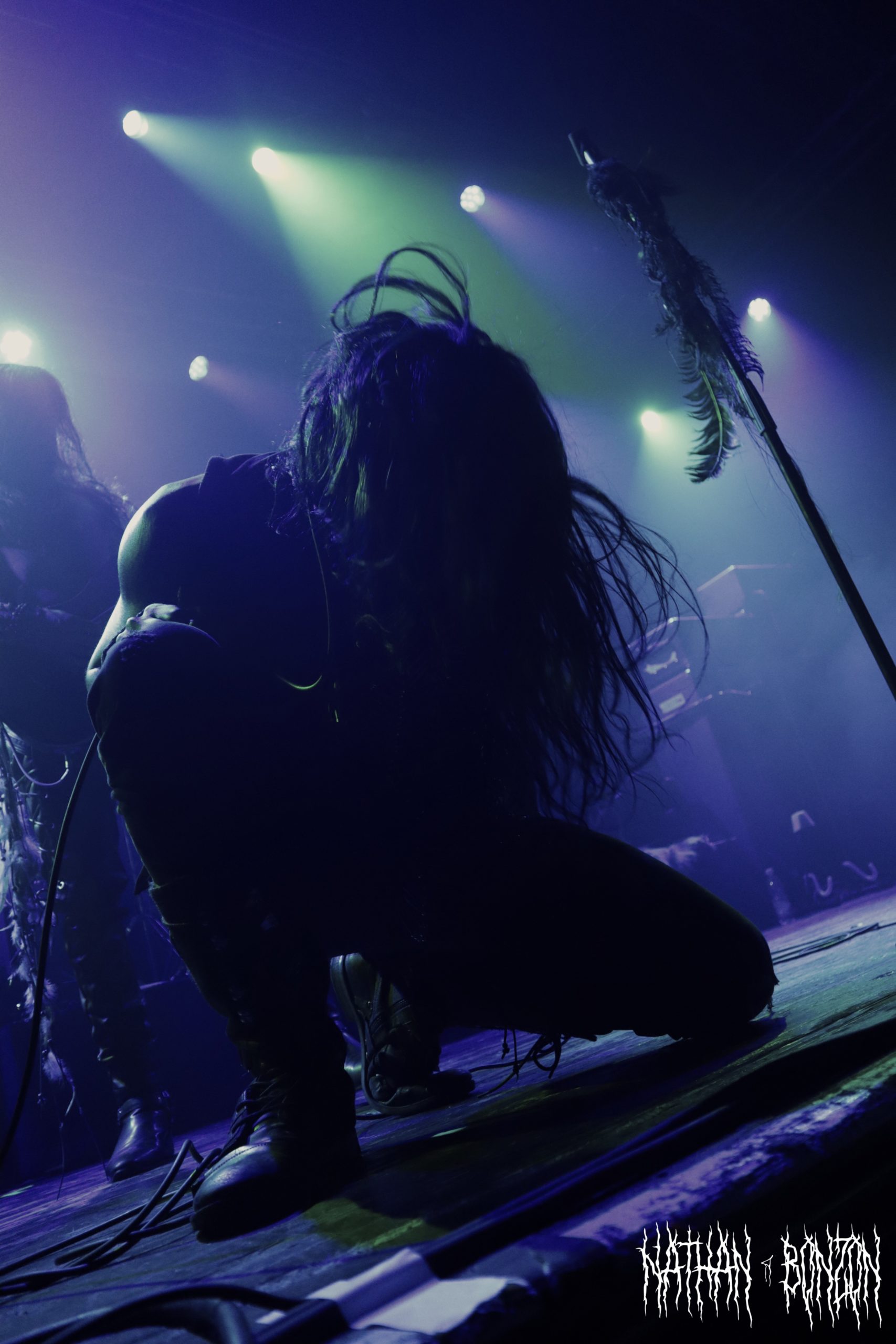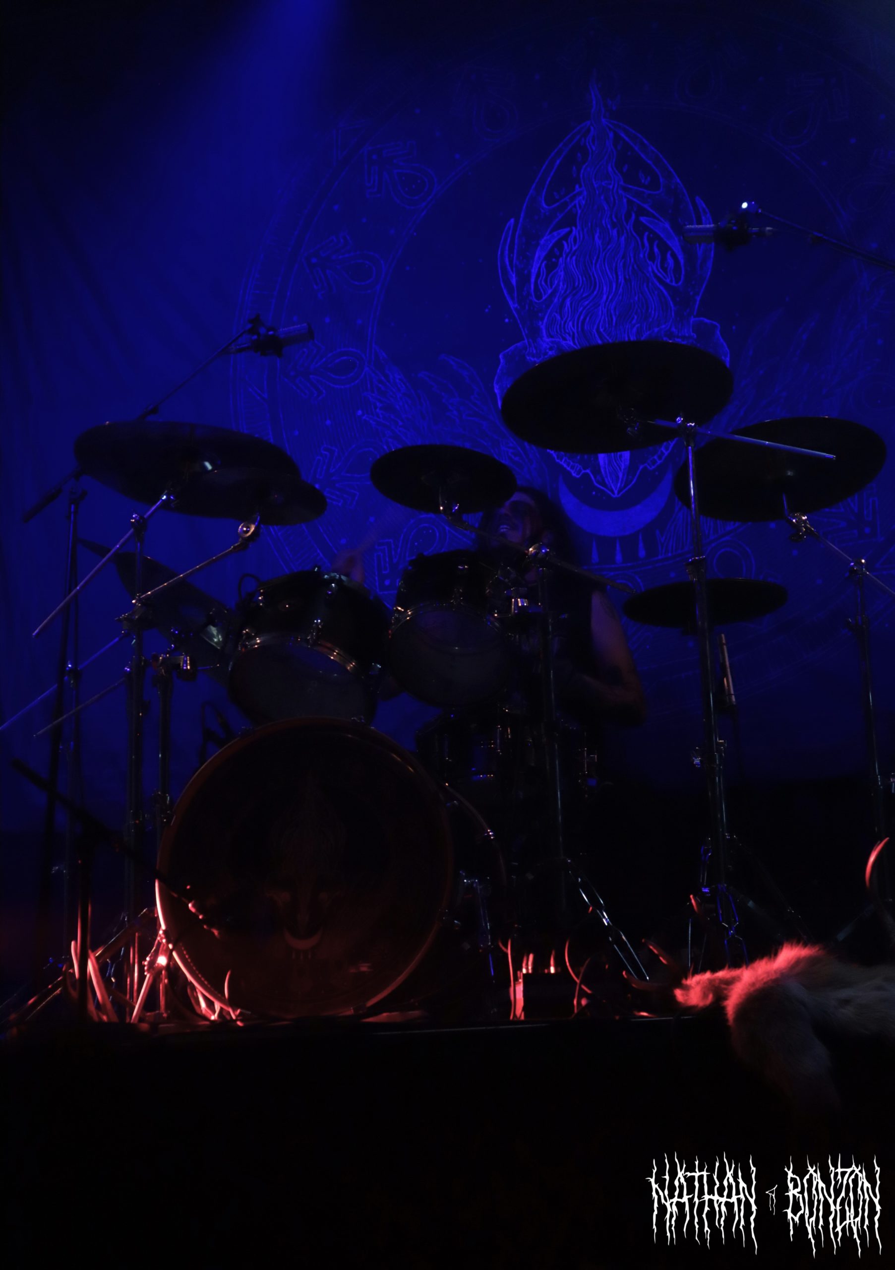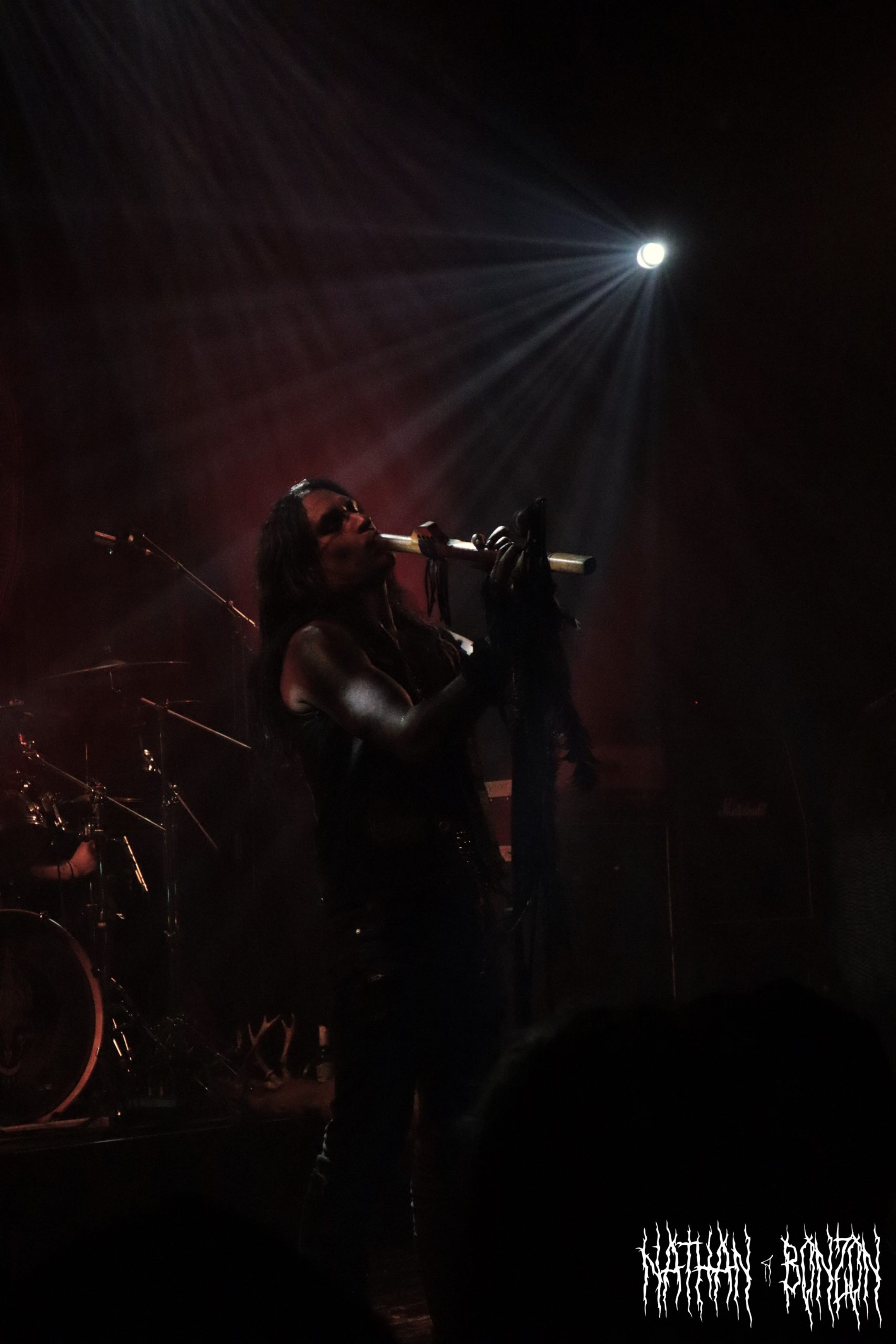 Alors que la salle se remplit de plus en plus et que l’on sent l’excitation monter, il est temps pour Blackbraid de faire son show. Avec deux albums à son compteur (Blackbraid I en 2022 et Blackbraid II en 2023), le groupe a vécu une montée en popularité stratosphérique depuis sa création. Il s’agit d’un projet solo de black mélodique/atmosphérique formé en 2022 par le multi instrumentaliste Sgah’gahsowáh (de son vrai nom Jon. S. Krieger), adoptant les thèmes et l’esthétique des civilisations amérindiennes. La scène, décorée avec des peaux et des crânes d’animaux, reflète ainsi les inspirations du groupe. On troque également le corpse paint pour les peintures de guerre des natifs américains. Le set commence avec The Spirit Returns, qui part sur les chapeaux de roues. Le public, tout comme les musiciens sur scène, est à fond, je repère déjà quelques furieux headbangers. Le morceau suivant, The Wolf That Guides the Hunters Hand, m’a tout bonnement époustouflé. Des riffs trémolo à volonté, une batterie qui blast et les cris du chanteur rendent le tout tellement énergique ! J’ai dû m’arrêter de prendre des photos pour profiter pleinement du moment. Le set continue avec d’autres titres tout aussi magnifiques, tel As The Creek Flows Softly By, un interlude instrumental (et acoustique) durant lequel Sgah’gahsowáh joue de la flûte traditionnelle amérindienne. Ce dernier passa très proche du public avec un fagot d’encens, renforçant l’atmosphère magique et rituelle du concert, ce fut captivant. Un autre moment fort de la soirée fut The River of Time Flows Through Me (mon morceau préféré), que j’ai découvert il y a un an et demi, complètement par hasard. Celui-ci m’avait vraiment marqué, ce fut donc une fabuleuse expérience de le vivre en live.
