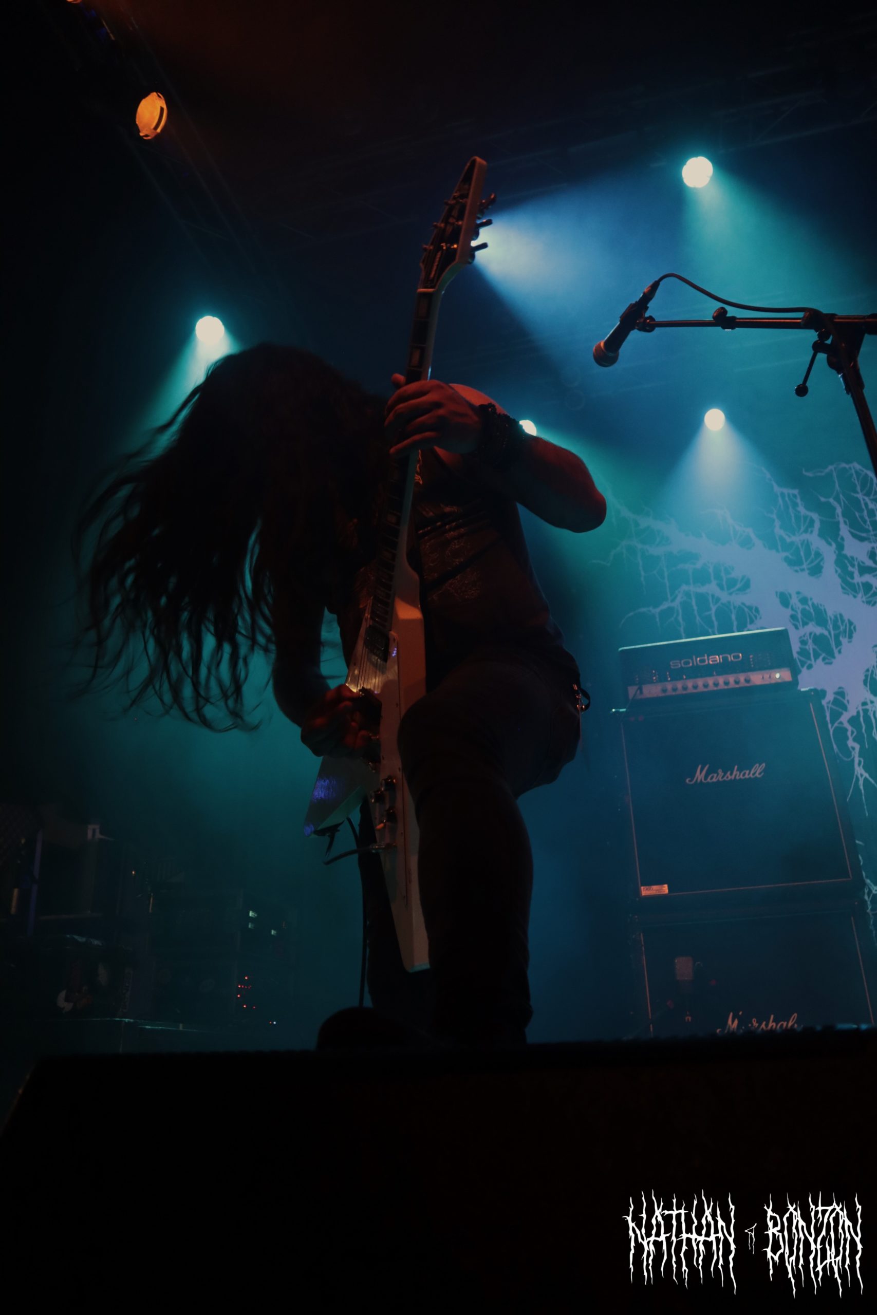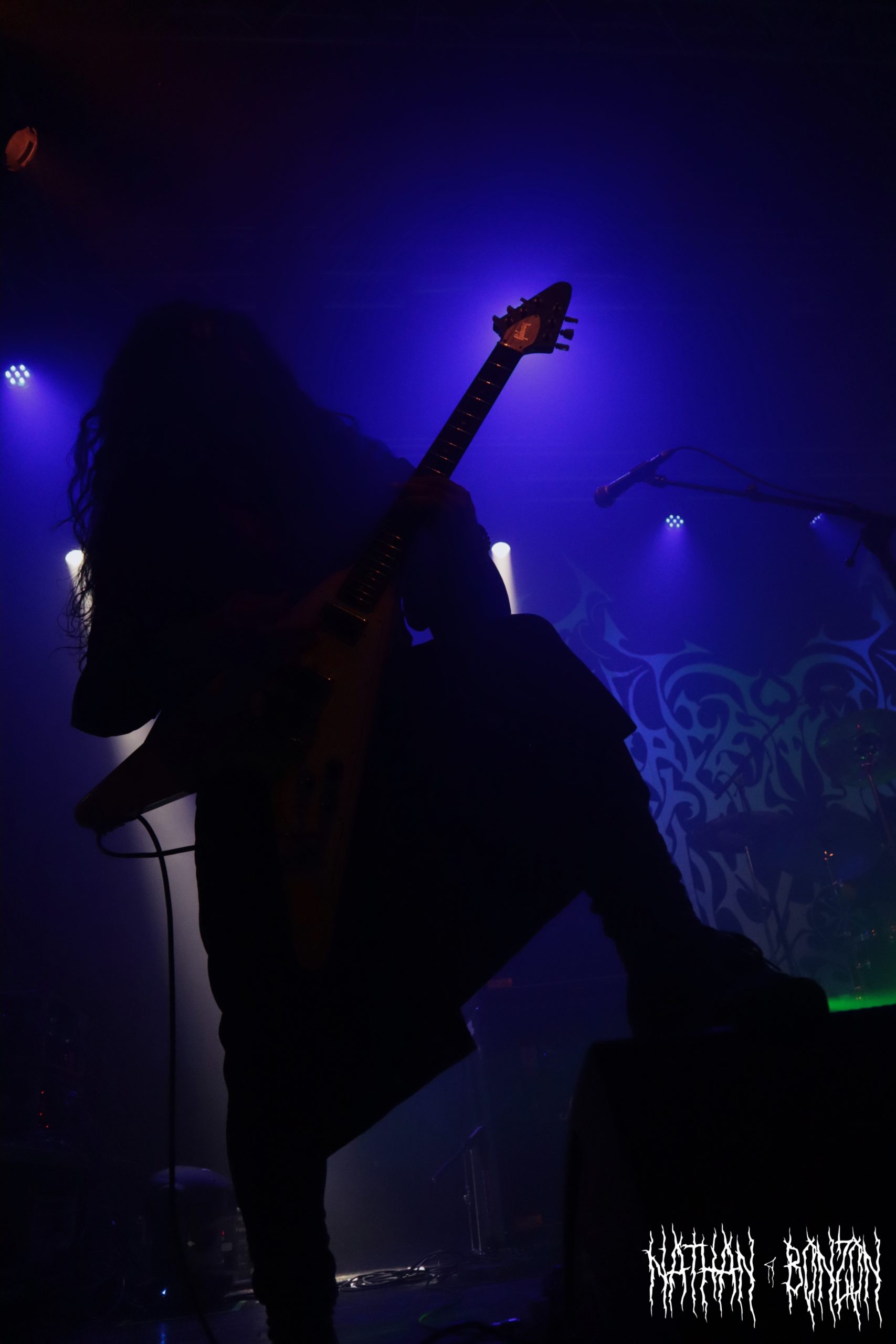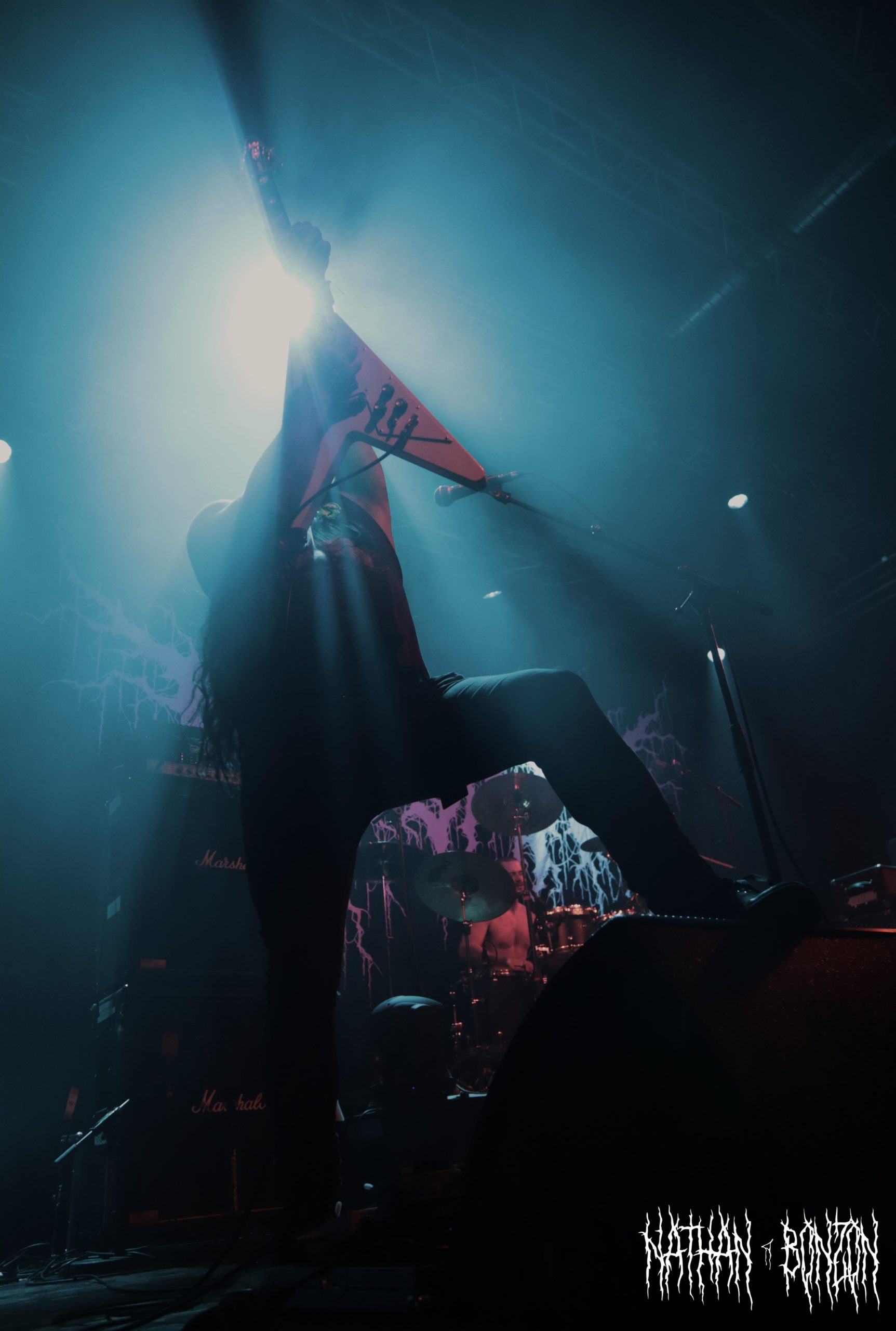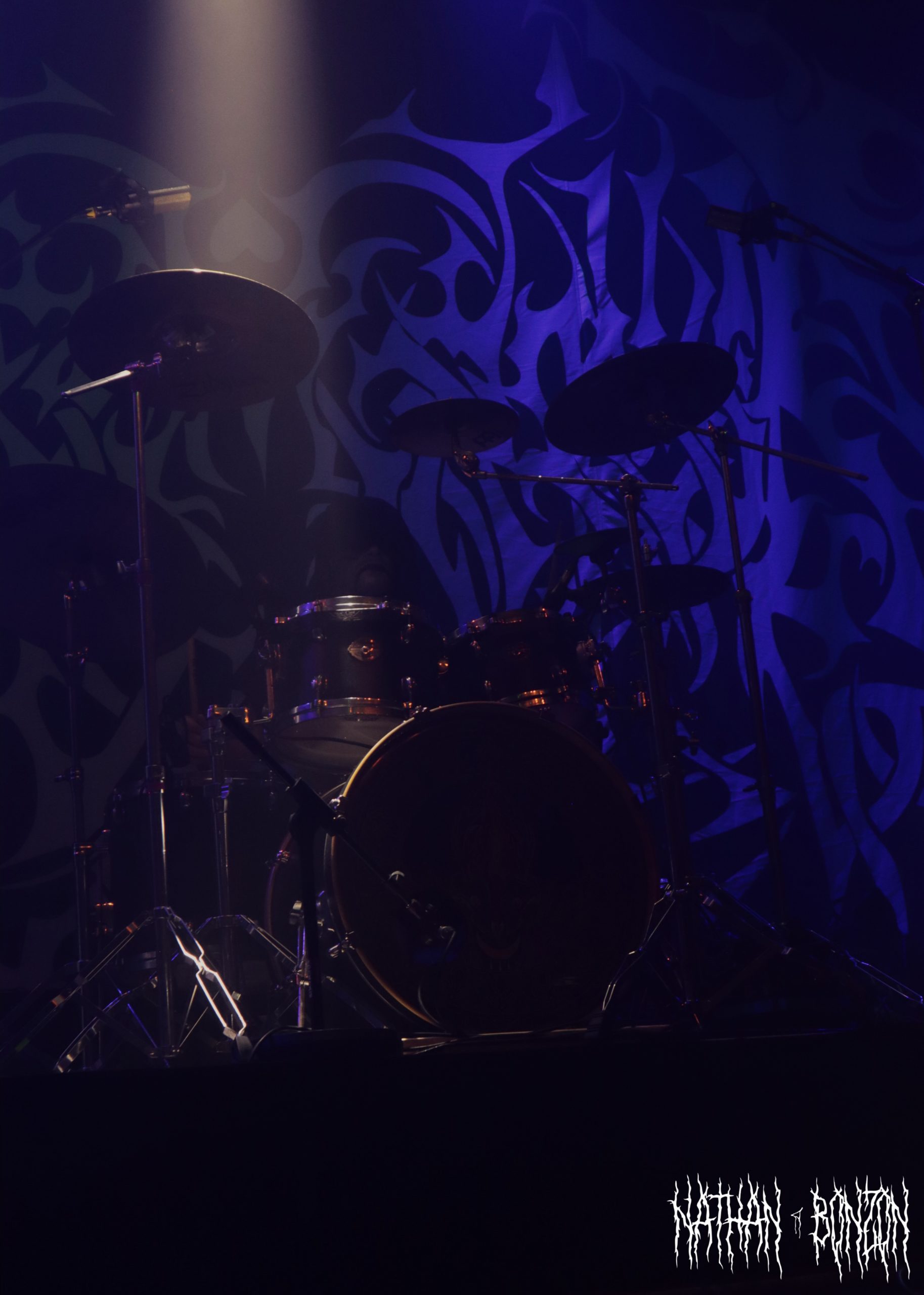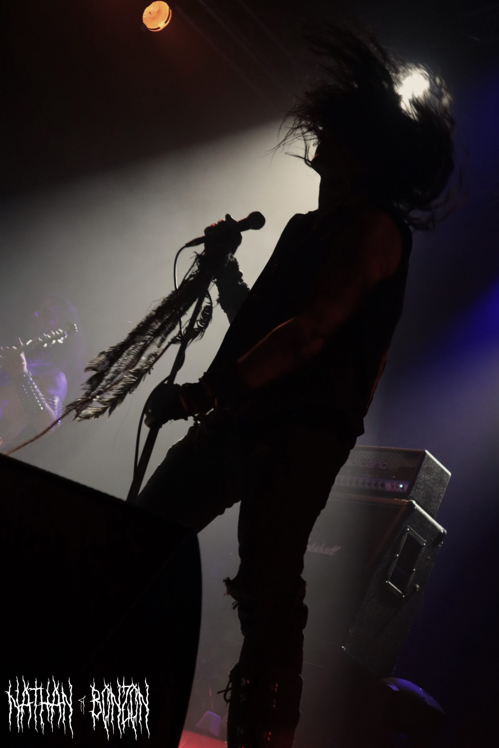 Alors que la salle se remplit de plus en plus et que l’on sent l’excitation monter, il est temps pour Blackbraid de faire son show. Avec deux albums à son compteur (Blackbraid I en 2022 et Blackbraid II en 2023), le groupe a vécu une montée en popularité stratosphérique depuis sa création. Il s’agit d’un projet solo de black mélodique/atmosphérique formé en 2022 par le multi instrumentaliste Sgah’gahsowáh (de son vrai nom Jon. S. Krieger), adoptant les thèmes et l’esthétique des civilisations amérindiennes. La scène, décorée avec des peaux et des crânes d’animaux, reflète ainsi les inspirations du groupe. On troque également le corpse paint pour les peintures de guerre des natifs américains. Le set commence avec The Spirit Returns, qui part sur les chapeaux de roues. Le public, tout comme les musiciens sur scène, est à fond, je repère déjà quelques furieux headbangers. Le morceau suivant, The Wolf That Guides the Hunters Hand, m’a tout bonnement époustouflé. Des riffs trémolo à volonté, une batterie qui blast et les cris du chanteur rendent le tout tellement énergique ! J’ai dû m’arrêter de prendre des photos pour profiter pleinement du moment. Le set continue avec d’autres titres tout aussi magnifiques, tel As The Creek Flows Softly By, un interlude instrumental (et acoustique) durant lequel Sgah’gahsowáh joue de la flûte traditionnelle amérindienne. Ce dernier passa très proche du public avec un fagot d’encens, renforçant l’atmosphère magique et rituelle du concert, ce fut captivant. Un autre moment fort de la soirée fut The River of Time Flows Through Me (mon morceau préféré), que j’ai découvert il y a un an et demi, complètement par hasard. Celui-ci m’avait vraiment marqué, ce fut donc une fabuleuse expérience de le vivre en live.