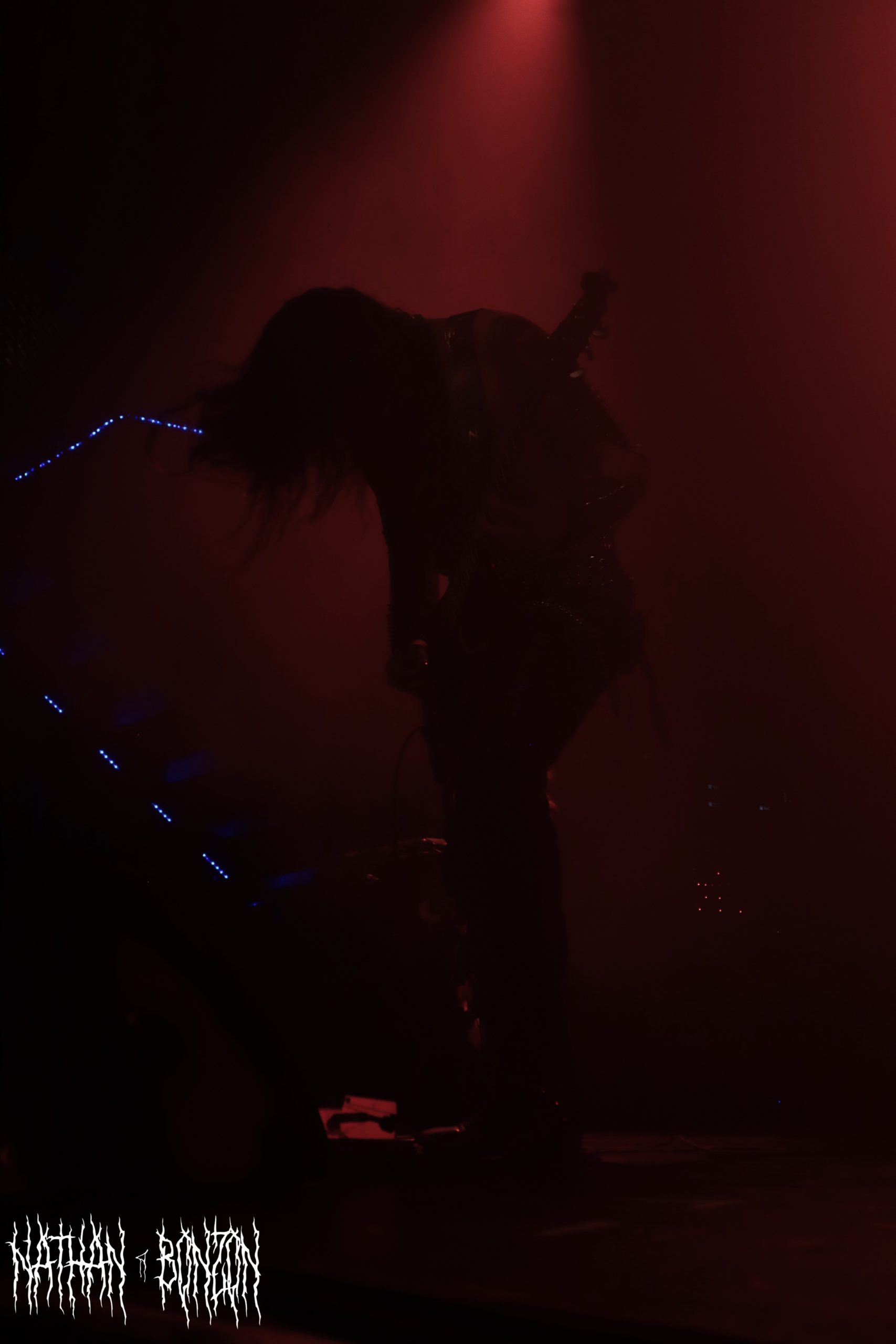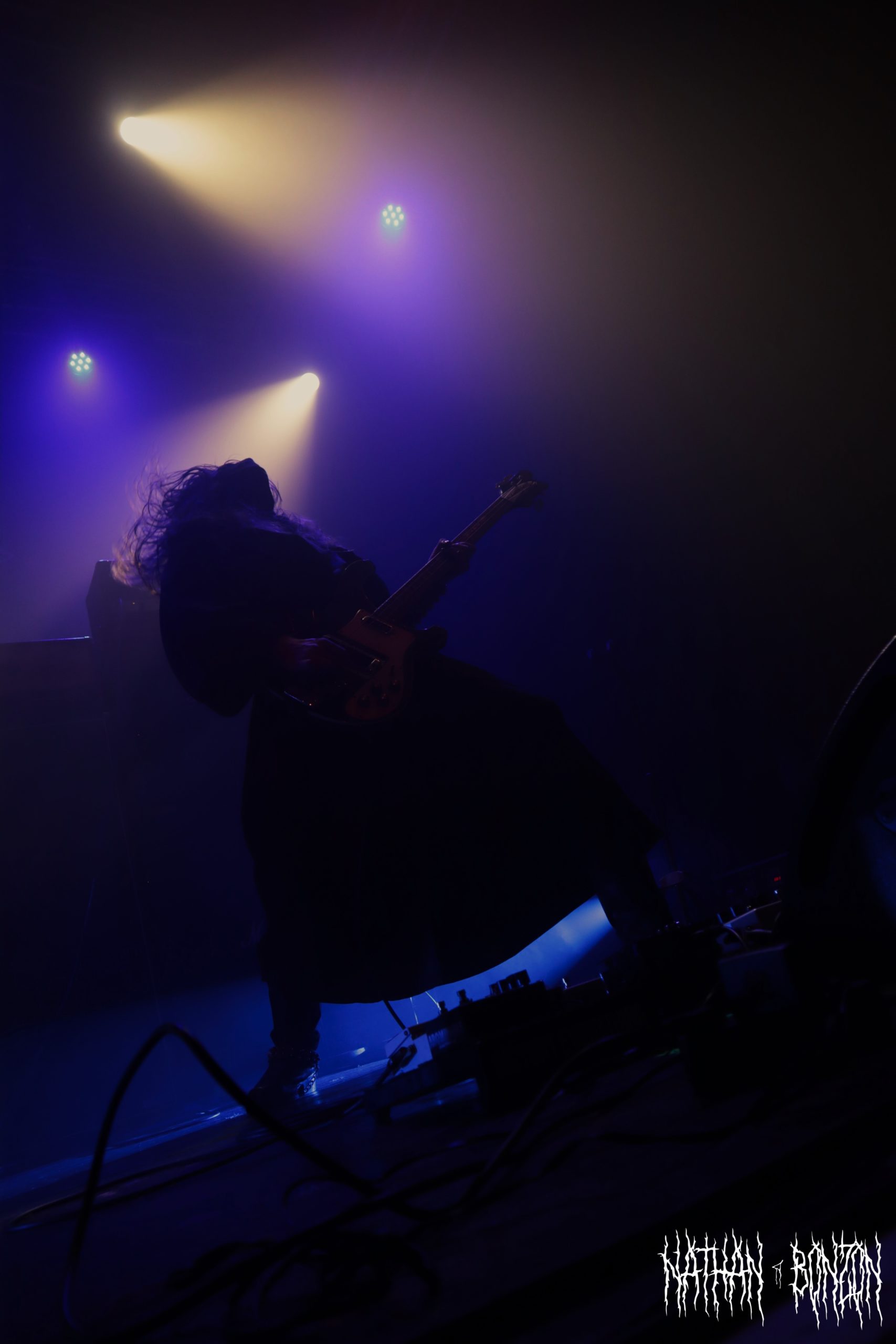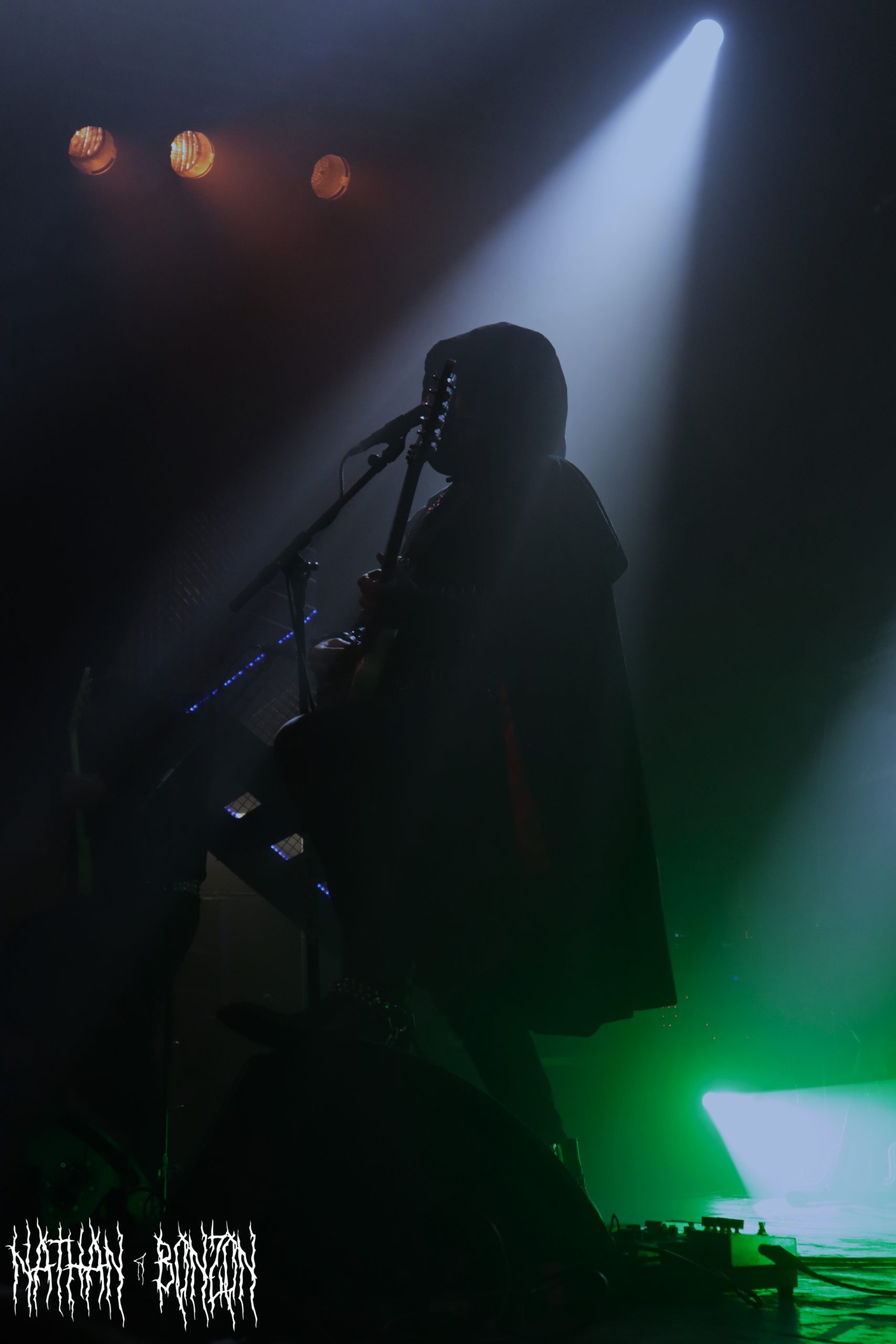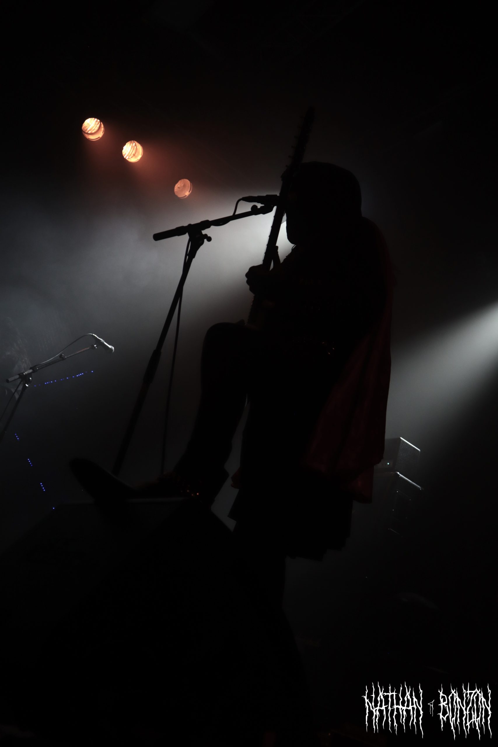 On reste dans le black metal avec Lamp of Murmuur, un projet solo américain, actif depuis 2019 et orchestré par le mystérieux M. Contrairement au groupe précédent qui était vêtu « normalement », les membres de Lamp of Murmuur portent des capes, sont barbouillés de corpse paints et armés de gantelets à pics : le black metal à l’état pur. Leur accoutrement, combiné aux lumières de la scène, donne une ambiance très esthétique au concert, je dirais même vampirique. Durant cette tournée, M. (qui chante et joue de la guitare) est accompagné par les membres de Dödsrit. La musique de Lamp of Murmuur est cependant moins atmosphérique que celle des Suédois. En effet, on a ici affaire à un black metal assez raw, relevant presque du black’n’roll par moments. J’ai été grandement surpris par un solo de guitare plutôt shreddy sur le dernier morceau du set, Deformed Erotic Visage, tiré de l’EP de 2021 Submission and Slavery. Ce groupe fut une très bonne découverte. Des bons riffs et des visuels intéressants, tout ce que j’aime !