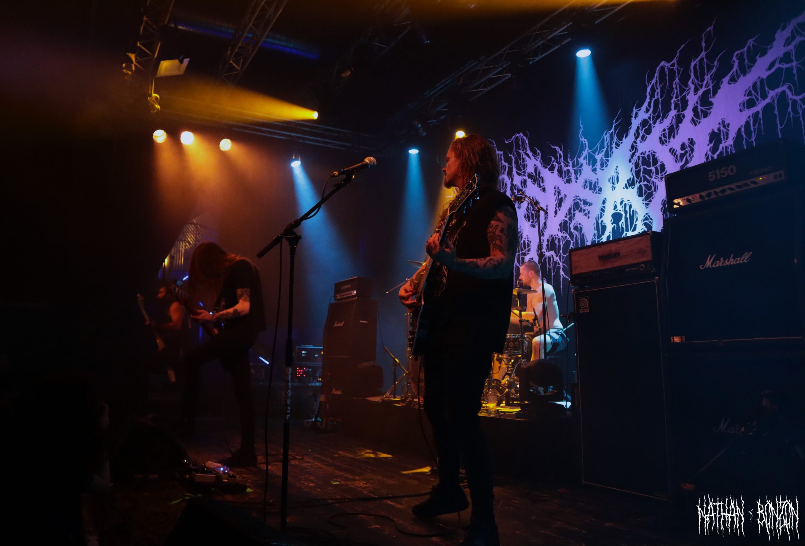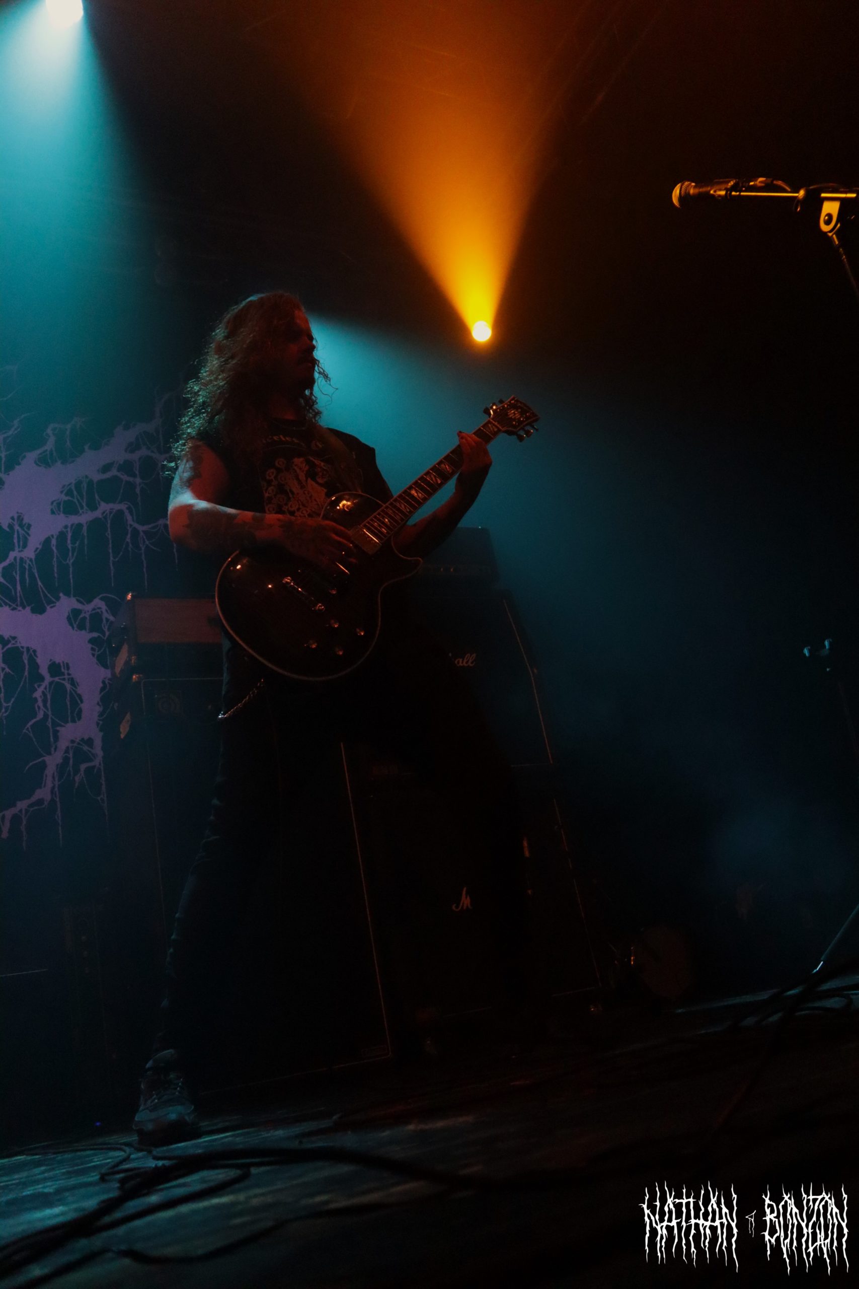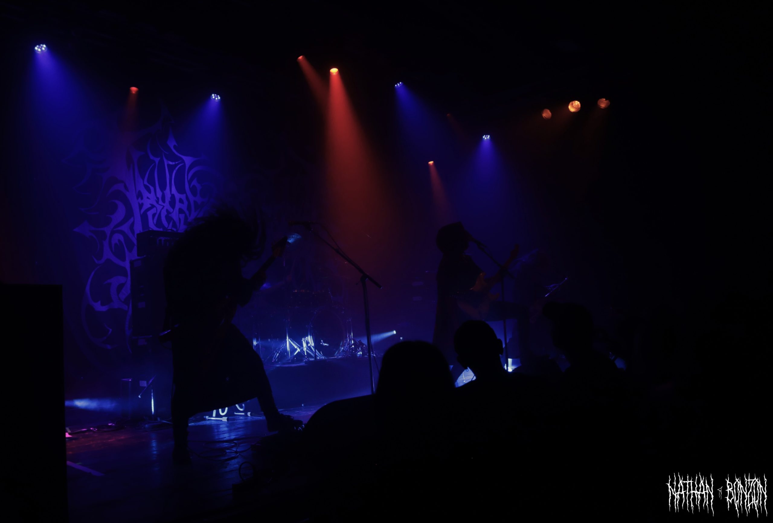 On reste dans le black metal avec Lamp of Murmuur, un projet solo américain, actif depuis 2019 et orchestré par le mystérieux M. Contrairement au groupe précédent qui était vêtu « normalement », les membres de Lamp of Murmuur portent des capes, sont barbouillés de corpse paints et armés de gantelets à pics : le black metal à l’état pur. Leur accoutrement, combiné aux lumières de la scène, donne une ambiance très esthétique au concert, je dirais même vampirique. Durant cette tournée, M. (qui chante et joue de la guitare) est accompagné par les membres de Dödsrit. La musique de Lamp of Murmuur est cependant moins atmosphérique que celle des Suédois. En effet, on a ici affaire à un black metal assez raw, relevant presque du black’n’roll par moments. J’ai été grandement surpris par un solo de guitare plutôt shreddy sur le dernier morceau du set, Deformed Erotic Visage, tiré de l’EP de 2021 Submission and Slavery. Ce groupe fut une très bonne découverte. Des bons riffs et des visuels intéressants, tout ce que j’aime !