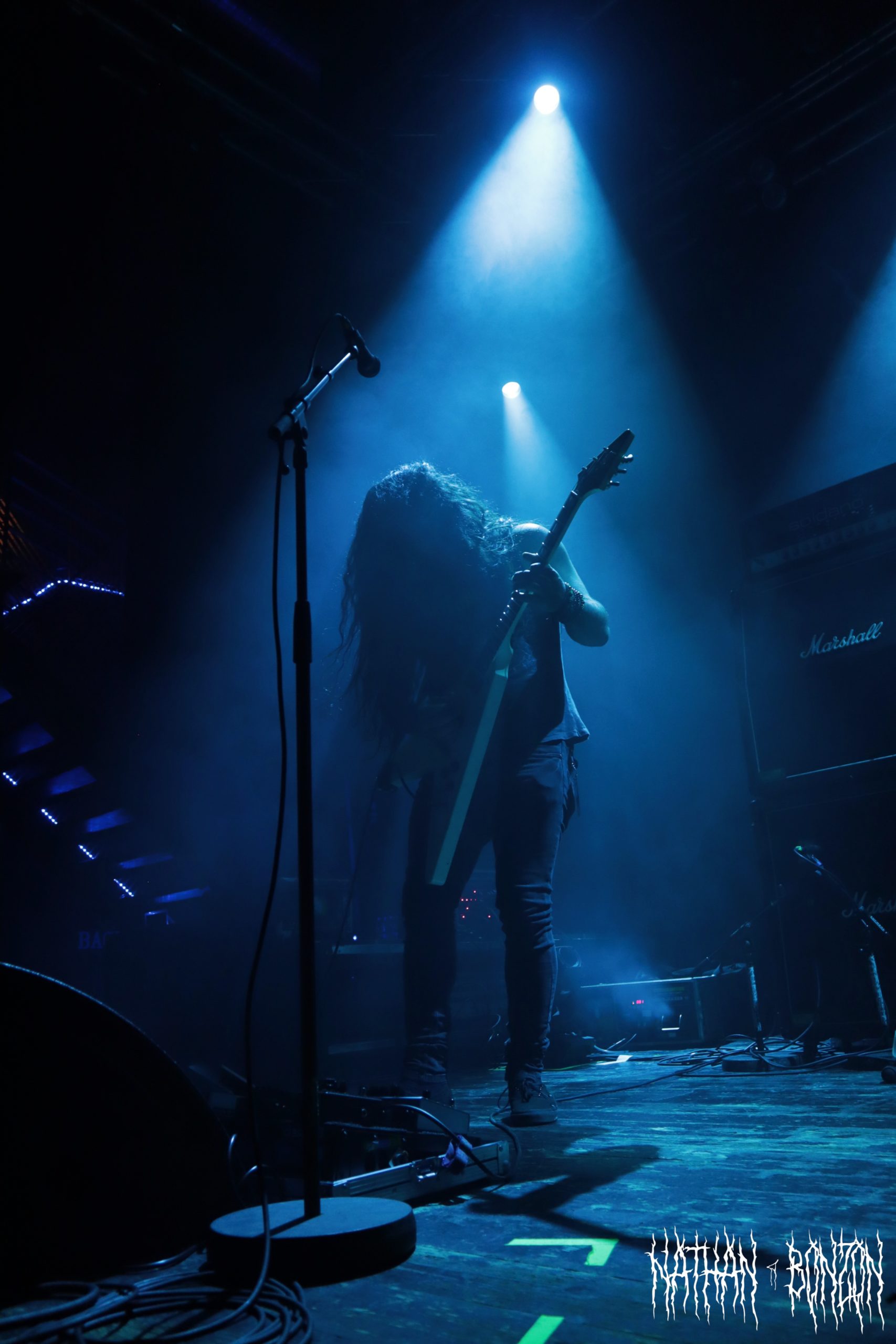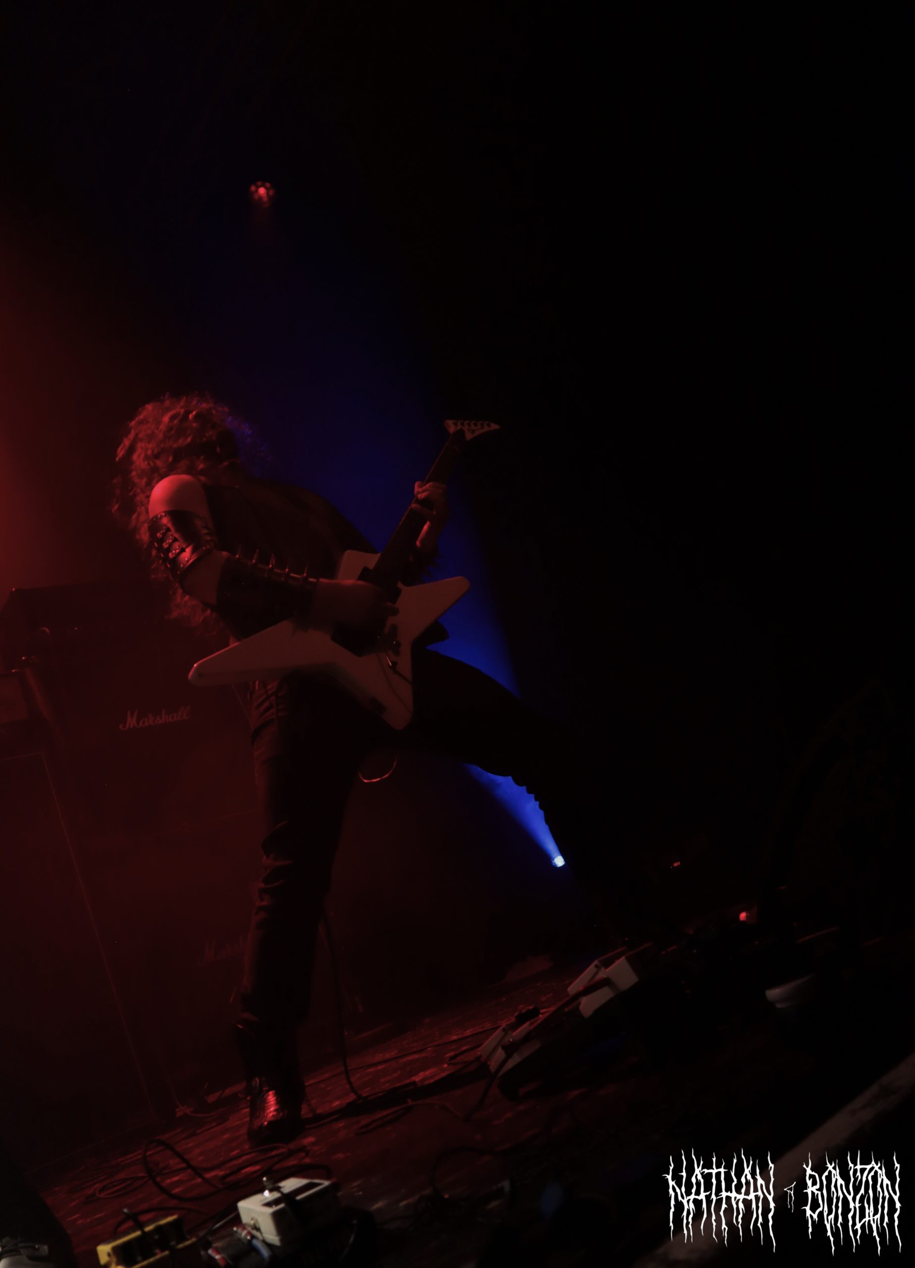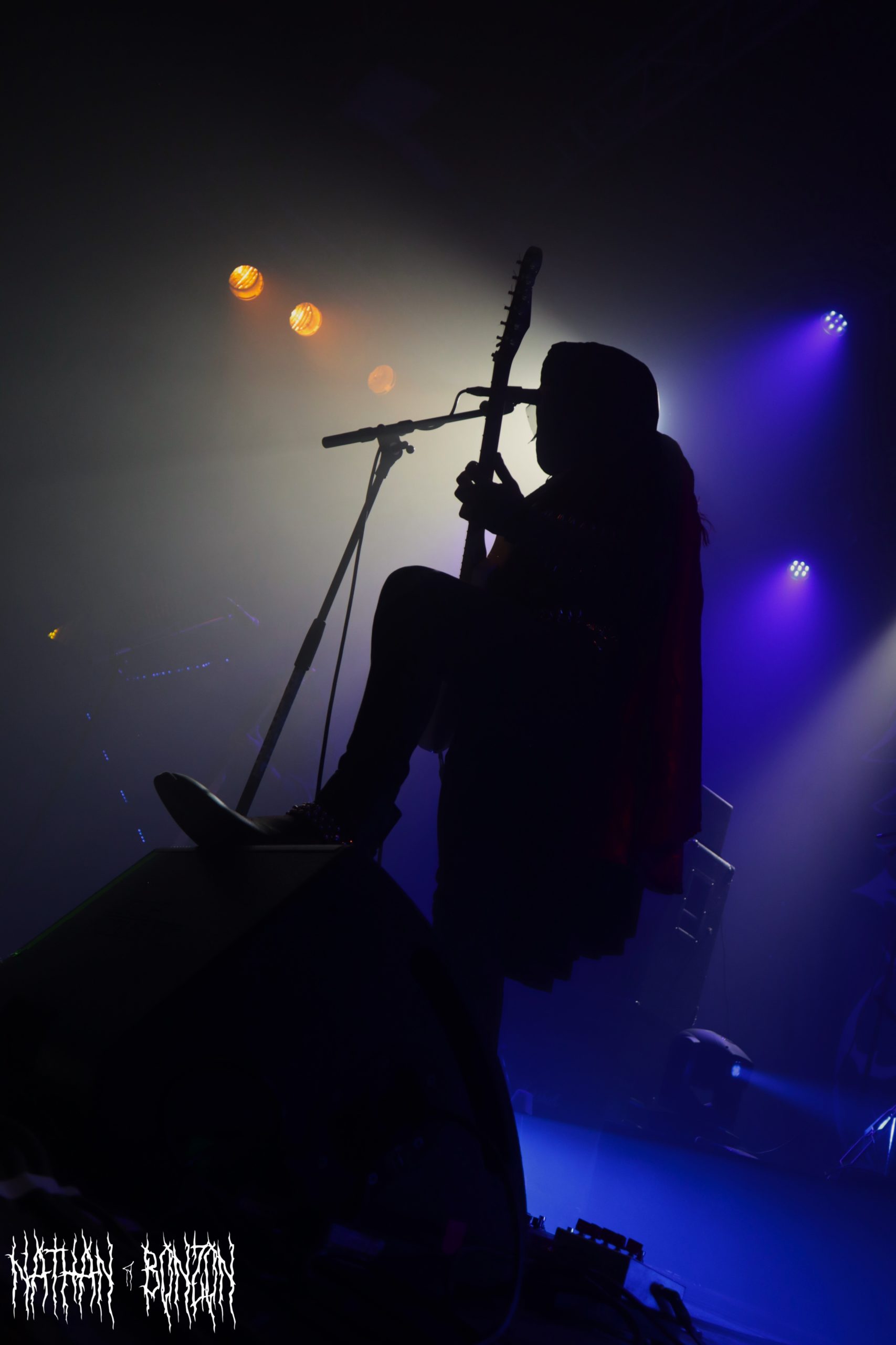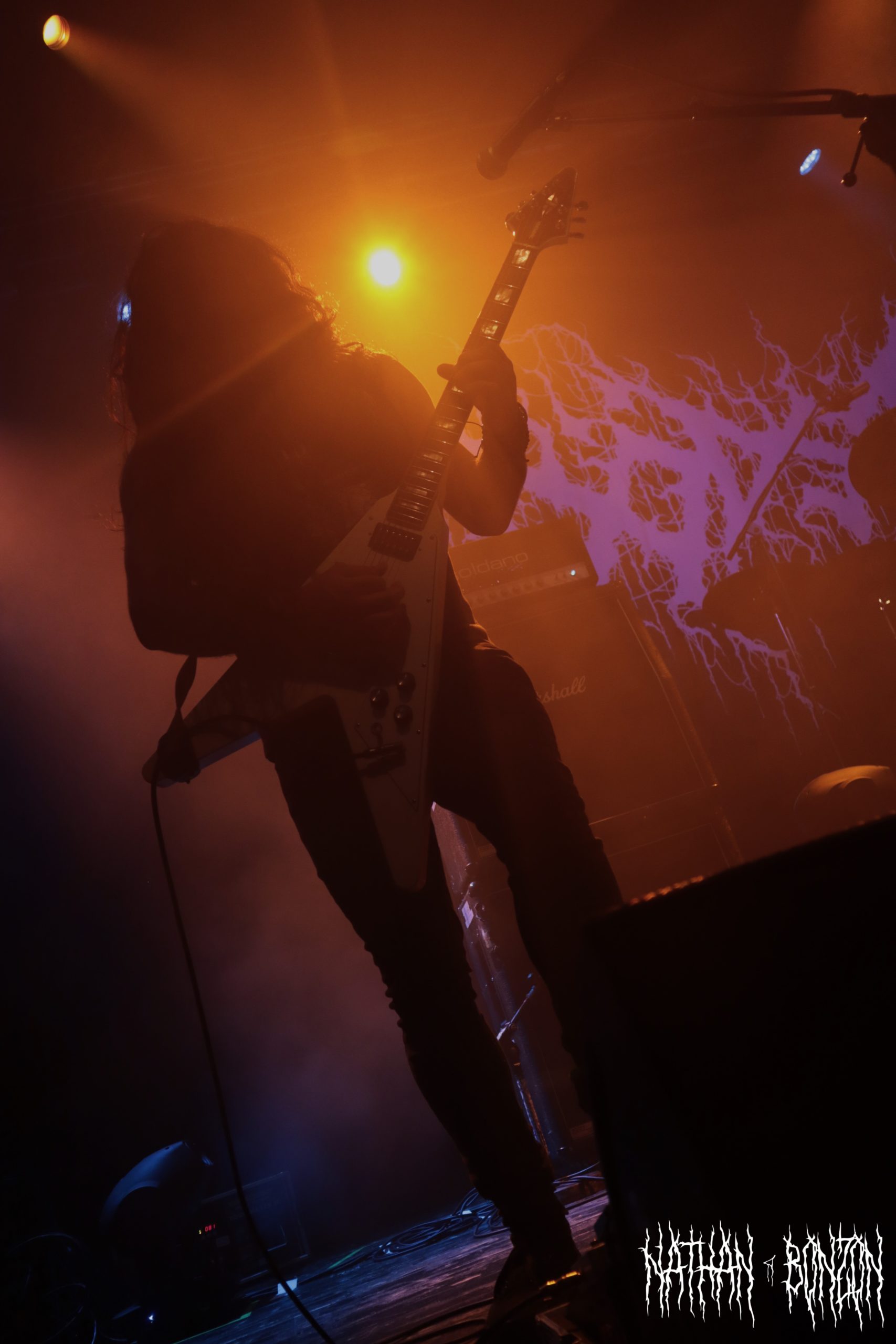 On reste dans le black metal avec Lamp of Murmuur, un projet solo américain, actif depuis 2019 et orchestré par le mystérieux M. Contrairement au groupe précédent qui était vêtu « normalement », les membres de Lamp of Murmuur portent des capes, sont barbouillés de corpse paints et armés de gantelets à pics : le black metal à l’état pur. Leur accoutrement, combiné aux lumières de la scène, donne une ambiance très esthétique au concert, je dirais même vampirique. Durant cette tournée, M. (qui chante et joue de la guitare) est accompagné par les membres de Dödsrit. La musique de Lamp of Murmuur est cependant moins atmosphérique que celle des Suédois. En effet, on a ici affaire à un black metal assez raw, relevant presque du black’n’roll par moments. J’ai été grandement surpris par un solo de guitare plutôt shreddy sur le dernier morceau du set, Deformed Erotic Visage, tiré de l’EP de 2021 Submission and Slavery. Ce groupe fut une très bonne découverte. Des bons riffs et des visuels intéressants, tout ce que j’aime !