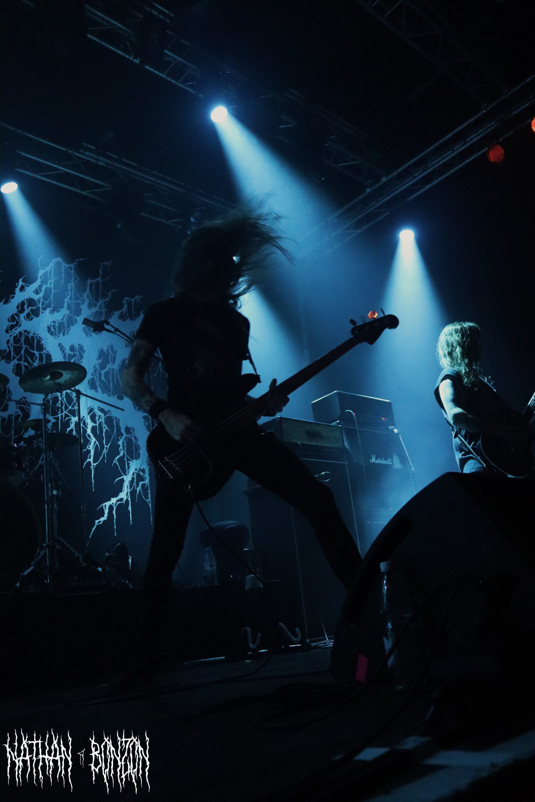 Le premier groupe à fouler les planches ce soir est Dödsrit. Originaire de Borlänge en Suède, le quartet propose un mix de crust et de black metal, penchant davantage sur le black mélodique pour ce qui concerne leur dernier album (Nocturnal Will, sorti en 2024 chez Wolves of Hades). Le show commence doucement avec Irjala et ses riffs entraînants avant de passer aux blast beats et aux cris stridents de Christoffer Öster. Ce dernier, également guitariste, partage le département vocal avec Georgios Maxouris, aussi guitariste. Leurs morceaux ne comportent cependant que peu de paroles, laissant place aux riffs trémolo mélodieux et lancinants, ce qui permet d’instaurer une atmosphère magique. Bien qu’ils n’aient joué que cinq morceaux, ceux-ci font entre sept et dix minutes, ce qui contrebalance la brièveté du set. Celui-ci se termine d’ailleurs par Apathetic Tongues, qui comporte une ambiance un peu sludge se mariant parfaitement avec leur black métal lent et mélancolique. Ce fut bien trop court, j’espère avoir l’opportunité de les revoir bientôt !