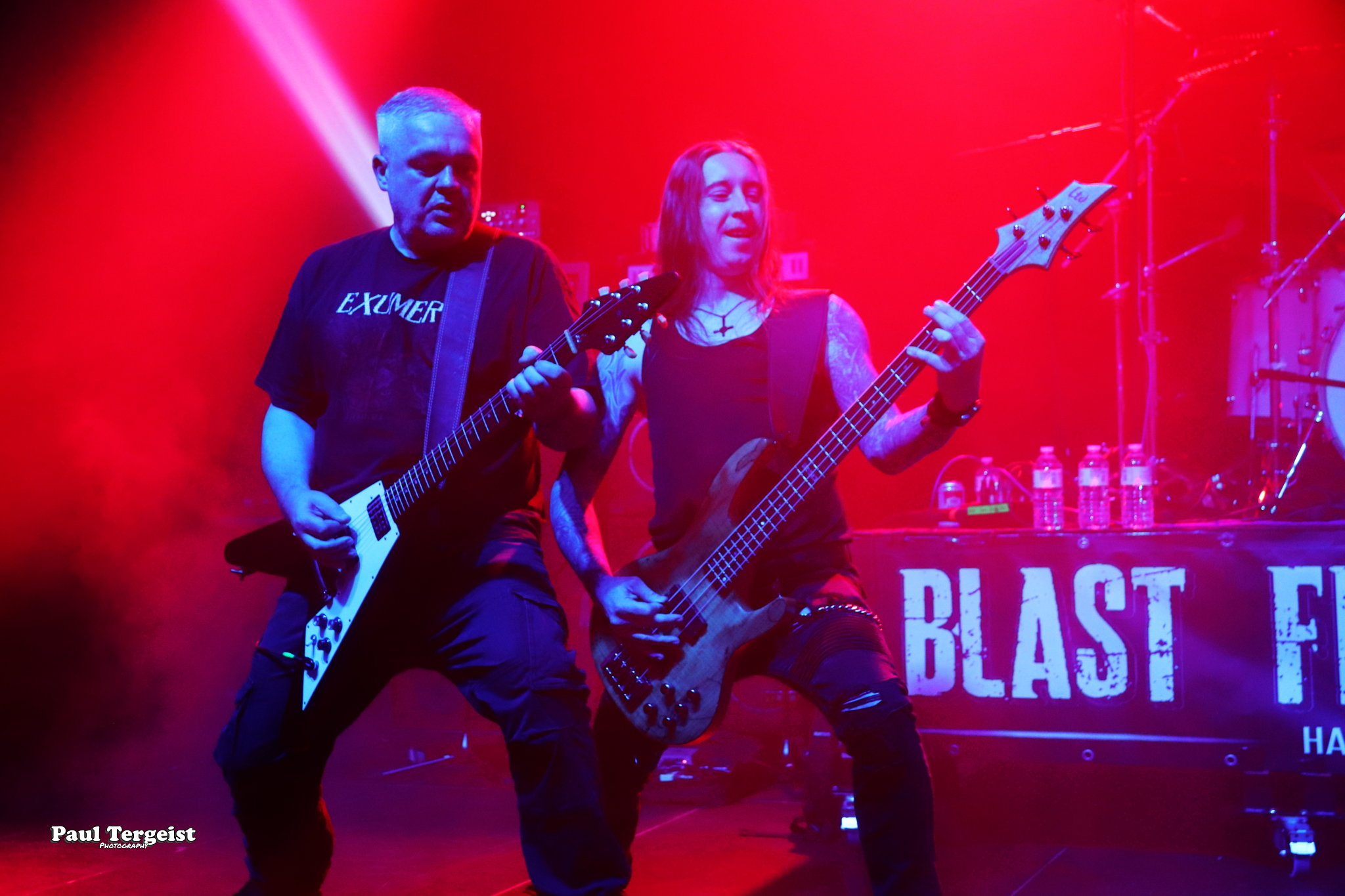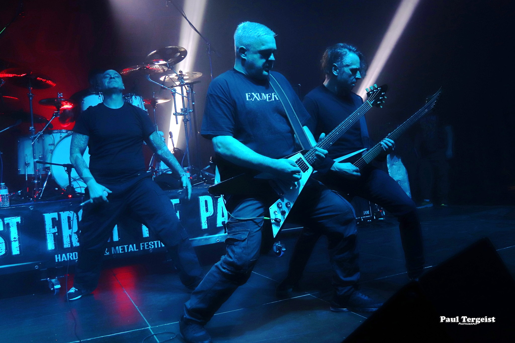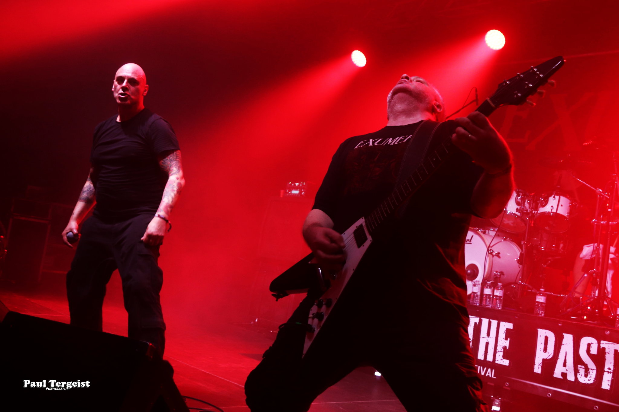 Exumer, dont le premier album, Possessed by Fire (1986), fait office de référence, et est toujours passé à côté du succès, ce qui explique sans doute son interruption de carrière de 1991 à 2008. Les Allemands n’ont rien perdu de leur mordant et leur thrash aux riffs efficaces ainsi qu’aux breaks mortels a pleinement satisfait aux attentes des amateurs du genre. Les titres plus récents n’ont, de plus, pas à rougir par rapport à ceux de la première heure, et les deux se marient très bien, sans que l’on puisse les dater à l’oreille. Impeccable. Et le constat est semblable en ce qui concerne Onslaught, qui, lui aussi, a souffert d’un manque de reconnaissance à grande échelle et a fini par se séparer, pour revenir en force et être à nouveau bien dans le coup.