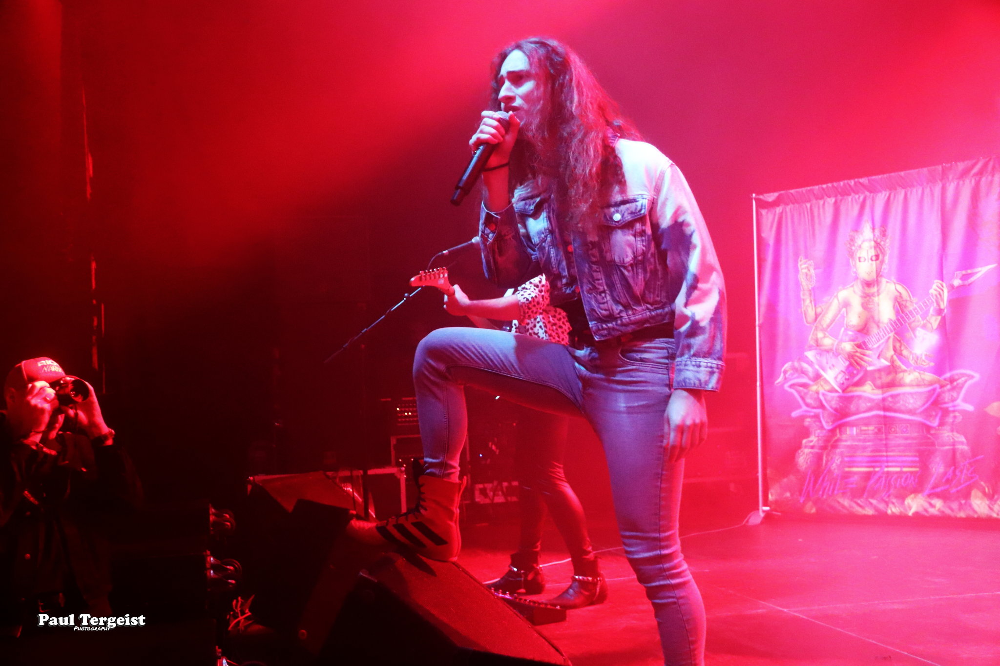 Mentionnons quand même que, du premier concert du jour jusqu’à celui-ci, le volume sonore est vraiment, mais vraiment trop fort ! Nous apprendrons par la suite que l’ingé-son n’est pas sourd, mais que l’acoustique de la salle, très haute de plafond, par rapport aux caractéristiques de la sono disponible, rend ces réglages, bien qu’inconfortables pour l’ouïe, nécessaires pour que le son ne se « perde » pas trop ou ne donne pas l’impression de venir du plafond. Une amélioration sensible se fera néanmoins sentir à partir du début du set de Vengeance, et ça fait du bien…