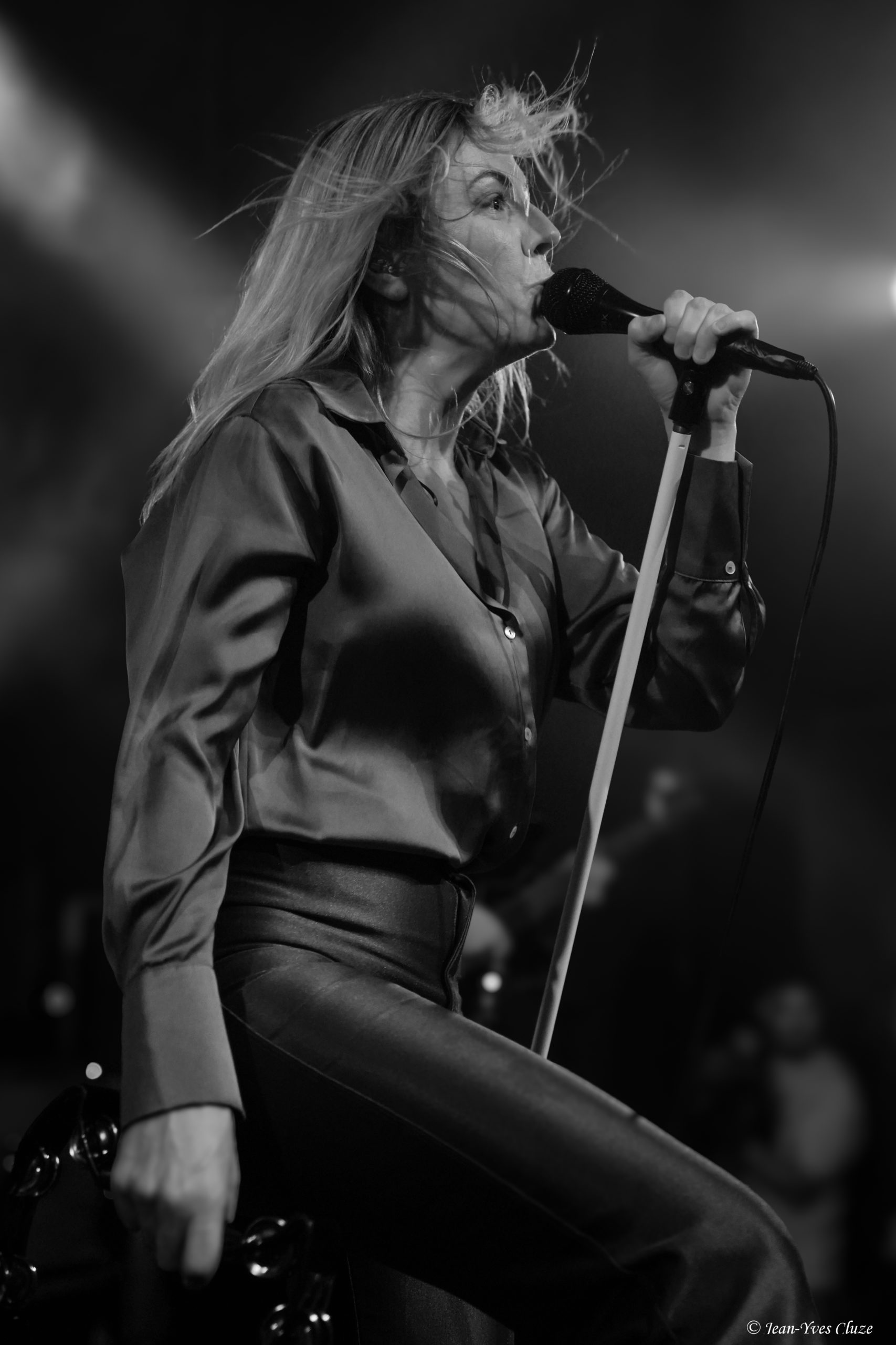 Par la suite, la setlist prend un virage vers le début de la carrière du groupe avec Bliss, extrait du premier EP homonyme sorti en 2012. Suivent Proud Woman, l’occasion pour les nombreuses spectatrices d’exprimer leur fierté d’être qui elles sont, encouragées par Elin Larsson, puis Low Road de l’album Holy Moly! sorti en 2020. Après quoi, la chanteuse prend de nouveau la parole, cette fois-ci pour évoquer les forts liens d’amitié qui se sont formés entre Blues Pills et Daniel Romano’s Outfit au cours de la tournée ; liens que le batteur du premier, André Kvarnström, arbore sur son T-shirt à l’effigie du second. Jetant un œil derrière les rideaux, j’aperçois Daniel Romano et comparses, qui apprécient sans nul doute cette délicate attention… La setlist de Blues Pills revient ensuite à Birthday avec Like a Drug, morceau dont les accents psychédéliques illustrent fort bien son titre et nous font tous un peu planer l’espace de quelques minutes. High Class Woman offre un second moment « girl power » aux femmes du public. Un peu plus tard, sur Black Smoke, autre extrait de Birthday, Elin Larsson, décidément ingouvernable, profite d’un passage au rythme ralenti pour descendre de la scène et se mêler aux spectateurs, aussi loin que la longueur du câble de son micro — et la réactivité du roadie à éviter que ledit câble se débranche — le lui permet. À cet instant, la fin du set approche ; au moment d’annoncer Little Sun, qui fait office de pré-conclusion, Elin Larsson rend hommage à l’histoire de ce morceau, « grand favori » du public selon elle. L’histoire est pour le moins poignante : au cours d’une série de concerts à l’étranger, la chanteuse apprend le décès brutal des parents de sa meilleure amie. « C’était l’époque où on essayait de réaliser nos rêves, on manquait de moyens… du coup, je n’ai pas pu rentrer en Suède pour être auprès d’elle », raconte-t-elle, l’émotion palpable dans sa voix. « On a composé ce morceau pour l’accompagner dans cette épreuve. » En raccord avec le titre, l’éclairage prend les couleurs du soleil.