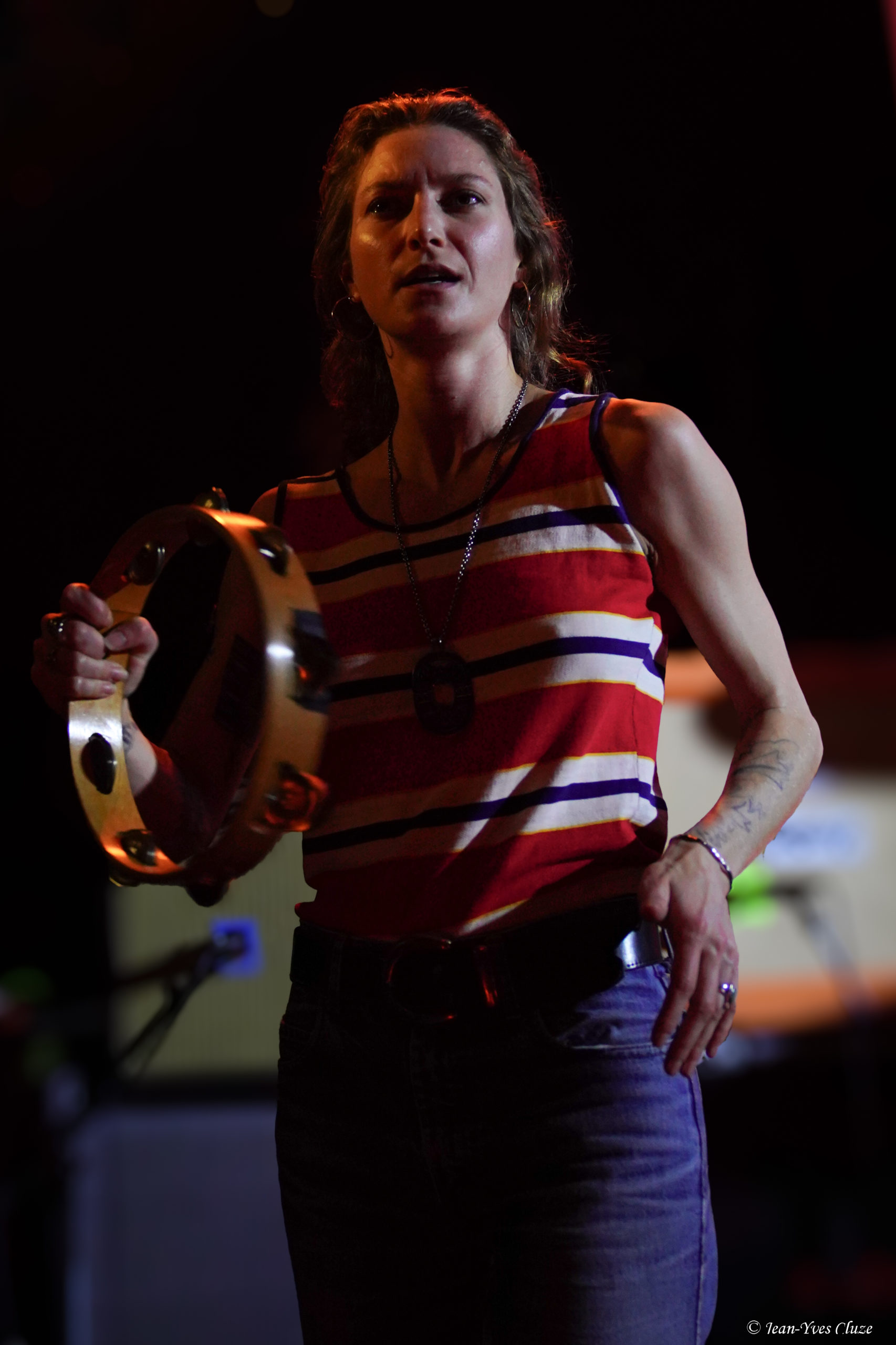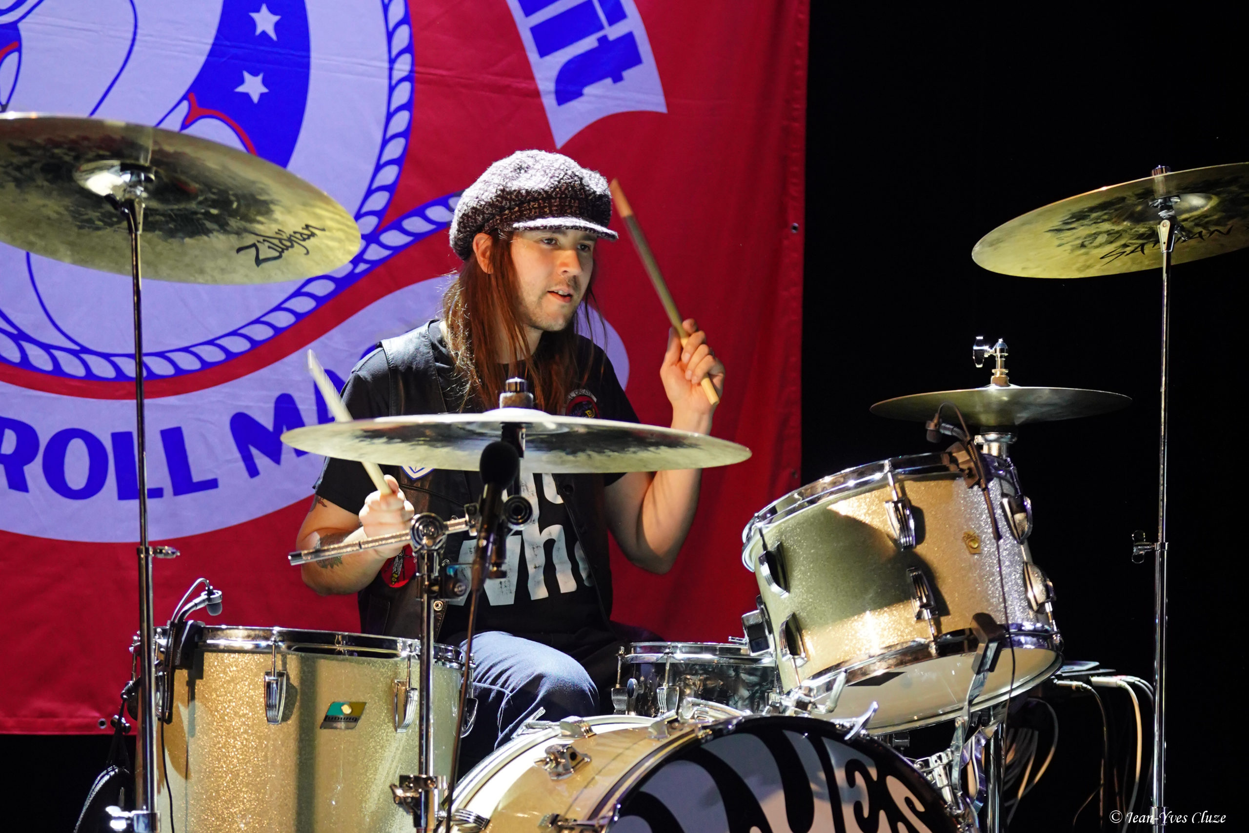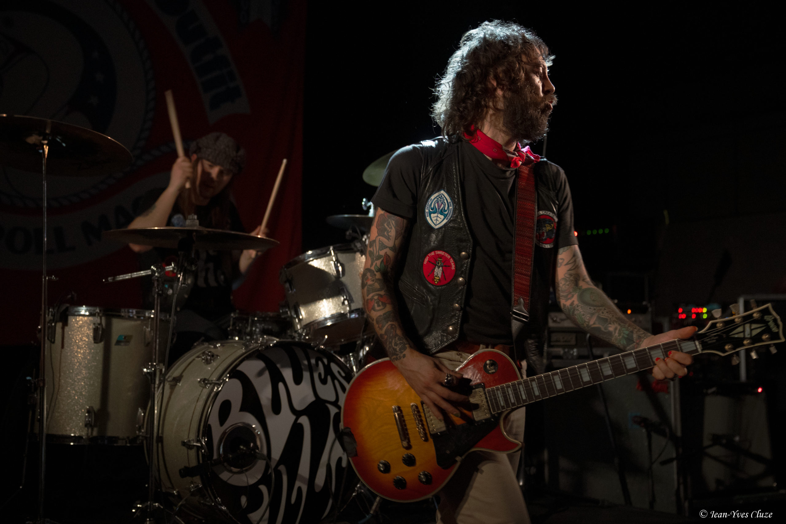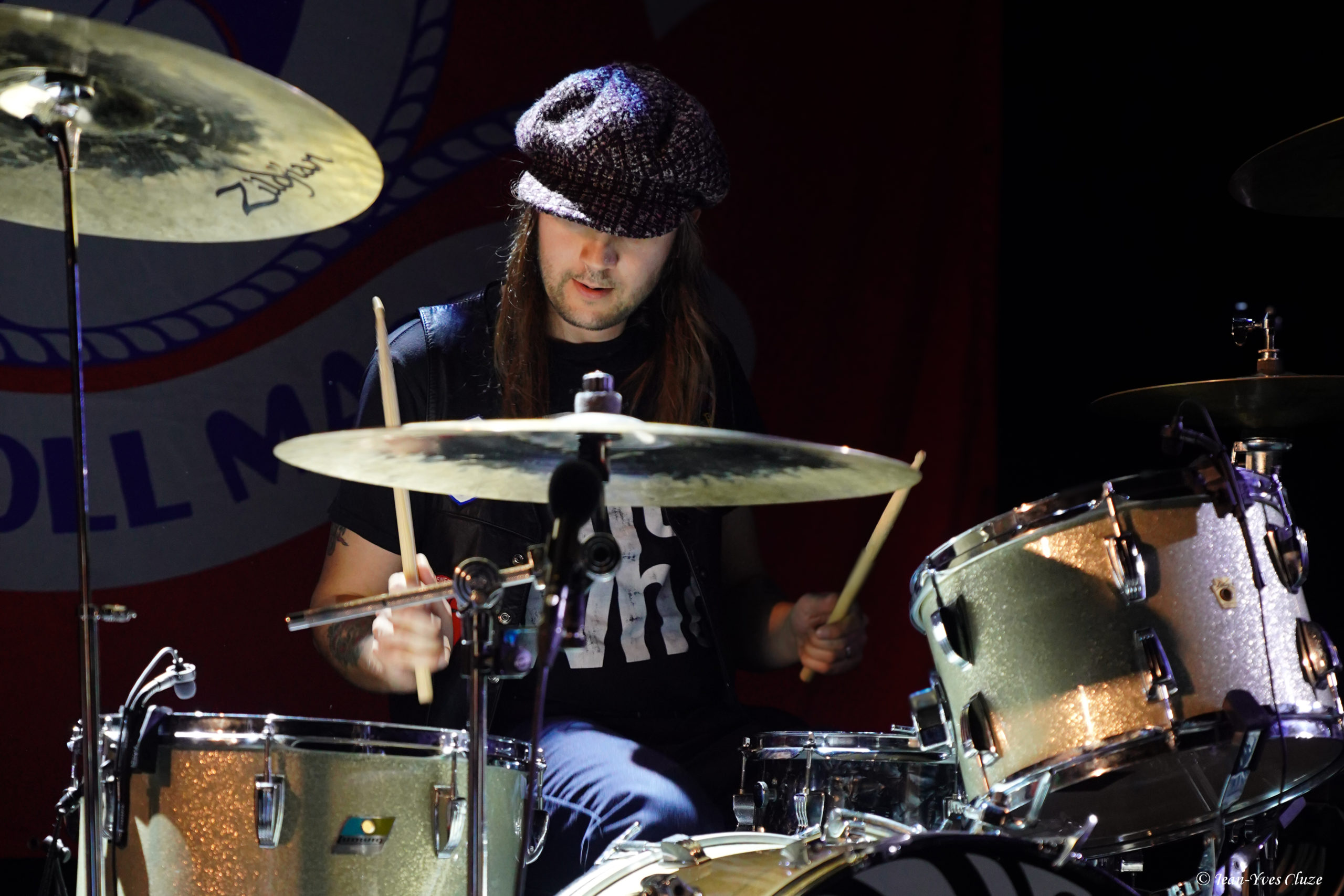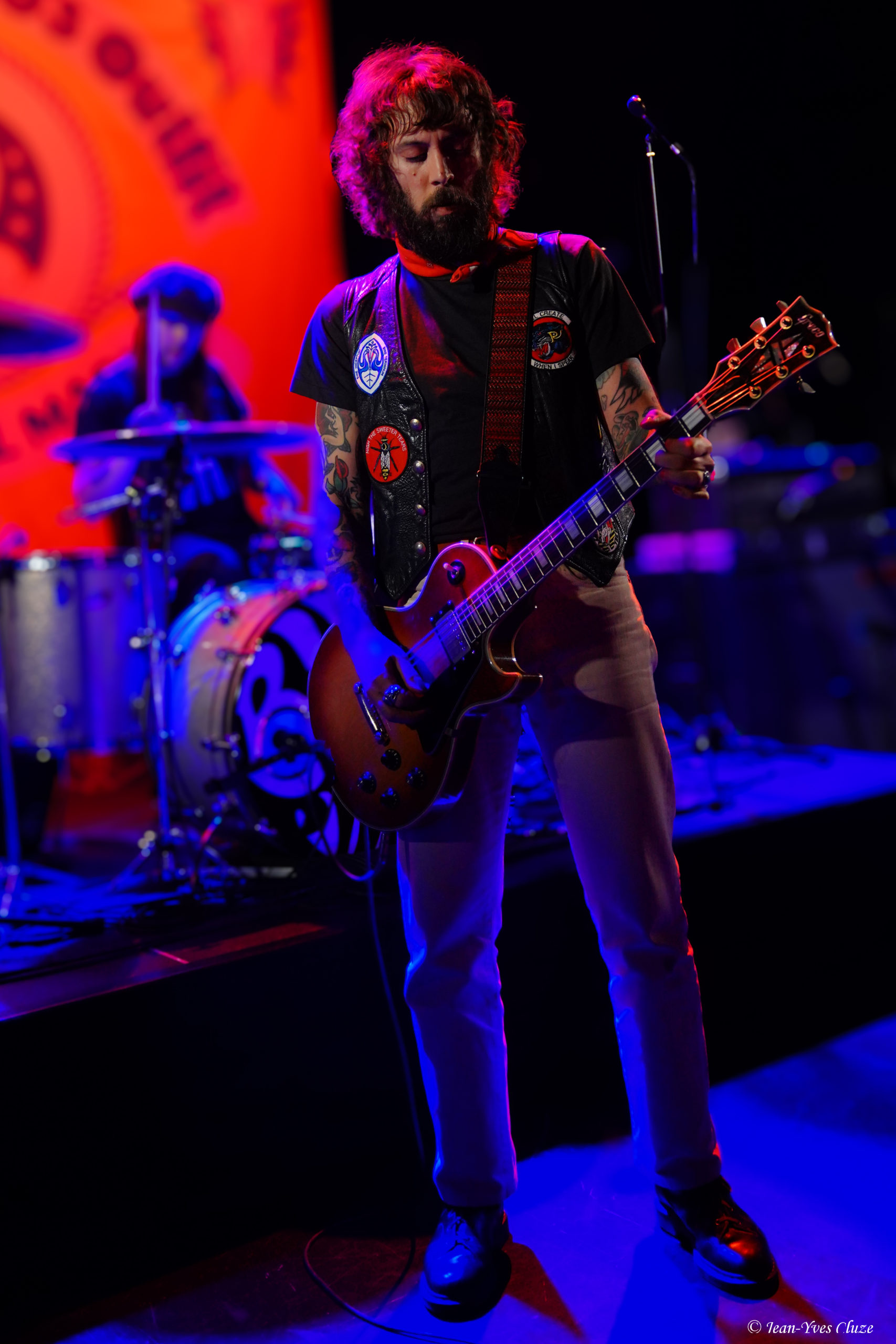 Il se fait tout juste 20 h 30 lorsque Daniel Romano et ses trois comparses Roddy Rosetti, Julianna Riolino et Ian Romano débarquent en scène sur fond d’une piste instrumentale aux accents orchestraux avant d’embrayer sur un premier morceau très rythmé et entraînant — en tout cas plus que son titre le laisse présager —, Field of Ruins. En vérité, ces deux termes résument à eux seuls le set dans son ensemble, les quatre joyeux drilles passant d’un titre à l’autre sans temps mort et avec très peu de répit ; de cette manière, ils mettent au mieux à profit la courte demi-heure de temps de scène qui leur est accordée. La courte durée des morceaux aide bien en cela, qui nous permet de profiter du mélange des genres entre rock, country, folk et blues que propose le quatuor, le tout teinté d’un grain de folie donnant son liant à l’ensemble. Le lecteur averti l’aura compris, l’heure est à l’ambiance 70’s sur la petite scène du Marché-Gare, autant dans la musique que dans le look des musiciens incorporant tous les incontournables de la mode de l’époque ; parfaitement en raccord, somme toute, avec un nom de formation signifiant « costume » ! En tête, Daniel Romano mène le jeu muni de son jeu de guitare et de sa voix tous deux marqués d’accents blues ainsi que de sa veste à écussons. Par ailleurs, bien qu’il soit celui dont le groupe arbore le nom, ses trois comparses sont de leur côté bien loin de ne constituer qu’un simple « habillage » (outfit). Chacun apporte sa touche personnelle à l’ensemble ; ainsi, nous avons droit à un jeu très énergique et à des prestations vocales se rapprochant du hip-hop old-school de la part de Roddy Rosetti, bassiste hyperactif à la coupe de cheveux d’époque qui saute partout, y compris sur le piédestal de la batterie ; derrière cet instrument, Ian Romano et son béret d’une classe vintage livrent un jeu que n’aurait pas renié un batteur de metal. Julianna Riolino, unique membre féminin du quatuor, se distingue quant à elle par la fraîcheur de sa voix, aux chœurs puis lorsque vient son tour d’assurer le chant lead et la guitare sur un morceau, le reste du temps par ses danses façon disco en jean patte d’éléphant avec le partenaire de choix qu’est son tambourin. En quelques mots, c’est un set très efficace que livre Daniel Romano’s Outfit, porté par un rythme effréné entrecoupé de quelques passages plus lents, qui file très vite… un peu trop pour laisser le temps et l’espace aux musiciens d’échanger avec le public, seul bémol à relever dans cette première partie d’excellente facture par ailleurs.