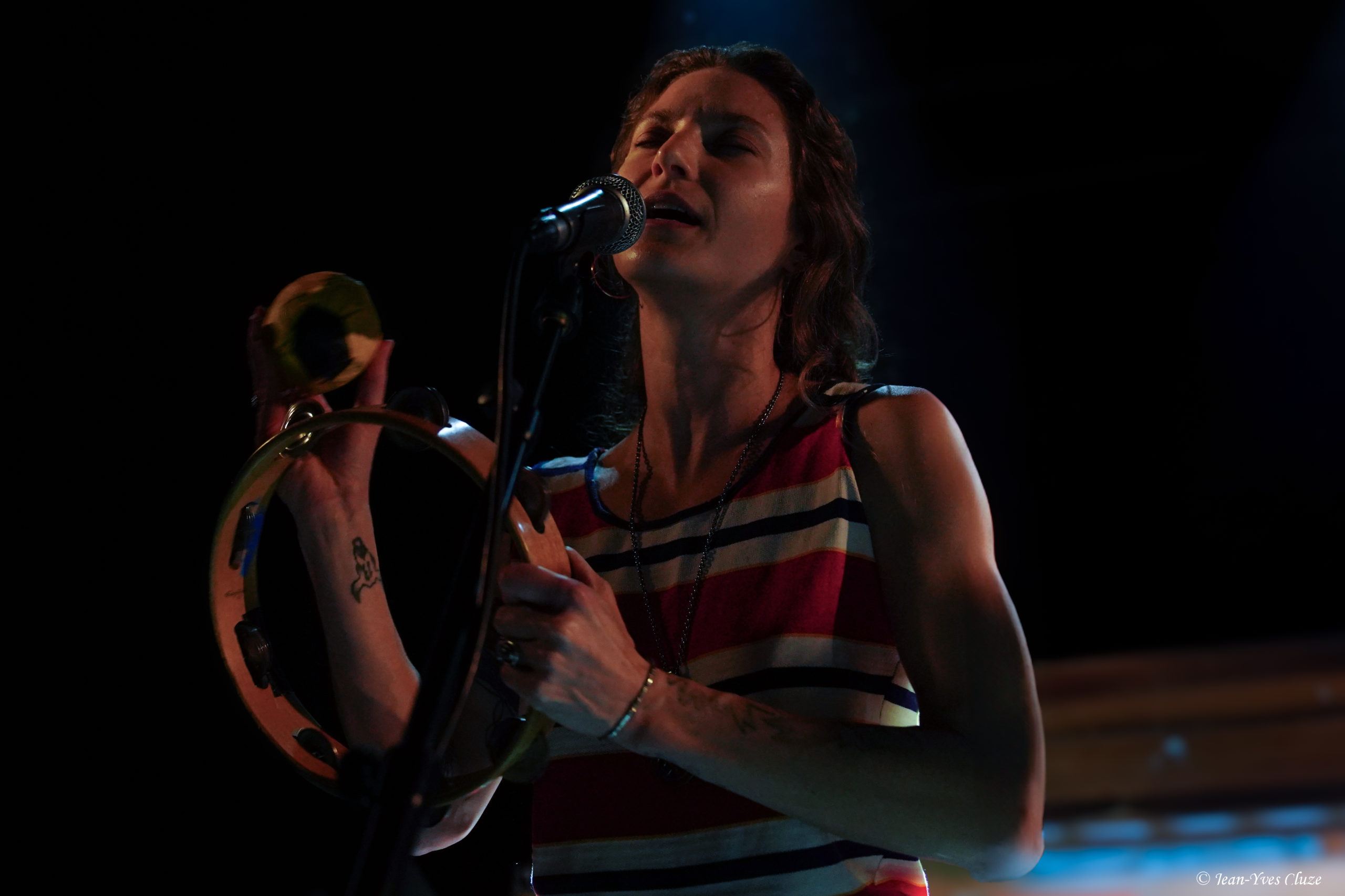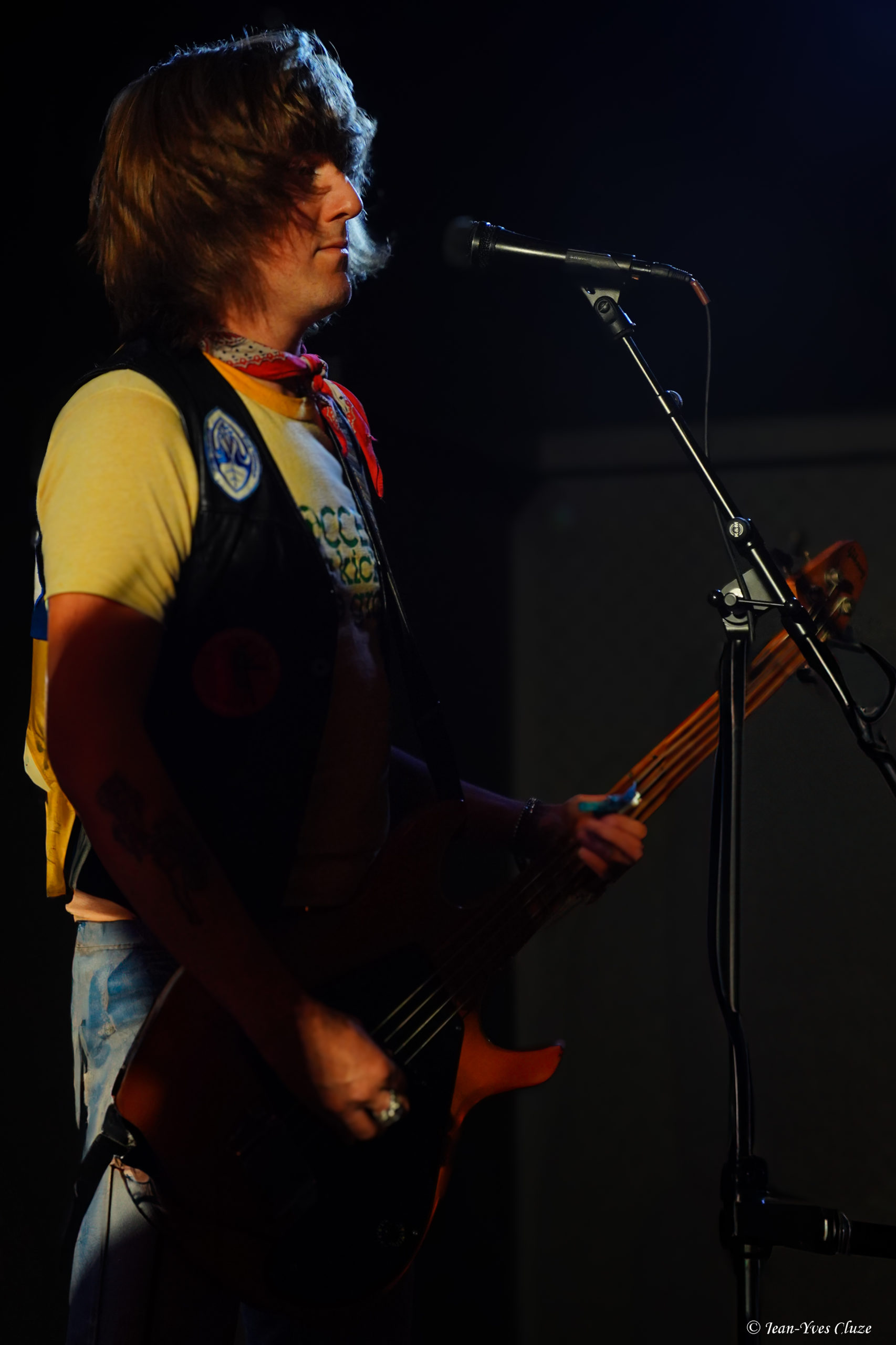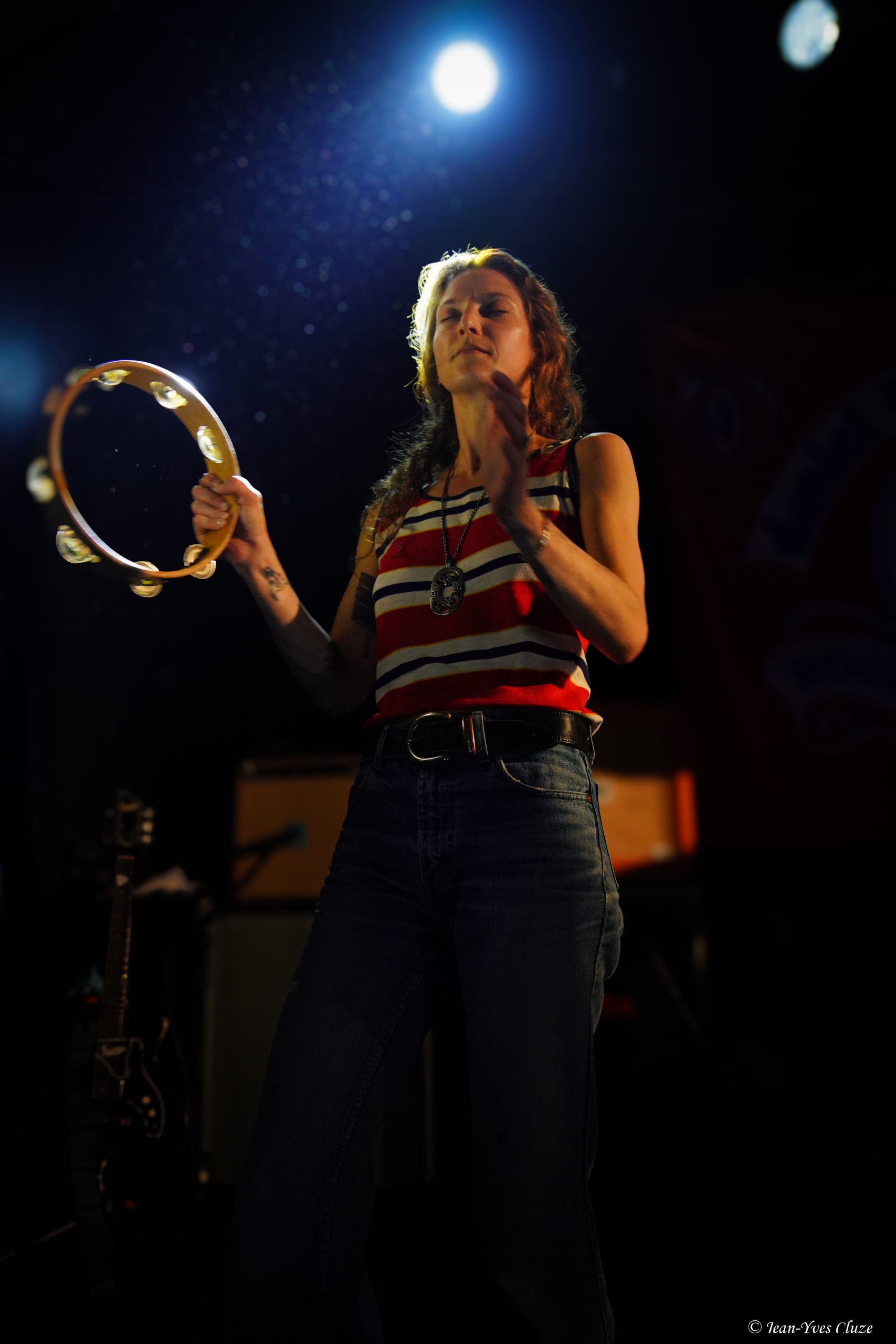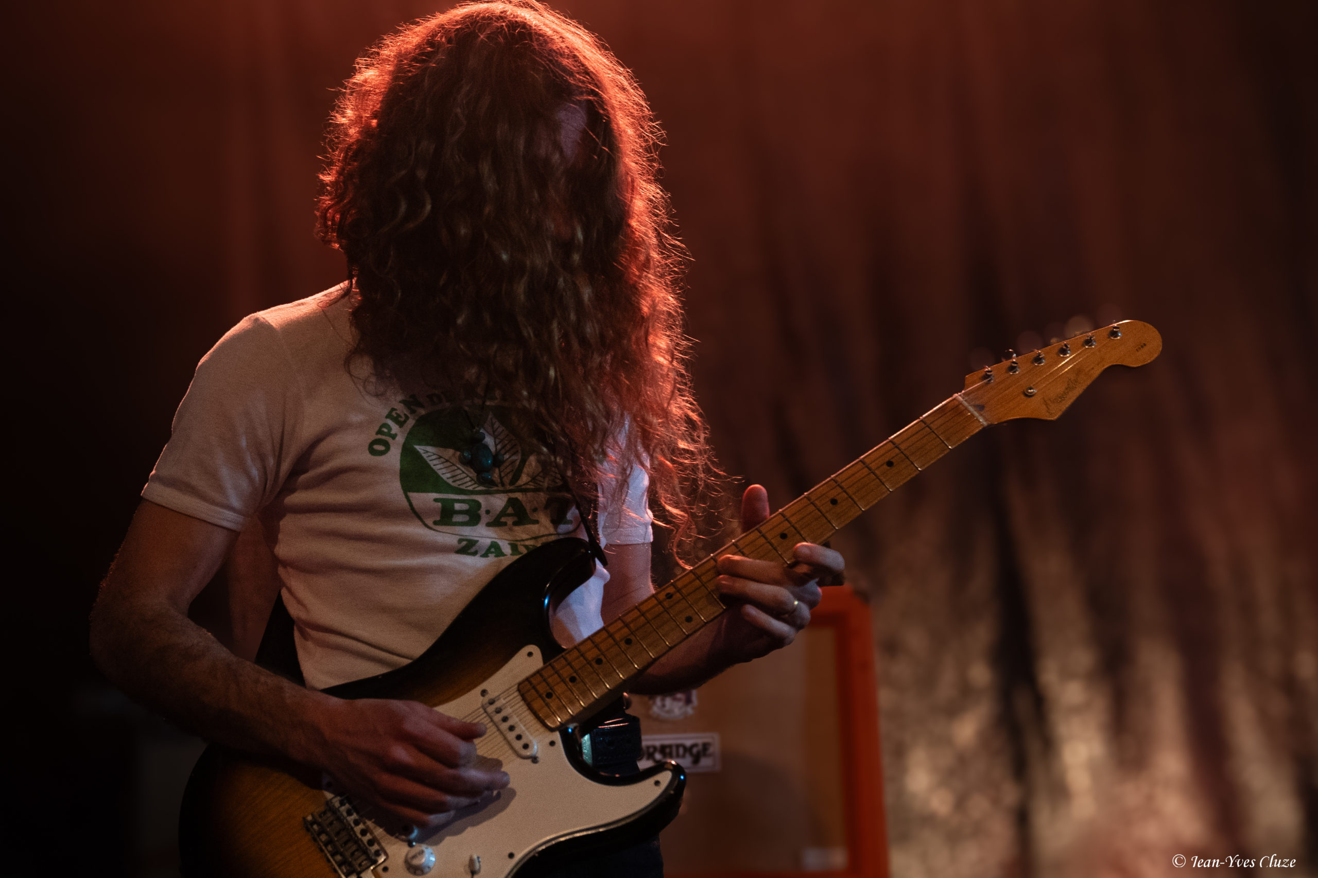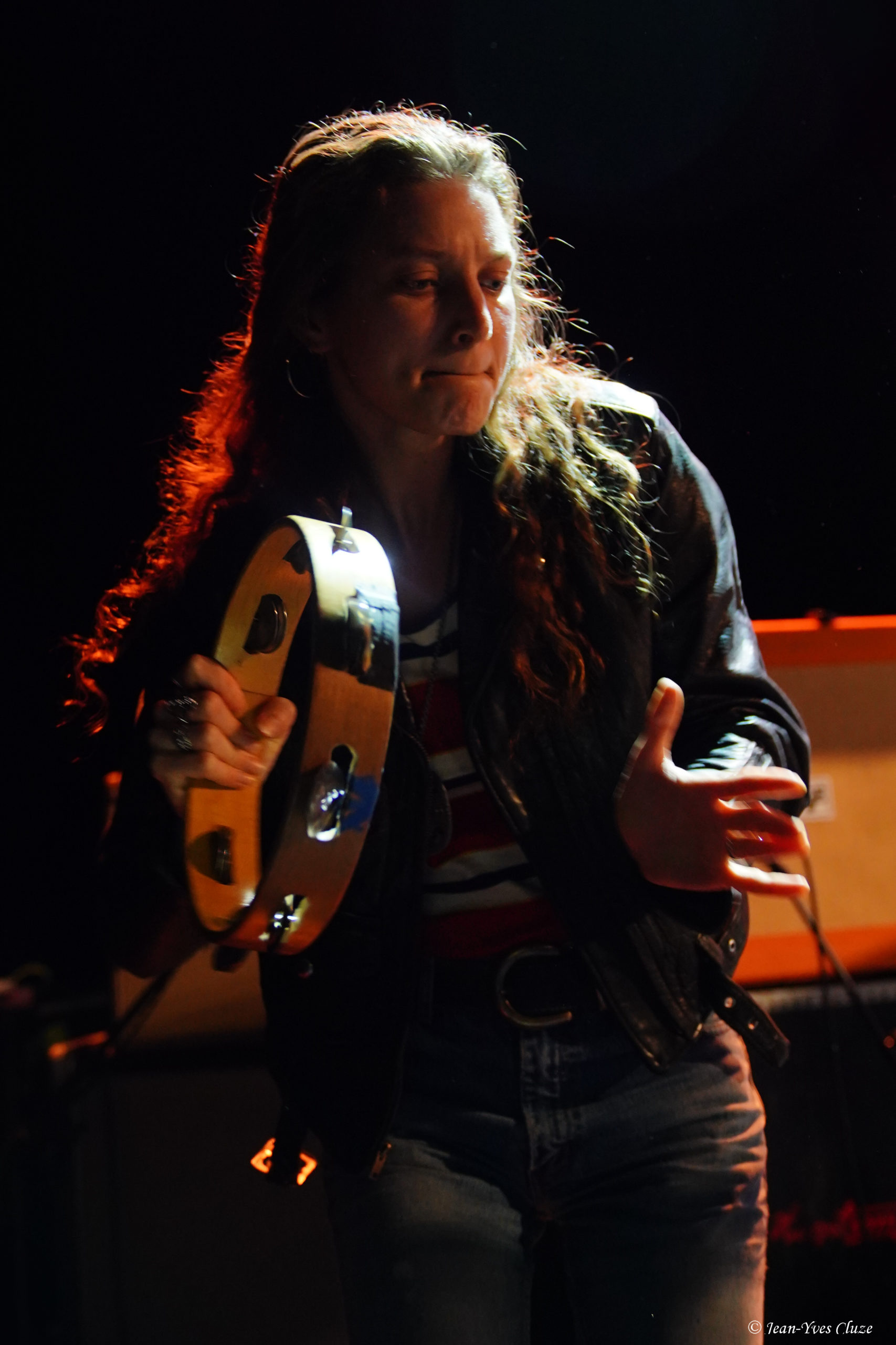 Il se fait tout juste 20 h 30 lorsque Daniel Romano et ses trois comparses Roddy Rosetti, Julianna Riolino et Ian Romano débarquent en scène sur fond d’une piste instrumentale aux accents orchestraux avant d’embrayer sur un premier morceau très rythmé et entraînant — en tout cas plus que son titre le laisse présager —, Field of Ruins. En vérité, ces deux termes résument à eux seuls le set dans son ensemble, les quatre joyeux drilles passant d’un titre à l’autre sans temps mort et avec très peu de répit ; de cette manière, ils mettent au mieux à profit la courte demi-heure de temps de scène qui leur est accordée. La courte durée des morceaux aide bien en cela, qui nous permet de profiter du mélange des genres entre rock, country, folk et blues que propose le quatuor, le tout teinté d’un grain de folie donnant son liant à l’ensemble. Le lecteur averti l’aura compris, l’heure est à l’ambiance 70’s sur la petite scène du Marché-Gare, autant dans la musique que dans le look des musiciens incorporant tous les incontournables de la mode de l’époque ; parfaitement en raccord, somme toute, avec un nom de formation signifiant « costume » ! En tête, Daniel Romano mène le jeu muni de son jeu de guitare et de sa voix tous deux marqués d’accents blues ainsi que de sa veste à écussons. Par ailleurs, bien qu’il soit celui dont le groupe arbore le nom, ses trois comparses sont de leur côté bien loin de ne constituer qu’un simple « habillage » (outfit). Chacun apporte sa touche personnelle à l’ensemble ; ainsi, nous avons droit à un jeu très énergique et à des prestations vocales se rapprochant du hip-hop old-school de la part de Roddy Rosetti, bassiste hyperactif à la coupe de cheveux d’époque qui saute partout, y compris sur le piédestal de la batterie ; derrière cet instrument, Ian Romano et son béret d’une classe vintage livrent un jeu que n’aurait pas renié un batteur de metal. Julianna Riolino, unique membre féminin du quatuor, se distingue quant à elle par la fraîcheur de sa voix, aux chœurs puis lorsque vient son tour d’assurer le chant lead et la guitare sur un morceau, le reste du temps par ses danses façon disco en jean patte d’éléphant avec le partenaire de choix qu’est son tambourin. En quelques mots, c’est un set très efficace que livre Daniel Romano’s Outfit, porté par un rythme effréné entrecoupé de quelques passages plus lents, qui file très vite… un peu trop pour laisser le temps et l’espace aux musiciens d’échanger avec le public, seul bémol à relever dans cette première partie d’excellente facture par ailleurs.