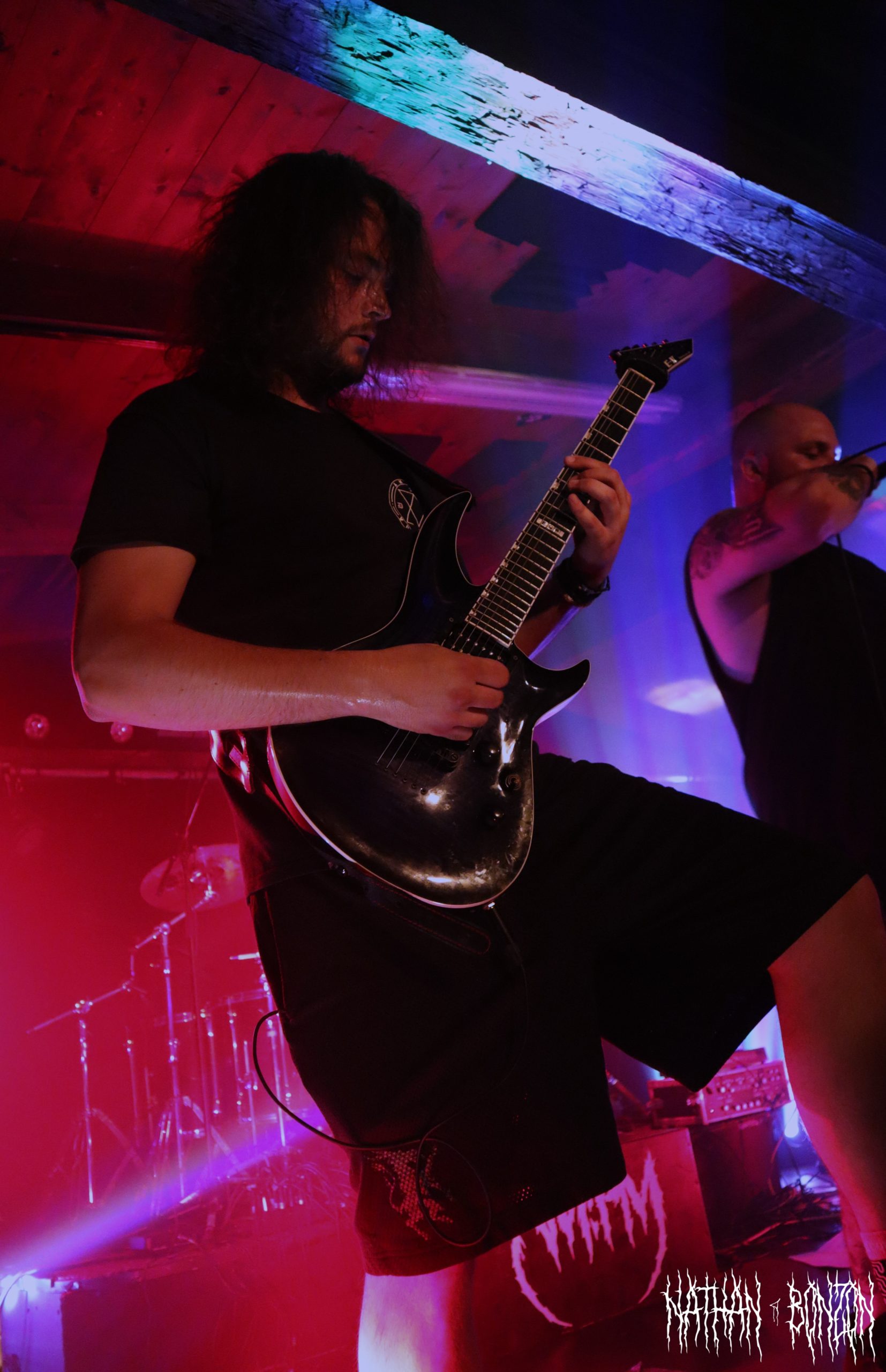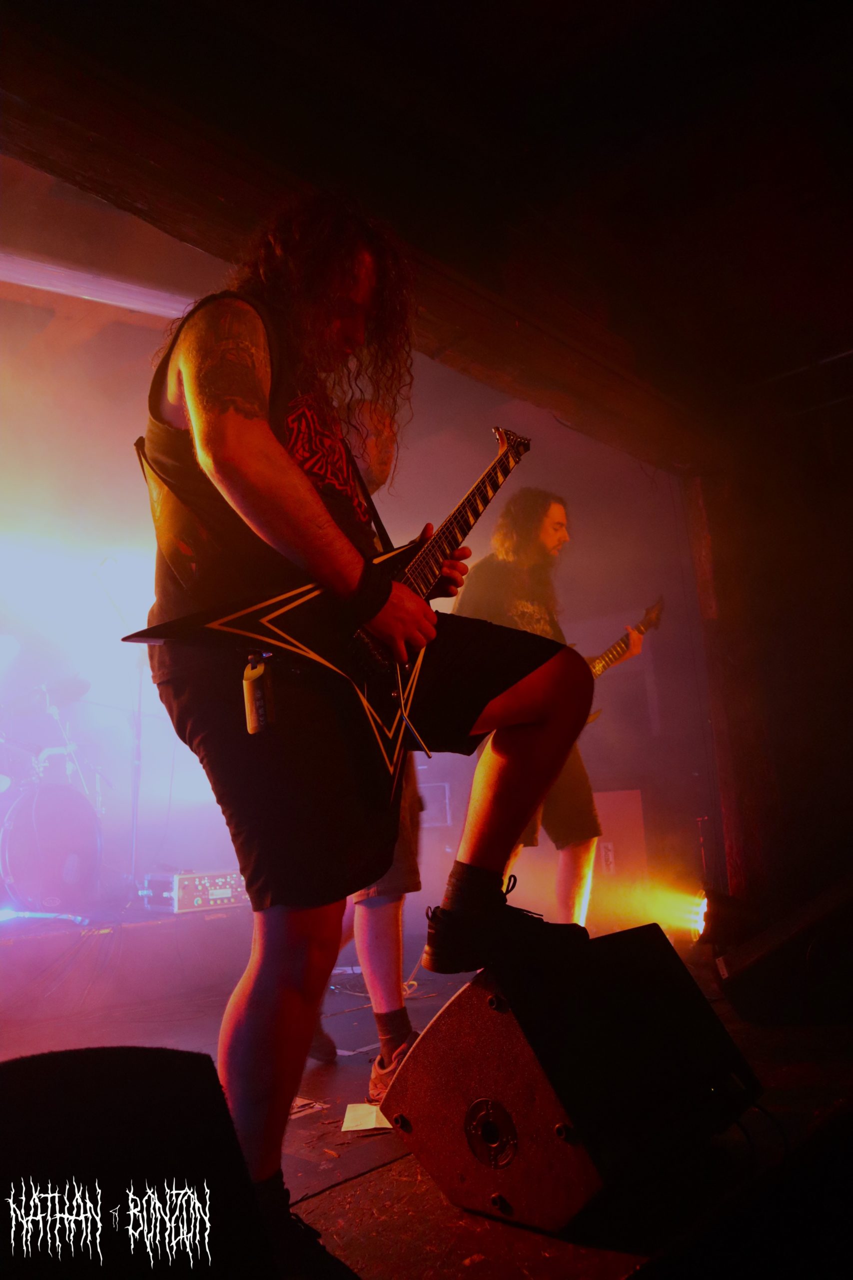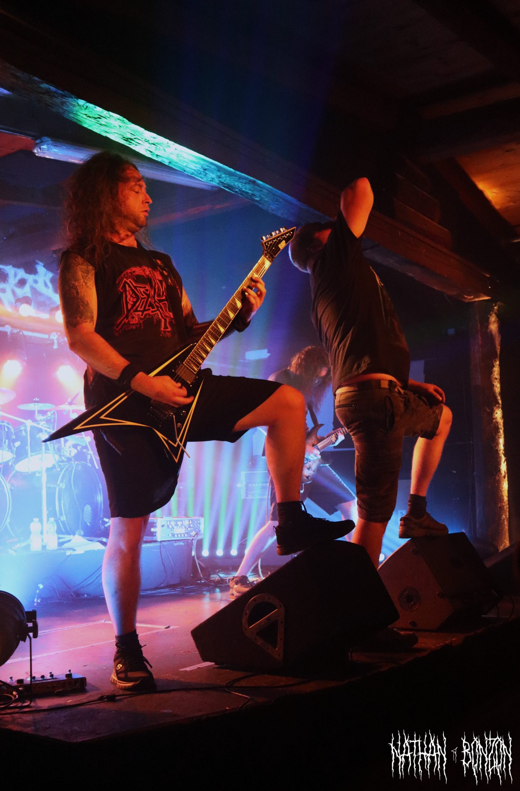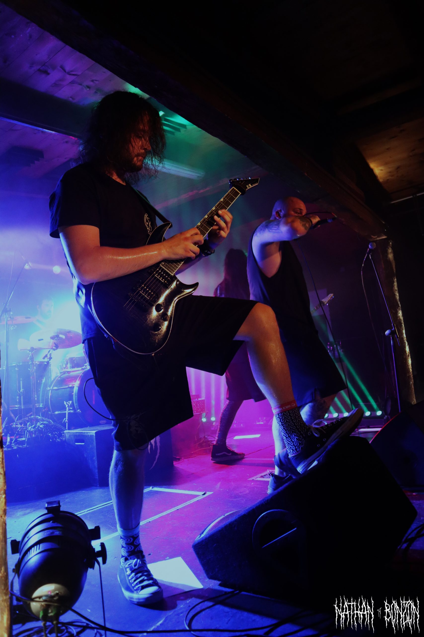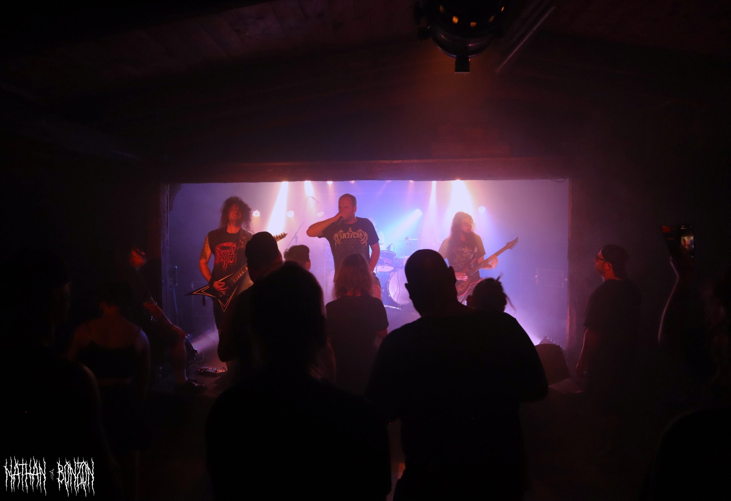 Ensuite, il est temps pour Carrion de fouler les planches du Manoir. Formé en 2008 et ayant sorti trois albums studio à ce jour, le groupe joue un (brutal) death metal assez groovy et rapide. Ce soir, les Belges jouent une grande sélection de titres provenant de leur dernier album en date, Morbid Nailgun Necropsy, sorti en mars 2023. Eradication, le tout premier morceau, commence sur les chapeaux de roues. À la fois rapide et lent, celui-ci alterne entre des moments extrêmement rapides et d’autres plus groovy. Le public, de retour dans la salle du Manoir après une courte pause, semble déjà déchaîné, se lançant dans de féroces moshpits. Le set continue sur sa lancée, avec d’autres morceaux du dernier album comme Nematodes, Morbid Nailgun Necropsy, ou encore Genetic Alteration, tous aussi brutaux les uns que les autres. Gingeritis reste cependant un de mes préférés de cette soirée, comportant un énorme breakdown soutenu par des gutturales d’enfer. Le reste du set propose également des morceaux de leur second album Time To Suffer (2018), comme Mutilation et Torment. Outre le fait qu’elle est extrêmement lourde, la musique de Carrion est aussi très technique. En effet, leur batteur montre une réelle dextérité à jouer des blast beats extrêmement rapides et possède une endurance folle. Pour ce qui est du département des guitares, on a tantôt affaire à des chugs bien lourds, tantôt à des riffs de grind très chaotiques. Nous avons même droits à d’exquis soli, typiques du death old school. En terme de vocaux, le chanteur est très polyvalent. Celui-ci alterne entre des growls caverneux de death, des highs stridents (me rappelant beaucoup ceux du chanteur de Dark Funeral) et des « gargouillements » de goregrind, rares mais bien placés. Certains morceaux prennent le temps de poser une atmosphère menaçante, à l’aide d’intros ou de moments plus « ambiants ». Carrion laisse le temps à la musique de développer un sentiment inquiétant, rendant le tout assez anxiogène, tout comme dans un film d’horreur qui fait monter le suspense et la tension chez le spectateur.