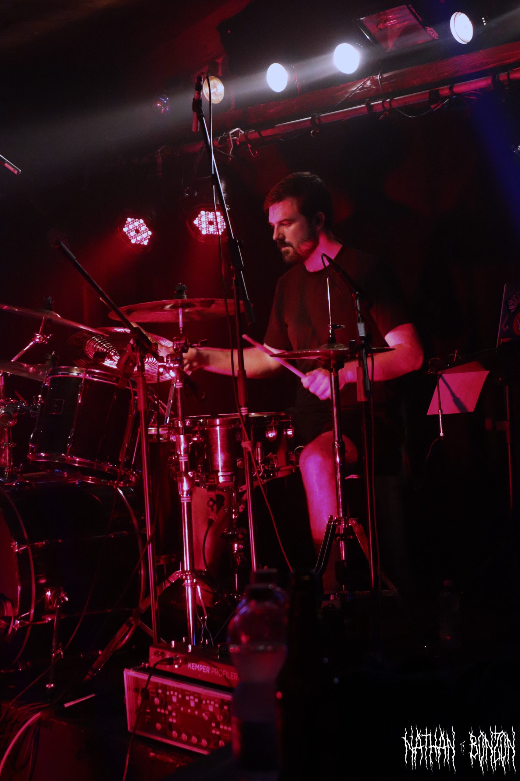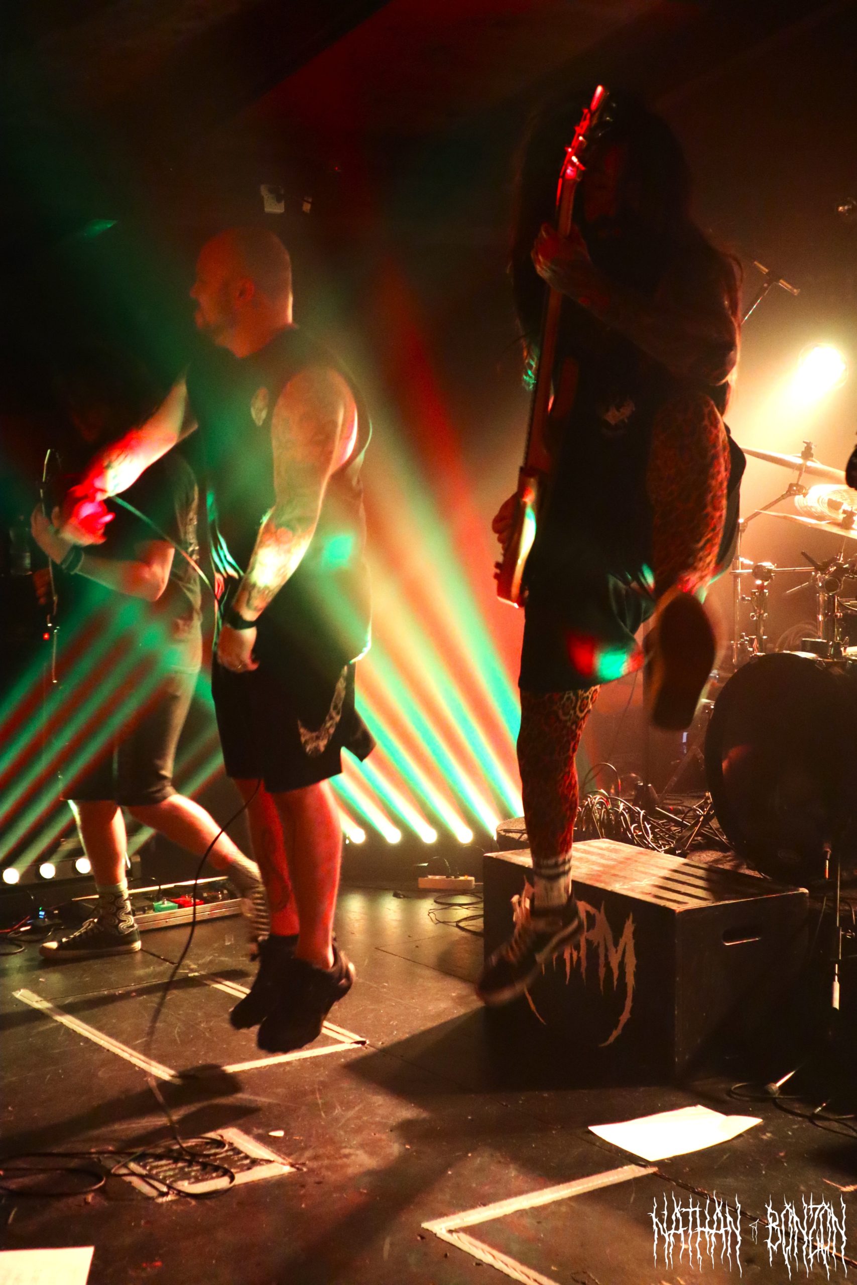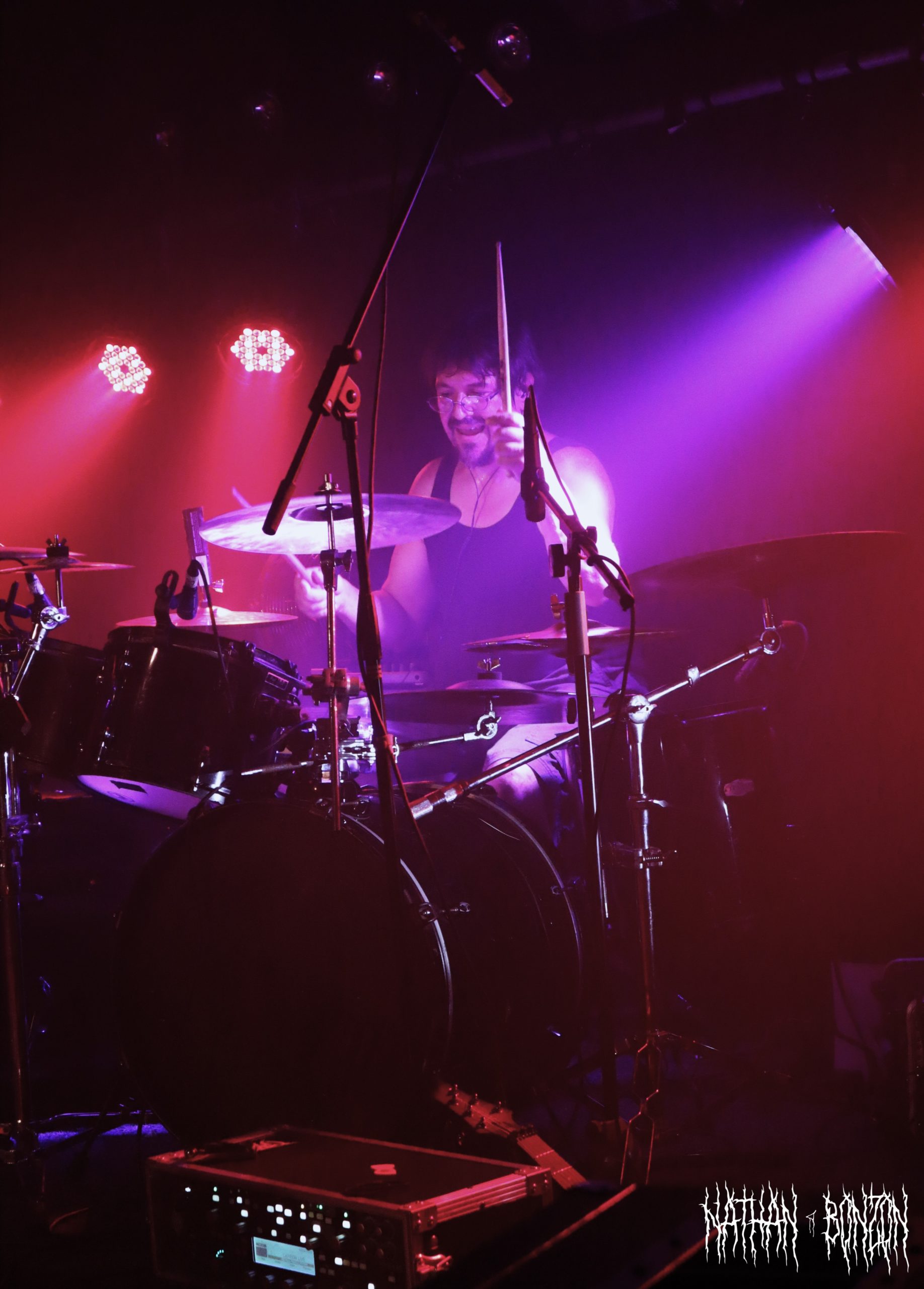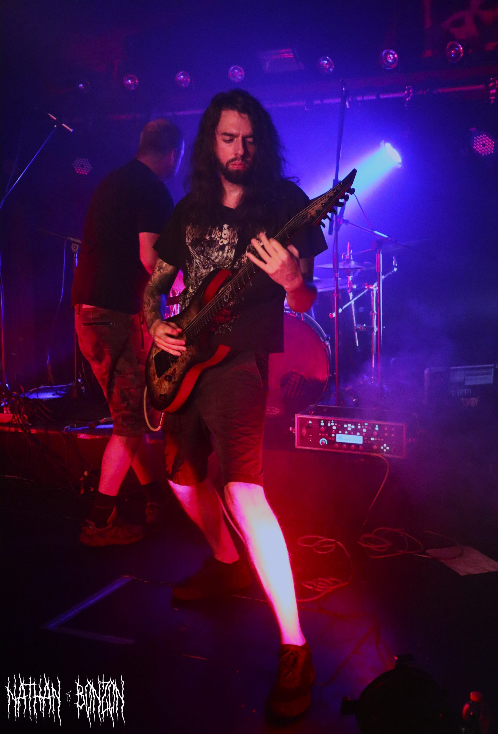 Ensuite, il est temps pour Carrion de fouler les planches du Manoir. Formé en 2008 et ayant sorti trois albums studio à ce jour, le groupe joue un (brutal) death metal assez groovy et rapide. Ce soir, les Belges jouent une grande sélection de titres provenant de leur dernier album en date, Morbid Nailgun Necropsy, sorti en mars 2023. Eradication, le tout premier morceau, commence sur les chapeaux de roues. À la fois rapide et lent, celui-ci alterne entre des moments extrêmement rapides et d’autres plus groovy. Le public, de retour dans la salle du Manoir après une courte pause, semble déjà déchaîné, se lançant dans de féroces moshpits. Le set continue sur sa lancée, avec d’autres morceaux du dernier album comme Nematodes, Morbid Nailgun Necropsy, ou encore Genetic Alteration, tous aussi brutaux les uns que les autres. Gingeritis reste cependant un de mes préférés de cette soirée, comportant un énorme breakdown soutenu par des gutturales d’enfer. Le reste du set propose également des morceaux de leur second album Time To Suffer (2018), comme Mutilation et Torment. Outre le fait qu’elle est extrêmement lourde, la musique de Carrion est aussi très technique. En effet, leur batteur montre une réelle dextérité à jouer des blast beats extrêmement rapides et possède une endurance folle. Pour ce qui est du département des guitares, on a tantôt affaire à des chugs bien lourds, tantôt à des riffs de grind très chaotiques. Nous avons même droits à d’exquis soli, typiques du death old school. En terme de vocaux, le chanteur est très polyvalent. Celui-ci alterne entre des growls caverneux de death, des highs stridents (me rappelant beaucoup ceux du chanteur de Dark Funeral) et des « gargouillements » de goregrind, rares mais bien placés. Certains morceaux prennent le temps de poser une atmosphère menaçante, à l’aide d’intros ou de moments plus « ambiants ». Carrion laisse le temps à la musique de développer un sentiment inquiétant, rendant le tout assez anxiogène, tout comme dans un film d’horreur qui fait monter le suspense et la tension chez le spectateur.
