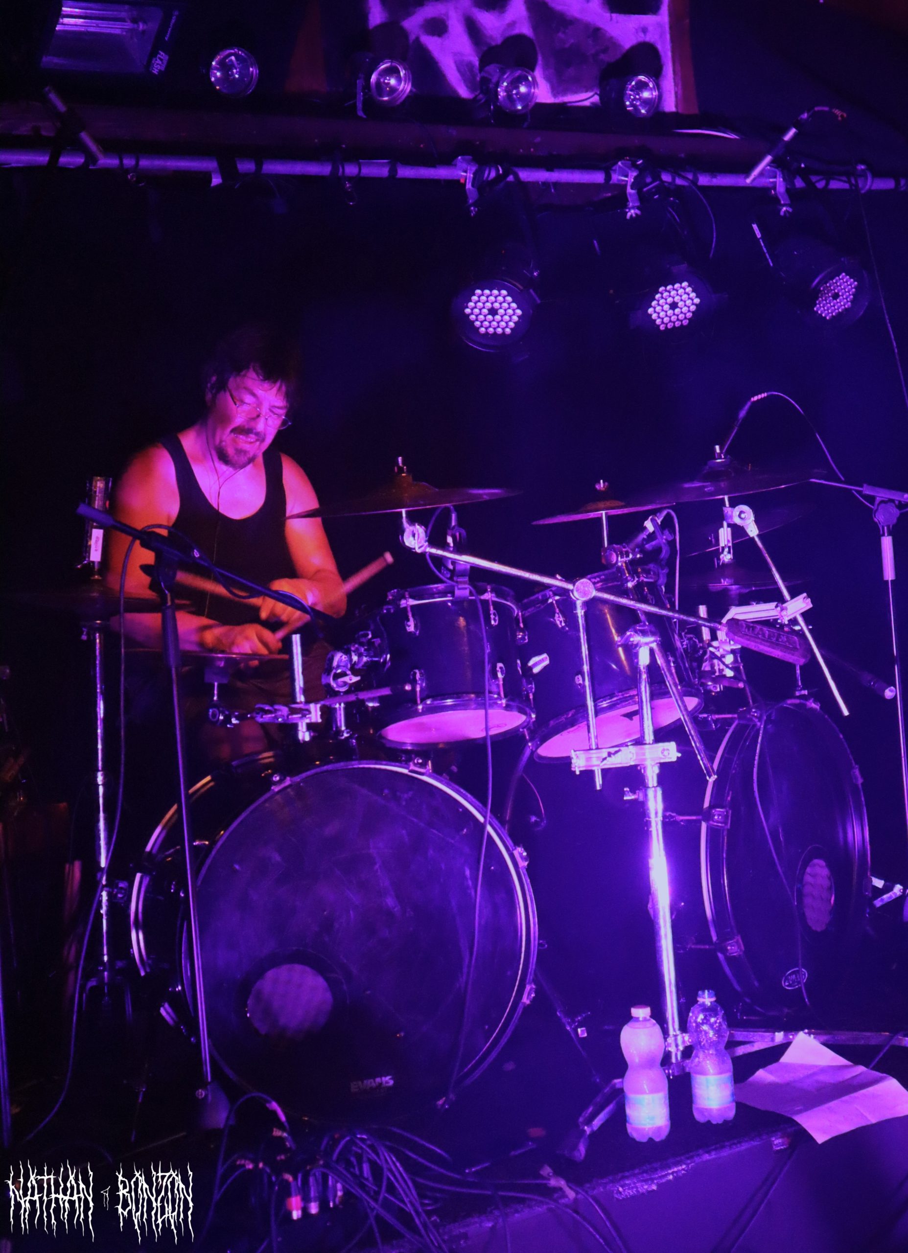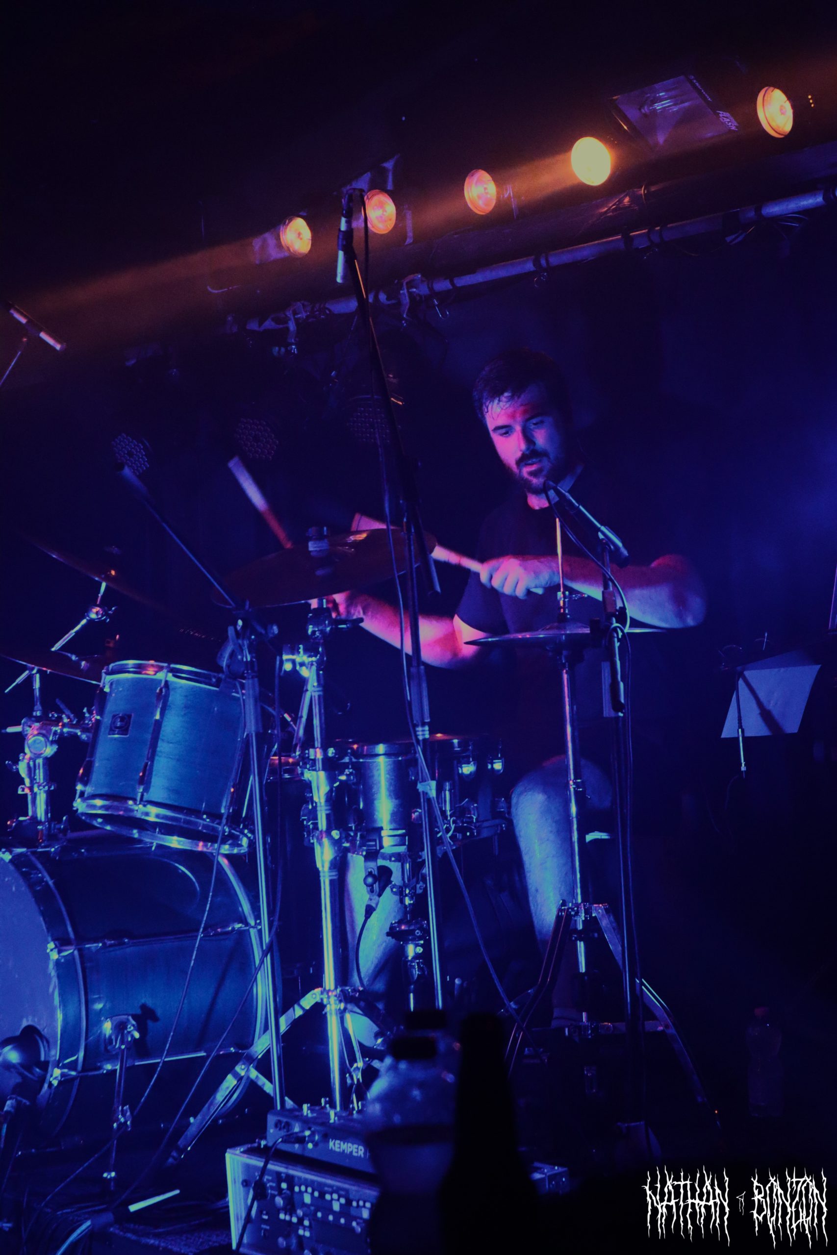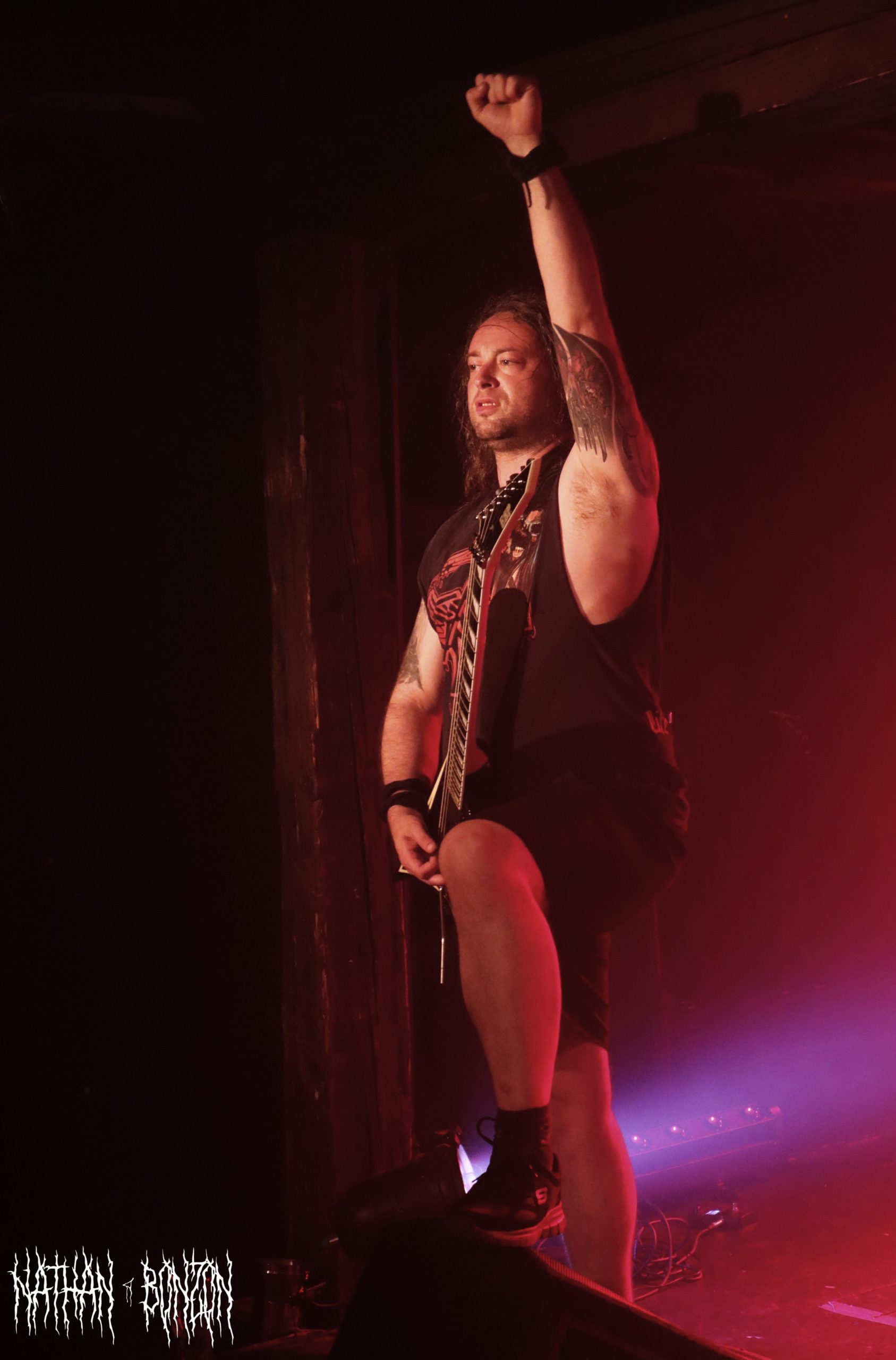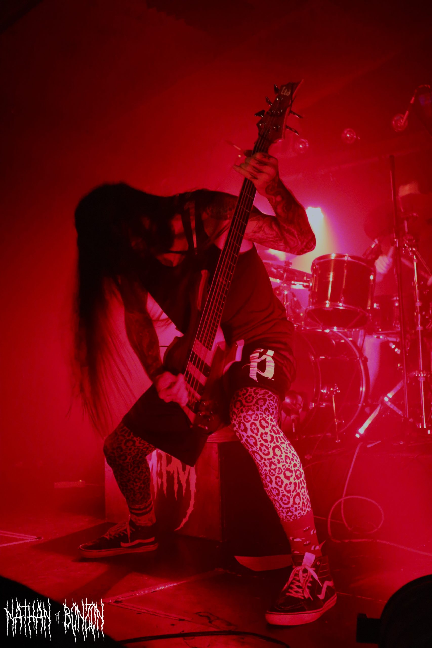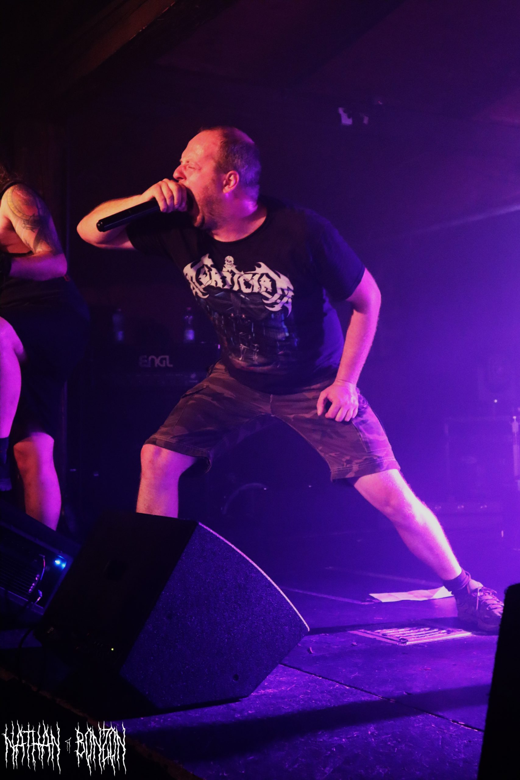 Ensuite, il est temps pour Carrion de fouler les planches du Manoir. Formé en 2008 et ayant sorti trois albums studio à ce jour, le groupe joue un (brutal) death metal assez groovy et rapide. Ce soir, les Belges jouent une grande sélection de titres provenant de leur dernier album en date, Morbid Nailgun Necropsy, sorti en mars 2023. Eradication, le tout premier morceau, commence sur les chapeaux de roues. À la fois rapide et lent, celui-ci alterne entre des moments extrêmement rapides et d’autres plus groovy. Le public, de retour dans la salle du Manoir après une courte pause, semble déjà déchaîné, se lançant dans de féroces moshpits. Le set continue sur sa lancée, avec d’autres morceaux du dernier album comme Nematodes, Morbid Nailgun Necropsy, ou encore Genetic Alteration, tous aussi brutaux les uns que les autres. Gingeritis reste cependant un de mes préférés de cette soirée, comportant un énorme breakdown soutenu par des gutturales d’enfer. Le reste du set propose également des morceaux de leur second album Time To Suffer (2018), comme Mutilation et Torment. Outre le fait qu’elle est extrêmement lourde, la musique de Carrion est aussi très technique. En effet, leur batteur montre une réelle dextérité à jouer des blast beats extrêmement rapides et possède une endurance folle. Pour ce qui est du département des guitares, on a tantôt affaire à des chugs bien lourds, tantôt à des riffs de grind très chaotiques. Nous avons même droits à d’exquis soli, typiques du death old school. En terme de vocaux, le chanteur est très polyvalent. Celui-ci alterne entre des growls caverneux de death, des highs stridents (me rappelant beaucoup ceux du chanteur de Dark Funeral) et des « gargouillements » de goregrind, rares mais bien placés. Certains morceaux prennent le temps de poser une atmosphère menaçante, à l’aide d’intros ou de moments plus « ambiants ». Carrion laisse le temps à la musique de développer un sentiment inquiétant, rendant le tout assez anxiogène, tout comme dans un film d’horreur qui fait monter le suspense et la tension chez le spectateur.
