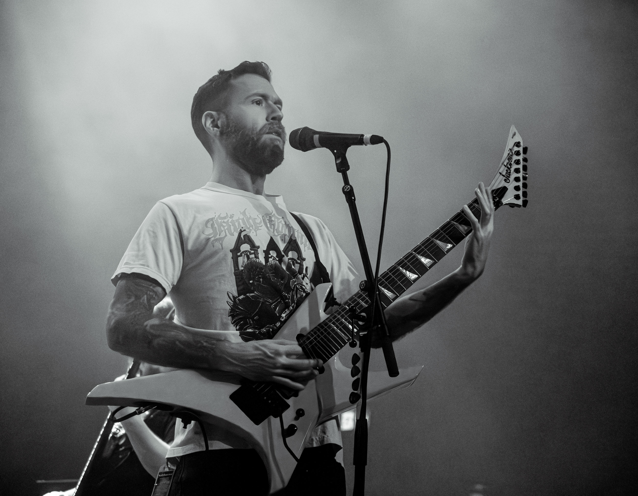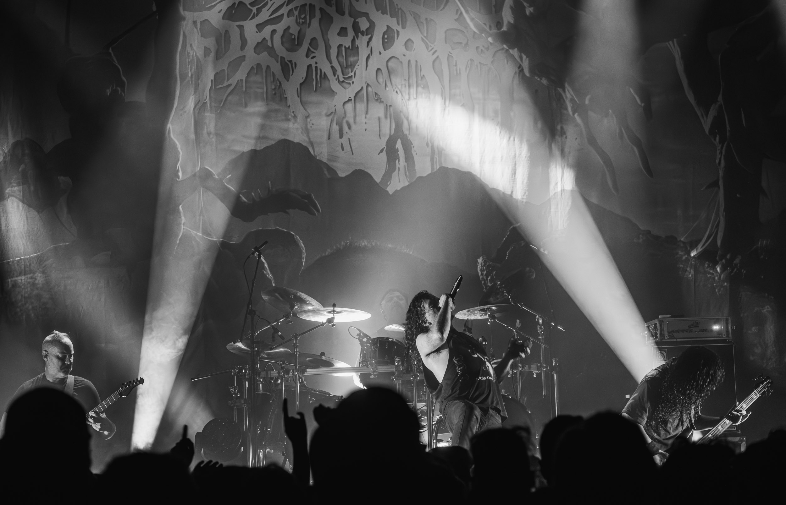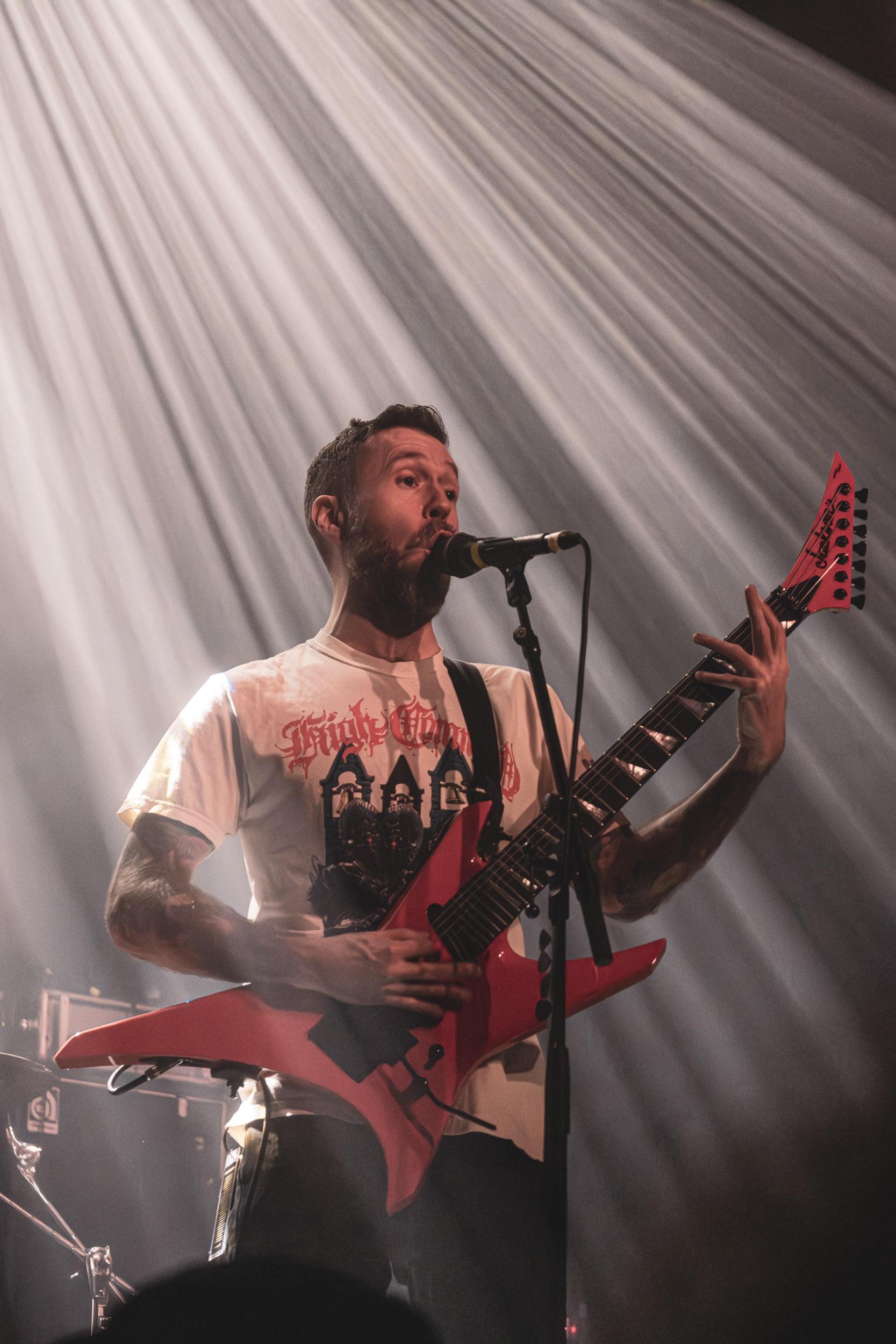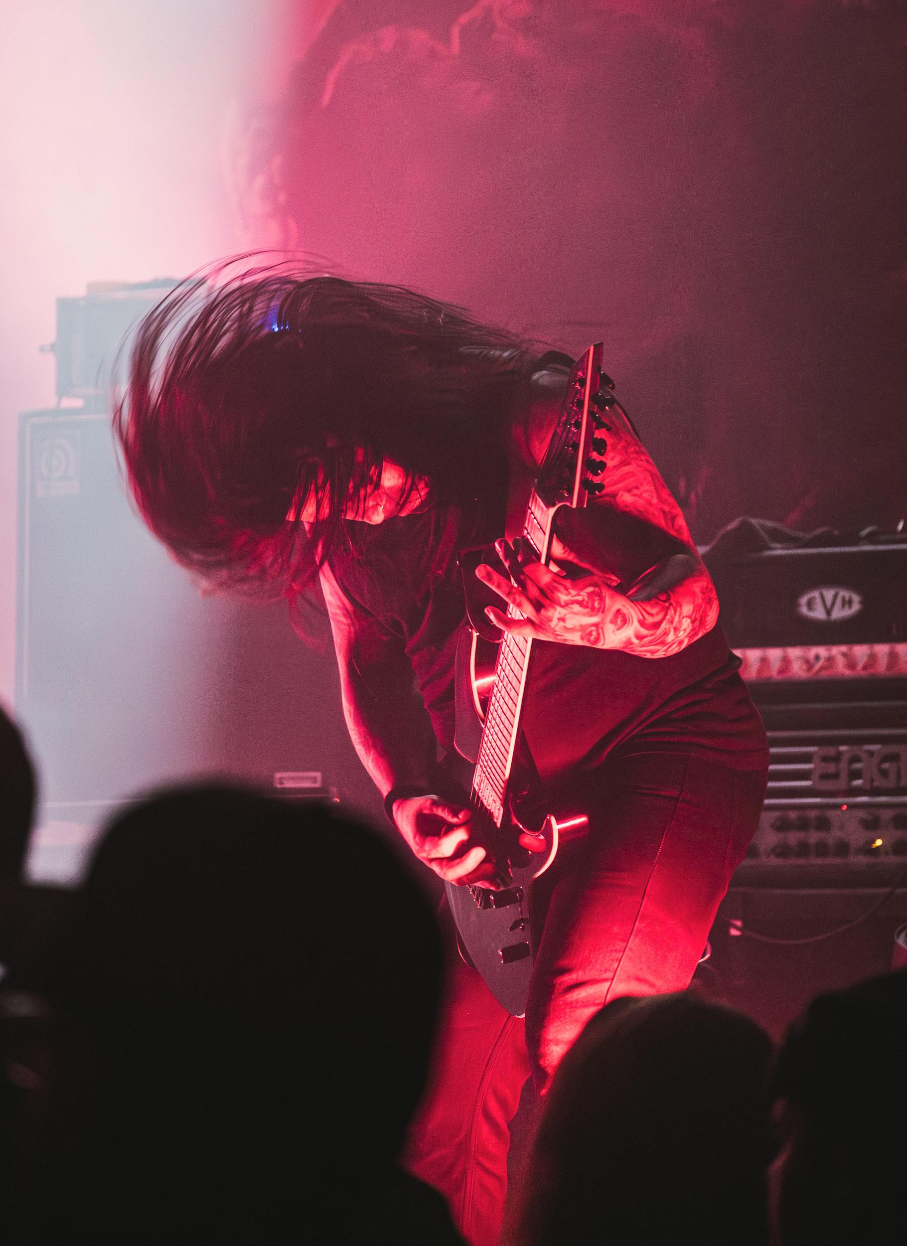 Ceux qui suivent mes live reports s’en souviennent peut-être, ma première rencontre scénique avec Cattle Decapitation s’était soldée par une déconvenue due à des conditions de prises de vues difficiles couplées à une mauvaise gestion du stress de ma part, et je mise sur le concert de ce soir pour rattraper le coup. Par chance pour moi, le set débute sur The Carbon Stampede suivi du plus récent The Prophets of Loss ; pas les morceaux les plus rapides, l’idéal pour permettre au public un échauffement raisonnable sans trop de risque de claquage… avant que les choses prennent un tournant autrement plus musclé avec l’enchaînement de We Eat Our Young et Scourge of the Offspring, deux extraits du dernier album Terrasite. Après ce démarrage qui nous a pour le moins secoués, Travis Ryan prend un moment pour adresser ses remerciements au public, en prenant soin de préciser dans son discours que c’est la première fois que le groupe joue à Lyon. Il déclare ensuite que le prochain morceau est là « pour rendre tout le monde heureux » et faire en sorte que tout le monde « rentre en bonne santé » ; les connaisseurs — ainsi que moi-même — comprennent vite qu’il s’agit de Bring Back the Plague ! Moi qui avais à peine profité de ce morceau, qui compte parmi mes préférés, à l’Inferno, je suis comblée. L’interlude The Great Dying part I ouvre ensuite la voie à One Day Closer to the End of the World, autre extrait de Death Atlas ; après quoi, le set prend un virage plus symphonique et cinématique avec le récent Solastalgia. De manière générale, la setlist est presque entièrement consacrée aux deux — excellents — derniers albums de Cattle Decapitation, sans jamais remonter au-delà de 2012 et de Monolith of Inhumanity, ce qui n’est pas pour déplaire à votre chroniqueuse, et encore moins aux spectateurs du milieu de la fosse au vu de leurs réactions !