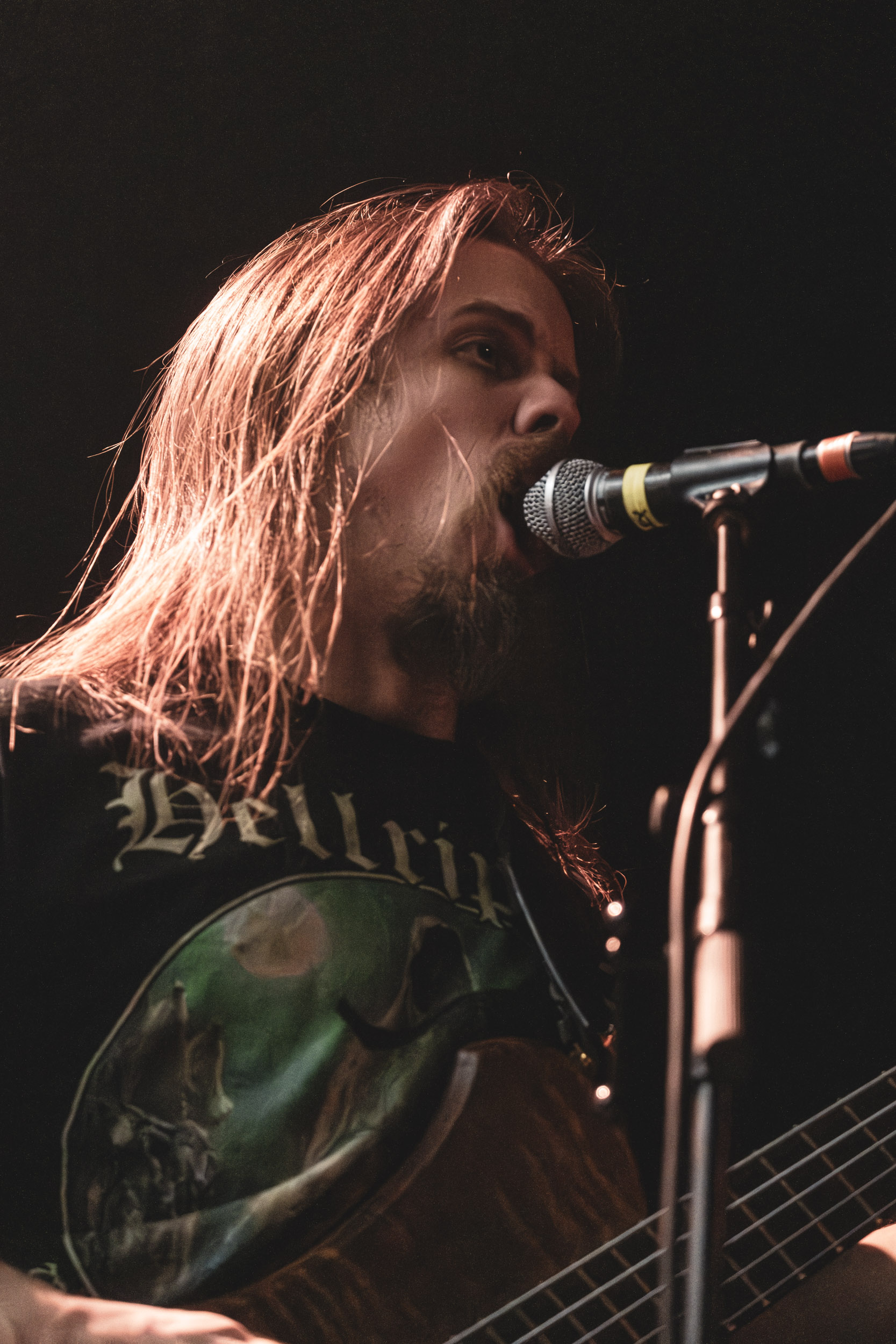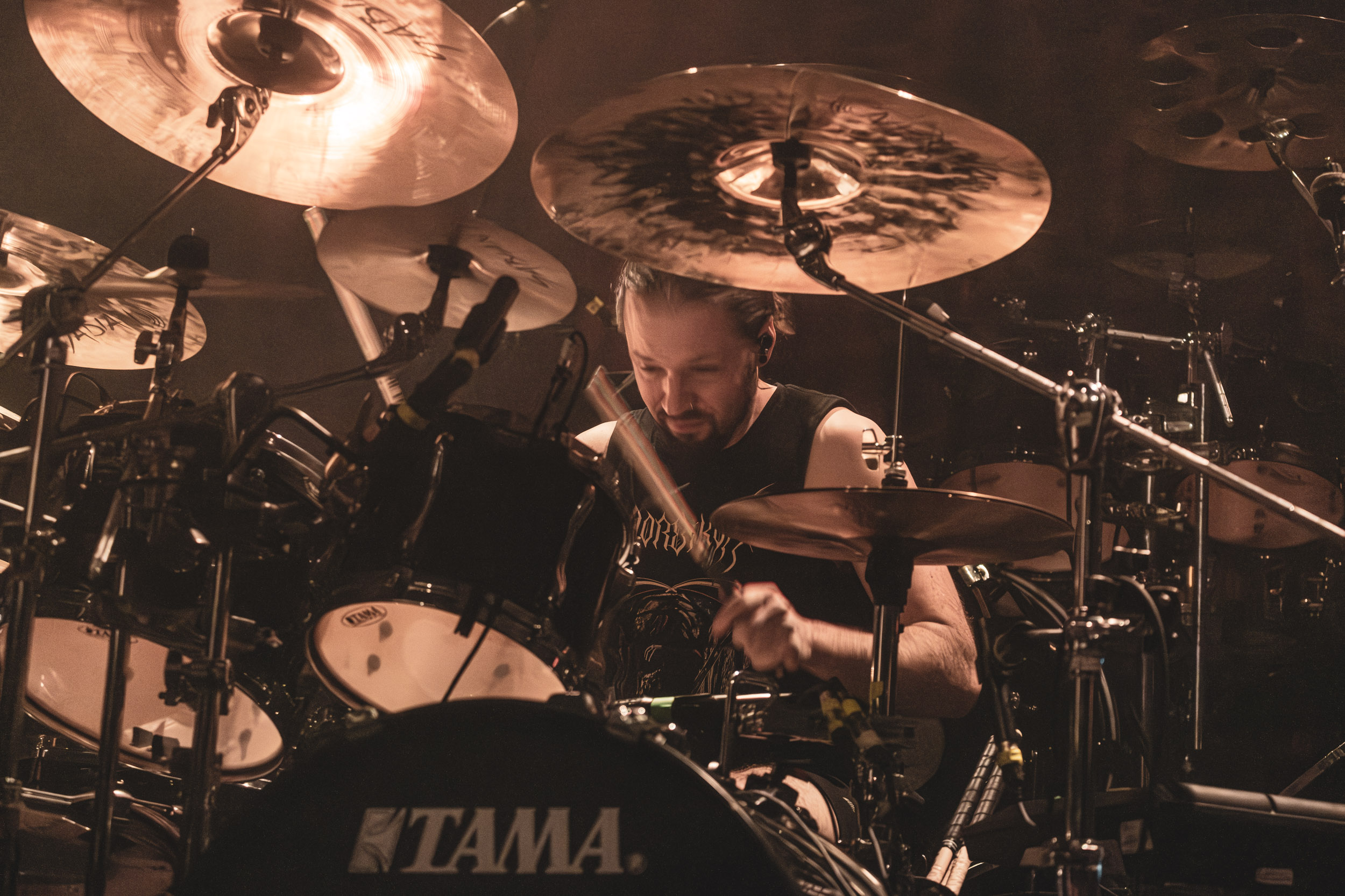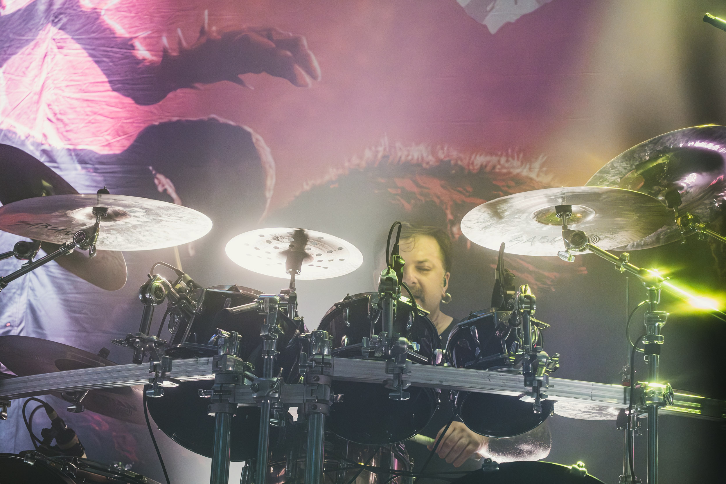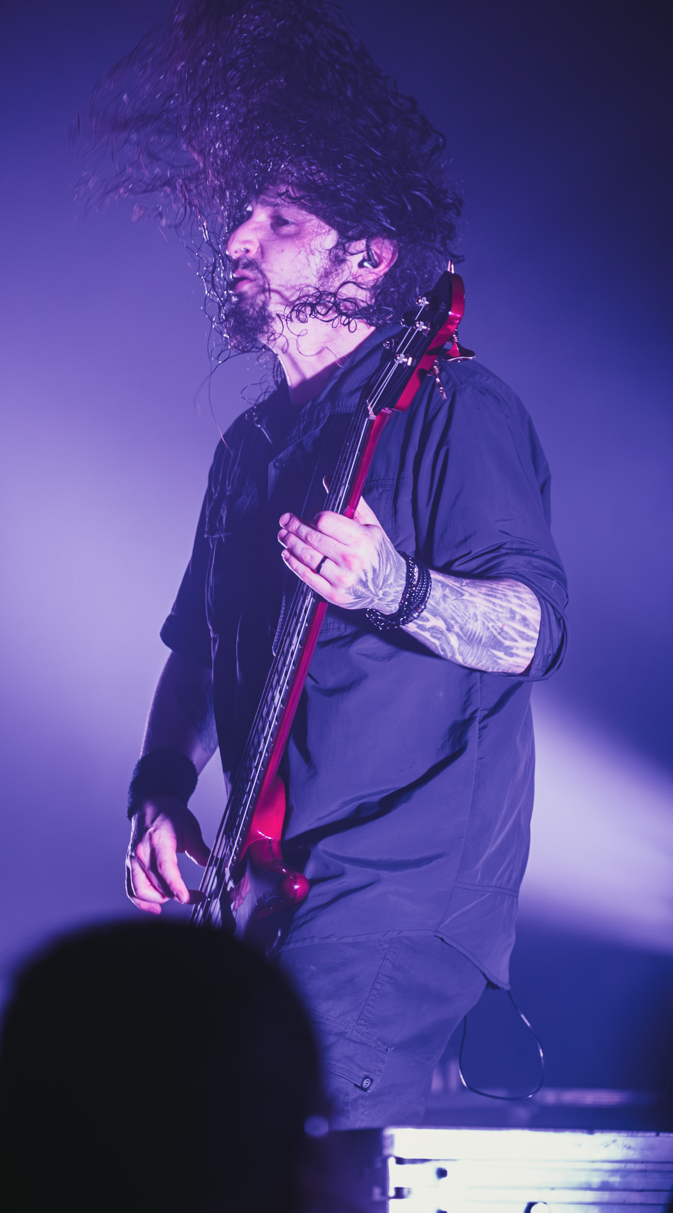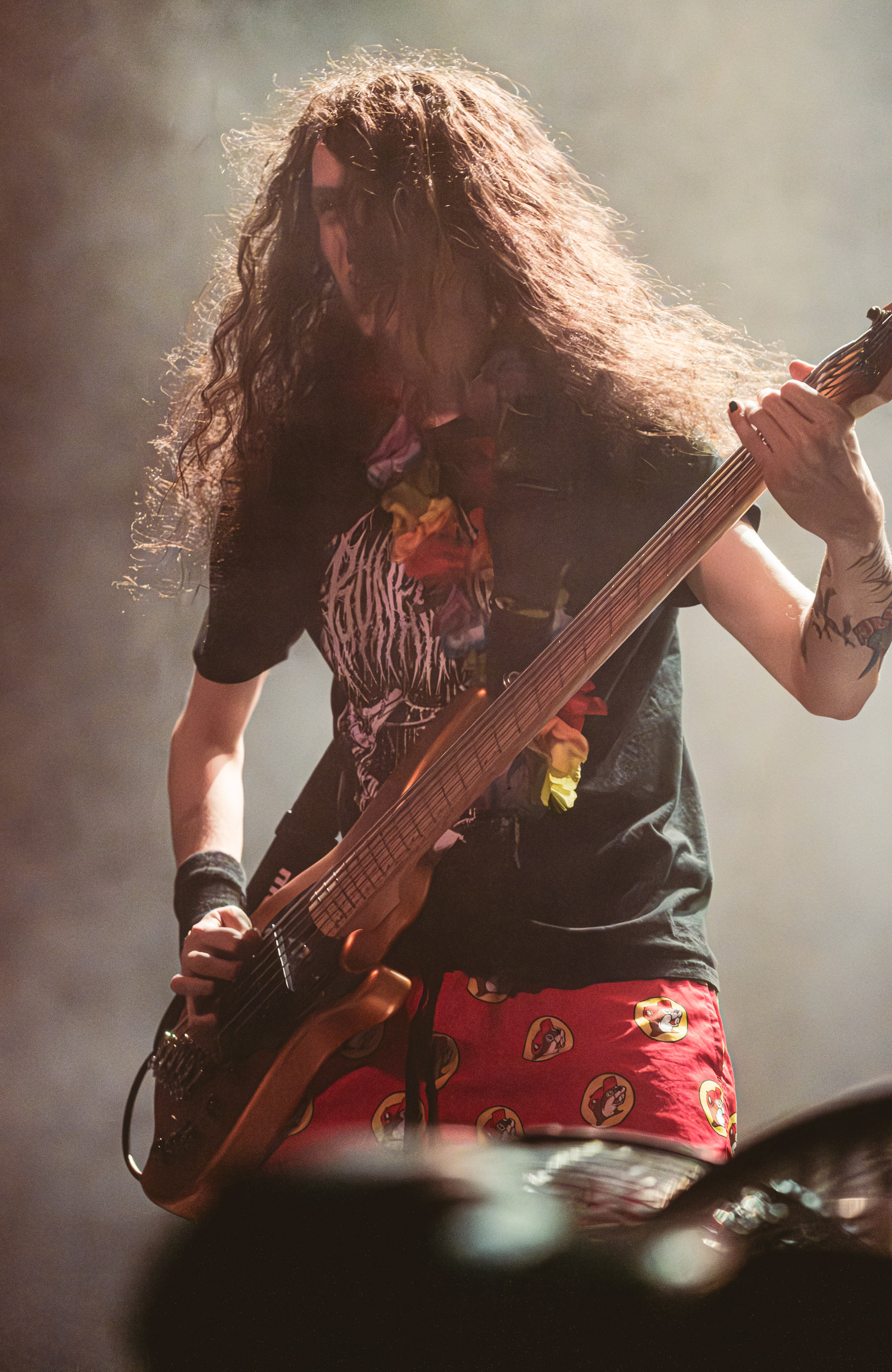 Ceux qui suivent mes live reports s’en souviennent peut-être, ma première rencontre scénique avec Cattle Decapitation s’était soldée par une déconvenue due à des conditions de prises de vues difficiles couplées à une mauvaise gestion du stress de ma part, et je mise sur le concert de ce soir pour rattraper le coup. Par chance pour moi, le set débute sur The Carbon Stampede suivi du plus récent The Prophets of Loss ; pas les morceaux les plus rapides, l’idéal pour permettre au public un échauffement raisonnable sans trop de risque de claquage… avant que les choses prennent un tournant autrement plus musclé avec l’enchaînement de We Eat Our Young et Scourge of the Offspring, deux extraits du dernier album Terrasite. Après ce démarrage qui nous a pour le moins secoués, Travis Ryan prend un moment pour adresser ses remerciements au public, en prenant soin de préciser dans son discours que c’est la première fois que le groupe joue à Lyon. Il déclare ensuite que le prochain morceau est là « pour rendre tout le monde heureux » et faire en sorte que tout le monde « rentre en bonne santé » ; les connaisseurs — ainsi que moi-même — comprennent vite qu’il s’agit de Bring Back the Plague ! Moi qui avais à peine profité de ce morceau, qui compte parmi mes préférés, à l’Inferno, je suis comblée. L’interlude The Great Dying part I ouvre ensuite la voie à One Day Closer to the End of the World, autre extrait de Death Atlas ; après quoi, le set prend un virage plus symphonique et cinématique avec le récent Solastalgia. De manière générale, la setlist est presque entièrement consacrée aux deux — excellents — derniers albums de Cattle Decapitation, sans jamais remonter au-delà de 2012 et de Monolith of Inhumanity, ce qui n’est pas pour déplaire à votre chroniqueuse, et encore moins aux spectateurs du milieu de la fosse au vu de leurs réactions !