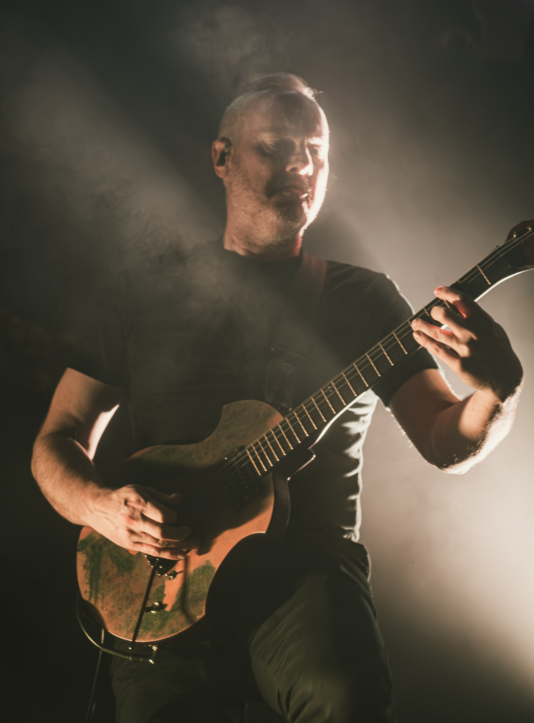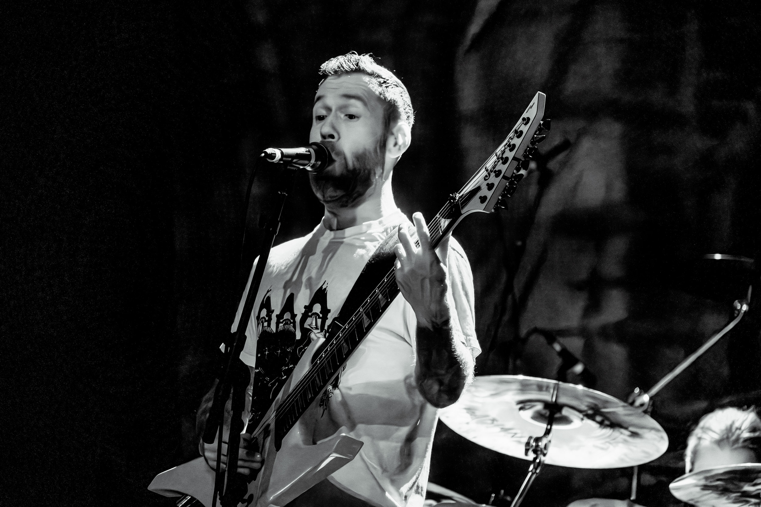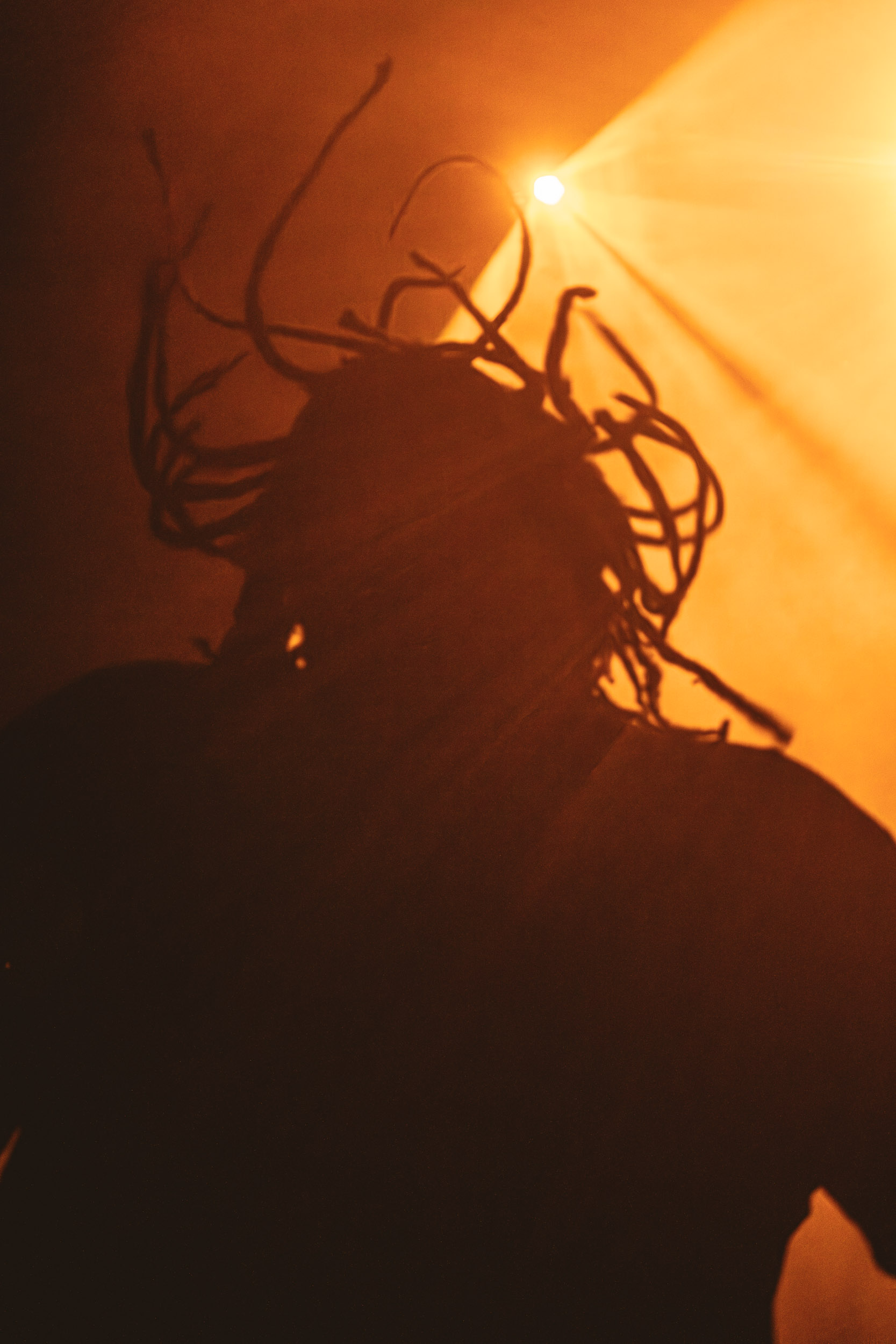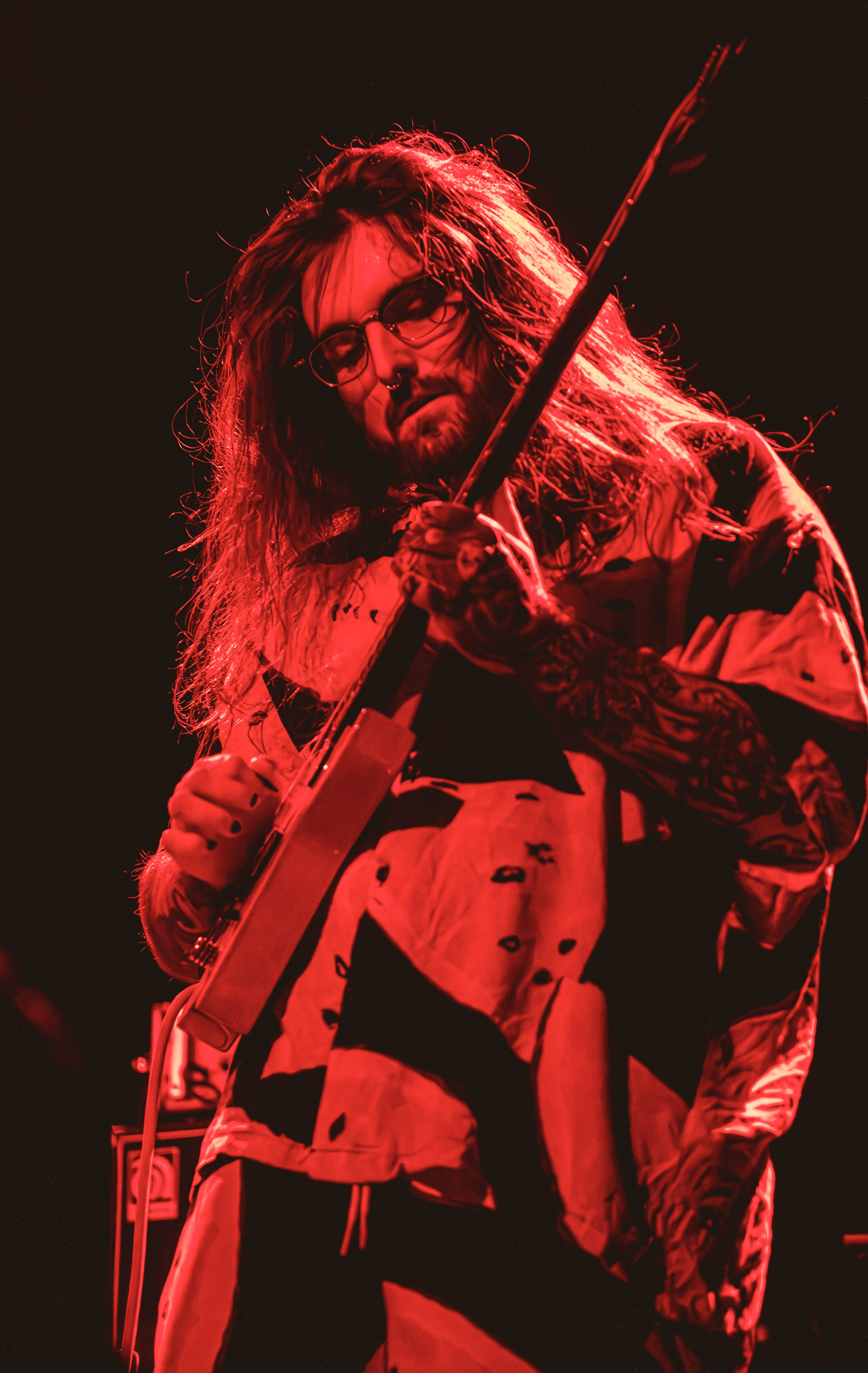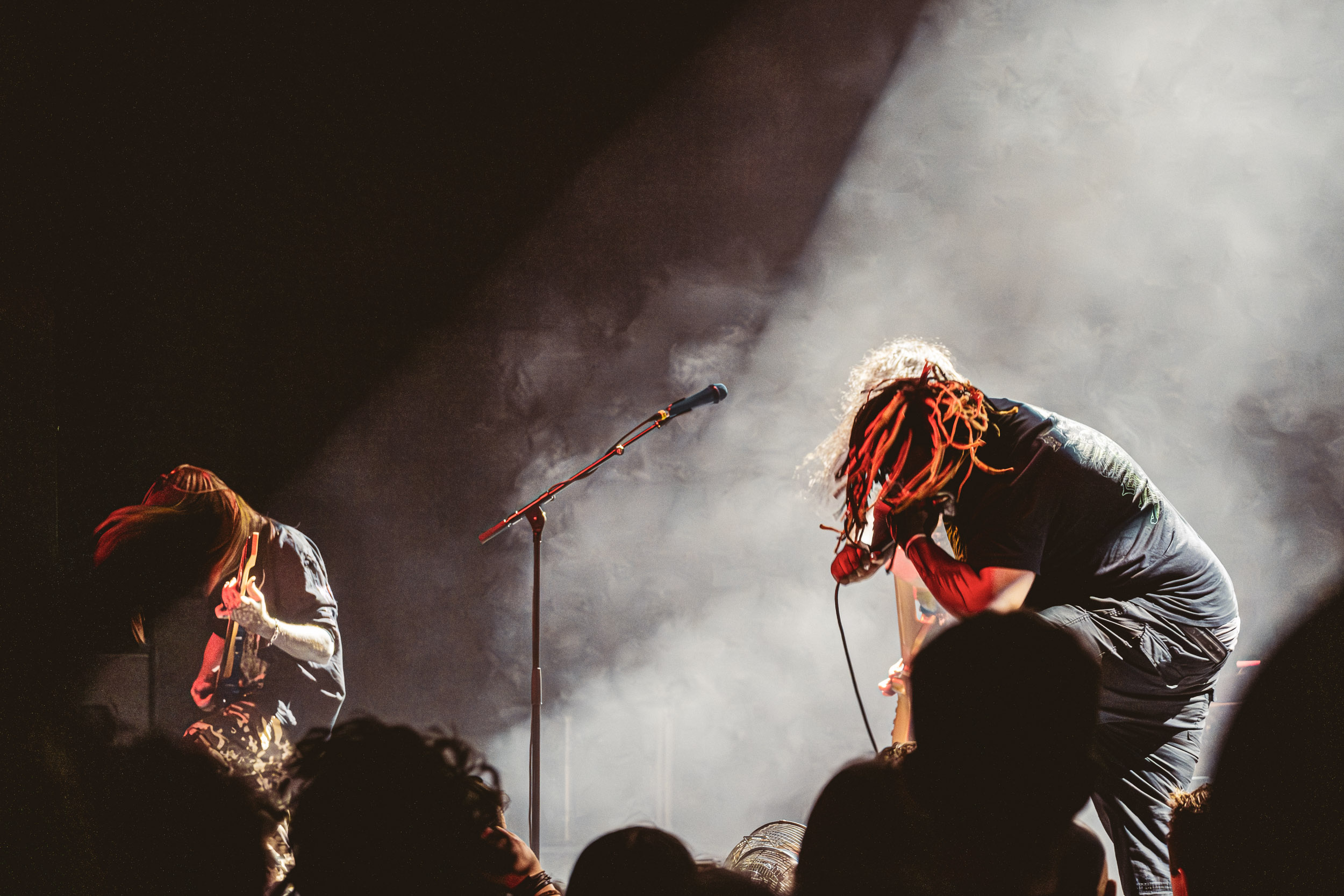Ceux qui suivent mes live reports s’en souviennent peut-être, ma première rencontre scénique avec Cattle Decapitation s’était soldée par une déconvenue due à des conditions de prises de vues difficiles couplées à une mauvaise gestion du stress de ma part, et je mise sur le concert de ce soir pour rattraper le coup. Par chance pour moi, le set débute sur The Carbon Stampede suivi du plus récent The Prophets of Loss ; pas les morceaux les plus rapides, l’idéal pour permettre au public un échauffement raisonnable sans trop de risque de claquage… avant que les choses prennent un tournant autrement plus musclé avec l’enchaînement de We Eat Our Young et Scourge of the Offspring, deux extraits du dernier album Terrasite. Après ce démarrage qui nous a pour le moins secoués, Travis Ryan prend un moment pour adresser ses remerciements au public, en prenant soin de préciser dans son discours que c’est la première fois que le groupe joue à Lyon. Il déclare ensuite que le prochain morceau est là « pour rendre tout le monde heureux » et faire en sorte que tout le monde « rentre en bonne santé » ; les connaisseurs — ainsi que moi-même — comprennent vite qu’il s’agit de Bring Back the Plague ! Moi qui avais à peine profité de ce morceau, qui compte parmi mes préférés, à l’Inferno, je suis comblée. L’interlude The Great Dying part I ouvre ensuite la voie à One Day Closer to the End of the World, autre extrait de Death Atlas ; après quoi, le set prend un virage plus symphonique et cinématique avec le récent Solastalgia. De manière générale, la setlist est presque entièrement consacrée aux deux — excellents — derniers albums de Cattle Decapitation, sans jamais remonter au-delà de 2012 et de Monolith of Inhumanity, ce qui n’est pas pour déplaire à votre chroniqueuse, et encore moins aux spectateurs du milieu de la fosse au vu de leurs réactions !