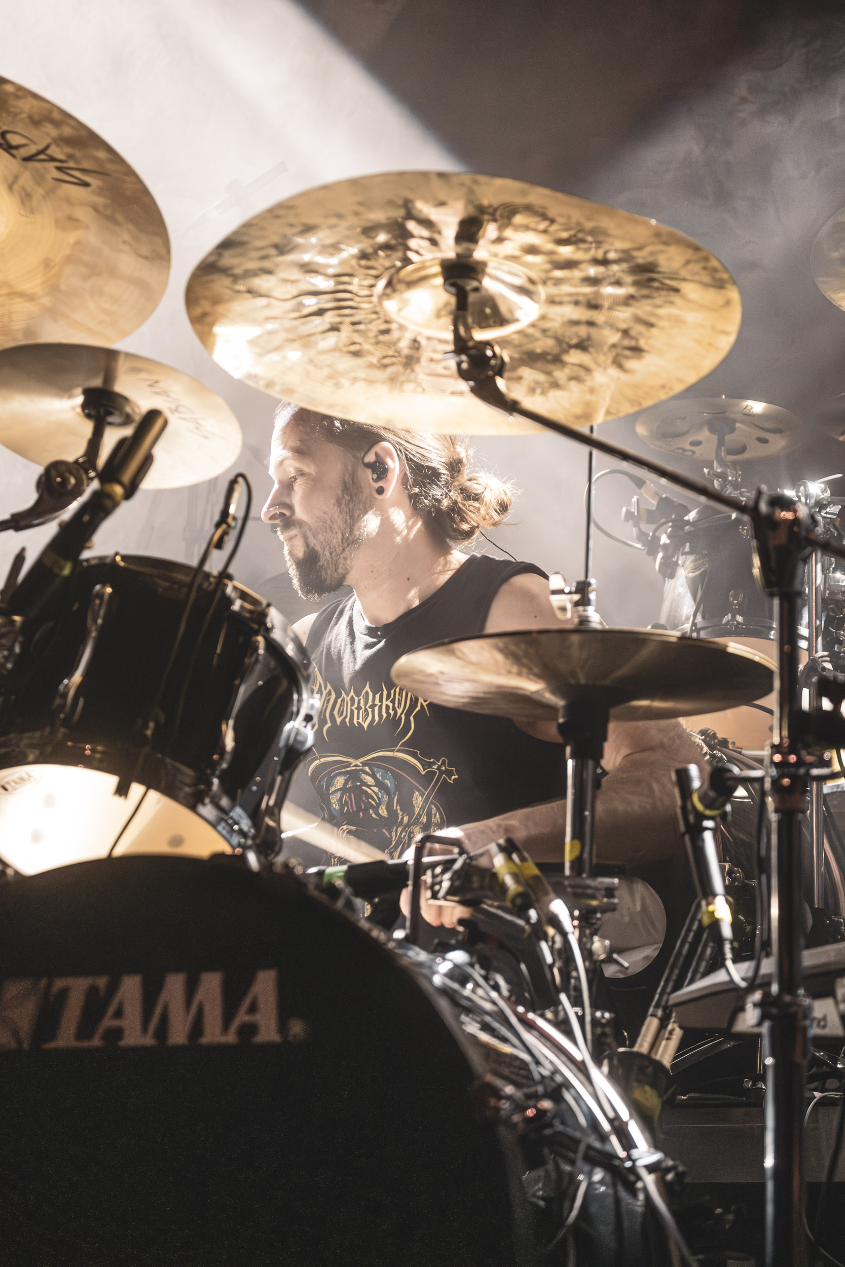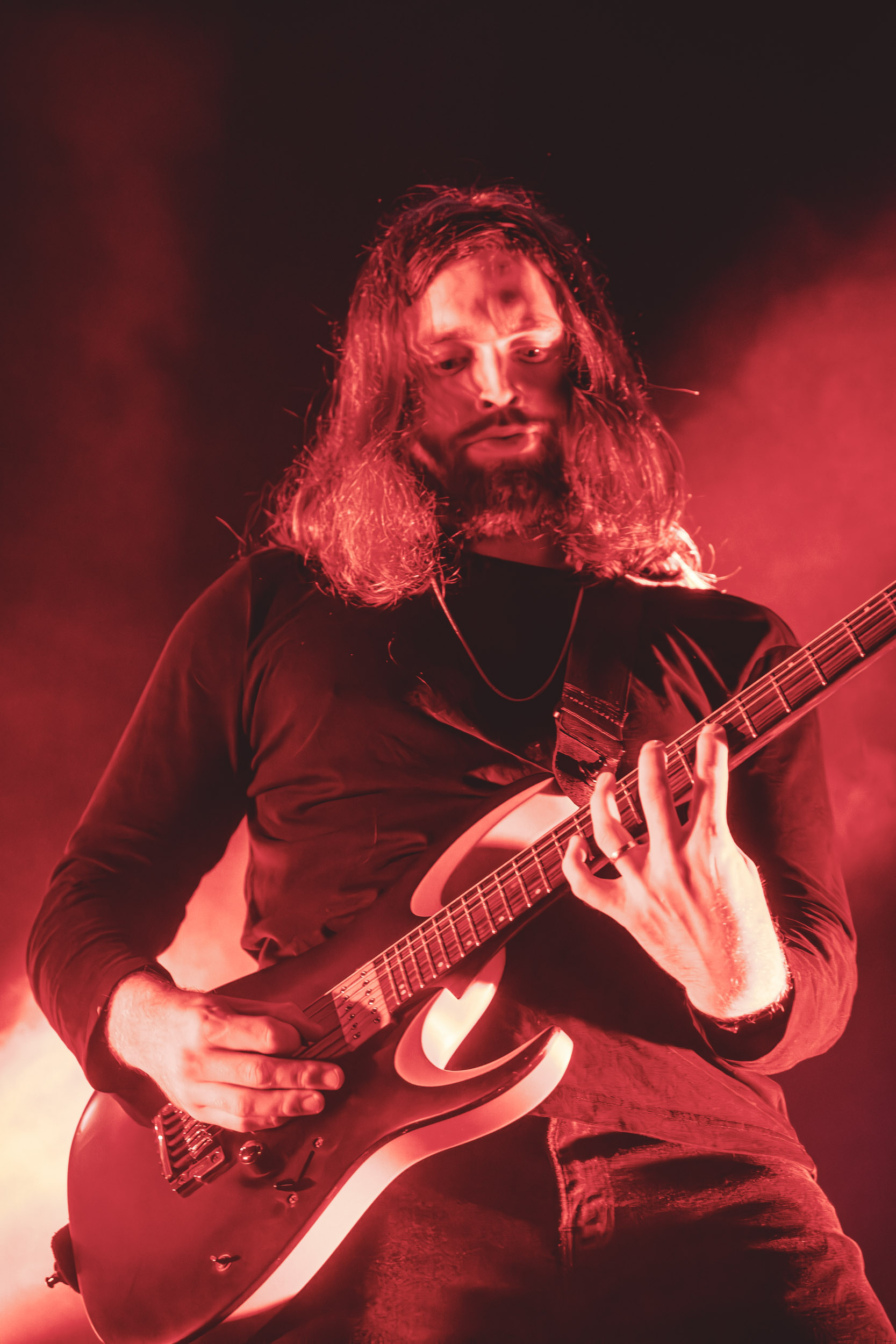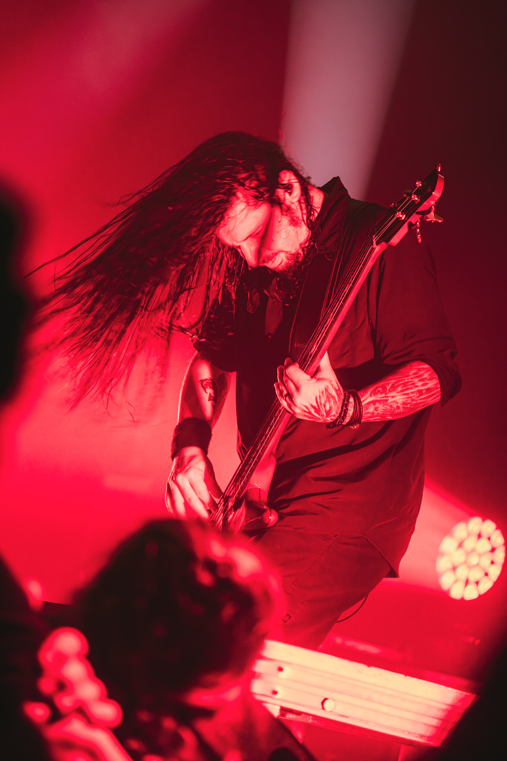 En tant que chroniqueuse et live reporter, je ne cache pas que le deathcore compte parmi les sous-genres qui me parlent le moins et dont a fortiori je sais le moins parler… exception faite de sa variante symphonique, dont le troisième groupe de l’affiche, Shadow of Intent, constitue un des fers de lance — ainsi qu’une agréable surprise découverte au hasard de l’algorithme Spotify pour moi. Au vu de l’enthousiasme que suscite le groupe avant même d’entrer en scène — alors que cette dernière se retrouve plongée dans l’obscurité — et d’entamer le premier morceau, ce statut me paraît plus que justifié… hypothèse que la suite ne tarde pas à confirmer ! À seulement quatre, musiciens et vocaliste portent à bout de bras un poids (très) lourd, équipés pour cela, les premiers de leur technicité irréprochable, le second de sa voix grave et puissante aux accents parfois plus proches du brutal death que du deathcore. Parmi eux, le bassiste Andrew Monias se distingue par son jeu se rapprochant par moments de celui d’une guitare lead ; bien appréciable également que l’enthousiasme du batteur Bryce Butler, dont le sourire béat ne quitte jamais son visage, particulièrement solaire lors de son moment « solo » en dernier tiers de set. Tout du long de ce dernier, aucune faiblesse n’est à déplorer, que cela soit au niveau du calibrage sonore, très équilibré et lisible en dépit de la densité de l’ensemble, ou à celui de l’enchaînement des titres, qui se déroule sans temps mort ni coup de mou, bien aidé en cela par un Ben Duerr à fond et en constante interaction avec son public. Si de prime abord sa présence domine le set, ses camarades ont aussi des cordes vocales à leur arc, qui complètent la performance du frontman : Andrew Monias possède un bon scream de type plutôt black metal et Chris Wiseman se montre aussi bon chanteur clean que guitariste. L’ensemble est soutenu par des orchestrations ostentatoires, prétexte à quelques comparaisons avec d’autres groupes pour certains. Si, parmi les spectateurs, les rapprochements avec Lorna Shore vont bon train, j’ai pour ma part tendance à rapprocher Shadow of Intent de Fleshgod Apocalypse, les deux groupes partageant des aspects orchestraux très similaires… rien d’étonnant pour qui se rappelle que Francesco Ferrini compte parmi les collaborateurs du groupe depuis 2019 !