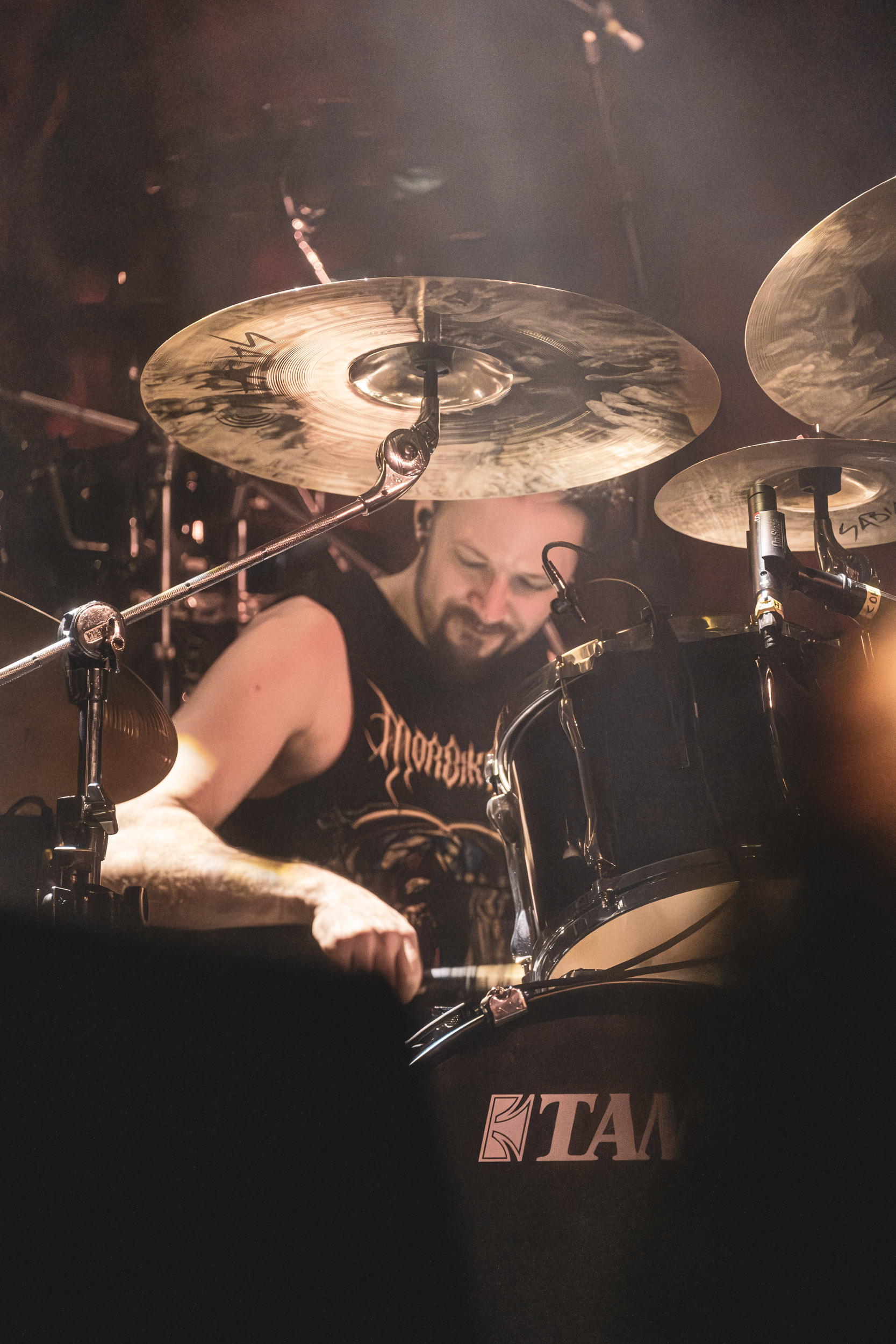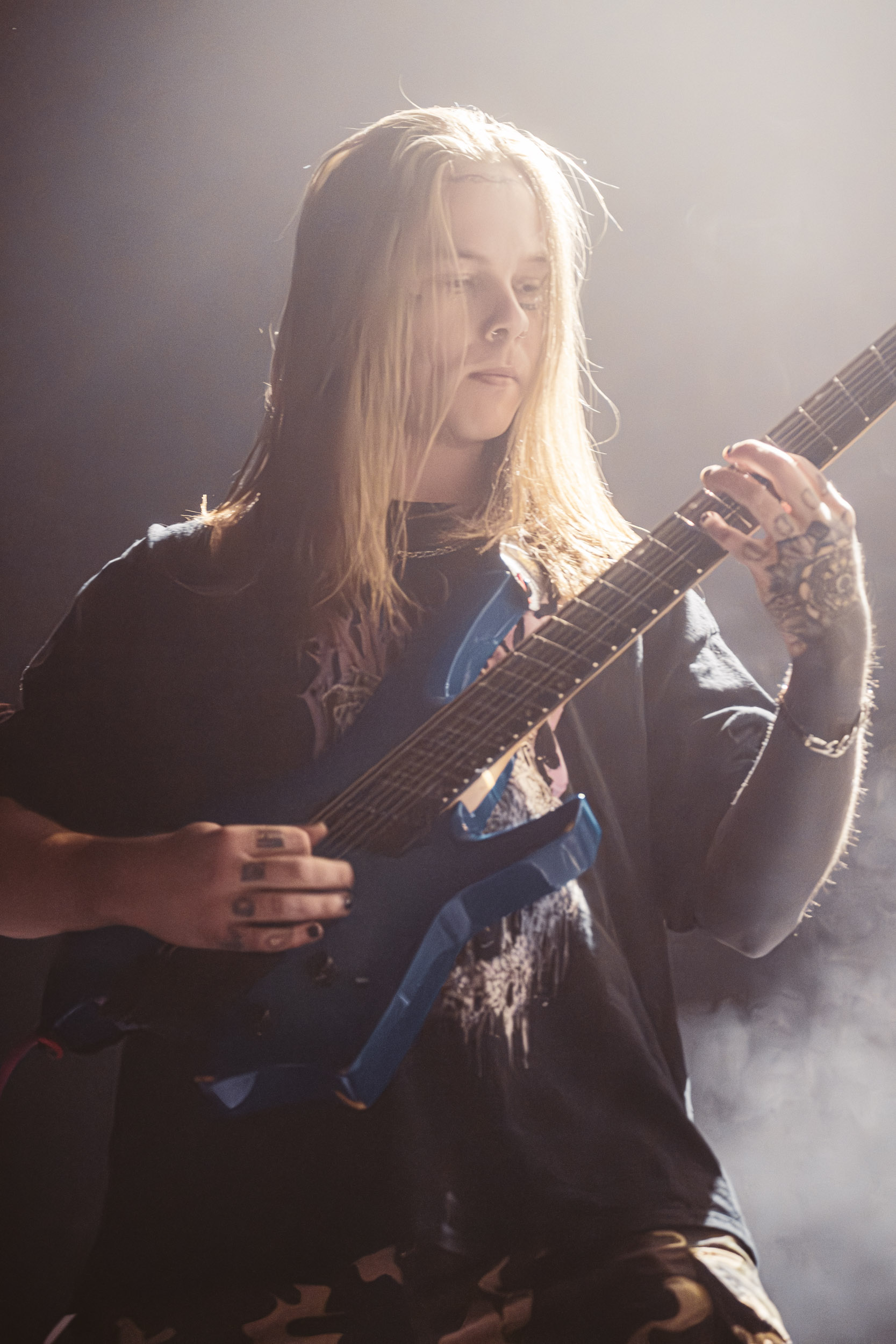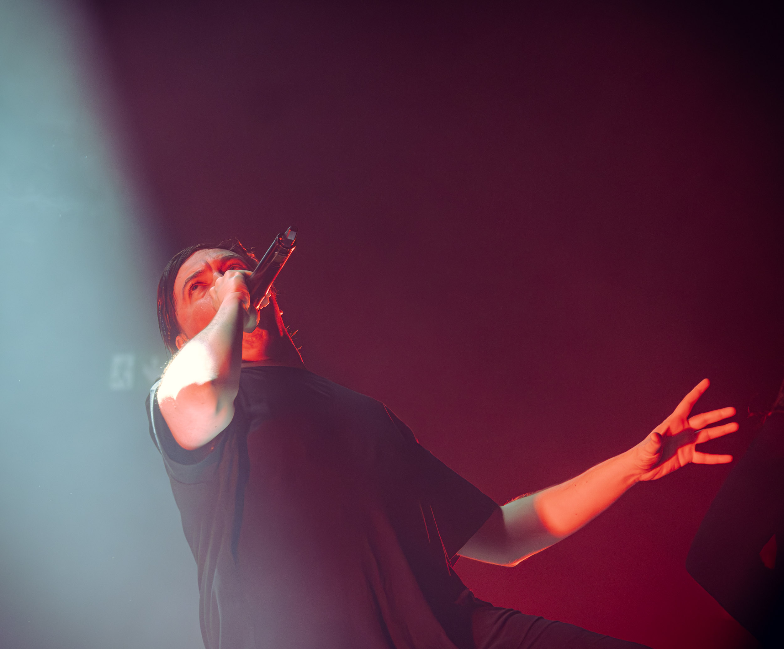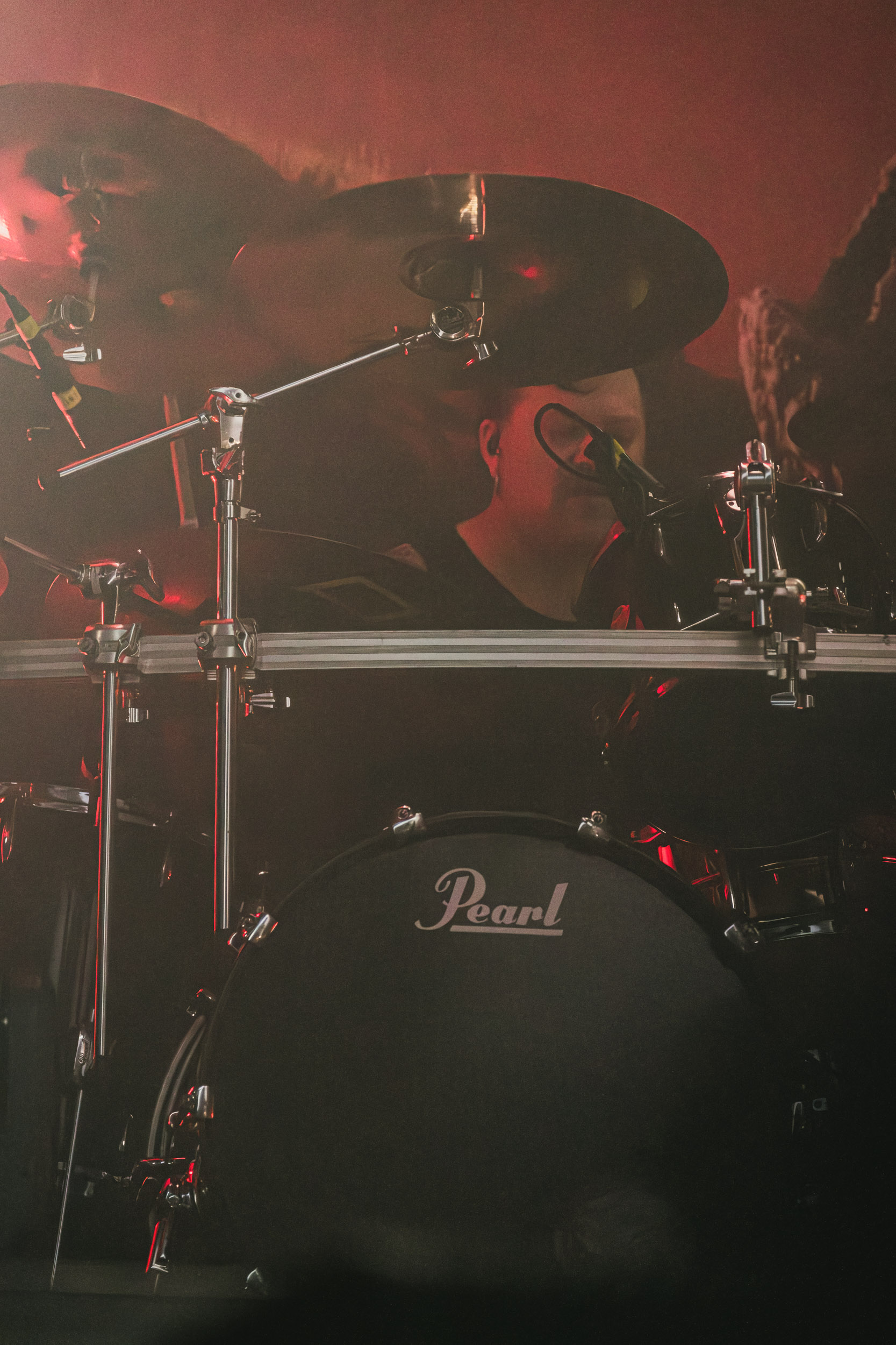 En tant que chroniqueuse et live reporter, je ne cache pas que le deathcore compte parmi les sous-genres qui me parlent le moins et dont a fortiori je sais le moins parler… exception faite de sa variante symphonique, dont le troisième groupe de l’affiche, Shadow of Intent, constitue un des fers de lance — ainsi qu’une agréable surprise découverte au hasard de l’algorithme Spotify pour moi. Au vu de l’enthousiasme que suscite le groupe avant même d’entrer en scène — alors que cette dernière se retrouve plongée dans l’obscurité — et d’entamer le premier morceau, ce statut me paraît plus que justifié… hypothèse que la suite ne tarde pas à confirmer ! À seulement quatre, musiciens et vocaliste portent à bout de bras un poids (très) lourd, équipés pour cela, les premiers de leur technicité irréprochable, le second de sa voix grave et puissante aux accents parfois plus proches du brutal death que du deathcore. Parmi eux, le bassiste Andrew Monias se distingue par son jeu se rapprochant par moments de celui d’une guitare lead ; bien appréciable également que l’enthousiasme du batteur Bryce Butler, dont le sourire béat ne quitte jamais son visage, particulièrement solaire lors de son moment « solo » en dernier tiers de set. Tout du long de ce dernier, aucune faiblesse n’est à déplorer, que cela soit au niveau du calibrage sonore, très équilibré et lisible en dépit de la densité de l’ensemble, ou à celui de l’enchaînement des titres, qui se déroule sans temps mort ni coup de mou, bien aidé en cela par un Ben Duerr à fond et en constante interaction avec son public. Si de prime abord sa présence domine le set, ses camarades ont aussi des cordes vocales à leur arc, qui complètent la performance du frontman : Andrew Monias possède un bon scream de type plutôt black metal et Chris Wiseman se montre aussi bon chanteur clean que guitariste. L’ensemble est soutenu par des orchestrations ostentatoires, prétexte à quelques comparaisons avec d’autres groupes pour certains. Si, parmi les spectateurs, les rapprochements avec Lorna Shore vont bon train, j’ai pour ma part tendance à rapprocher Shadow of Intent de Fleshgod Apocalypse, les deux groupes partageant des aspects orchestraux très similaires… rien d’étonnant pour qui se rappelle que Francesco Ferrini compte parmi les collaborateurs du groupe depuis 2019 !